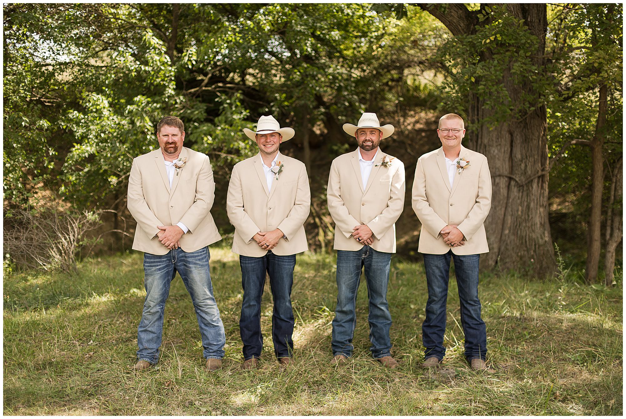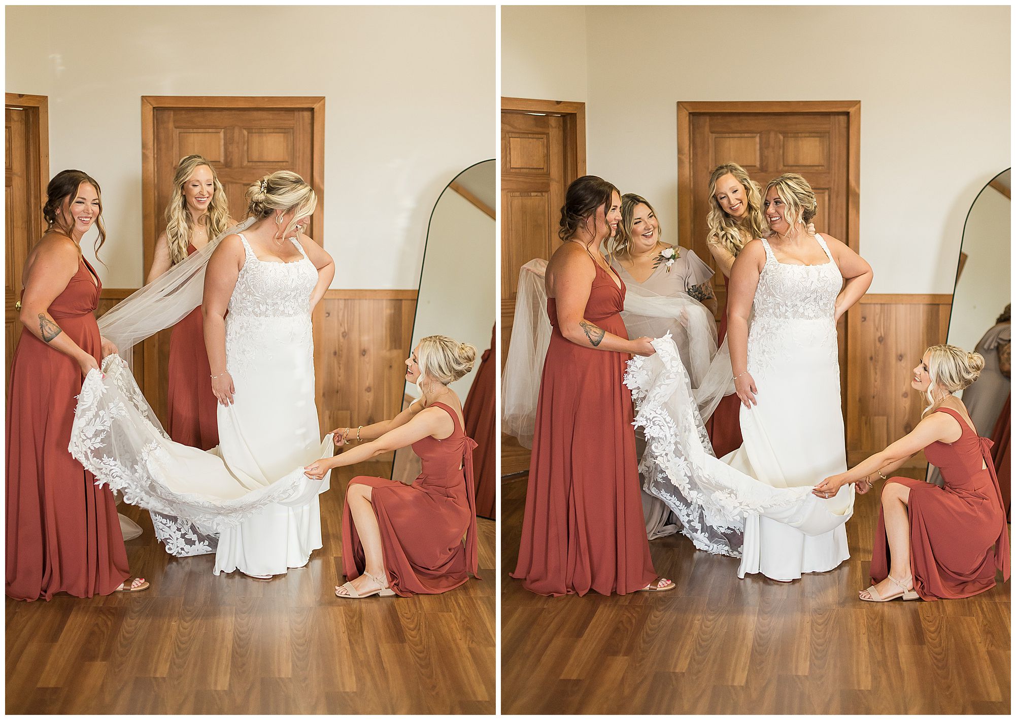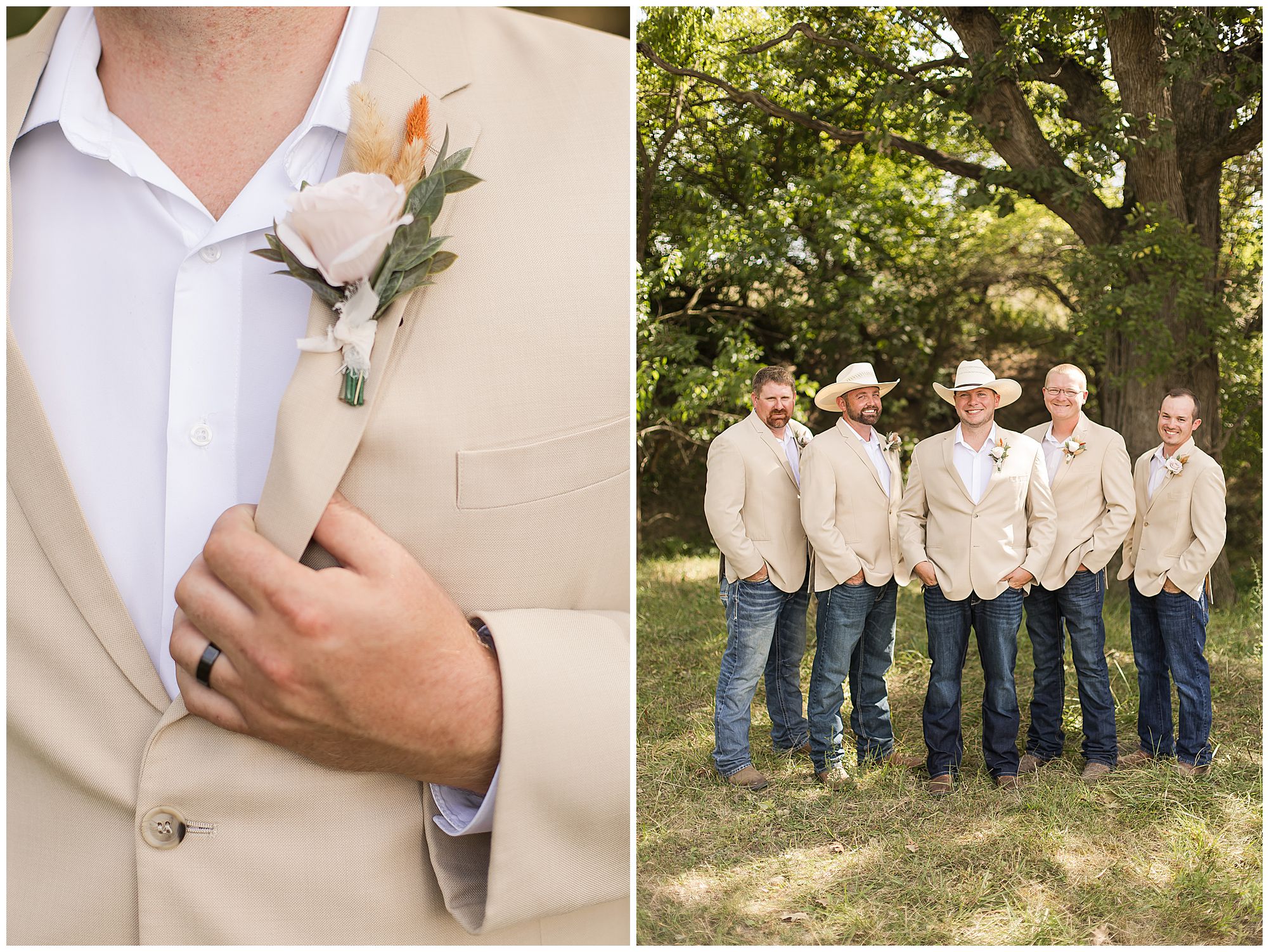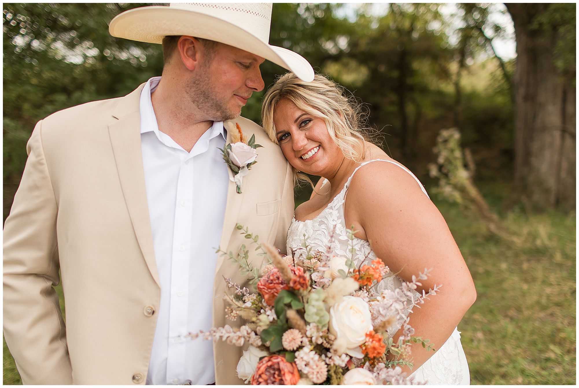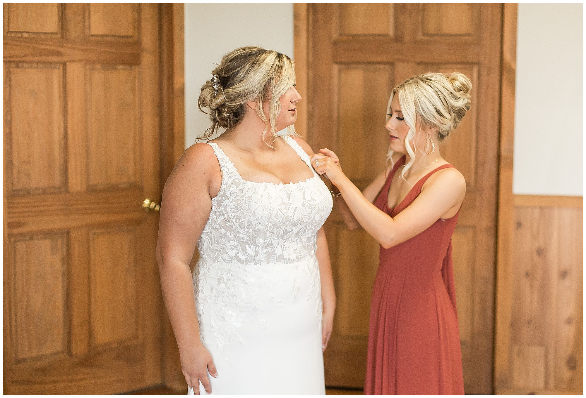 The Baker Family Farm has been part of Whitney’s history since 1883. She and Tommy both live and breathe farming. They help raise the cattle, they know the land for miles around, they each work in the Ag service industry (and are even taking their honeymoon later to an Ag conference!) And one day…The Baker Farm will continue to be worked by Whitney and her family. Which is why it meant so much to her to hold her and Tommy’s nuptials on this farm! Their mid-September wedding day was warmer than predicted, but the sun was out and it was lovely! Whitney and her ladies got ready at her dad’s house right in front of where the ceremony was going to be held, making logistics for the day super easy. The color pallet of burnt orange, tan, and greenery along with lots of fall textures made such a statement when it came time for details and the bridesmaids to get dressed. Whitney also had a first for me with her friend, Teddy, standing in and helping out as an, “Usherette”! Love the coined new term! Then it was time for Whitney to step into her gown and this moment was special. She was beaming with joy as she stood in her lace dress with buttons all the way down the long train. Her ladies assisted her with all the final details before she had a first look with her dad followed by Tommy. Both her dad and her soon-to-be husband grinned from ear to ear when they saw this beautiful bride! Tommy got a little emotional while he and Whitney took some time to read private vows to one another. So sweet! Before we get these two hitched though, they decided to knock out some photos!