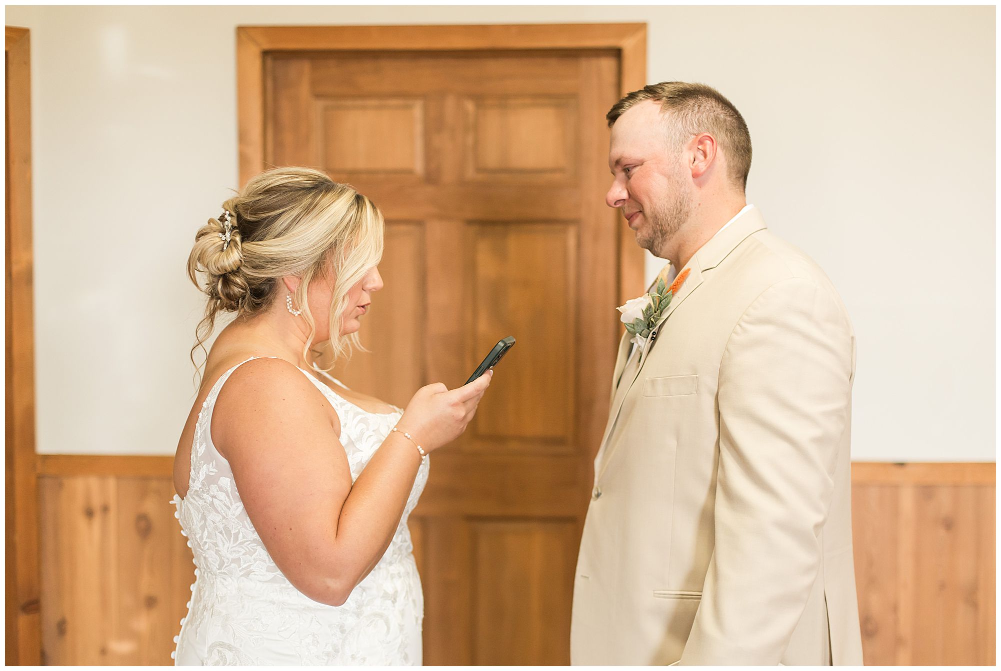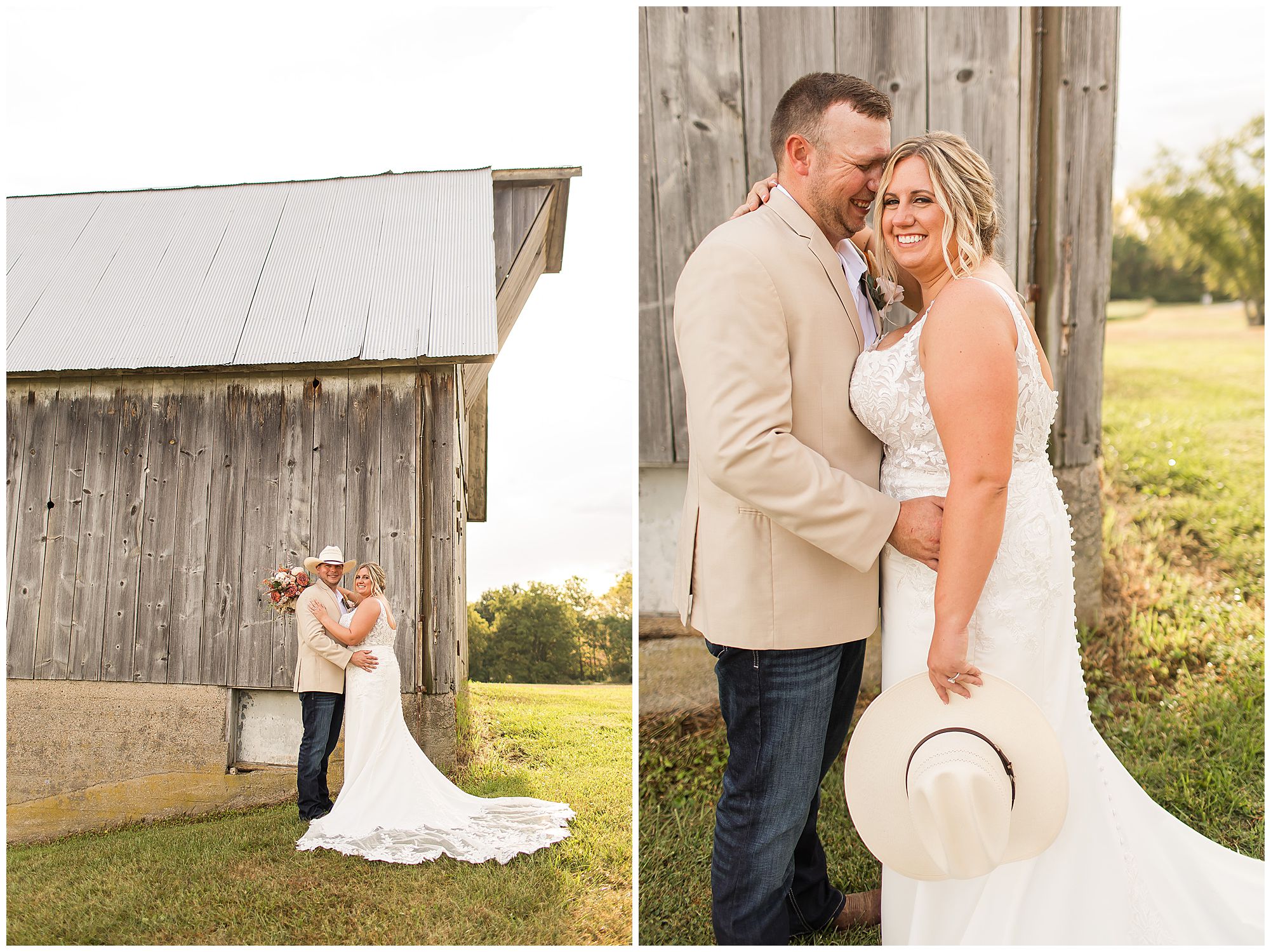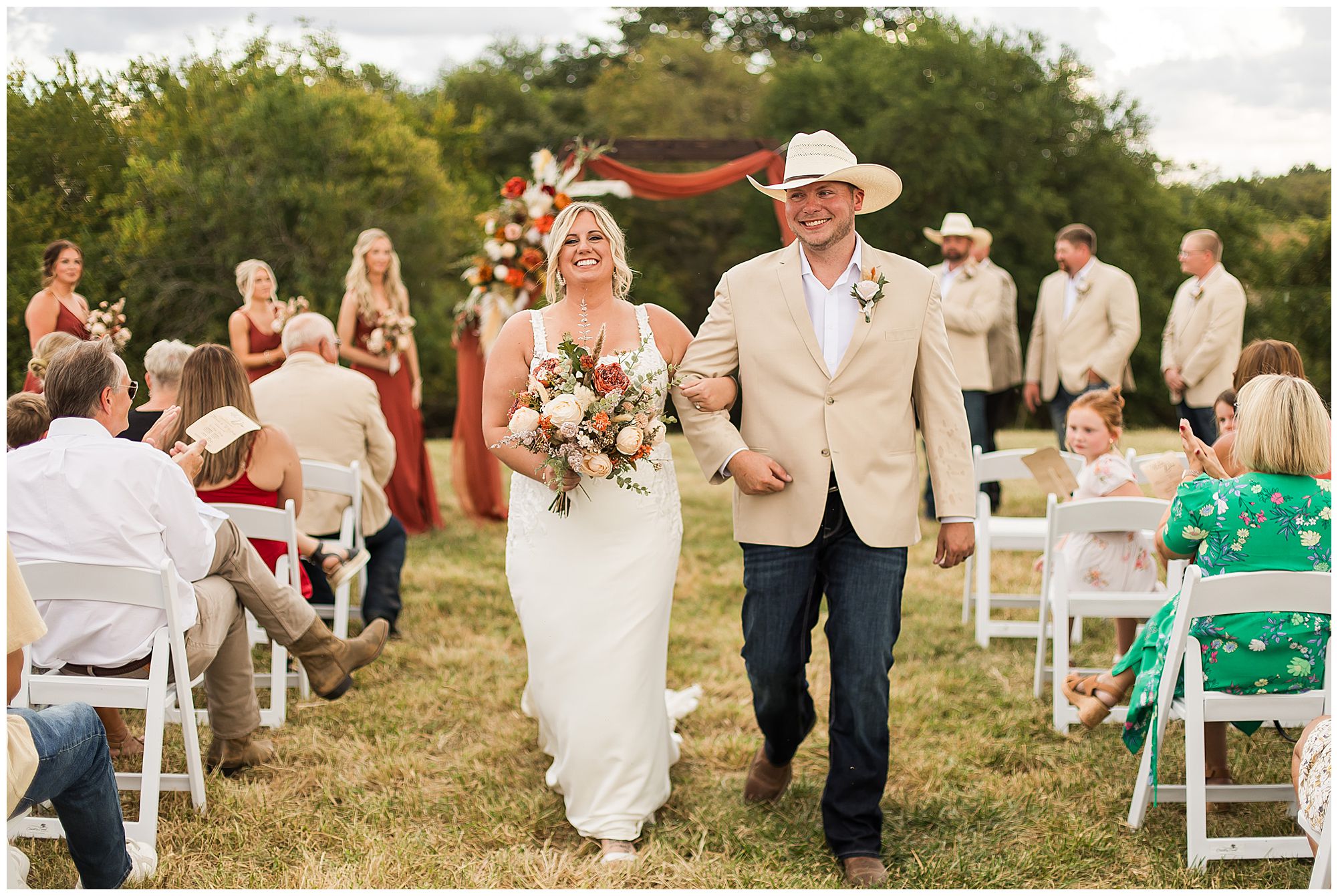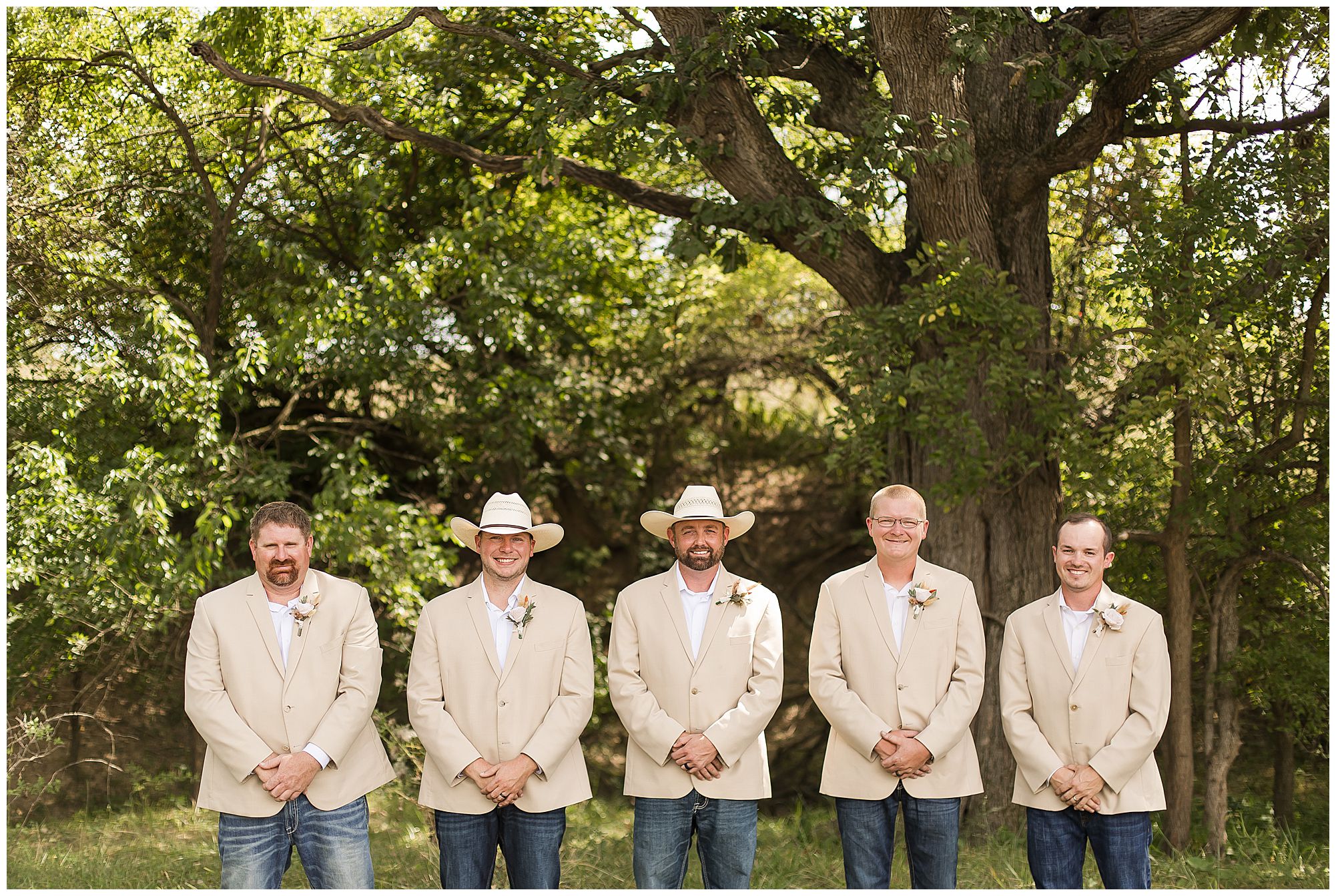 The Baker Family Farm has been part of Whitney’s history since 1883. She and Tommy both live and breathe farming. They help raise the cattle, they know the land for miles around, they each work in the Ag service industry (and are even taking their honeymoon later to an Ag conference!) And one day…The Baker Farm will continue to be worked by Whitney and her family. Which is why it meant so much to her to hold her and Tommy’s nuptials on this farm! Their mid-September wedding day was warmer than predicted, but the sun was out and it was lovely! Whitney and her ladies got ready at her dad’s house right in front of where the ceremony was going to be held, making logistics for the day super easy. The color pallet of burnt orange, tan, and greenery along with lots of fall textures made such a statement when it came time for details and the bridesmaids to get dressed. Whitney also had a first for me with her friend, Teddy, standing in and helping out as an, “Usherette”! Love the coined new term! Then it was time for Whitney to step into her gown and this moment was special. She was beaming with joy as she stood in her lace dress with buttons all the way down the long train. Her ladies assisted her with all the final details before she had a first look with her dad followed by Tommy. Both her dad and her soon-to-be husband grinned from ear to ear when they saw this beautiful bride! Tommy got a little emotional while he and Whitney took some time to read private vows to one another. So sweet! Before we get these two hitched though, they decided to knock out some photos!