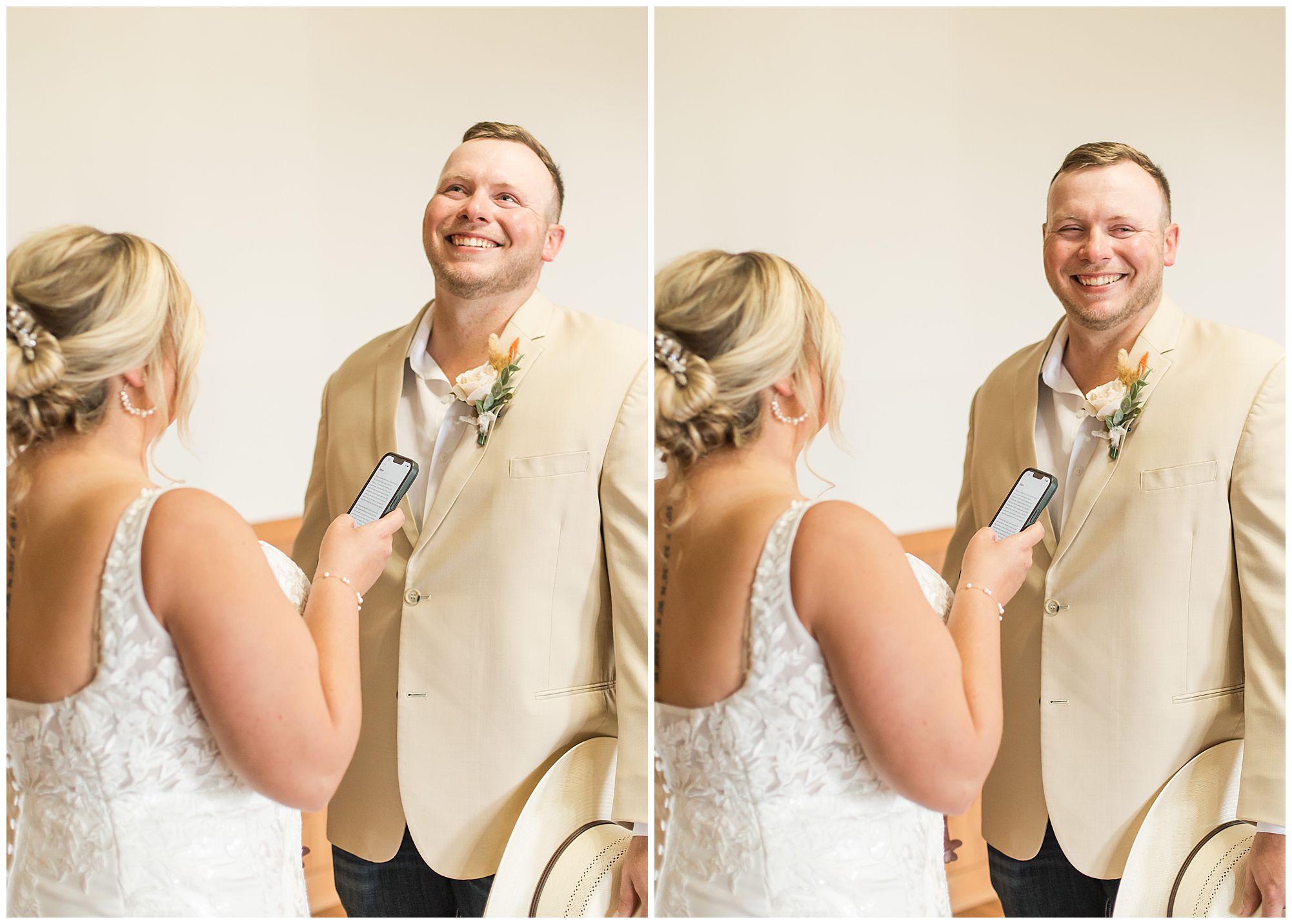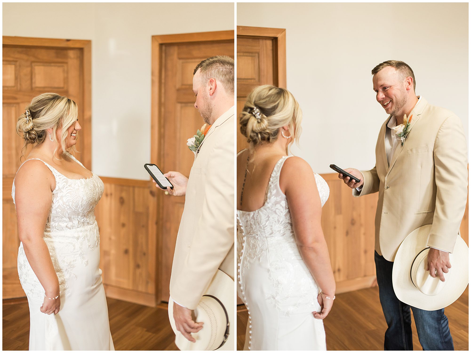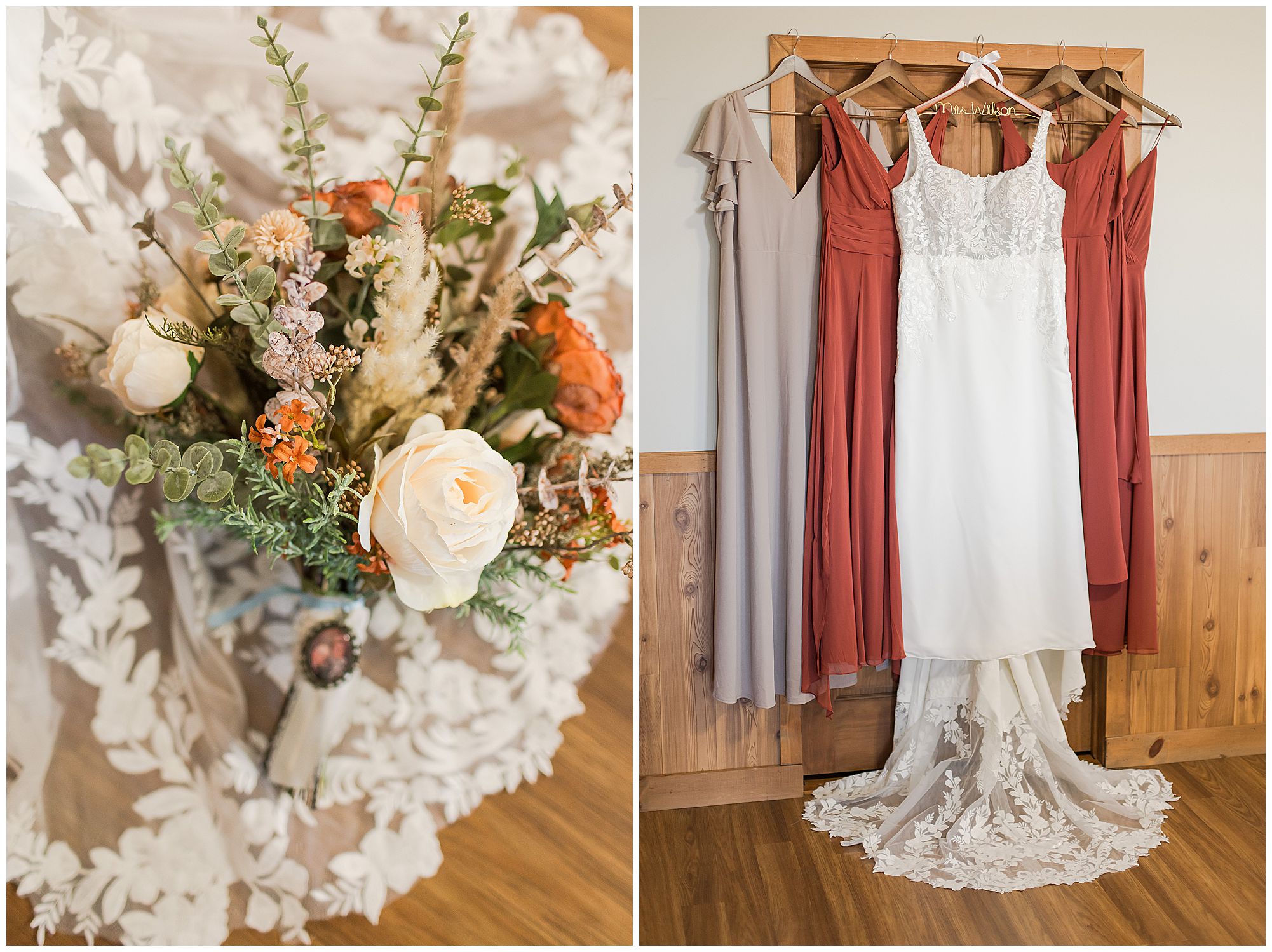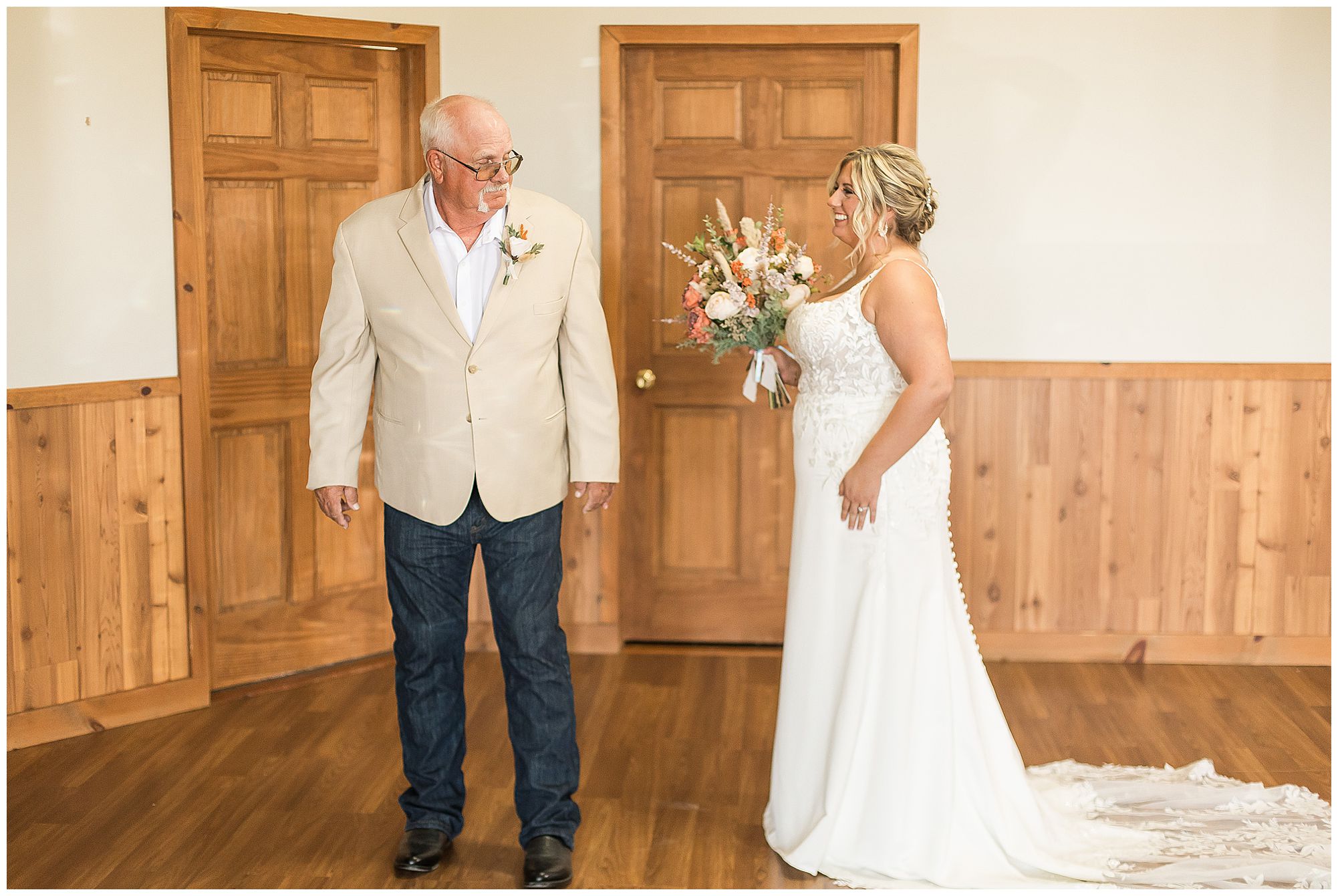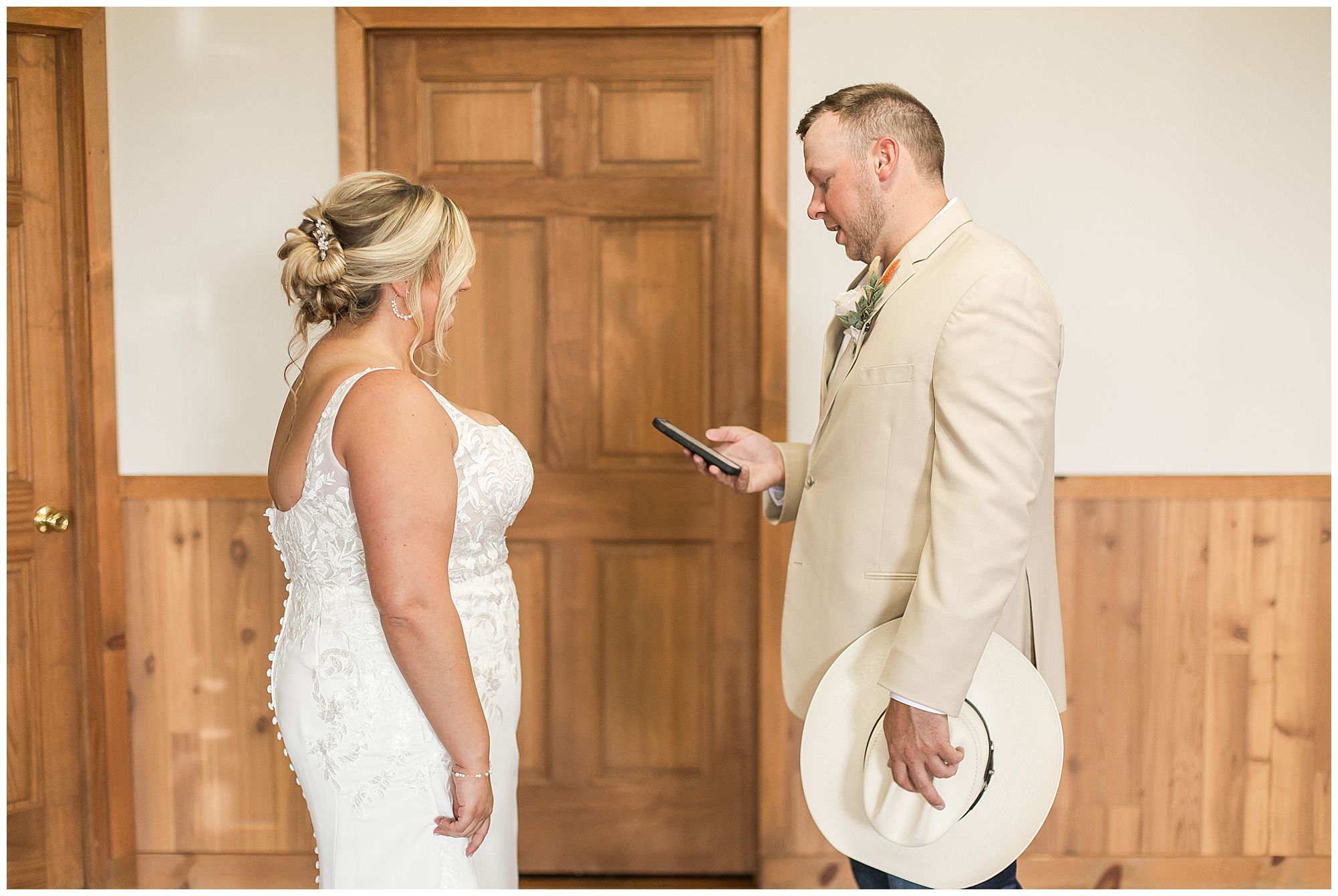 The Baker Family Farm has been part of Whitney’s history since 1883. She and Tommy both live and breathe farming. They help raise the cattle, they know the land for miles around, they each work in the Ag service industry (and are even taking their honeymoon later to an Ag conference!) And one day…The Baker Farm will continue to be worked by Whitney and her family. Which is why it meant so much to her to hold her and Tommy’s nuptials on this farm! Their mid-September wedding day was warmer than predicted, but the sun was out and it was lovely! Whitney and her ladies got ready at her dad’s house right in front of where the ceremony was going to be held, making logistics for the day super easy. The color pallet of burnt orange, tan, and greenery along with lots of fall textures made such a statement when it came time for details and the bridesmaids to get dressed. Whitney also had a first for me with her friend, Teddy, standing in and helping out as an, “Usherette”! Love the coined new term! Then it was time for Whitney to step into her gown and this moment was special. She was beaming with joy as she stood in her lace dress with buttons all the way down the long train. Her ladies assisted her with all the final details before she had a first look with her dad followed by Tommy. Both her dad and her soon-to-be husband grinned from ear to ear when they saw this beautiful bride! Tommy got a little emotional while he and Whitney took some time to read private vows to one another. So sweet! Before we get these two hitched though, they decided to knock out some photos!