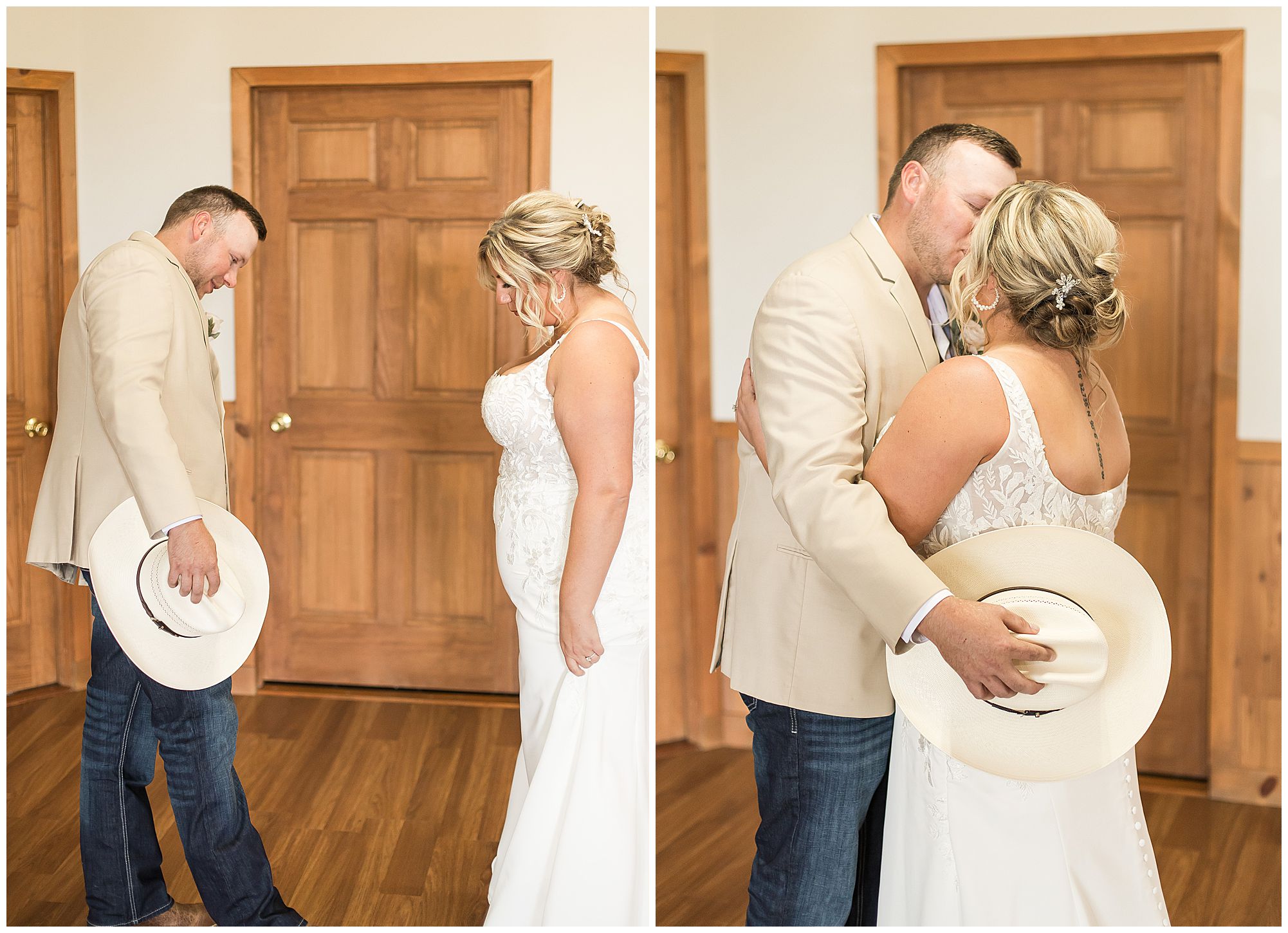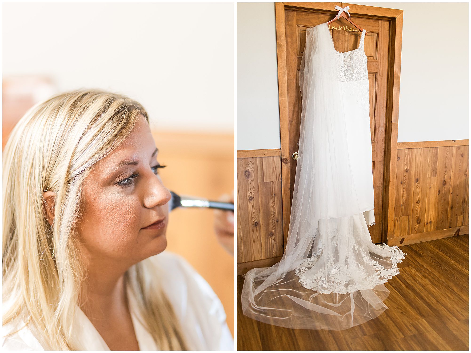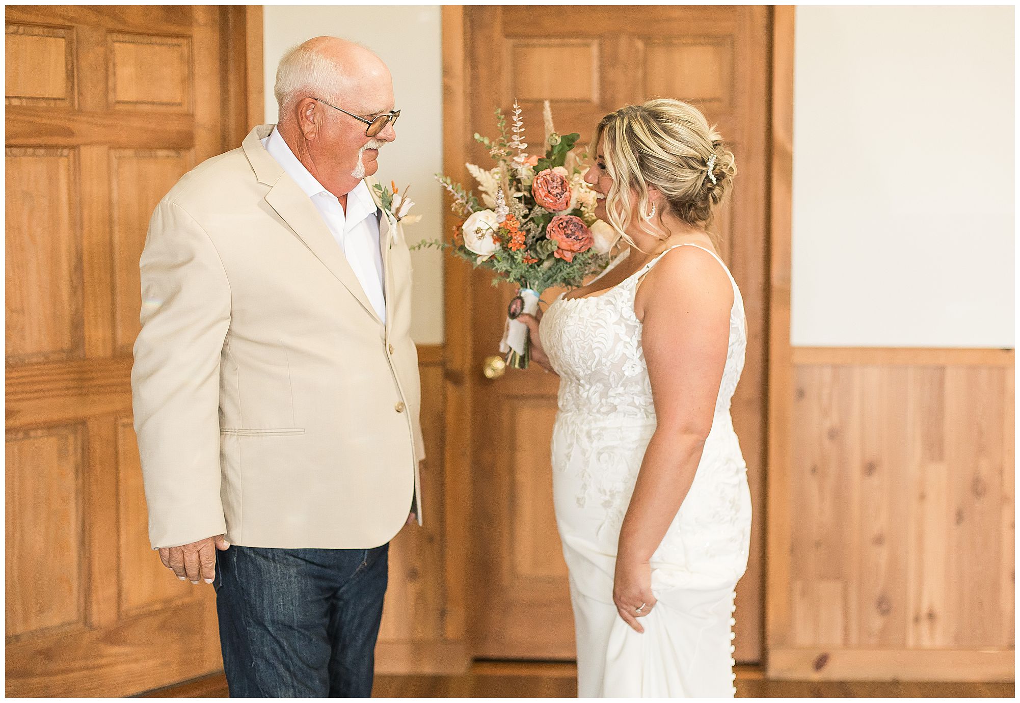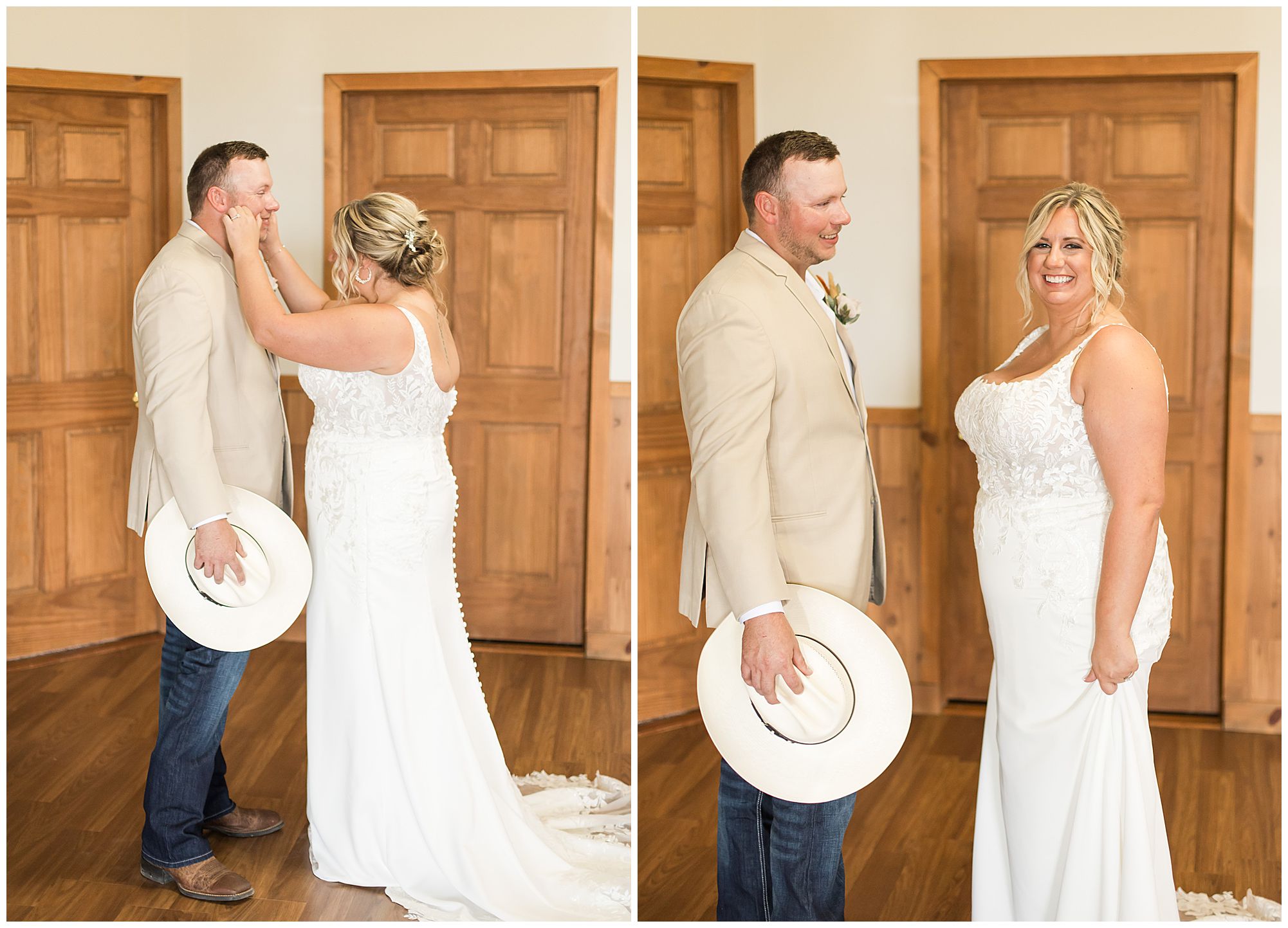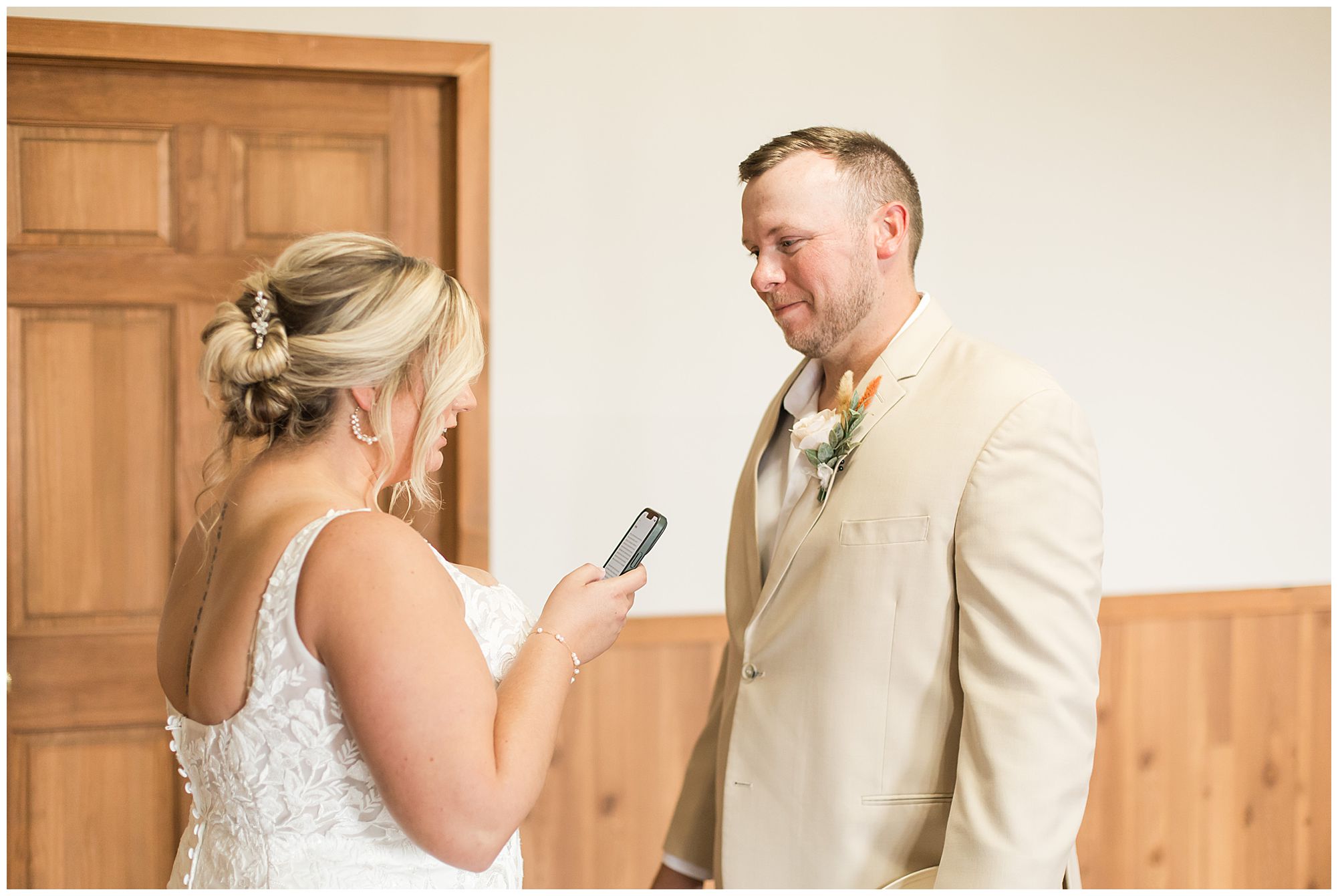 The Baker Family Farm has been part of Whitney’s history since 1883. She and Tommy both live and breathe farming. They help raise the cattle, they know the land for miles around, they each work in the Ag service industry (and are even taking their honeymoon later to an Ag conference!) And one day…The Baker Farm will continue to be worked by Whitney and her family. Which is why it meant so much to her to hold her and Tommy’s nuptials on this farm! Their mid-September wedding day was warmer than predicted, but the sun was out and it was lovely! Whitney and her ladies got ready at her dad’s house right in front of where the ceremony was going to be held, making logistics for the day super easy. The color pallet of burnt orange, tan, and greenery along with lots of fall textures made such a statement when it came time for details and the bridesmaids to get dressed. Whitney also had a first for me with her friend, Teddy, standing in and helping out as an, “Usherette”! Love the coined new term! Then it was time for Whitney to step into her gown and this moment was special. She was beaming with joy as she stood in her lace dress with buttons all the way down the long train. Her ladies assisted her with all the final details before she had a first look with her dad followed by Tommy. Both her dad and her soon-to-be husband grinned from ear to ear when they saw this beautiful bride! Tommy got a little emotional while he and Whitney took some time to read private vows to one another. So sweet! Before we get these two hitched though, they decided to knock out some photos!