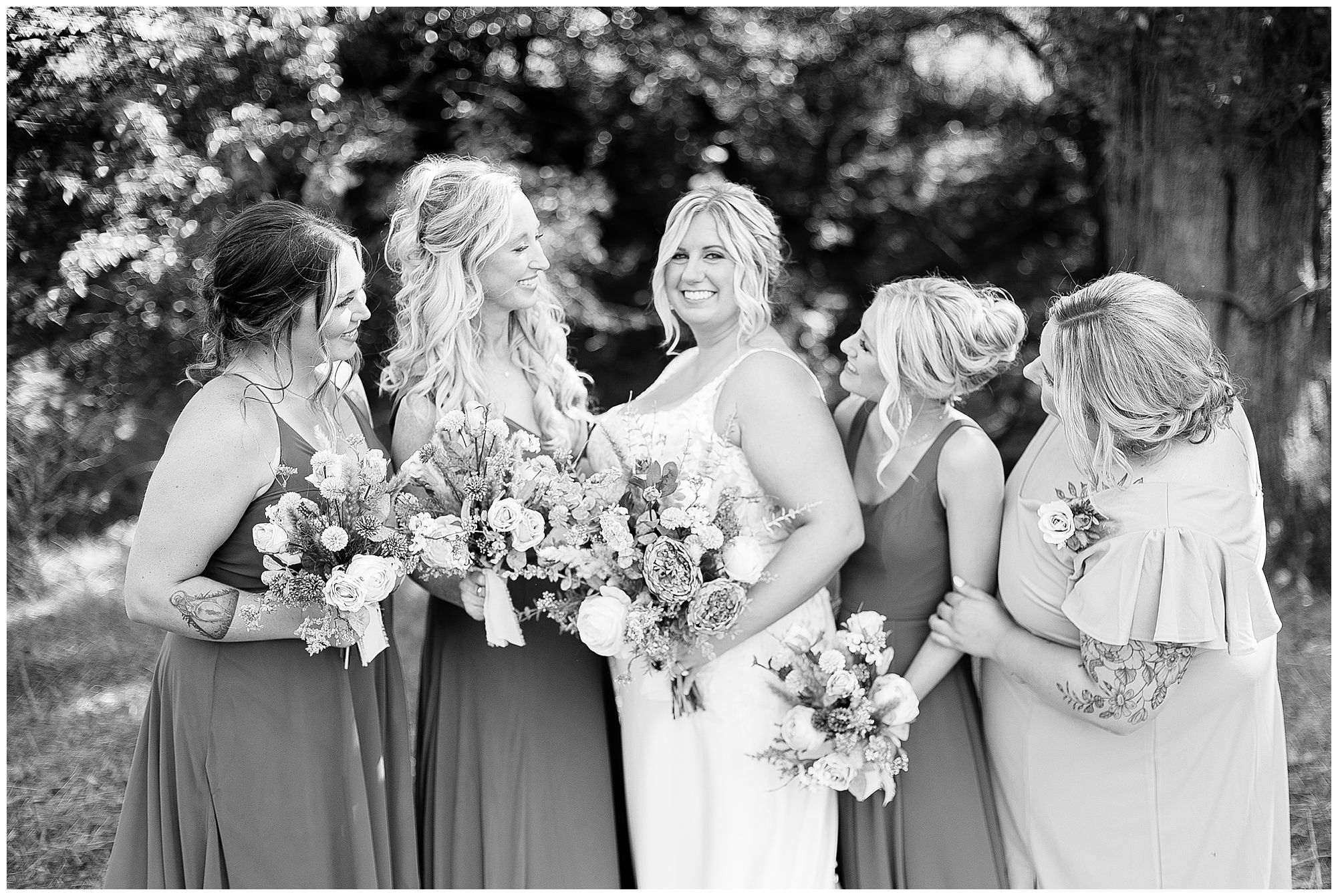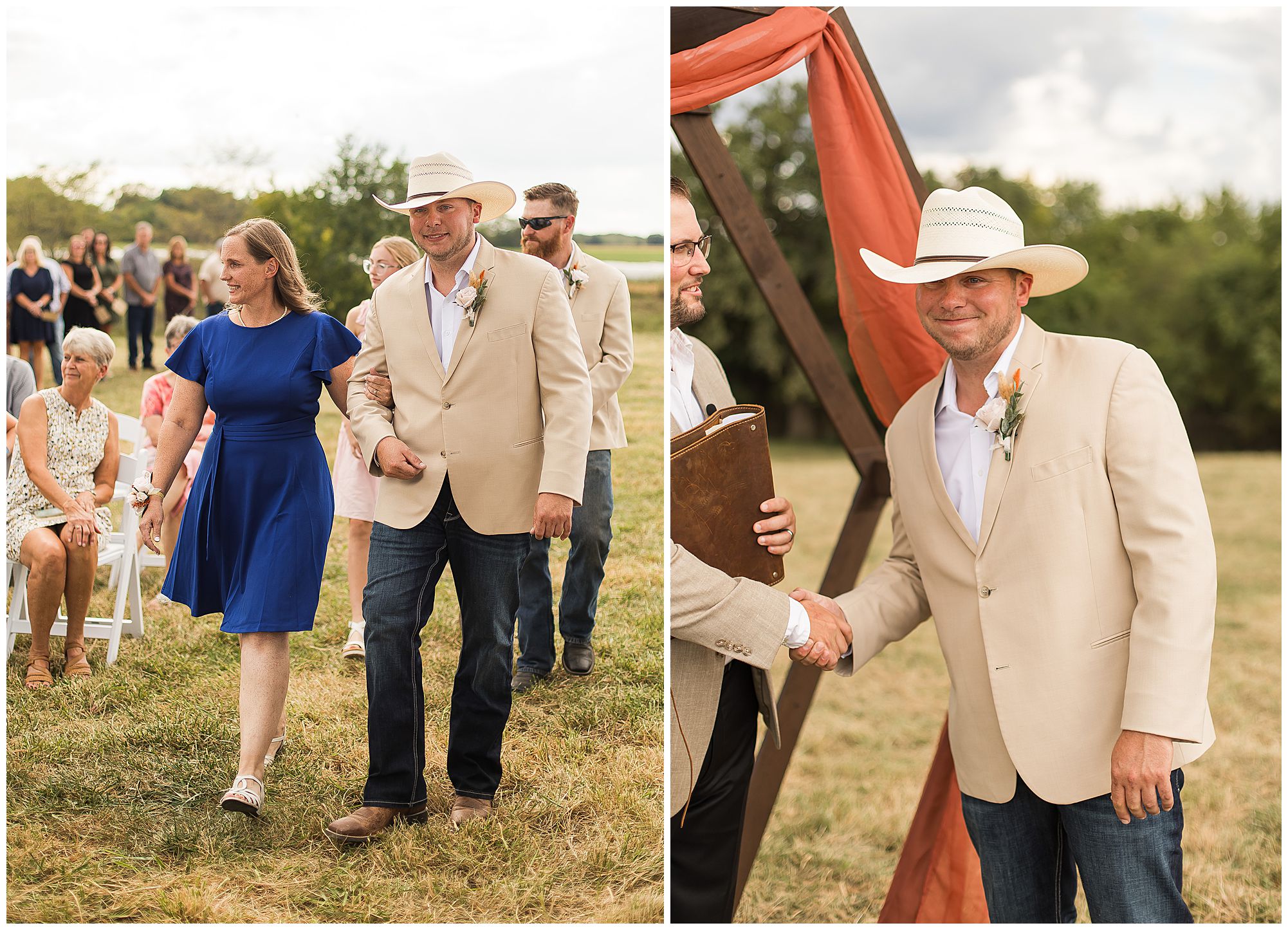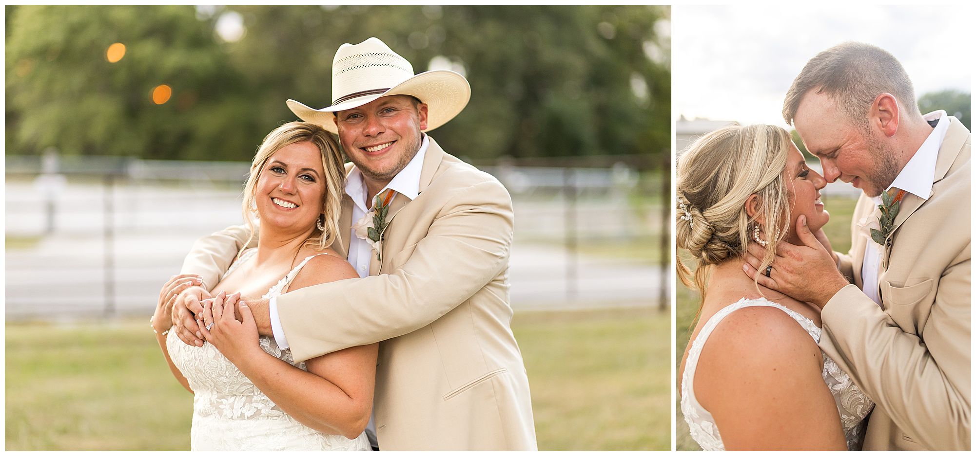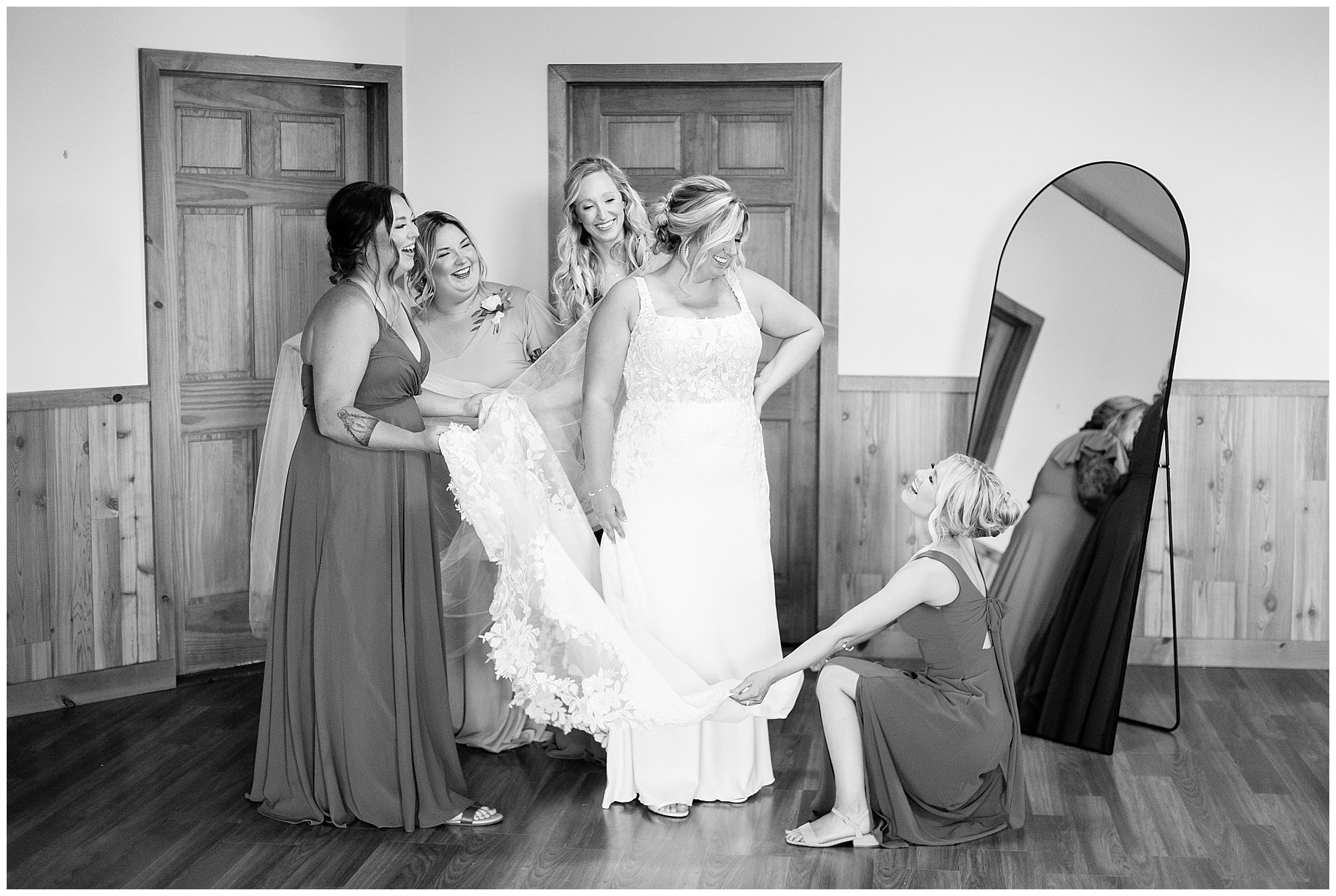 The Baker Family Farm has been part of Whitney’s history since 1883. She and Tommy both live and breathe farming. They help raise the cattle, they know the land for miles around, they each work in the Ag service industry (and are even taking their honeymoon later to an Ag conference!) And one day…The Baker Farm will continue to be worked by Whitney and her family. Which is why it meant so much to her to hold her and Tommy’s nuptials on this farm! Their mid-September wedding day was warmer than predicted, but the sun was out and it was lovely! Whitney and her ladies got ready at her dad’s house right in front of where the ceremony was going to be held, making logistics for the day super easy. The color pallet of burnt orange, tan, and greenery along with lots of fall textures made such a statement when it came time for details and the bridesmaids to get dressed. Whitney also had a first for me with her friend, Teddy, standing in and helping out as an, “Usherette”! Love the coined new term! Then it was time for Whitney to step into her gown and this moment was special. She was beaming with joy as she stood in her lace dress with buttons all the way down the long train. Her ladies assisted her with all the final details before she had a first look with her dad followed by Tommy. Both her dad and her soon-to-be husband grinned from ear to ear when they saw this beautiful bride! Tommy got a little emotional while he and Whitney took some time to read private vows to one another. So sweet! Before we get these two hitched though, they decided to knock out some photos!