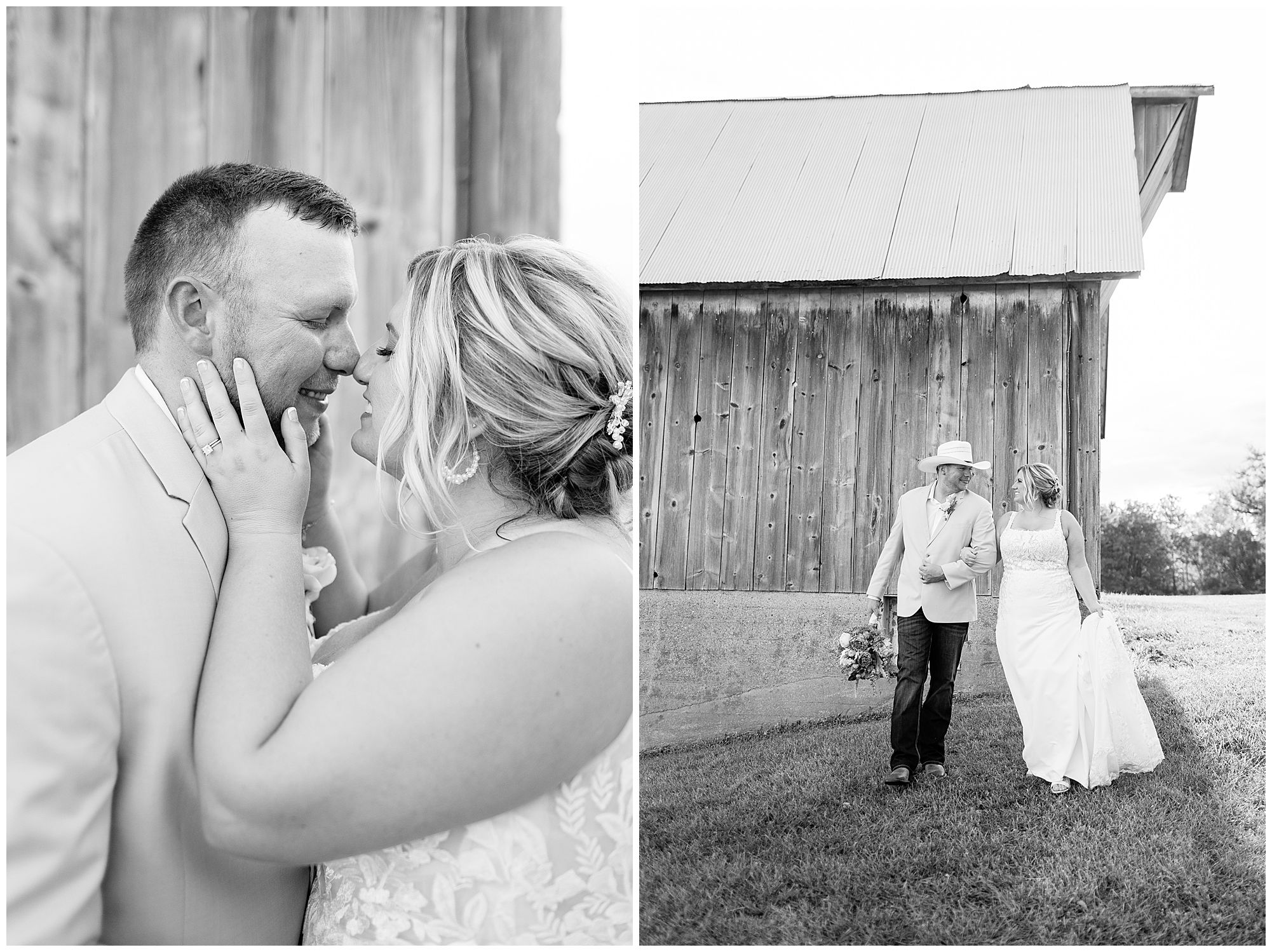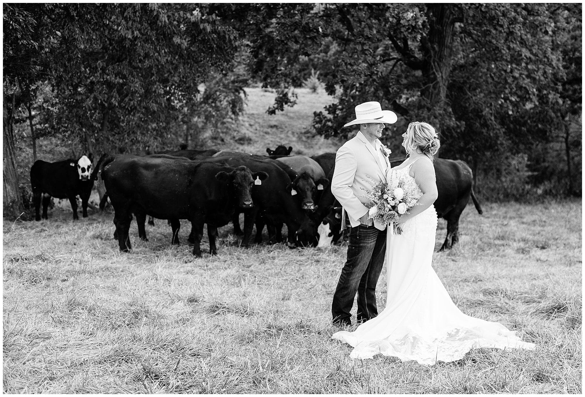 We found a gorgeous spot in the pasture with some much needed shade and a stunning old tree to provide a magnificent backdrop for bridal party photos. With the orange and tans of their attire, this good looking crew just popped right off the photos! OBSESSED! There was no shortage of laughter and joking with this bunch! Even with the hot temps, everyone was in a great mood and having a blast. Before I let this adorable couple go it was time for their close up! Tommy with his cowboy hat and jeans next to his stunning bride in her amazing white dress holding tight to his arm! What is not to love!?! The wind was a little wild on their wedding day, but Whitney had her heart set on some veil shots. So we popped in her veil for a bit and just when we did the sun came out from behind the clouds like it knew it was its moment to shine! I do love me a great veil shot! One other “must have” Whitney’s heart was set on was heading out to the cow pasture for a few photos with the cattle. We did this for their engagement session and had so much fun that we just had to give it another try on wedding day. Of course with Whitney in a big white dress and heading into a cow pasture, it was a touch different! But, Whitney is a true farm girl and was not scared to make her way through the pasture in her dress…heels and all! And the photos were so worth it!