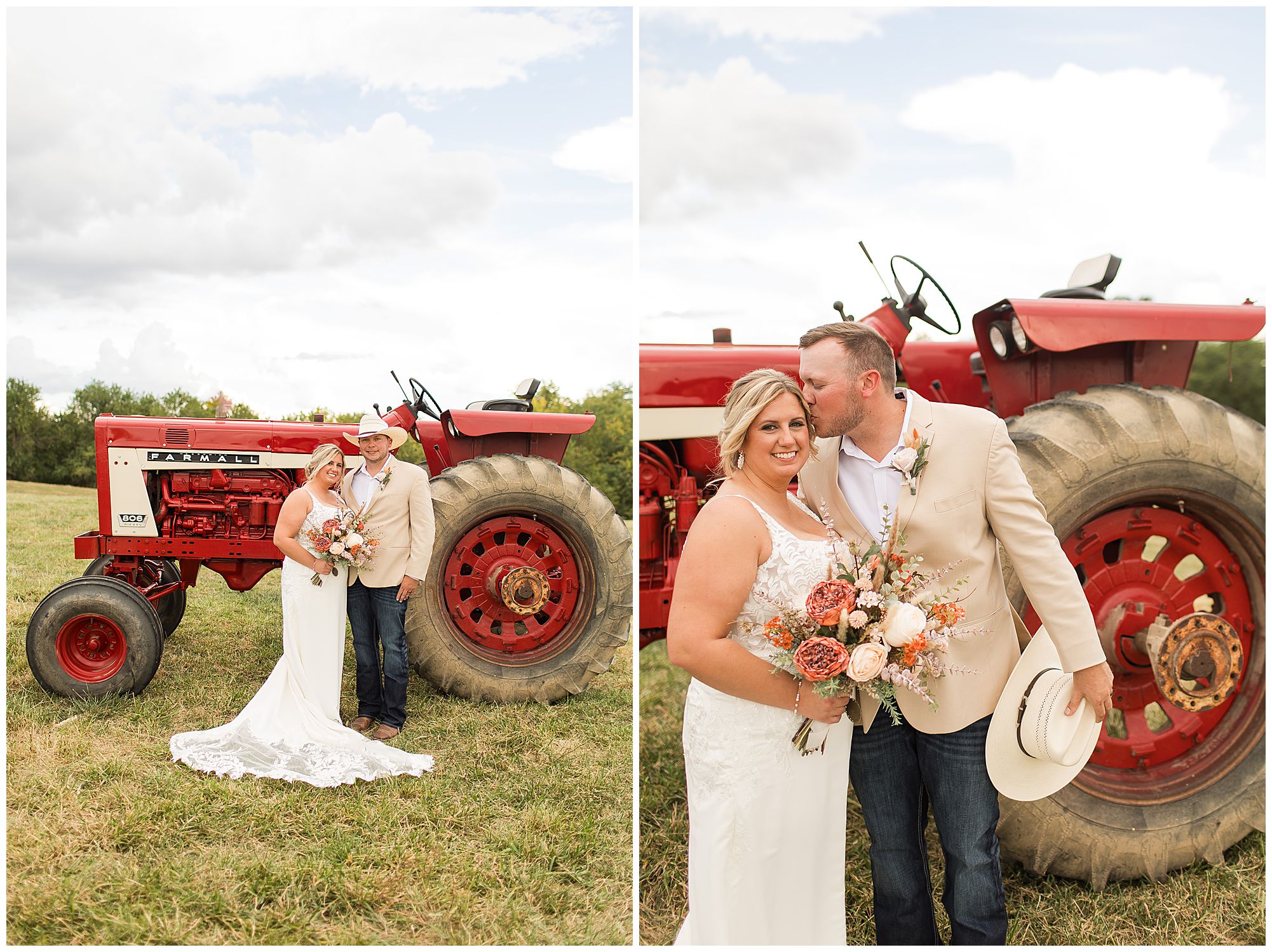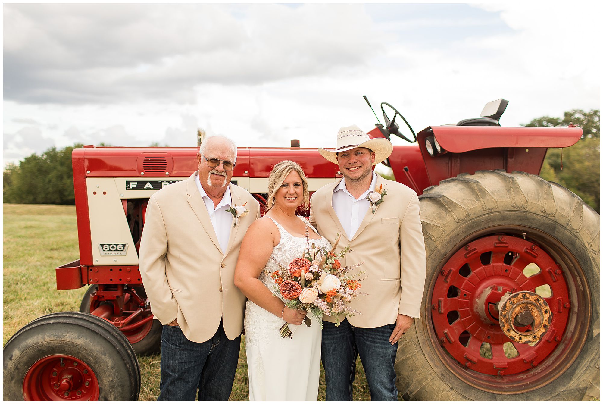 Ceremony time was upon us and as we walked up towards the delightful spot where Whitney and Tommy were planning to say their “I Dos” a big dark cloud was rumbling with thunder in the distance coming over the hill! I heard a guest mention they had just driven through a ton of rain to get here and I was a little concerned we were about to get poured on. I secretly grabbed a couple of clear umbrellas to have close on hand just “in case” a few drops fell. Tommy made his way up the aisle escorting his mom and Whitney made her approach with her father in no better way a farmer could, but in a truck! Her dad helped her out and they began the walk up the aisle towards her new future. Tommy’s emotions definitely got the best of him, which he even confirmed with the officiant as Whitney approached with her father. As Whitney’s dad was about to give her away I’m pretty sure the loving words he said were, “She’s your problem now, Tommy,” before he snickered at his daughter and gave her the biggest hug! That’s the exact kind of relationship Whitney and her father have and it’s an amazing one! The couple had two special family friends and mentors speak during their nuptials to help give words of wisdom and guidance. As we inched closer to the end of the ceremony a few drops of rain began to fall. I grabbed one of my clear umbrellas and slowly made my way up the side aisle of the chairs in the line of sight of Whitney to see if she wanted it to avoid getting wet. I never want to be part of the memories of the day if you will, but I also don’t want a bride getting soaked if I can help it! Luckily for all of us, the rain stopped just as quickly as it began. Whitney & Tommy sealed everything with a kiss and were pronounced Mr. & Mrs. Wilson! One important aspect of the day that Whitney brought up to me from the very beginning of planning was including her great grandfather’s red tractor. This heirloom was meaningful to her, Tommy, and her father so much so that we even ended up taking family photos in front of it, which really gave a personal touch.