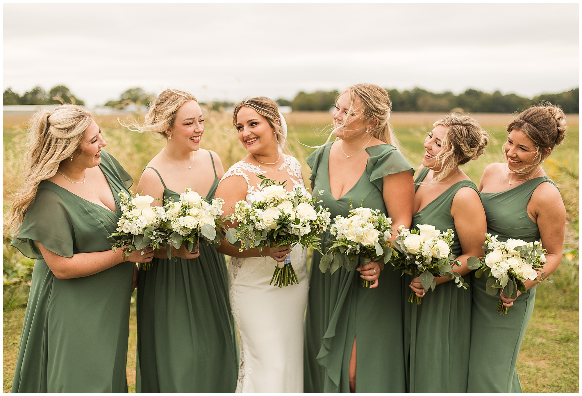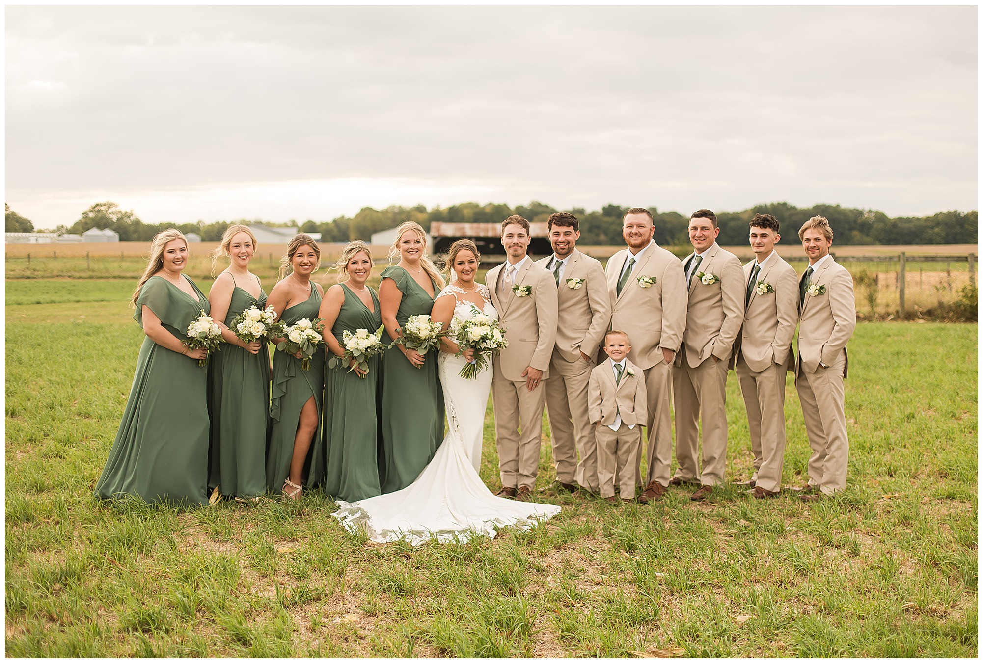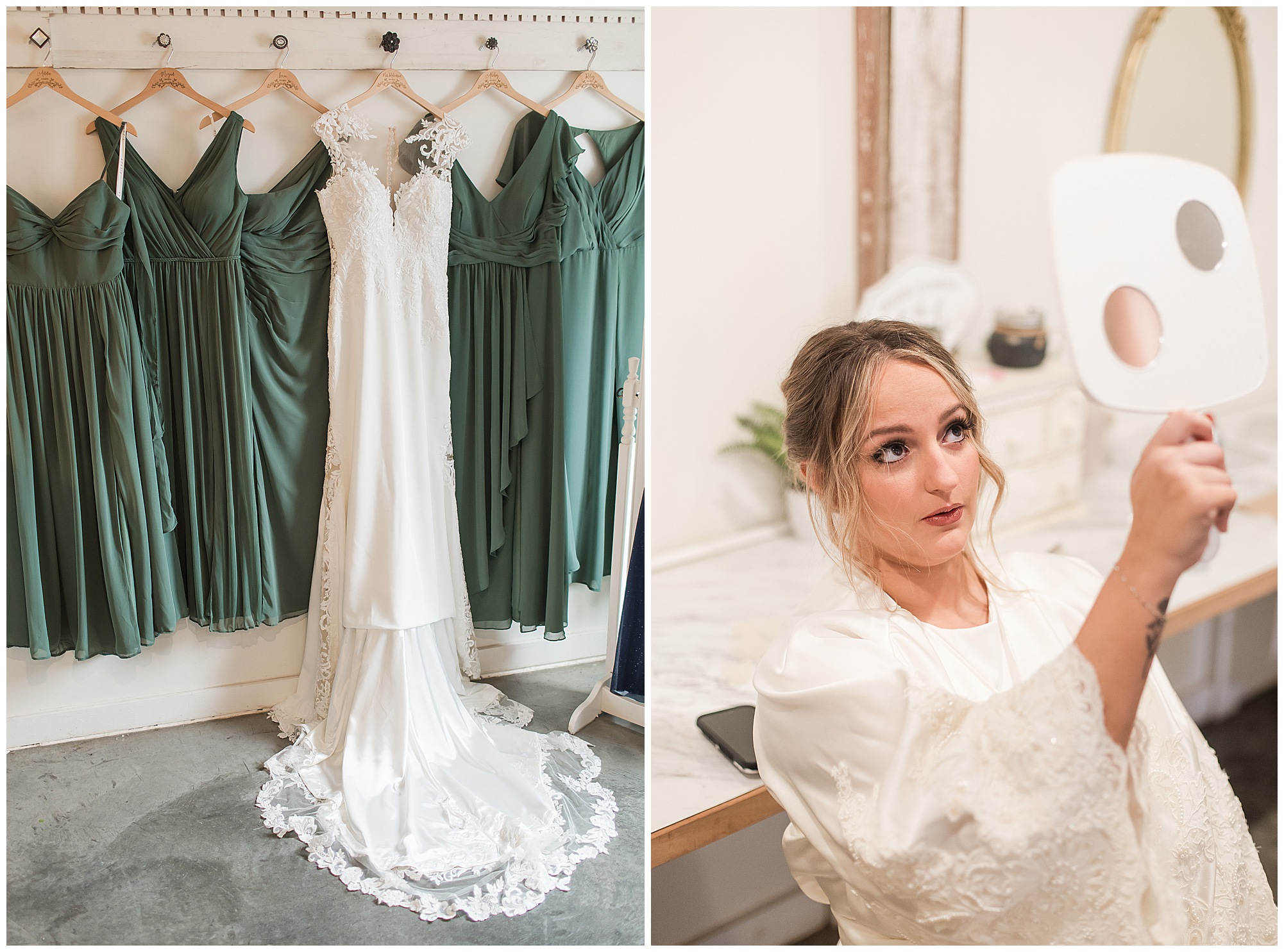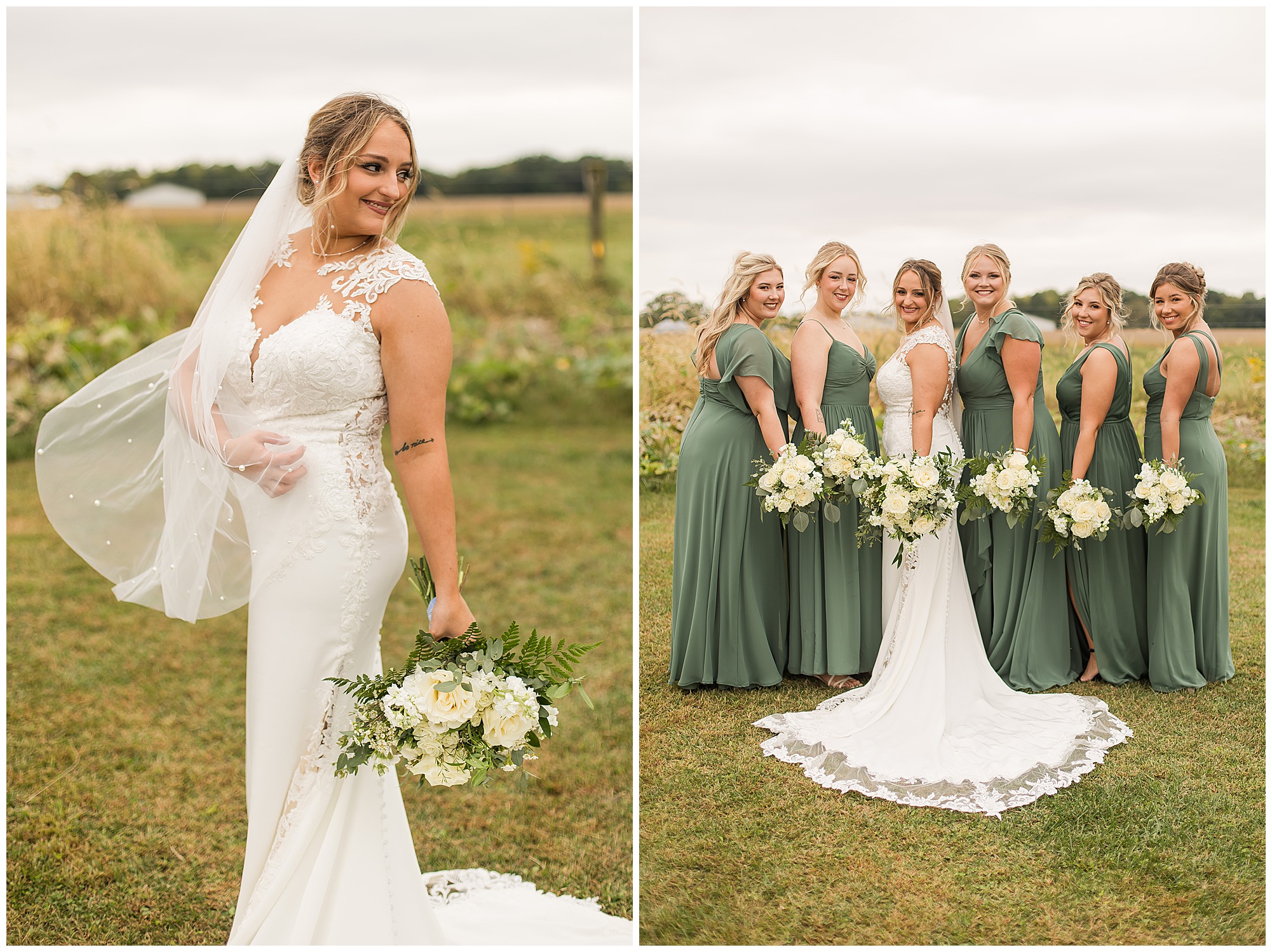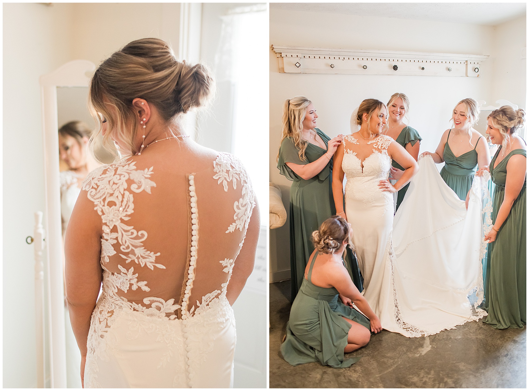 Christy and Lucas had the most lovely September wedding day out at The Homestead in Tallula, Illinois and I’m so grateful I could be a part of capturing it all! Their fall day began early and the bridal suite was busy as Christy and the ladies were finishing up getting ready. Christy was running around wearing a beautiful robe, which I found out her mother, Nikki, had made for her out of her own wedding dress! So special! When it came time for Christy to step into her gown she was absolutely stunning! The high illusion neckline sprinkled lace florals on her shoulders and down her back along with a long row of buttons. And a lace train brought the drama for this bride and her incredible look. Christy topped it off with a pearl embellished veil every little girl dreams about! The bridesmaids all wore various styled dresses in the same shade of sage green. It was such a simple, yet classic look but when you handed the girls their white bouquets everything just popped! Christy and Lucas chose not to see each other before their ceremony so I took Christy and her ladies outside for a few photos separately. We had to compete with a little bit of wind, but these ladies were all champs and looked amazing! Now it was time to get this gorgeous bride tucked away so her groom could have a few photos!