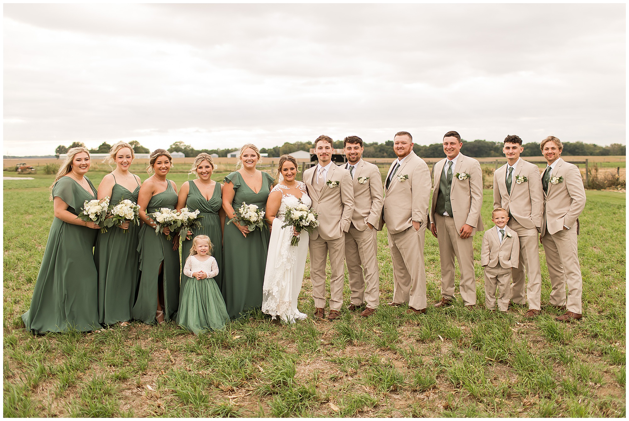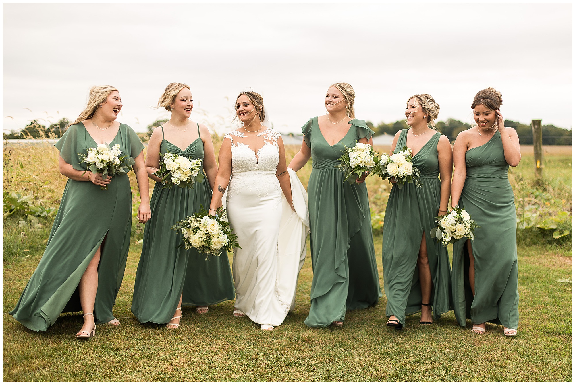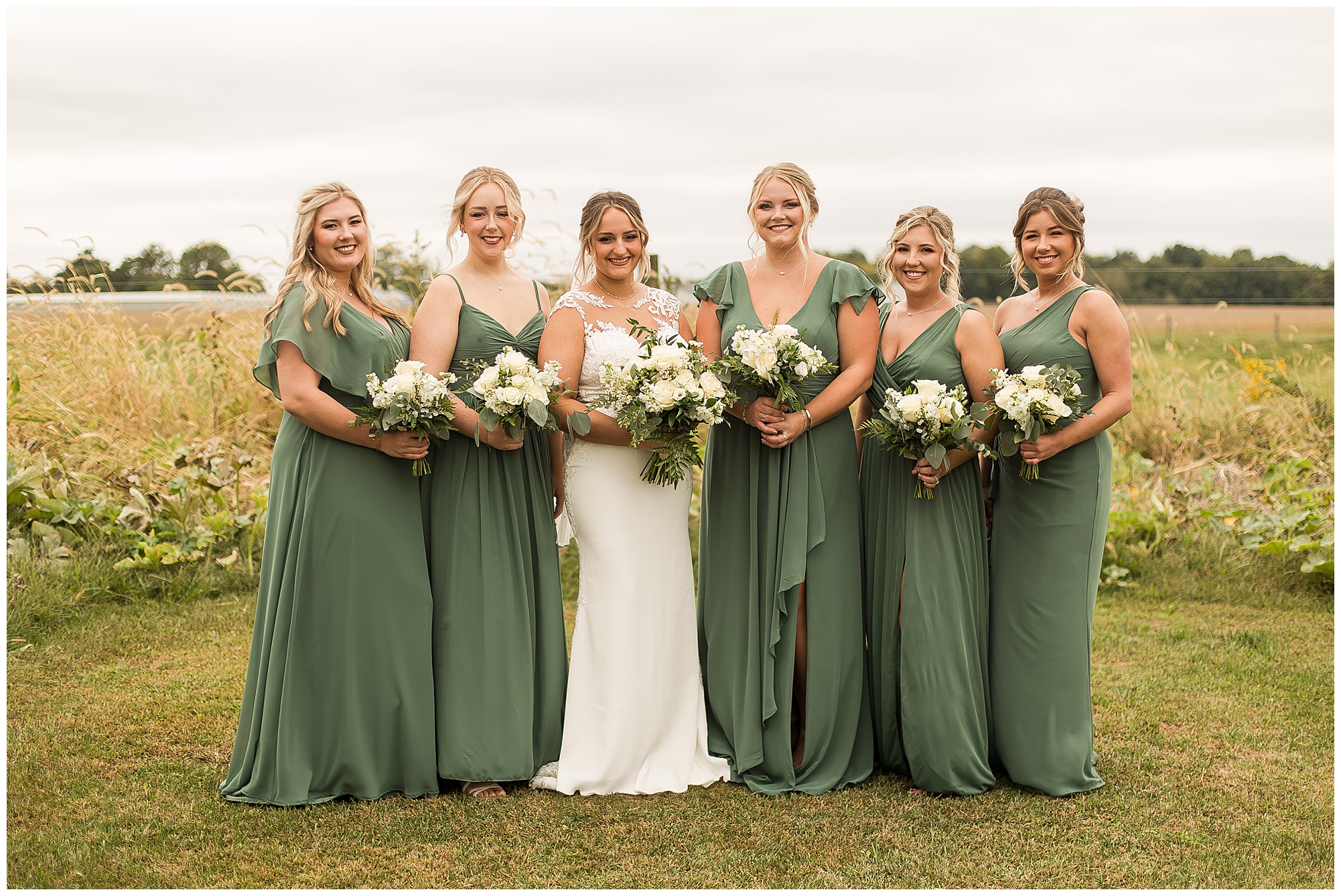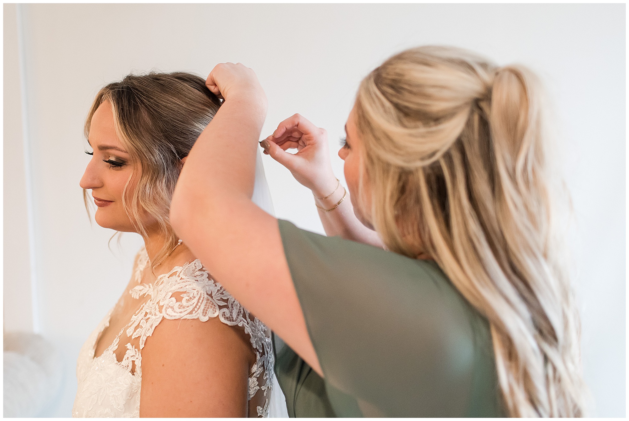Christy and Lucas had the most lovely September wedding day out at The Homestead in Tallula, Illinois and I’m so grateful I could be a part of capturing it all! Their fall day began early and the bridal suite was busy as Christy and the ladies were finishing up getting ready. Christy was running around wearing a beautiful robe, which I found out her mother, Nikki, had made for her out of her own wedding dress! So special! When it came time for Christy to step into her gown she was absolutely stunning! The high illusion neckline sprinkled lace florals on her shoulders and down her back along with a long row of buttons. And a lace train brought the drama for this bride and her incredible look. Christy topped it off with a pearl embellished veil every little girl dreams about! The bridesmaids all wore various styled dresses in the same shade of sage green. It was such a simple, yet classic look but when you handed the girls their white bouquets everything just popped! Christy and Lucas chose not to see each other before their ceremony so I took Christy and her ladies outside for a few photos separately. We had to compete with a little bit of wind, but these ladies were all champs and looked amazing! Now it was time to get this gorgeous bride tucked away so her groom could have a few photos!