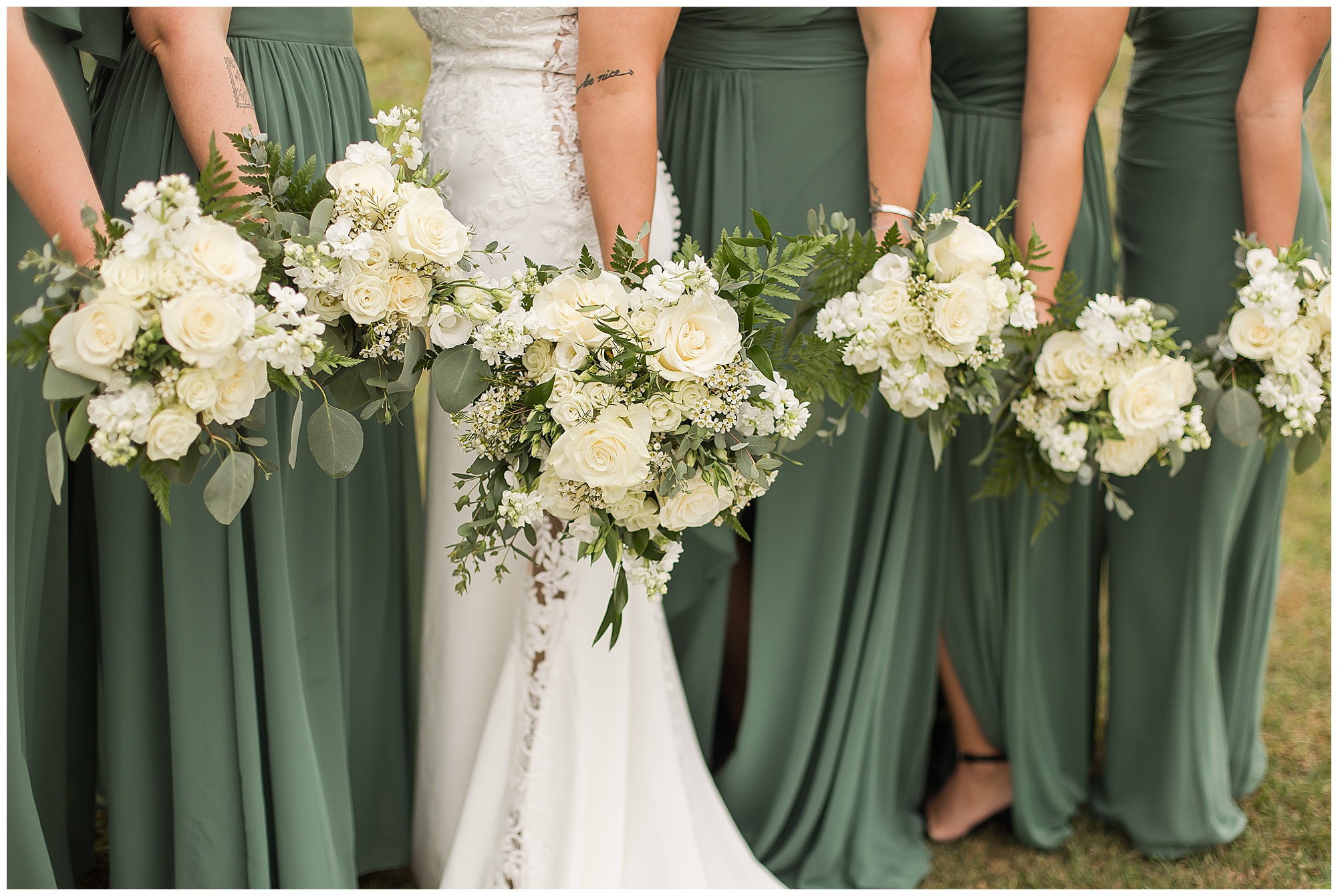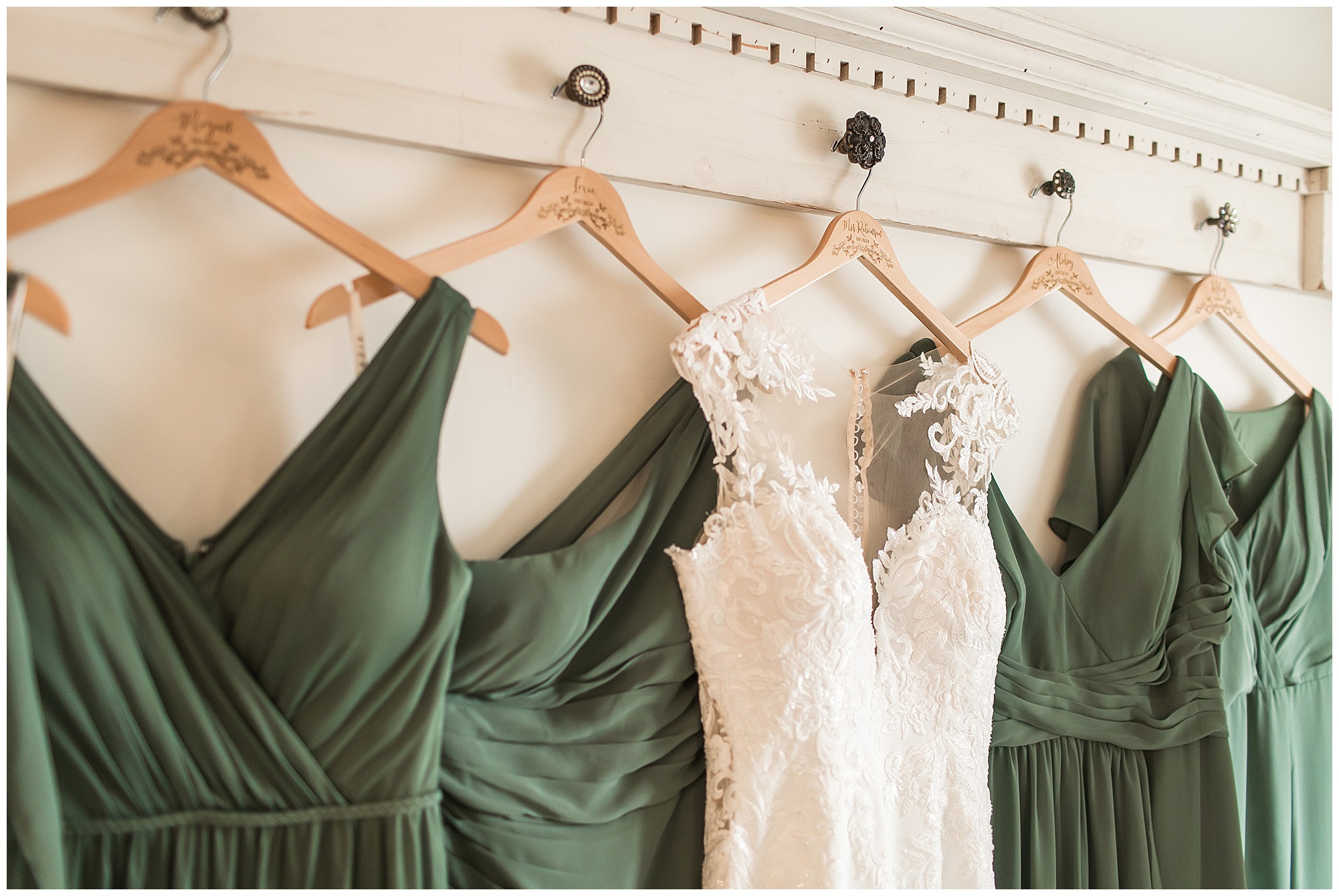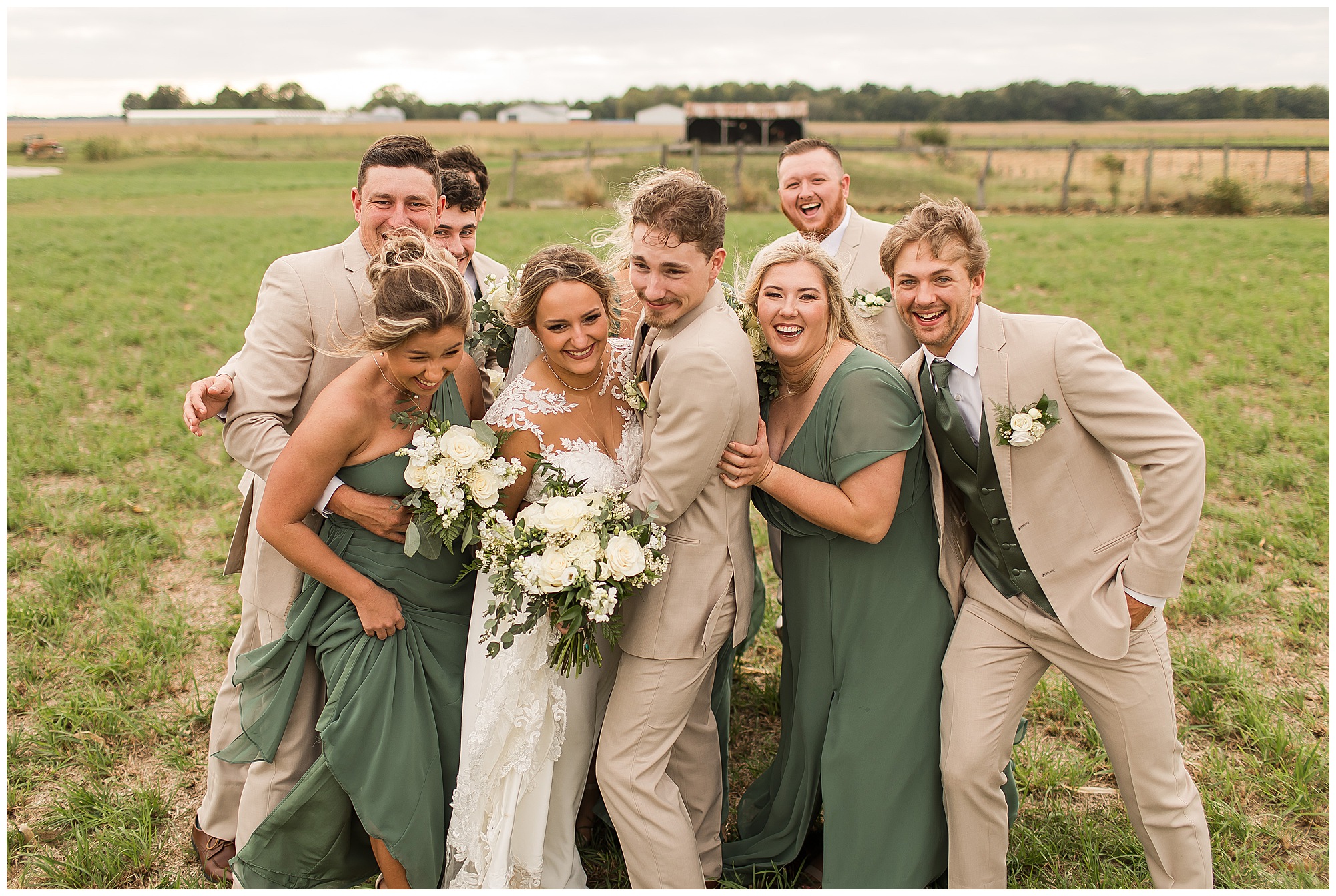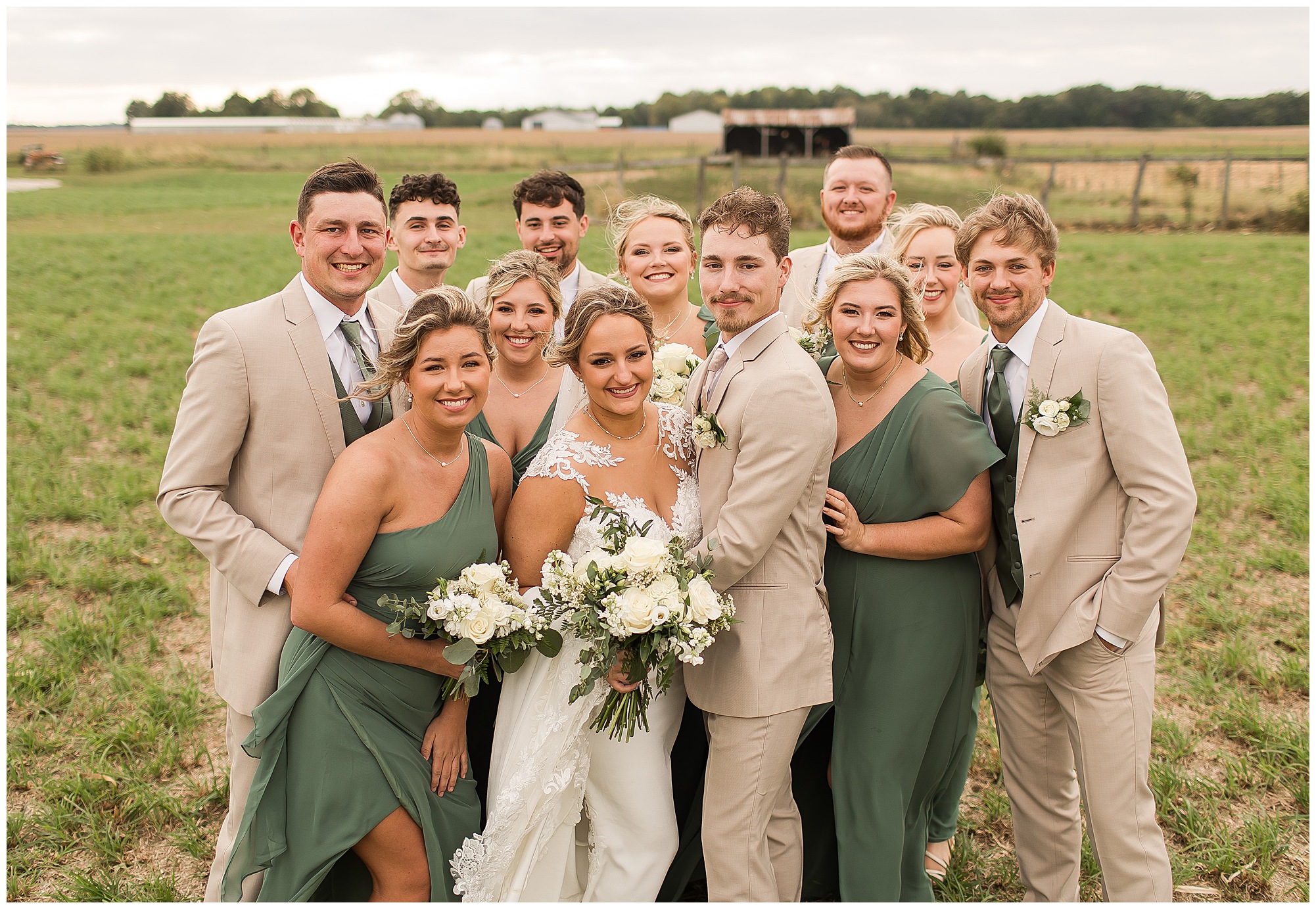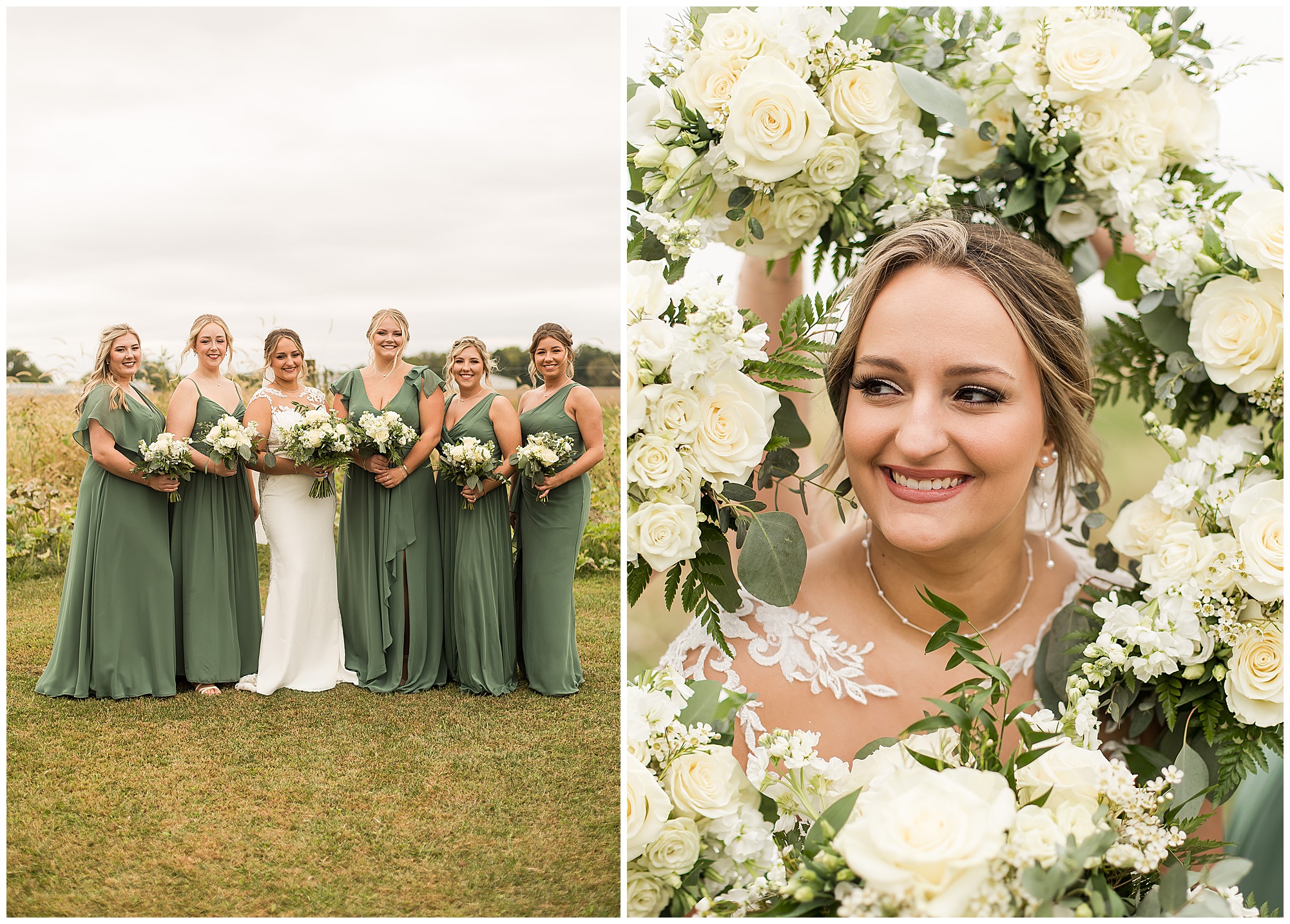 Christy and Lucas had the most lovely September wedding day out at The Homestead in Tallula, Illinois and I’m so grateful I could be a part of capturing it all! Their fall day began early and the bridal suite was busy as Christy and the ladies were finishing up getting ready. Christy was running around wearing a beautiful robe, which I found out her mother, Nikki, had made for her out of her own wedding dress! So special! When it came time for Christy to step into her gown she was absolutely stunning! The high illusion neckline sprinkled lace florals on her shoulders and down her back along with a long row of buttons. And a lace train brought the drama for this bride and her incredible look. Christy topped it off with a pearl embellished veil every little girl dreams about! The bridesmaids all wore various styled dresses in the same shade of sage green. It was such a simple, yet classic look but when you handed the girls their white bouquets everything just popped! Christy and Lucas chose not to see each other before their ceremony so I took Christy and her ladies outside for a few photos separately. We had to compete with a little bit of wind, but these ladies were all champs and looked amazing! Now it was time to get this gorgeous bride tucked away so her groom could have a few photos!