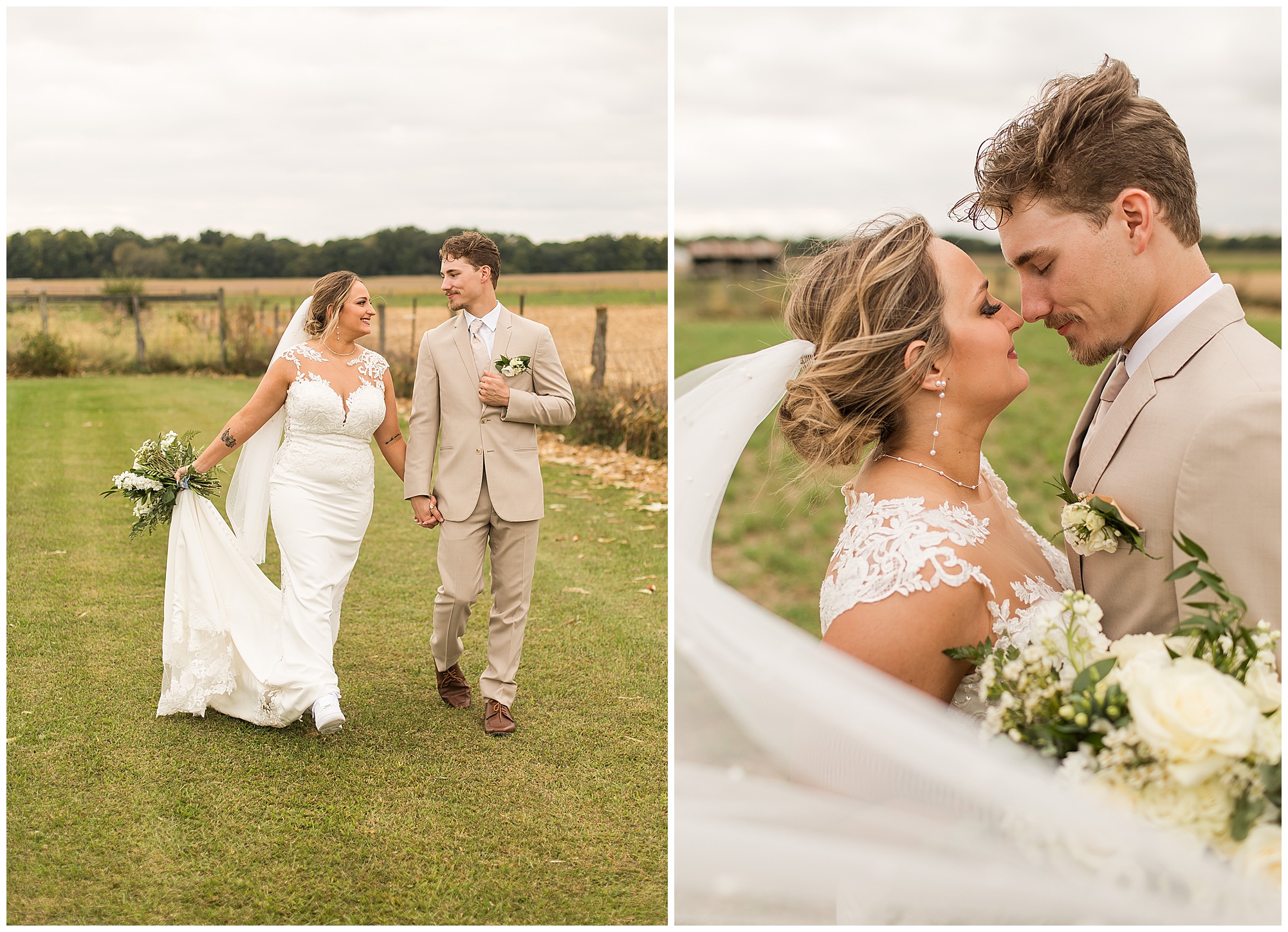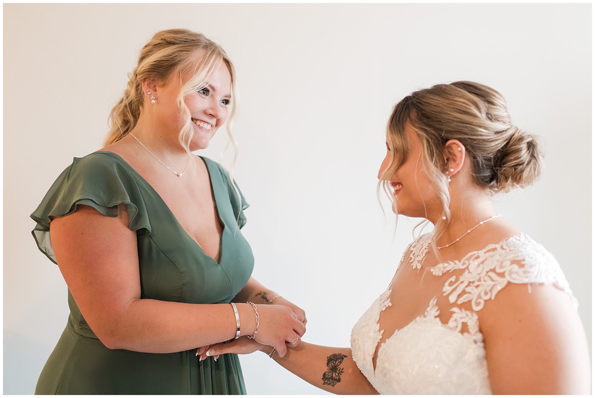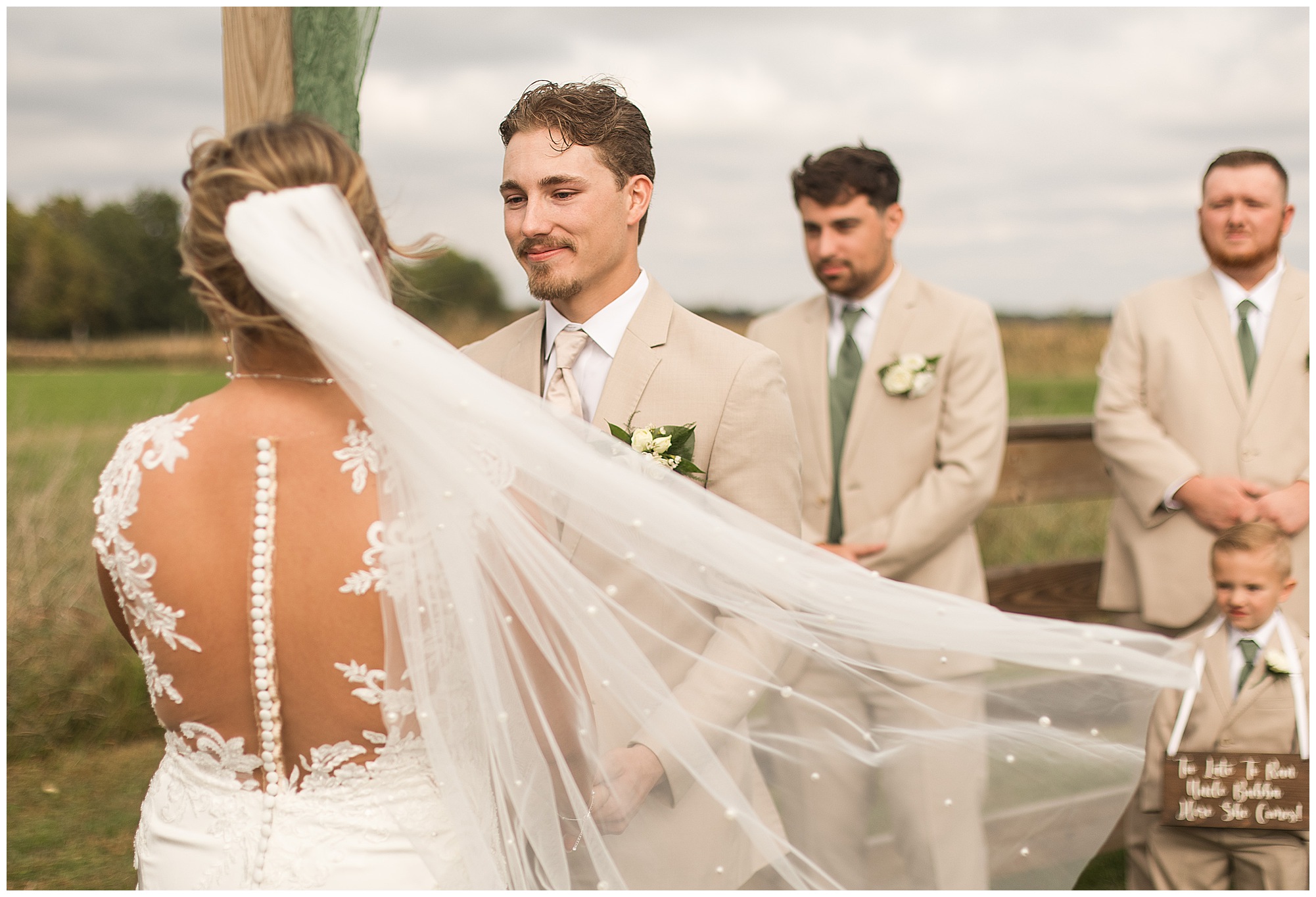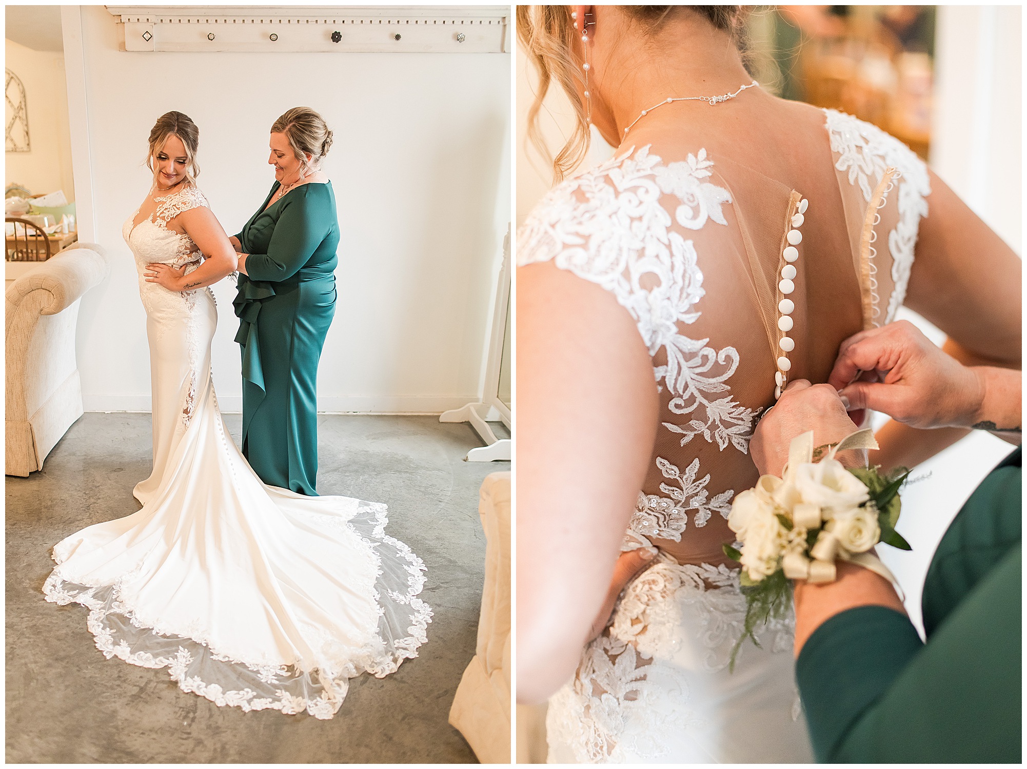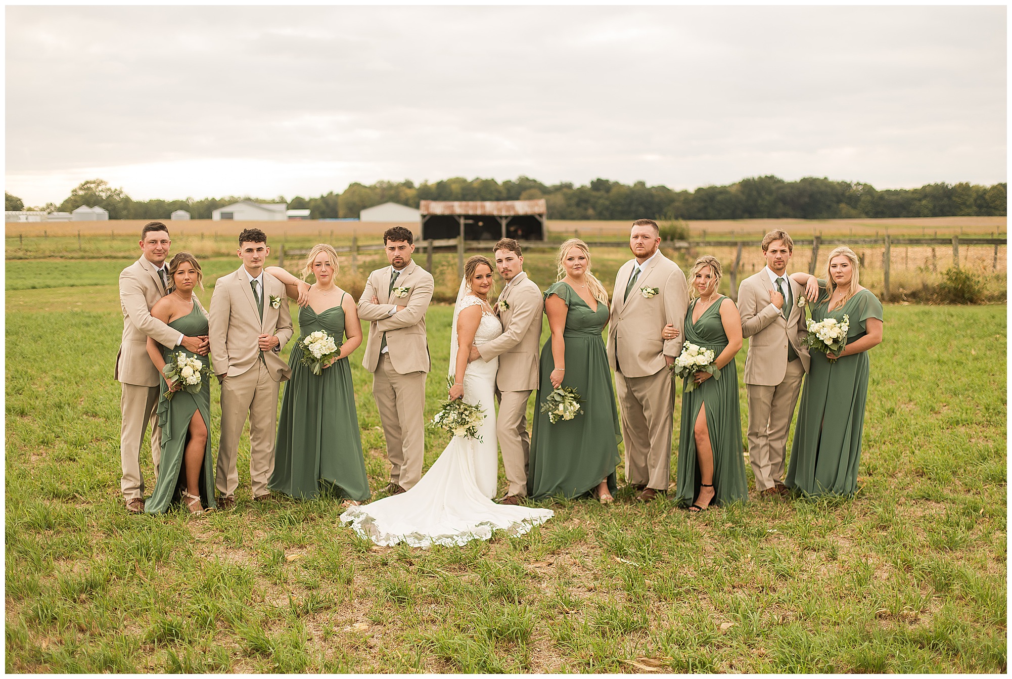Christy and Lucas had the most lovely September wedding day out at The Homestead in Tallula, Illinois and I’m so grateful I could be a part of capturing it all! Their fall day began early and the bridal suite was busy as Christy and the ladies were finishing up getting ready. Christy was running around wearing a beautiful robe, which I found out her mother, Nikki, had made for her out of her own wedding dress! So special! When it came time for Christy to step into her gown she was absolutely stunning! The high illusion neckline sprinkled lace florals on her shoulders and down her back along with a long row of buttons. And a lace train brought the drama for this bride and her incredible look. Christy topped it off with a pearl embellished veil every little girl dreams about! The bridesmaids all wore various styled dresses in the same shade of sage green. It was such a simple, yet classic look but when you handed the girls their white bouquets everything just popped! Christy and Lucas chose not to see each other before their ceremony so I took Christy and her ladies outside for a few photos separately. We had to compete with a little bit of wind, but these ladies were all champs and looked amazing! Now it was time to get this gorgeous bride tucked away so her groom could have a few photos!