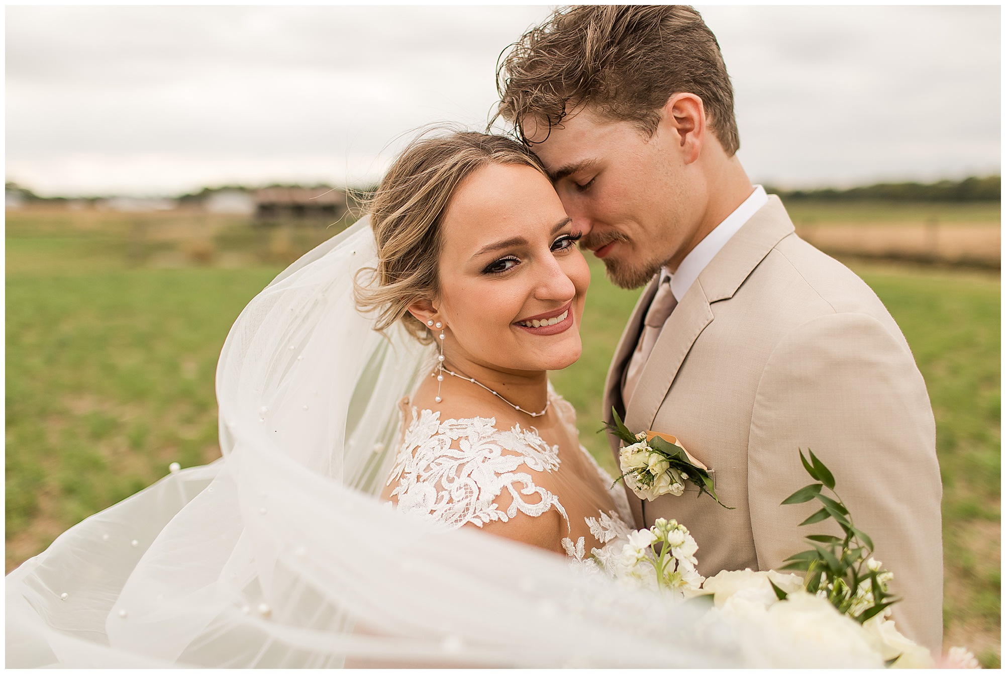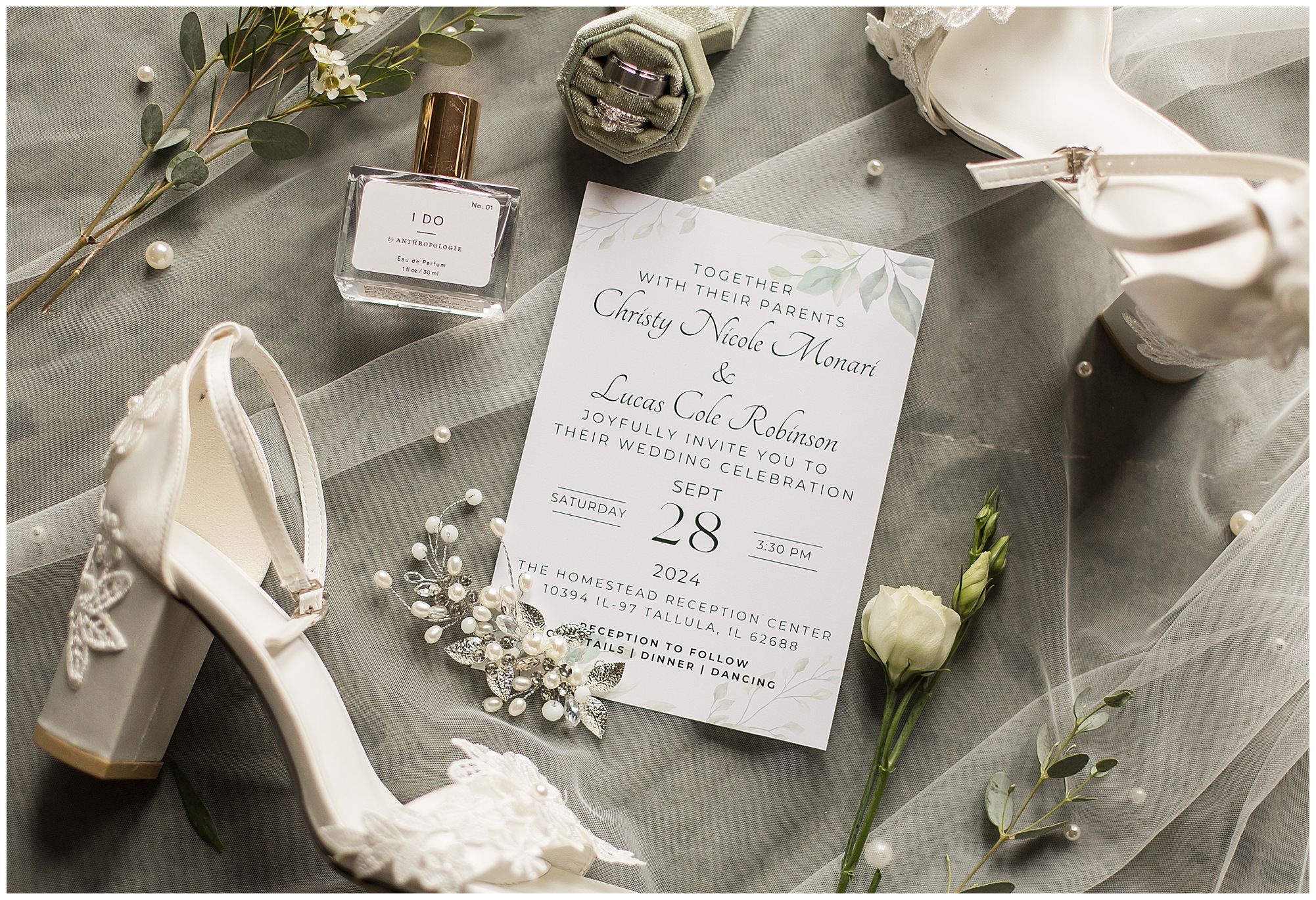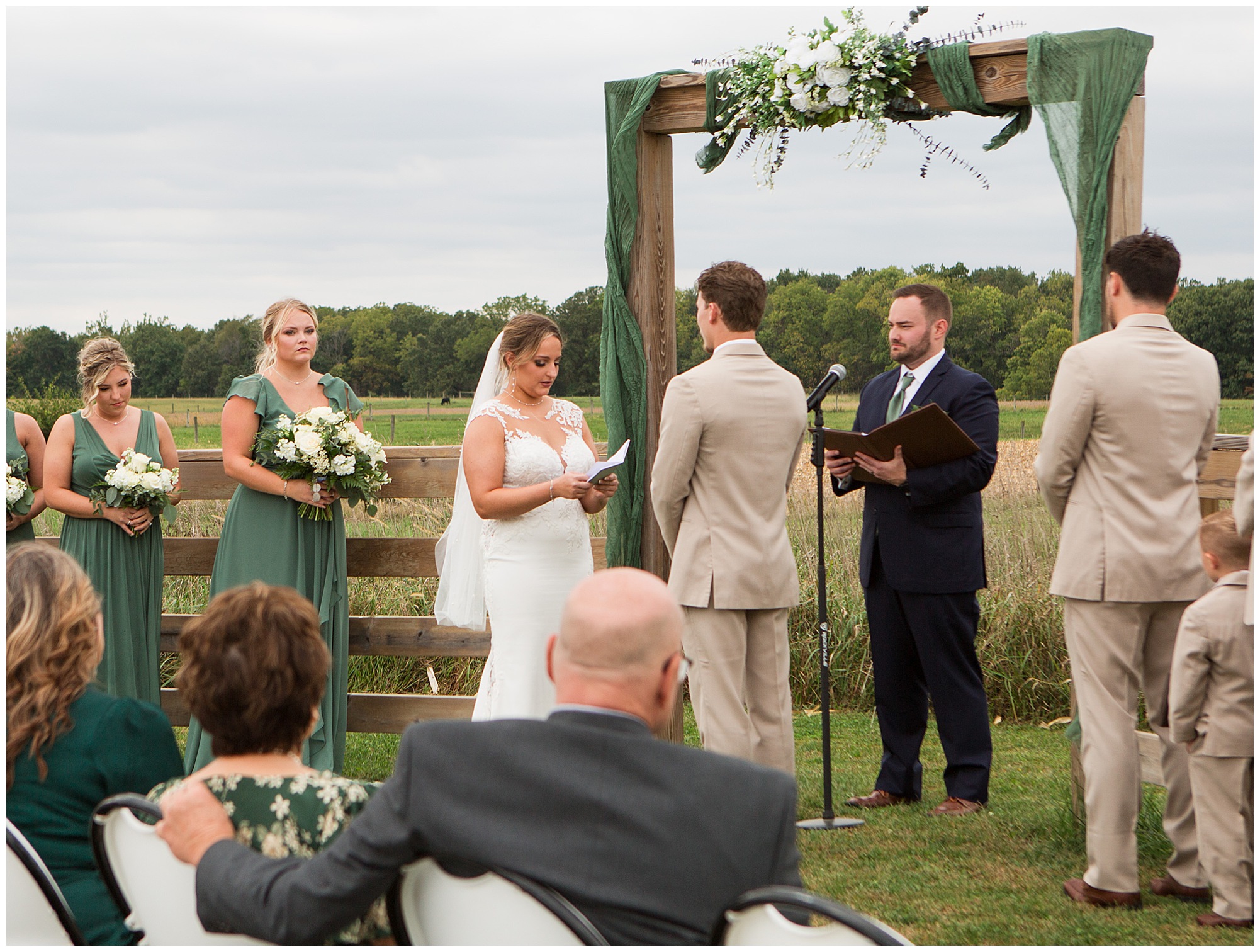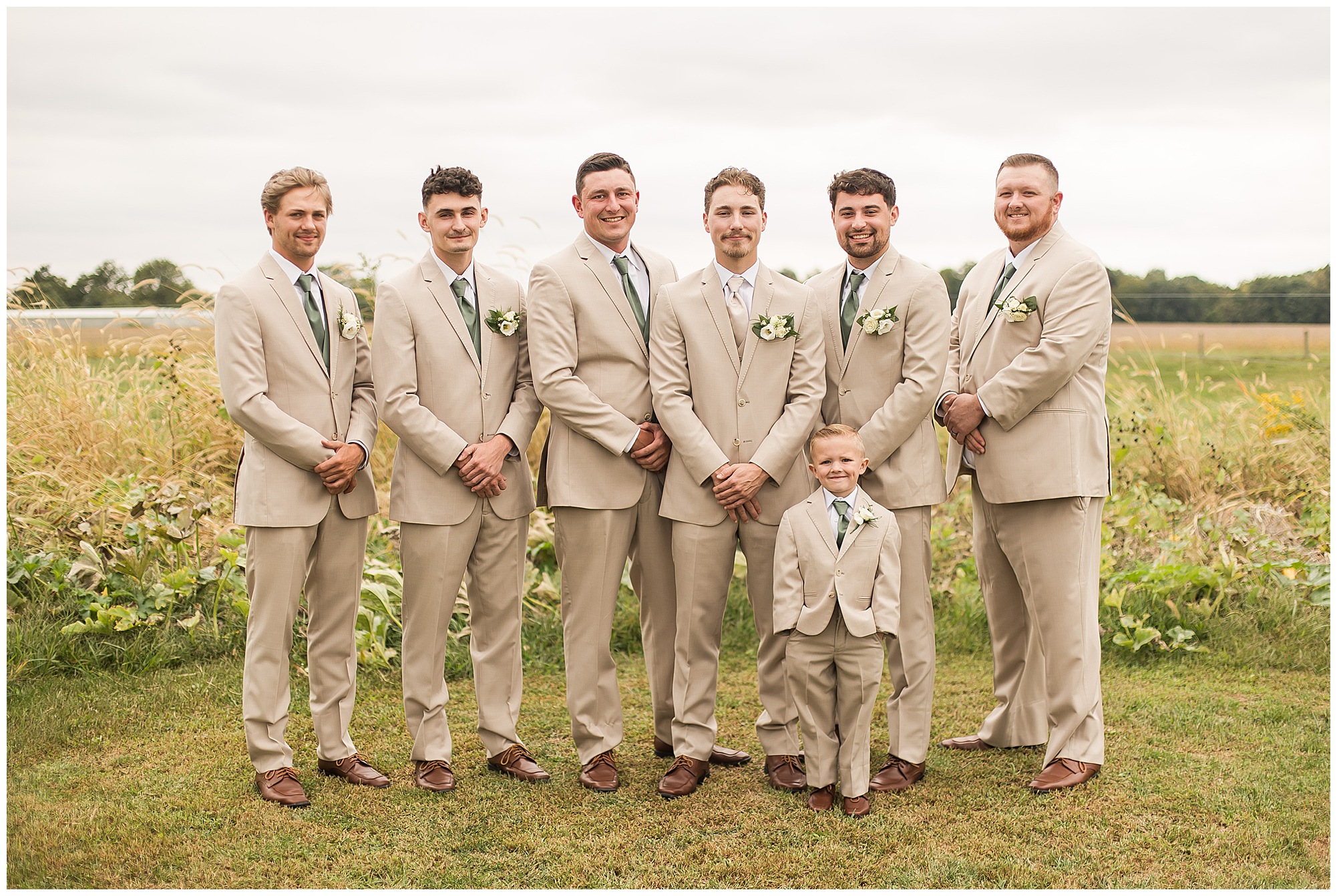 Christy and Lucas had the most lovely September wedding day out at The Homestead in Tallula, Illinois and I’m so grateful I could be a part of capturing it all! Their fall day began early and the bridal suite was busy as Christy and the ladies were finishing up getting ready. Christy was running around wearing a beautiful robe, which I found out her mother, Nikki, had made for her out of her own wedding dress! So special! When it came time for Christy to step into her gown she was absolutely stunning! The high illusion neckline sprinkled lace florals on her shoulders and down her back along with a long row of buttons. And a lace train brought the drama for this bride and her incredible look. Christy topped it off with a pearl embellished veil every little girl dreams about! The bridesmaids all wore various styled dresses in the same shade of sage green. It was such a simple, yet classic look but when you handed the girls their white bouquets everything just popped! Christy and Lucas chose not to see each other before their ceremony so I took Christy and her ladies outside for a few photos separately. We had to compete with a little bit of wind, but these ladies were all champs and looked amazing! Now it was time to get this gorgeous bride tucked away so her groom could have a few photos!