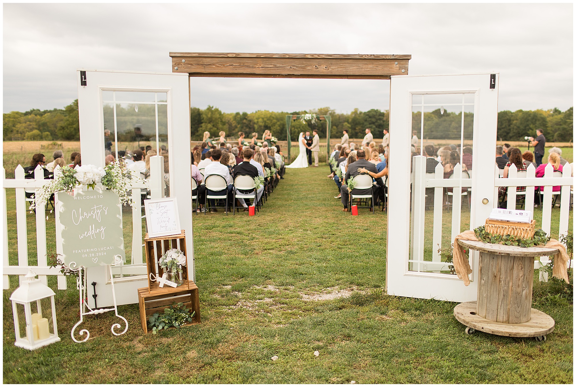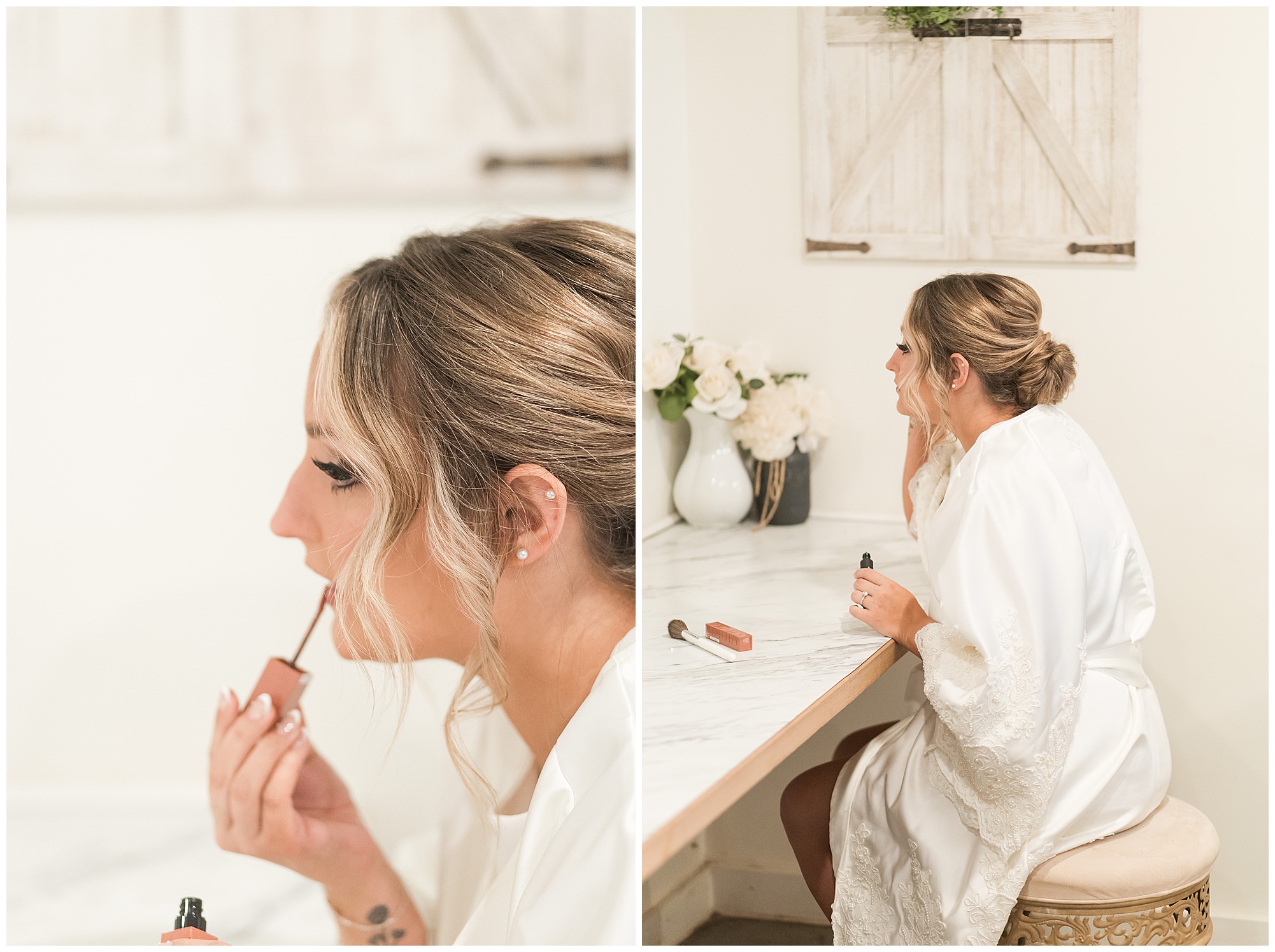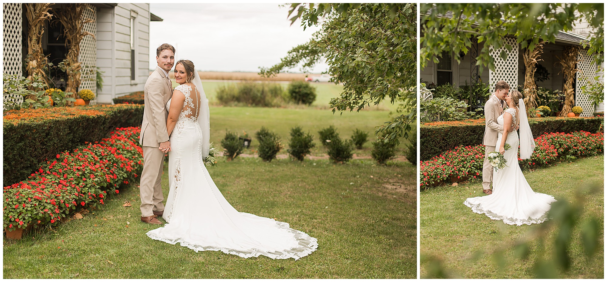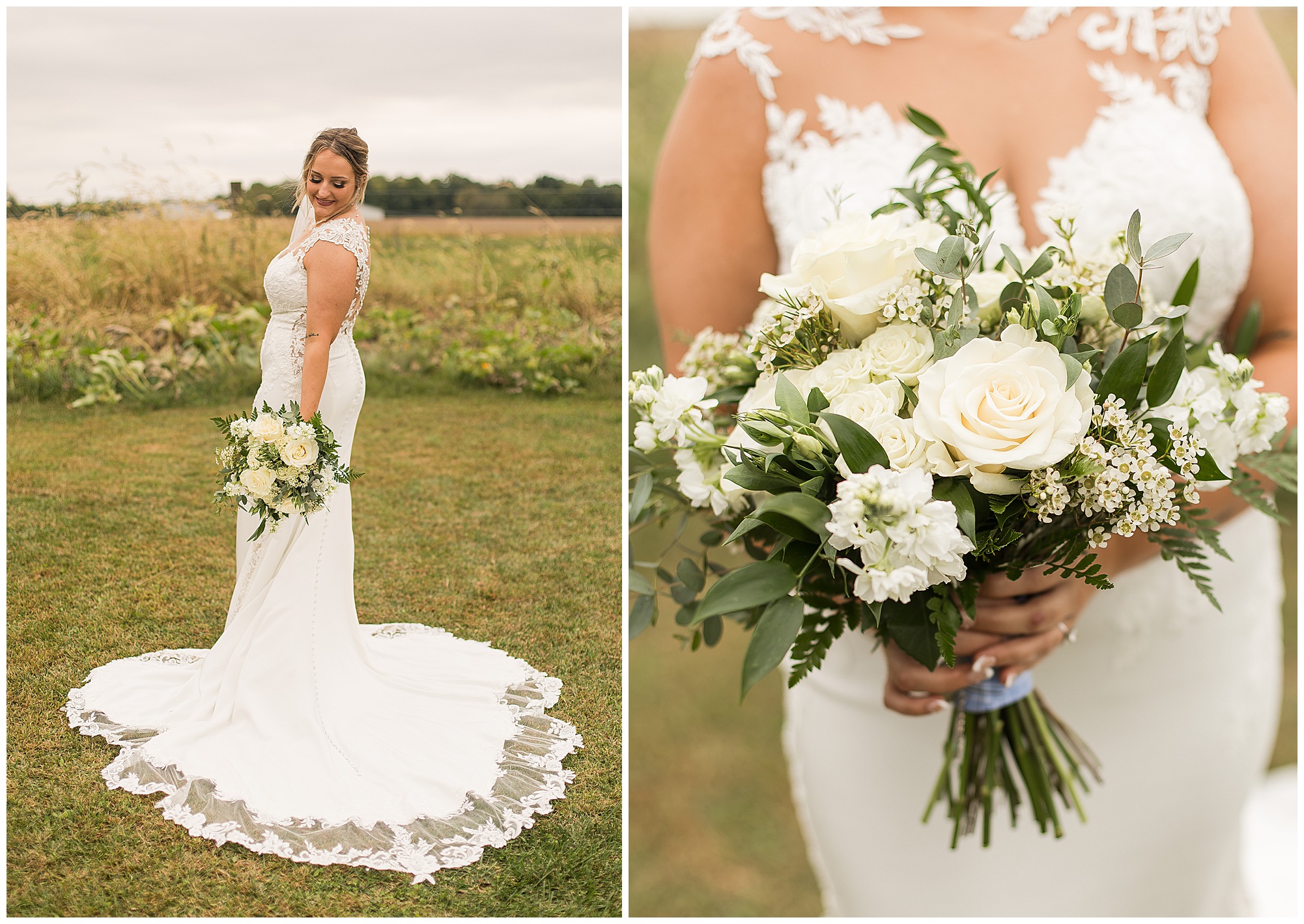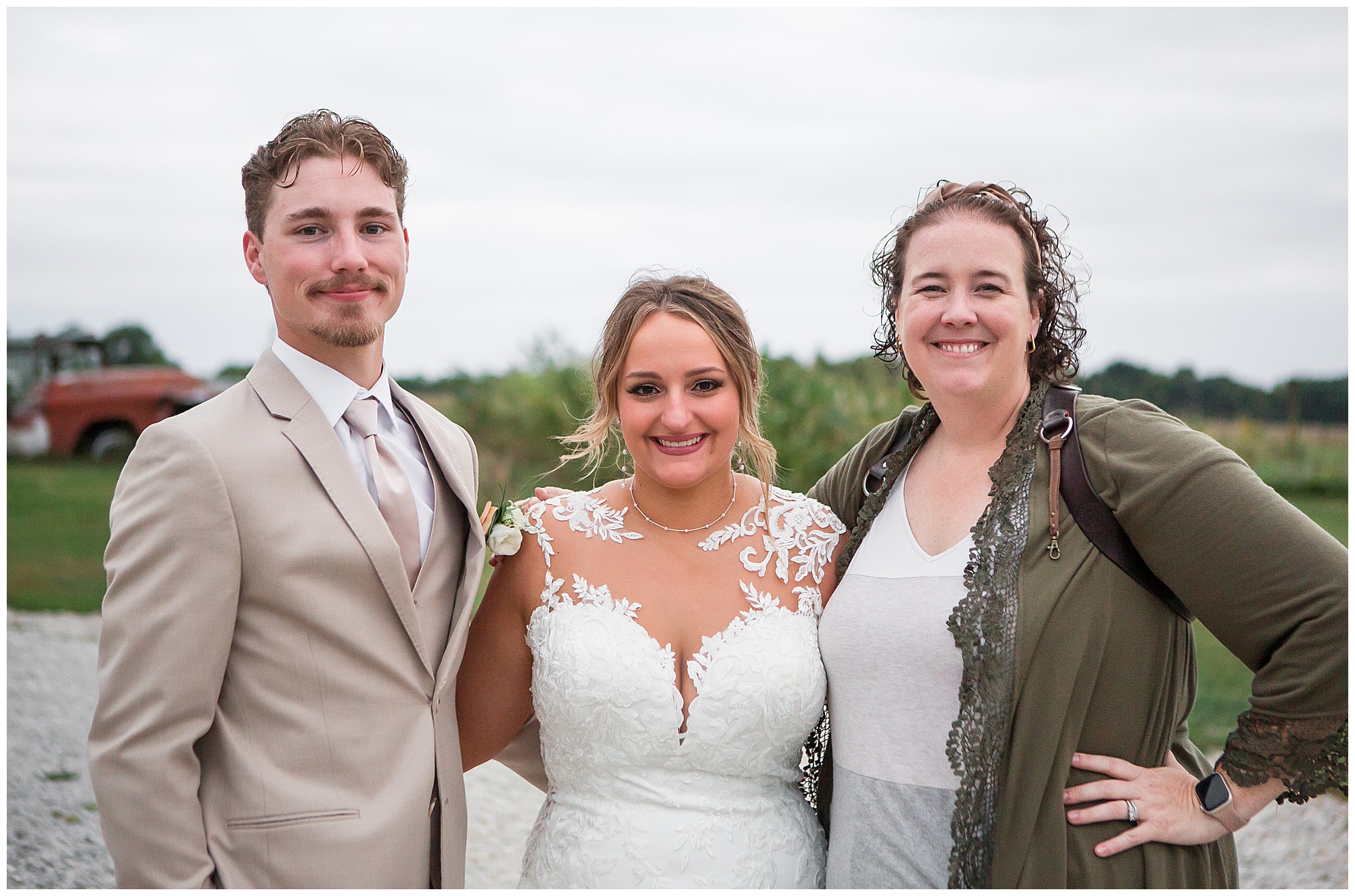 Christy and Lucas had the most lovely September wedding day out at The Homestead in Tallula, Illinois and I’m so grateful I could be a part of capturing it all! Their fall day began early and the bridal suite was busy as Christy and the ladies were finishing up getting ready. Christy was running around wearing a beautiful robe, which I found out her mother, Nikki, had made for her out of her own wedding dress! So special! When it came time for Christy to step into her gown she was absolutely stunning! The high illusion neckline sprinkled lace florals on her shoulders and down her back along with a long row of buttons. And a lace train brought the drama for this bride and her incredible look. Christy topped it off with a pearl embellished veil every little girl dreams about! The bridesmaids all wore various styled dresses in the same shade of sage green. It was such a simple, yet classic look but when you handed the girls their white bouquets everything just popped! Christy and Lucas chose not to see each other before their ceremony so I took Christy and her ladies outside for a few photos separately. We had to compete with a little bit of wind, but these ladies were all champs and looked amazing! Now it was time to get this gorgeous bride tucked away so her groom could have a few photos!