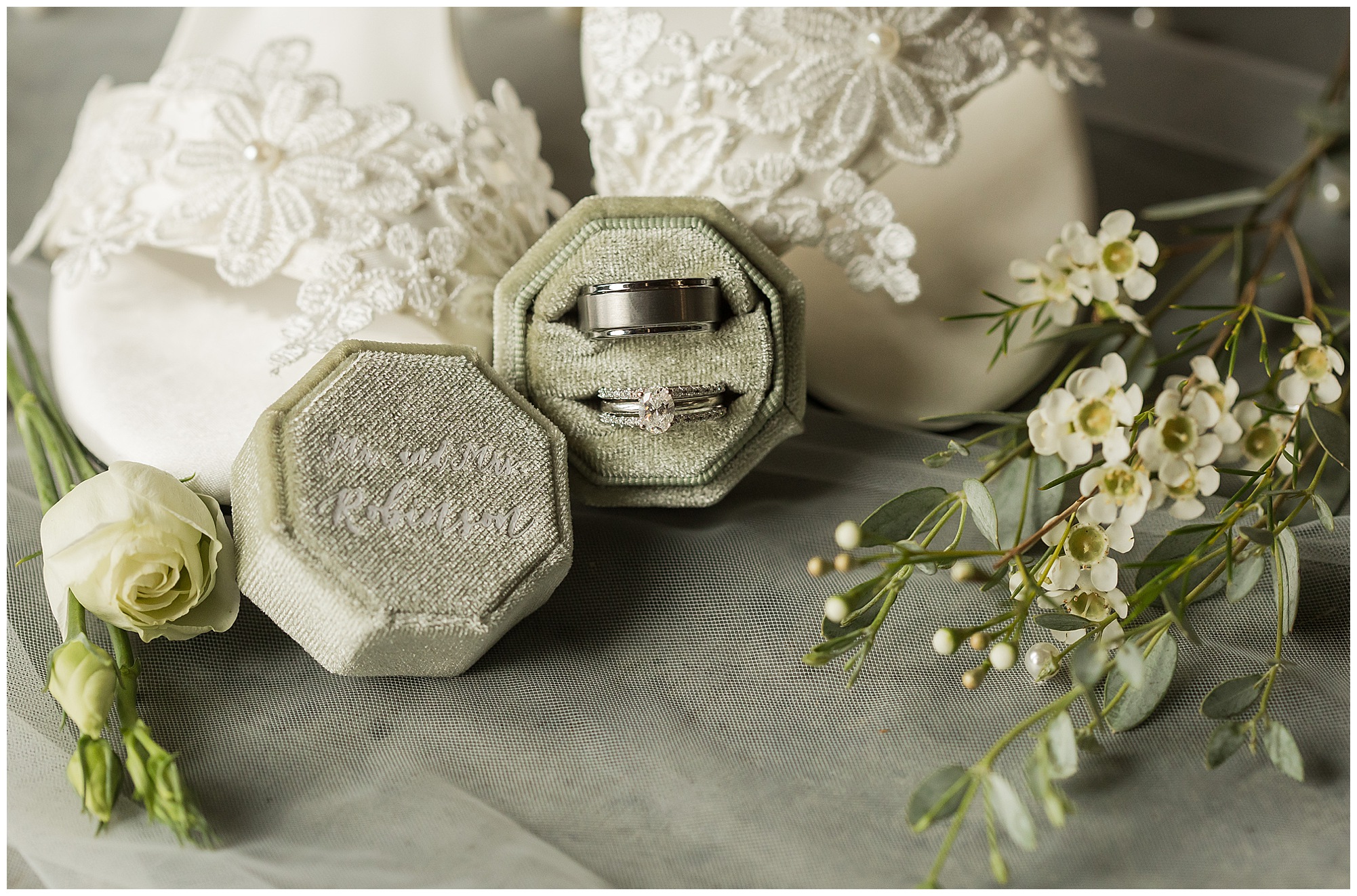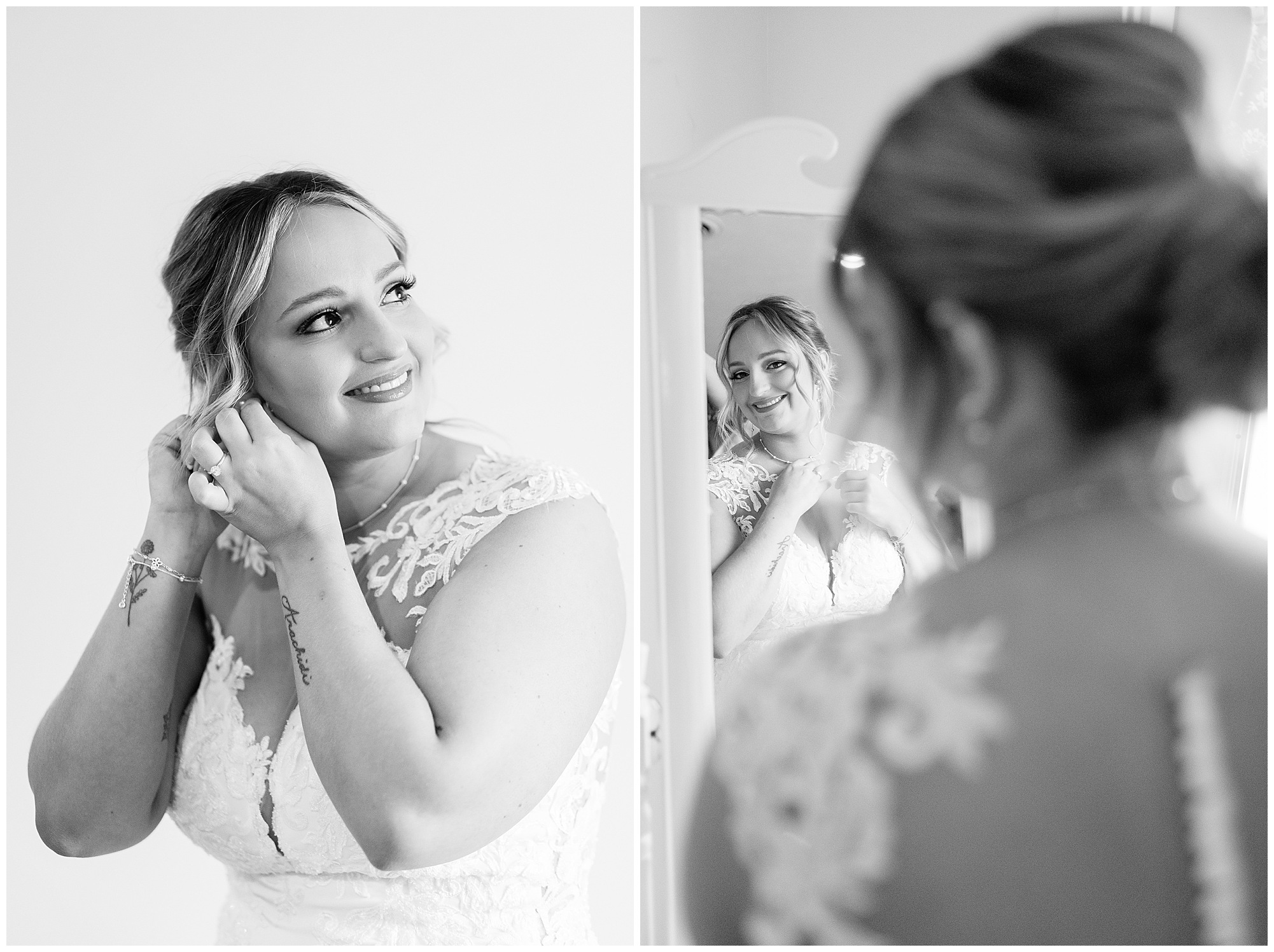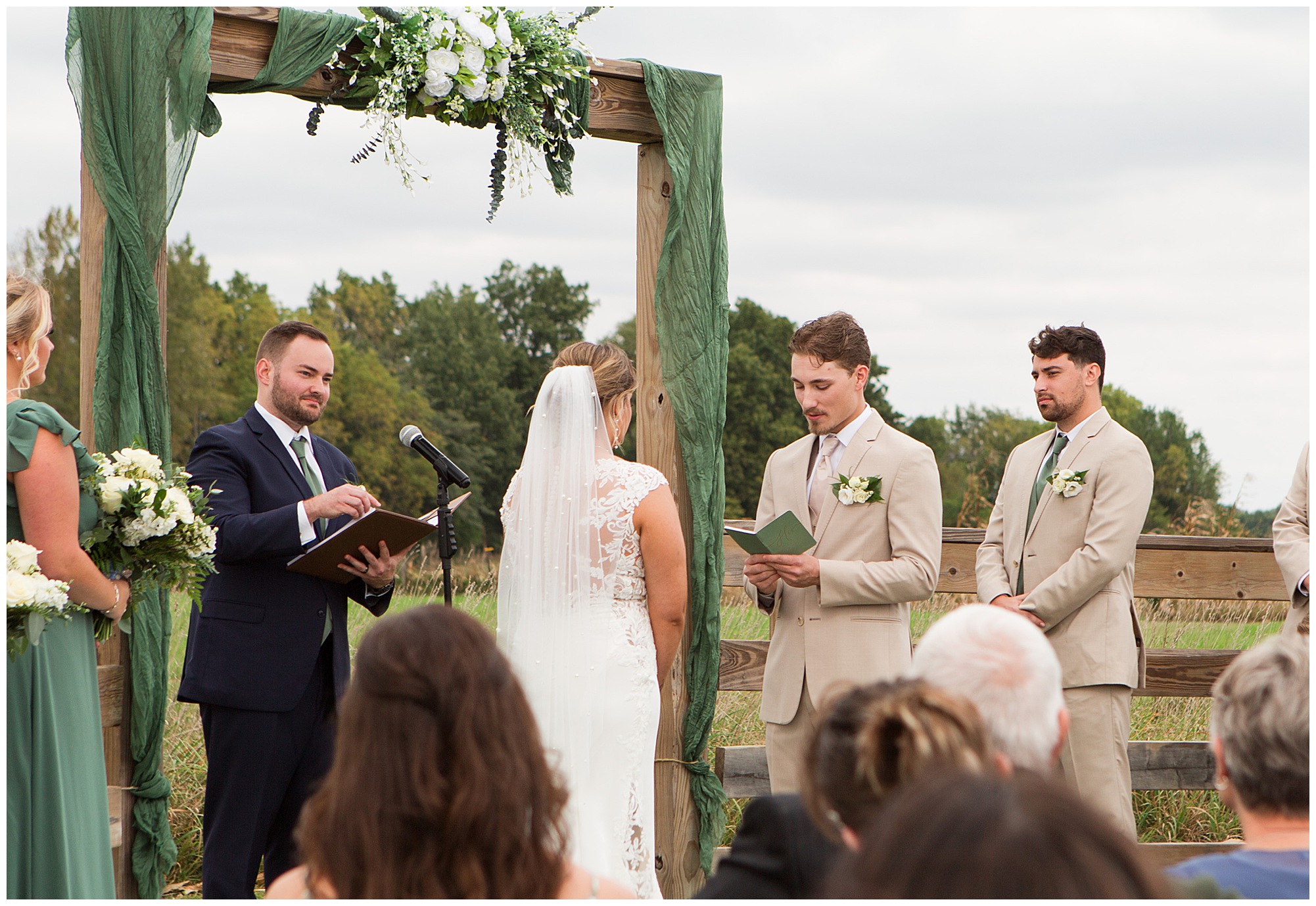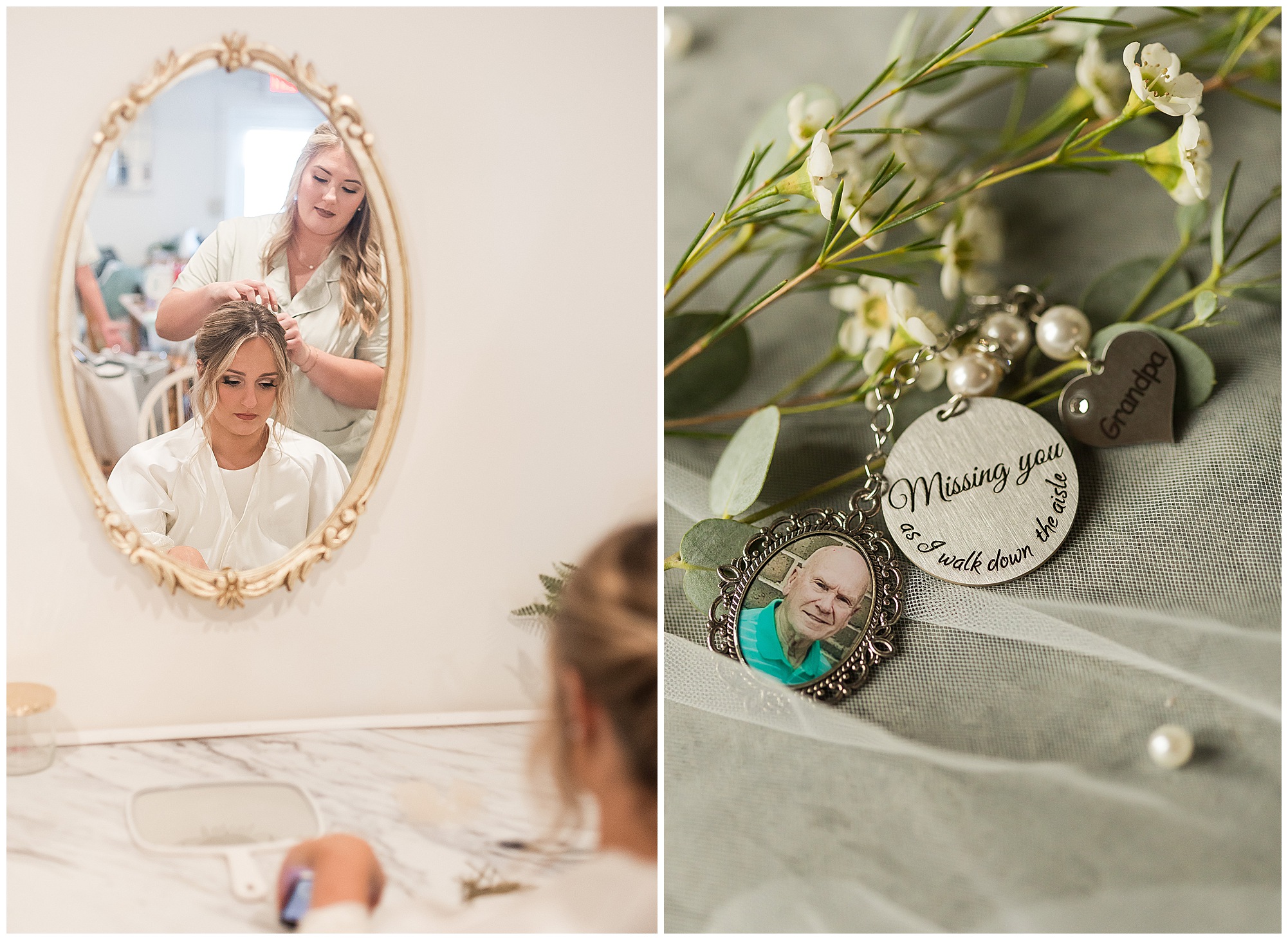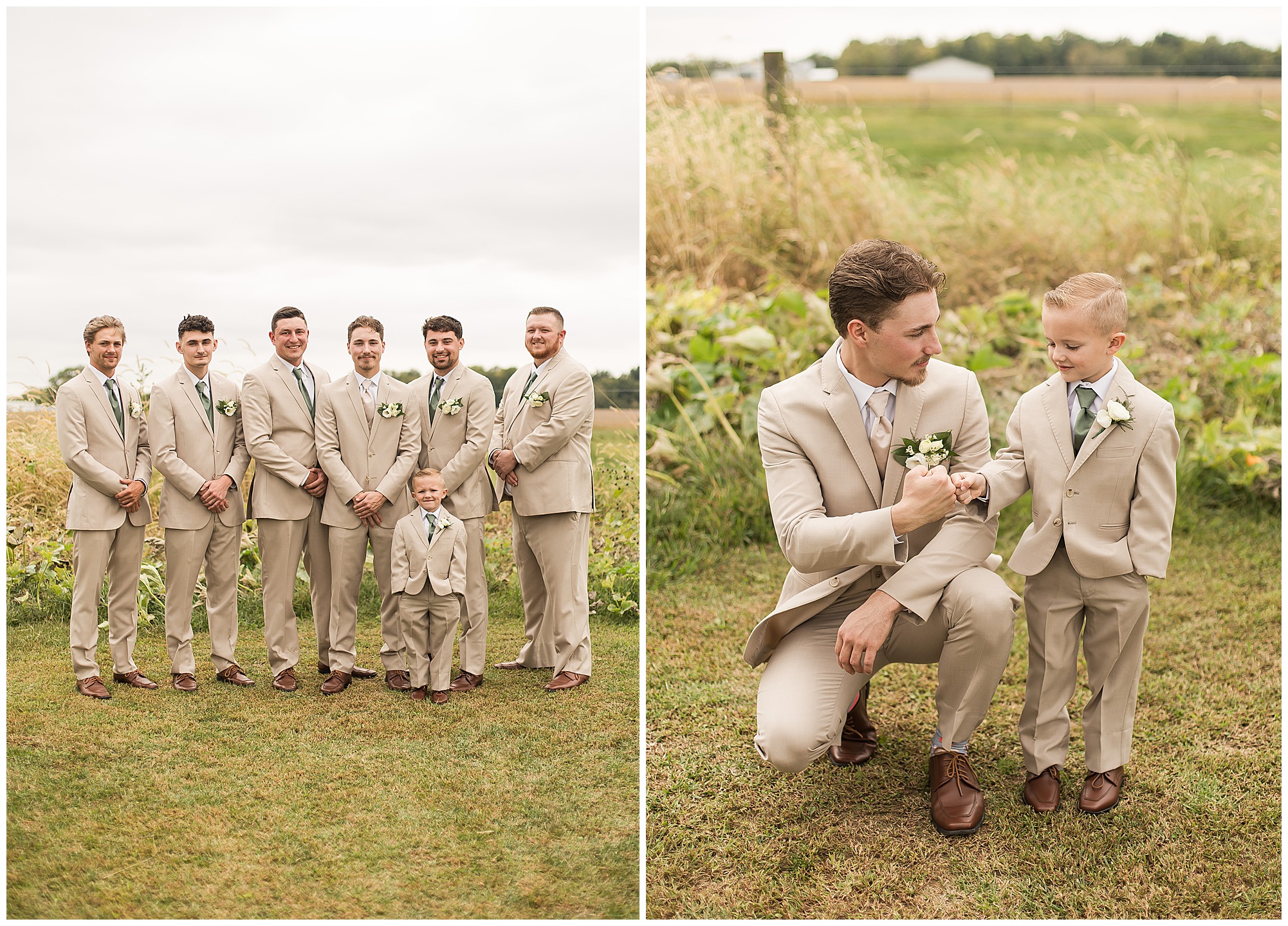 Christy and Lucas had the most lovely September wedding day out at The Homestead in Tallula, Illinois and I’m so grateful I could be a part of capturing it all! Their fall day began early and the bridal suite was busy as Christy and the ladies were finishing up getting ready. Christy was running around wearing a beautiful robe, which I found out her mother, Nikki, had made for her out of her own wedding dress! So special! When it came time for Christy to step into her gown she was absolutely stunning! The high illusion neckline sprinkled lace florals on her shoulders and down her back along with a long row of buttons. And a lace train brought the drama for this bride and her incredible look. Christy topped it off with a pearl embellished veil every little girl dreams about! The bridesmaids all wore various styled dresses in the same shade of sage green. It was such a simple, yet classic look but when you handed the girls their white bouquets everything just popped! Christy and Lucas chose not to see each other before their ceremony so I took Christy and her ladies outside for a few photos separately. We had to compete with a little bit of wind, but these ladies were all champs and looked amazing! Now it was time to get this gorgeous bride tucked away so her groom could have a few photos!