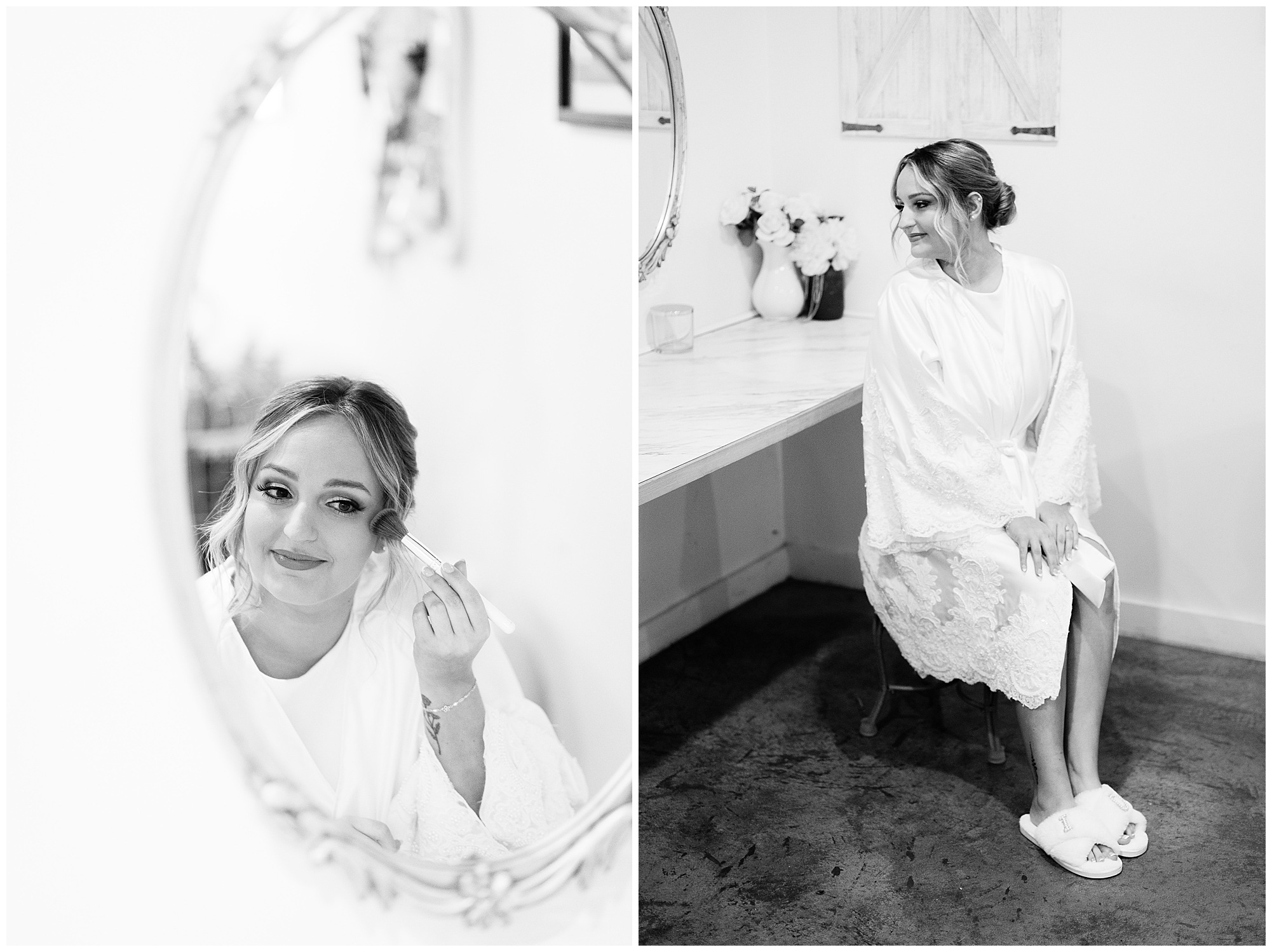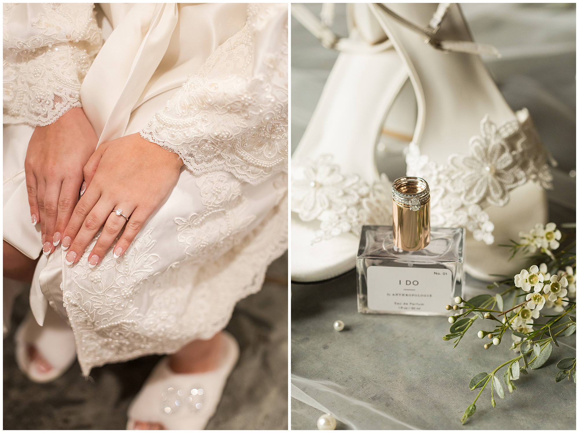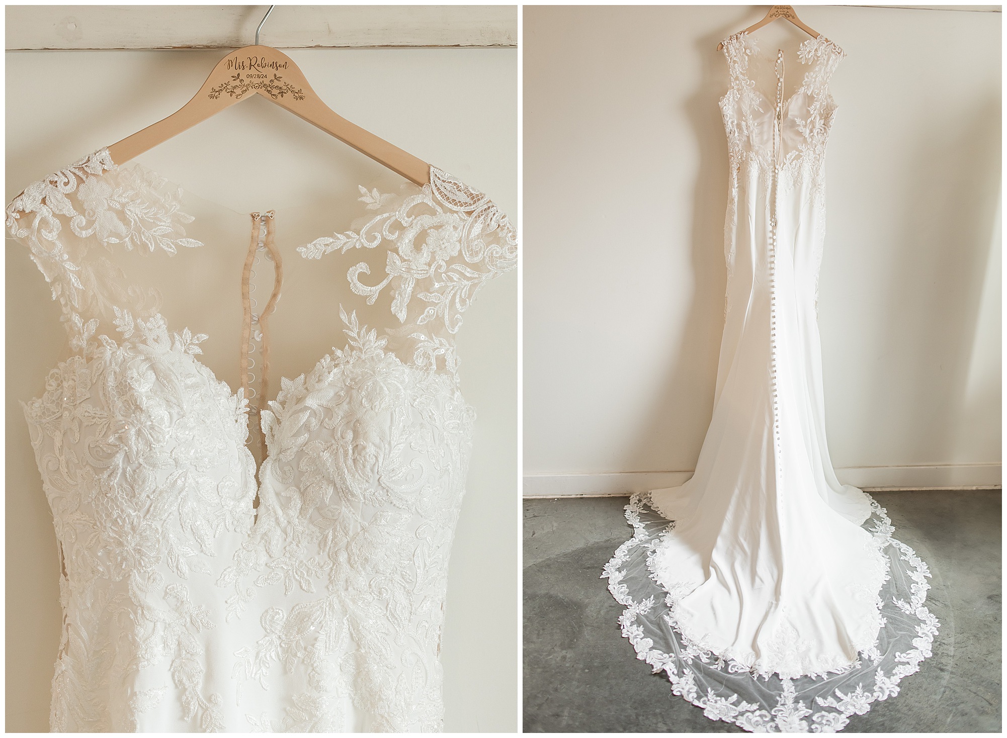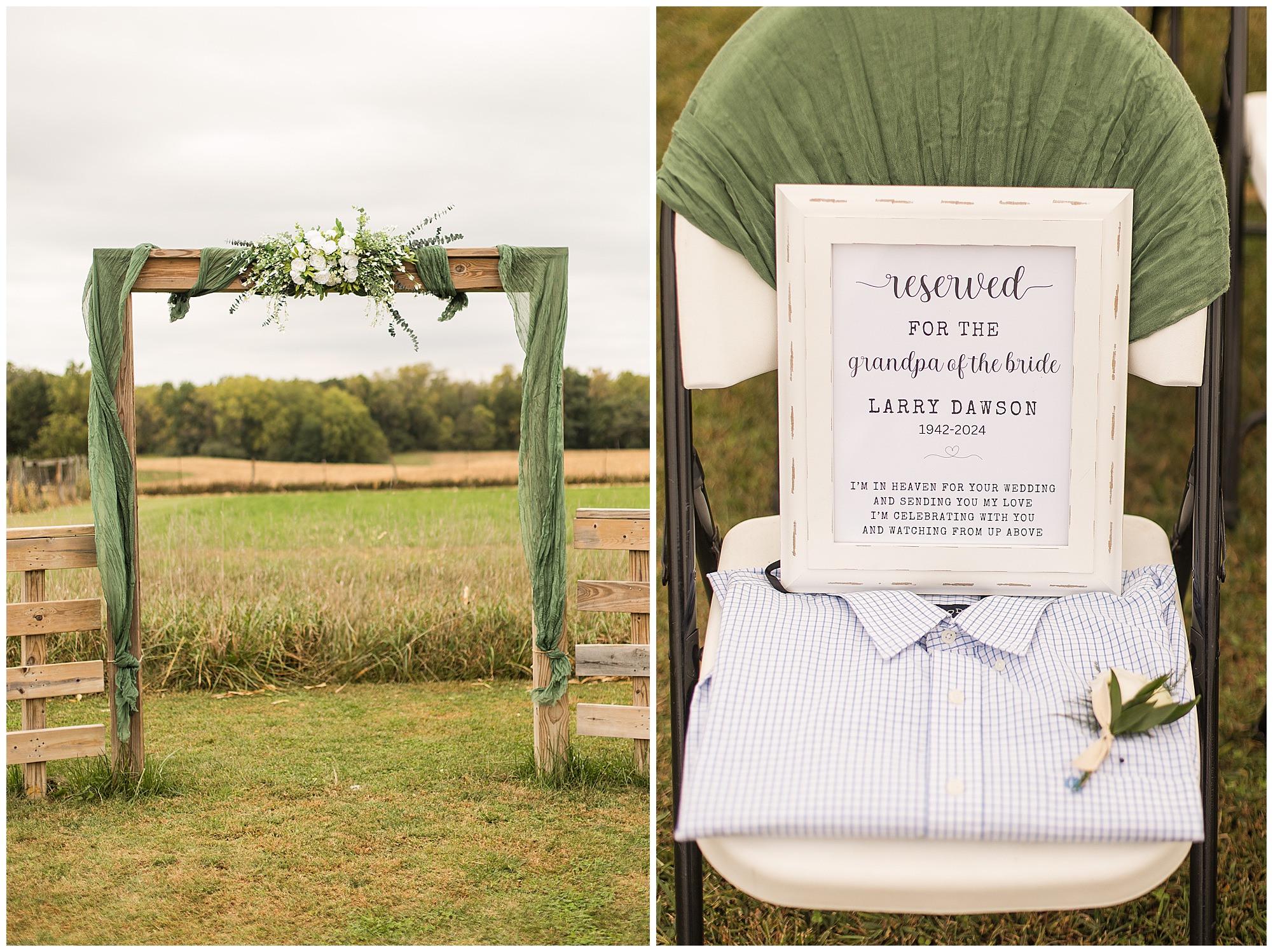 Christy and Lucas had the most lovely September wedding day out at The Homestead in Tallula, Illinois and I’m so grateful I could be a part of capturing it all! Their fall day began early and the bridal suite was busy as Christy and the ladies were finishing up getting ready. Christy was running around wearing a beautiful robe, which I found out her mother, Nikki, had made for her out of her own wedding dress! So special! When it came time for Christy to step into her gown she was absolutely stunning! The high illusion neckline sprinkled lace florals on her shoulders and down her back along with a long row of buttons. And a lace train brought the drama for this bride and her incredible look. Christy topped it off with a pearl embellished veil every little girl dreams about! The bridesmaids all wore various styled dresses in the same shade of sage green. It was such a simple, yet classic look but when you handed the girls their white bouquets everything just popped! Christy and Lucas chose not to see each other before their ceremony so I took Christy and her ladies outside for a few photos separately. We had to compete with a little bit of wind, but these ladies were all champs and looked amazing! Now it was time to get this gorgeous bride tucked away so her groom could have a few photos!