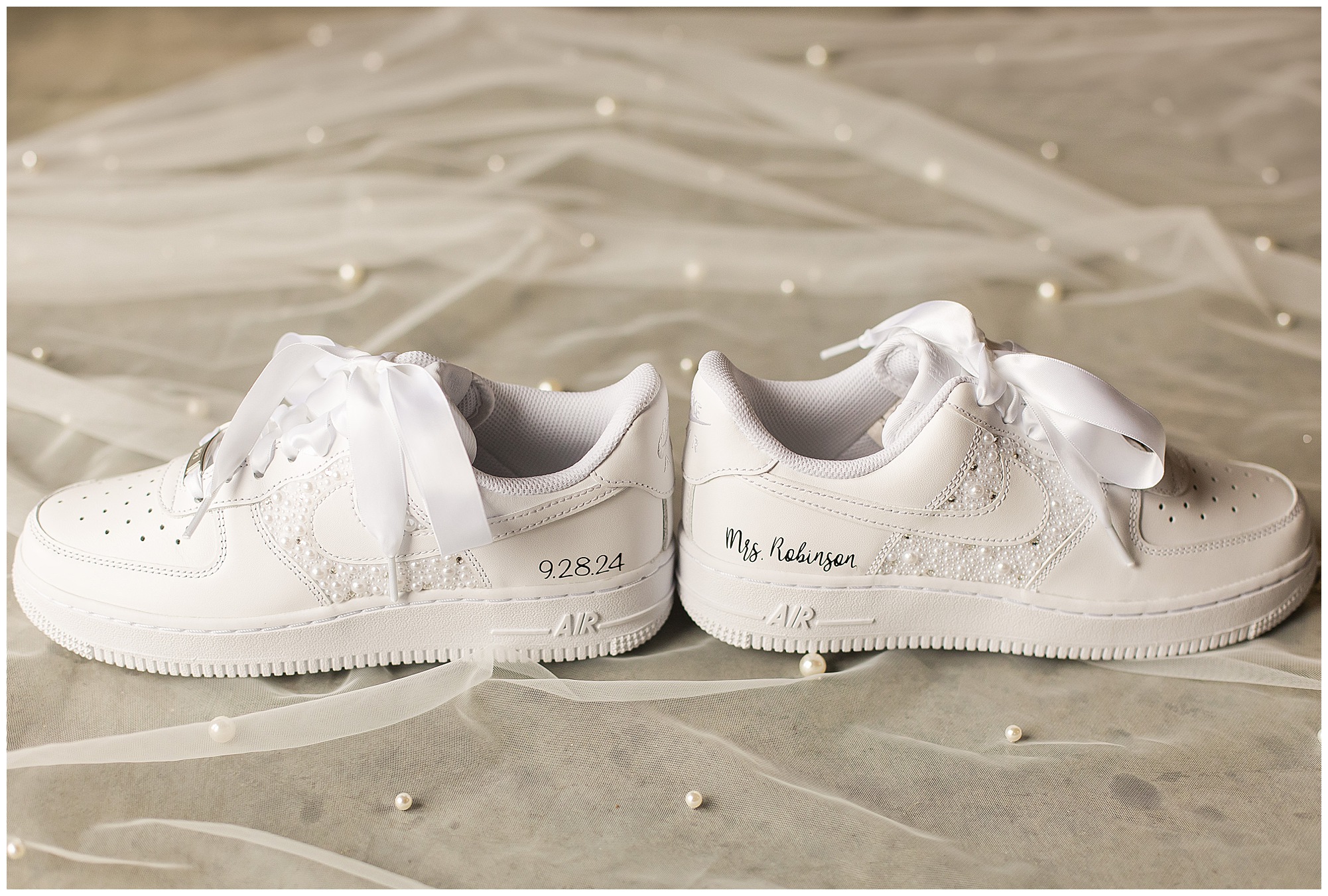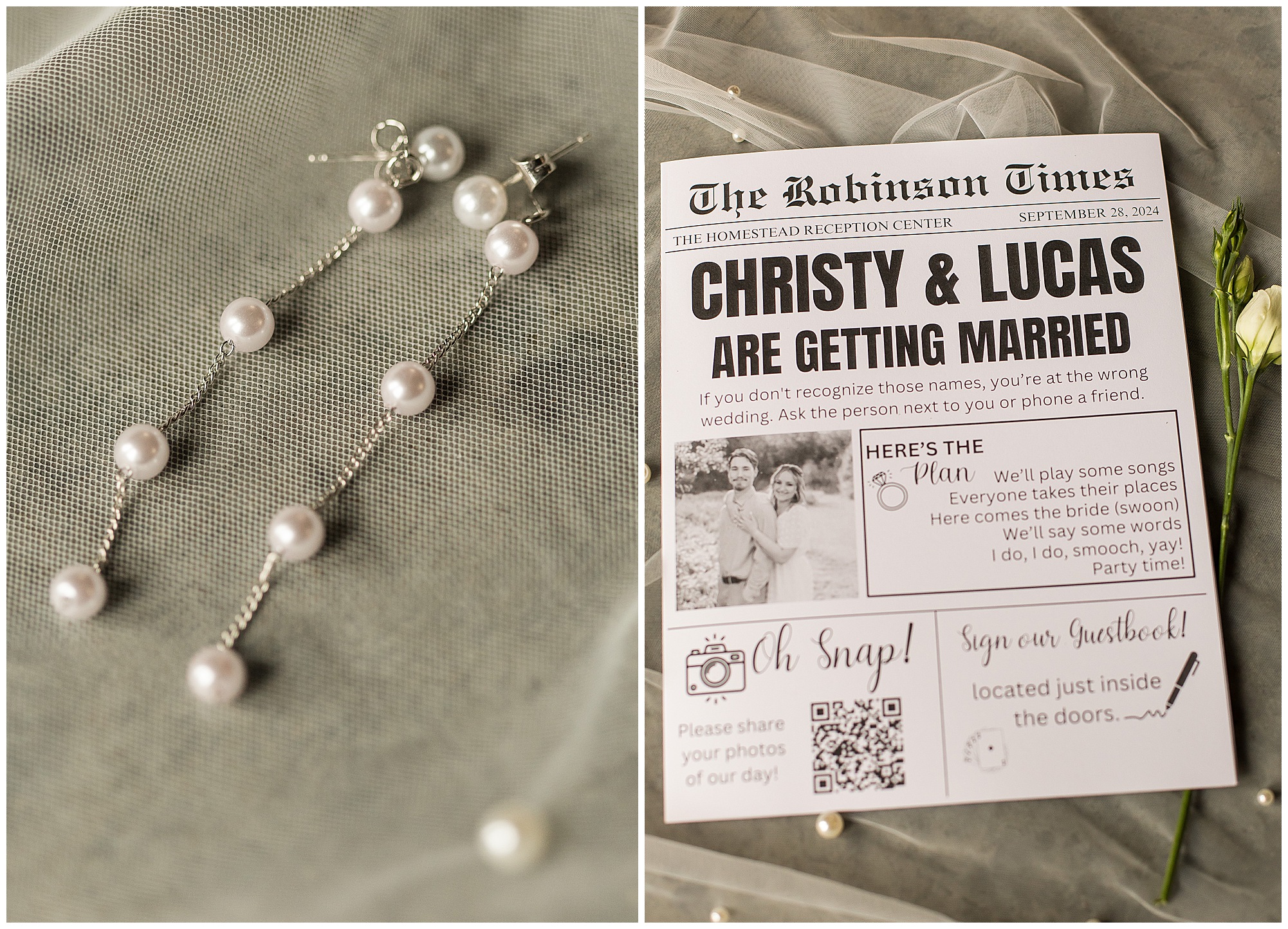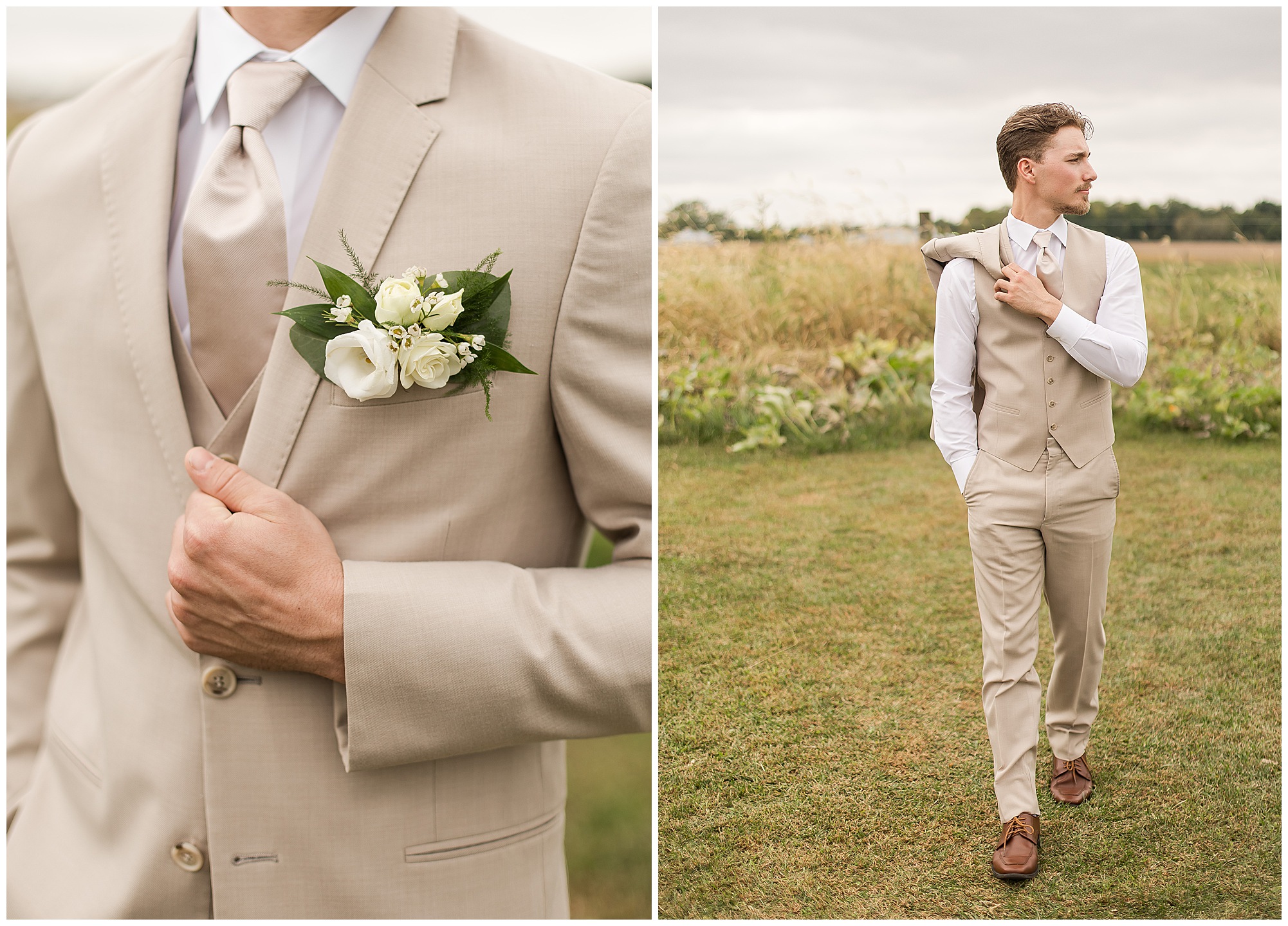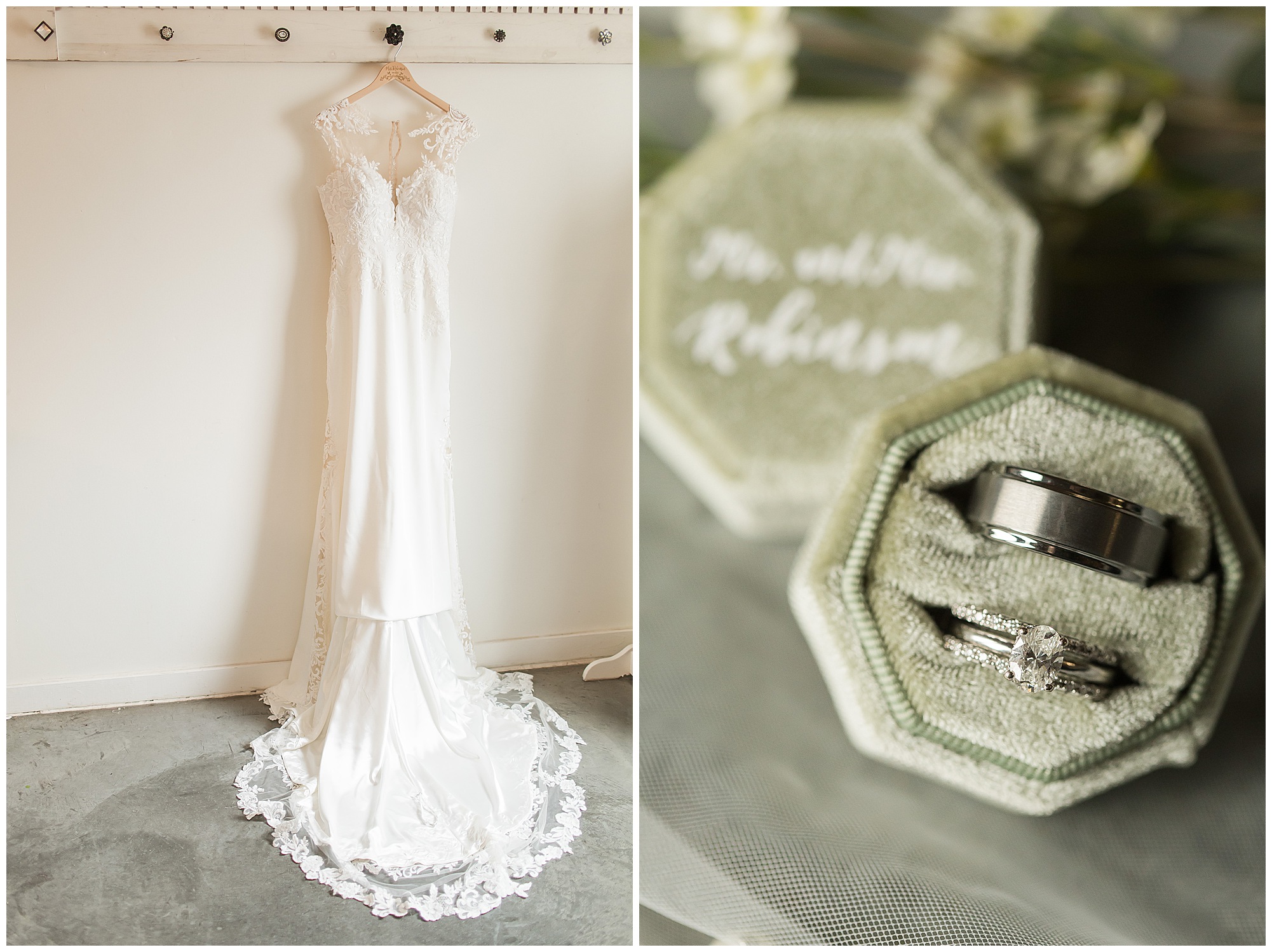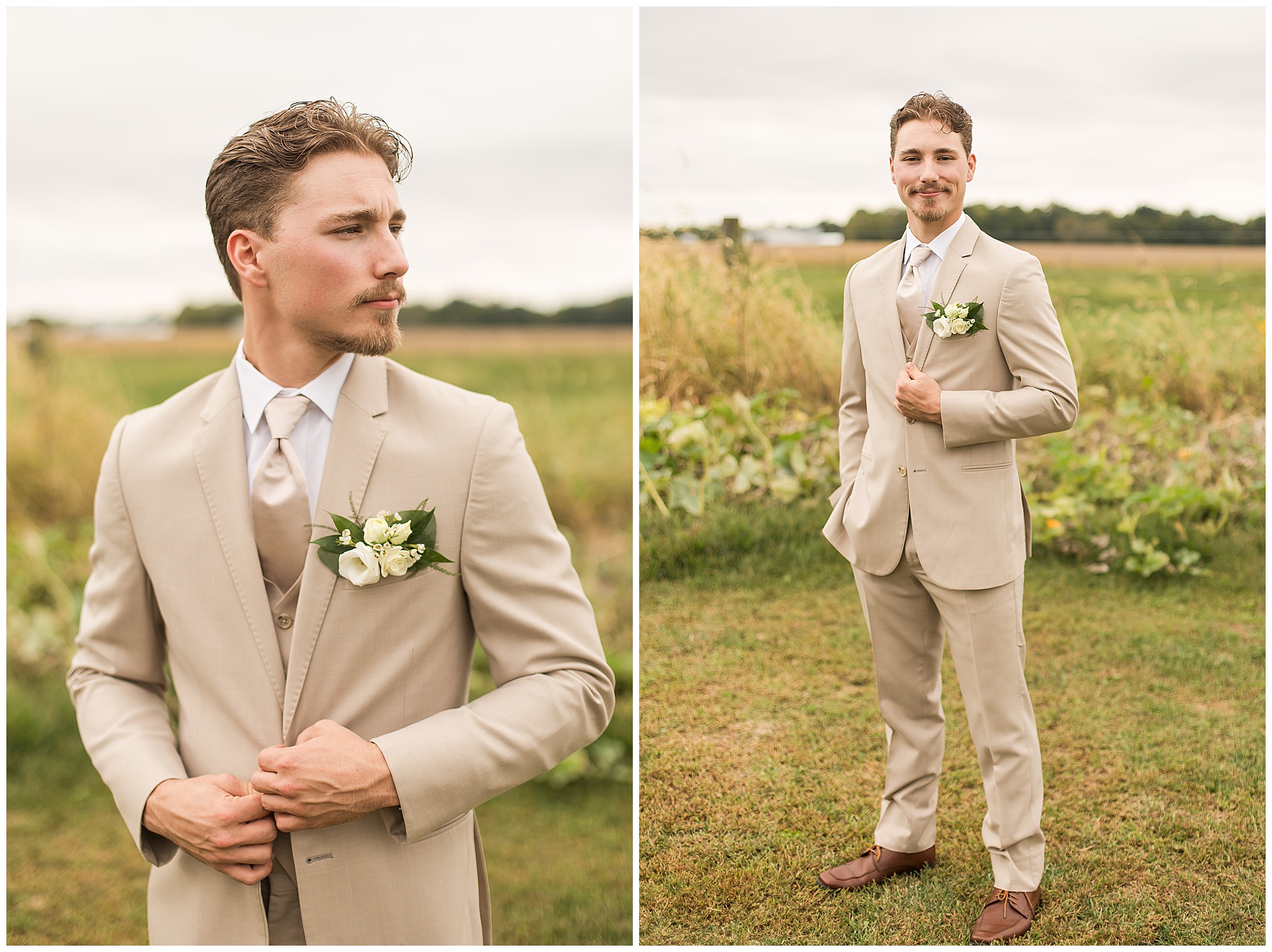 Christy and Lucas had the most lovely September wedding day out at The Homestead in Tallula, Illinois and I’m so grateful I could be a part of capturing it all! Their fall day began early and the bridal suite was busy as Christy and the ladies were finishing up getting ready. Christy was running around wearing a beautiful robe, which I found out her mother, Nikki, had made for her out of her own wedding dress! So special! When it came time for Christy to step into her gown she was absolutely stunning! The high illusion neckline sprinkled lace florals on her shoulders and down her back along with a long row of buttons. And a lace train brought the drama for this bride and her incredible look. Christy topped it off with a pearl embellished veil every little girl dreams about! The bridesmaids all wore various styled dresses in the same shade of sage green. It was such a simple, yet classic look but when you handed the girls their white bouquets everything just popped! Christy and Lucas chose not to see each other before their ceremony so I took Christy and her ladies outside for a few photos separately. We had to compete with a little bit of wind, but these ladies were all champs and looked amazing! Now it was time to get this gorgeous bride tucked away so her groom could have a few photos!