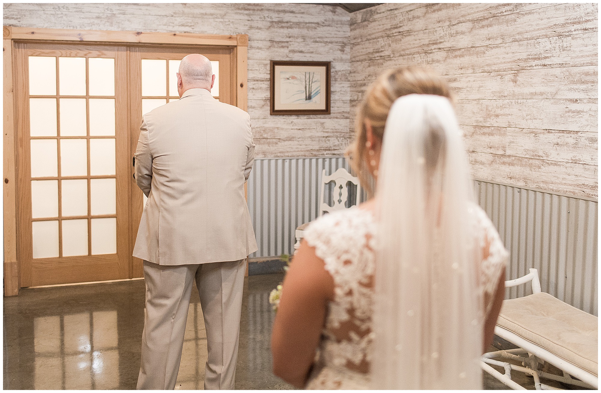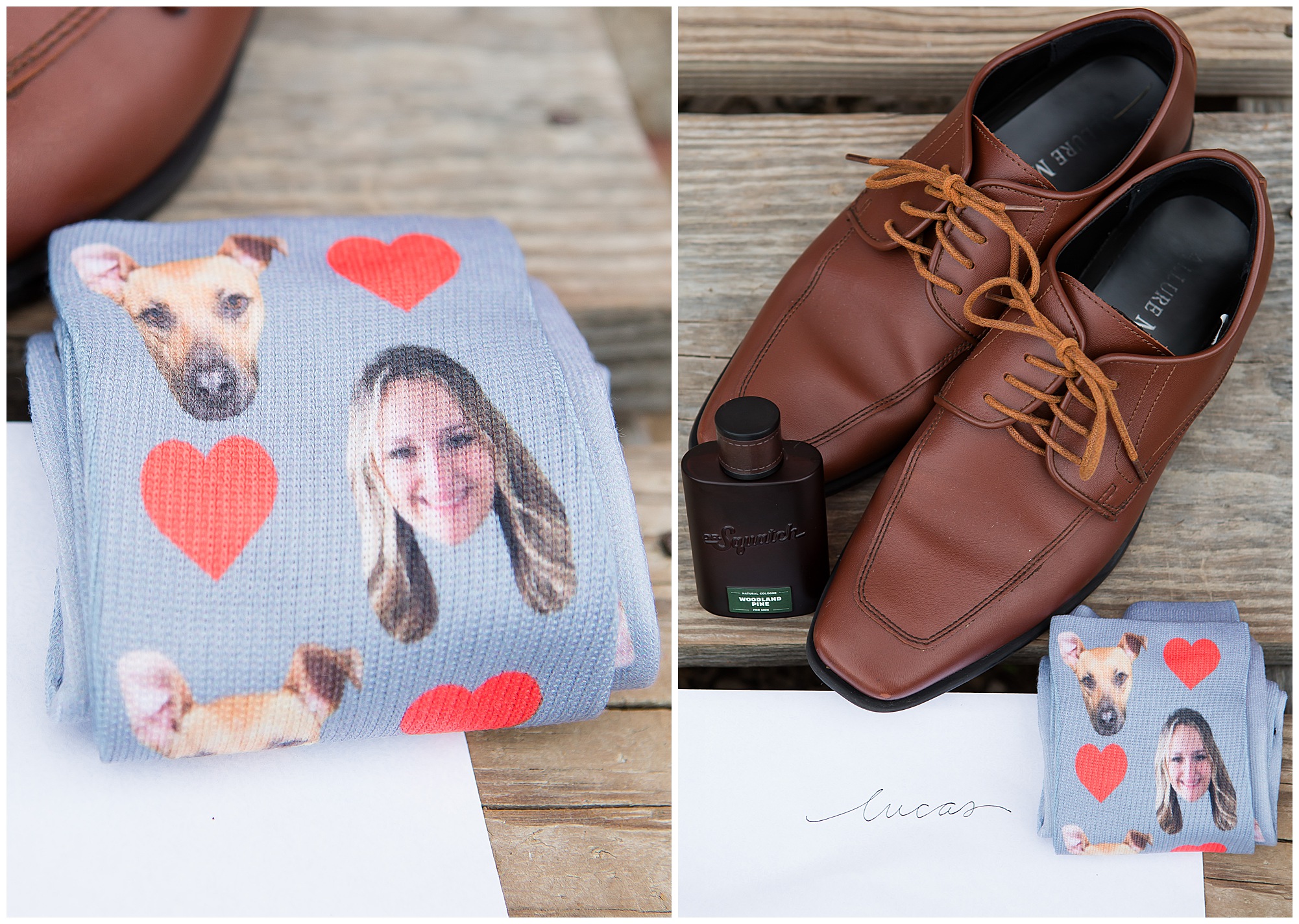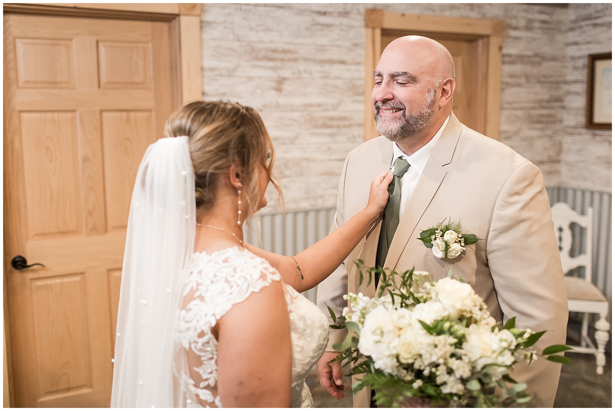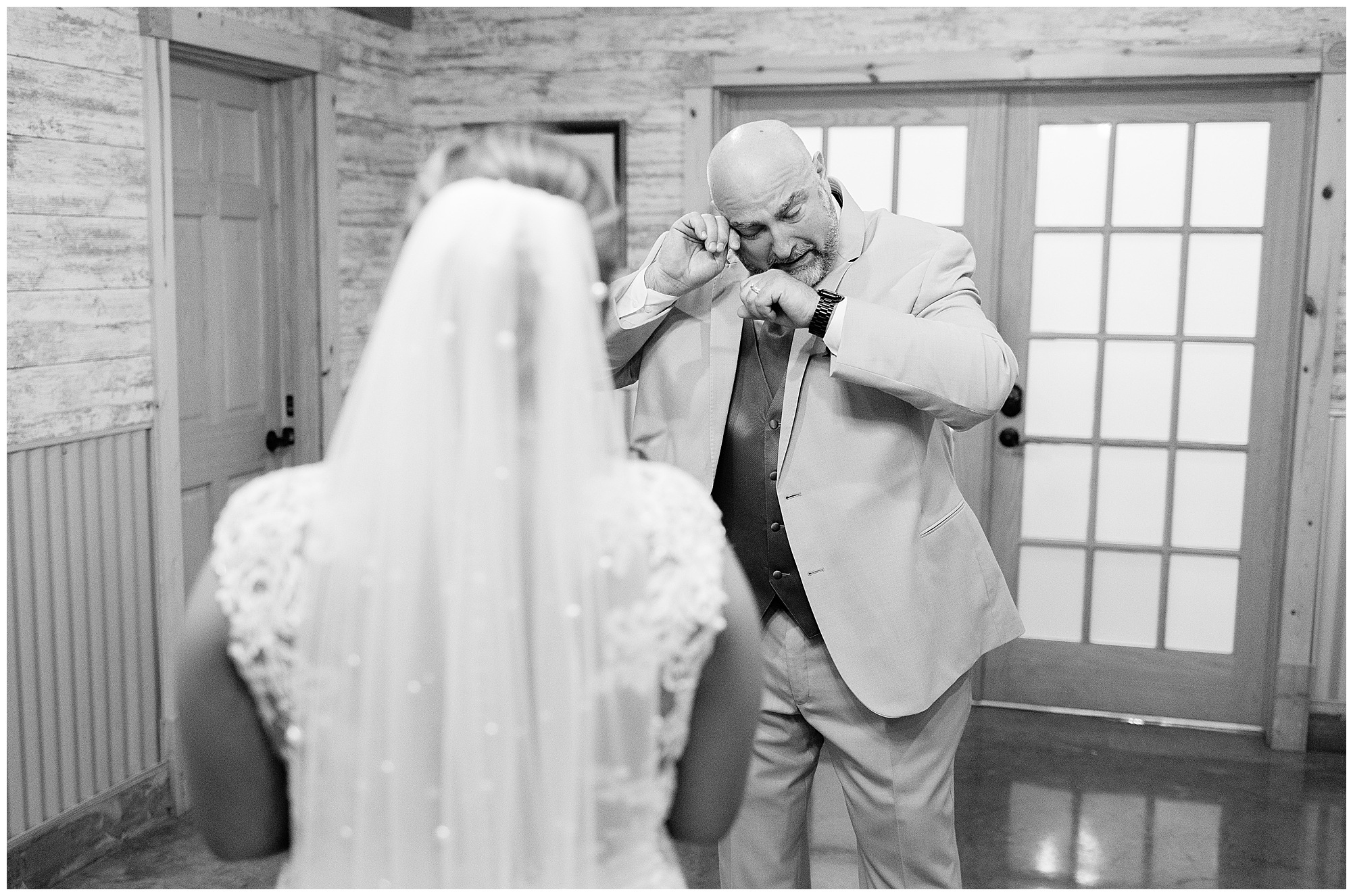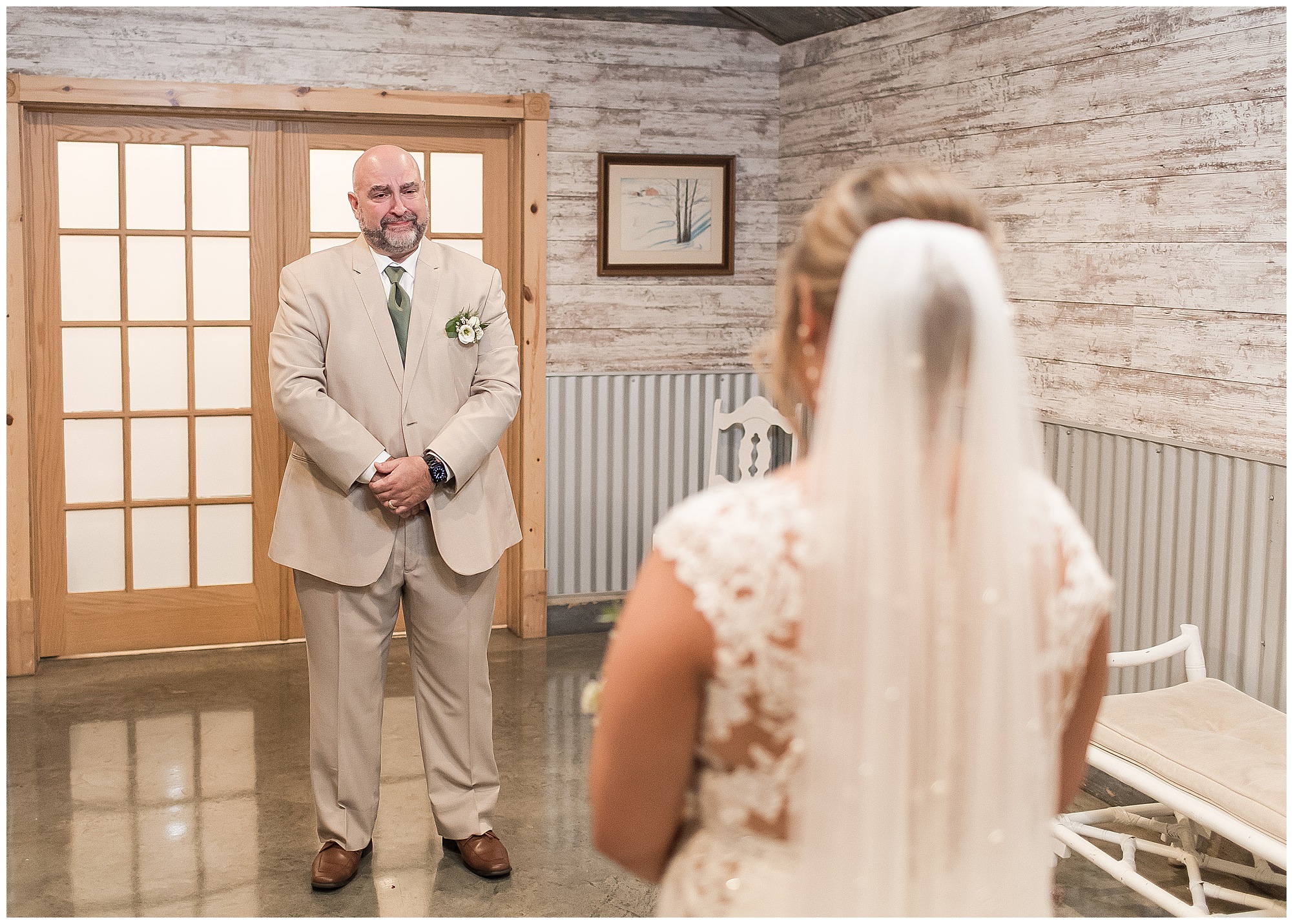 Lucas was cool, calm, and collected in the morning getting ready with all of his guys.They were watching a little college football, enjoying each other’s company, and anticipating what was to come for the day. Lucas and his groomsmen were all donning tan suits. And while the guys all wore sage vests and ties, Lucas sported a matching tan vest and tie, which set him apart. I’m not gonna lie, I loved this look! Christy even gifted Lucas a special pair of socks with her and their dog, Lilly’s faces on them! Hilarious! I took the guys outside as well to have some fun for portrait time. Lucas and his crew were laid back and did an awesome job during photo time. I knew we were going to have a wonderful time with this bridal party once we got everyone together! Once I got Lucas and the boys back inside I had one more task before the ceremony. Christy and her dad were going to have a first look. If I haven’t told you before, I love first looks! But, father/daughter first looks are probably my absolute favorites! What a moment! Christy’s dad, Joe, immediately broke down upon seeing his little girl in her white dress! It was such a lovely part of the day to be a part of. Before we knew it, however, it was time to get Lucas and Christy married!