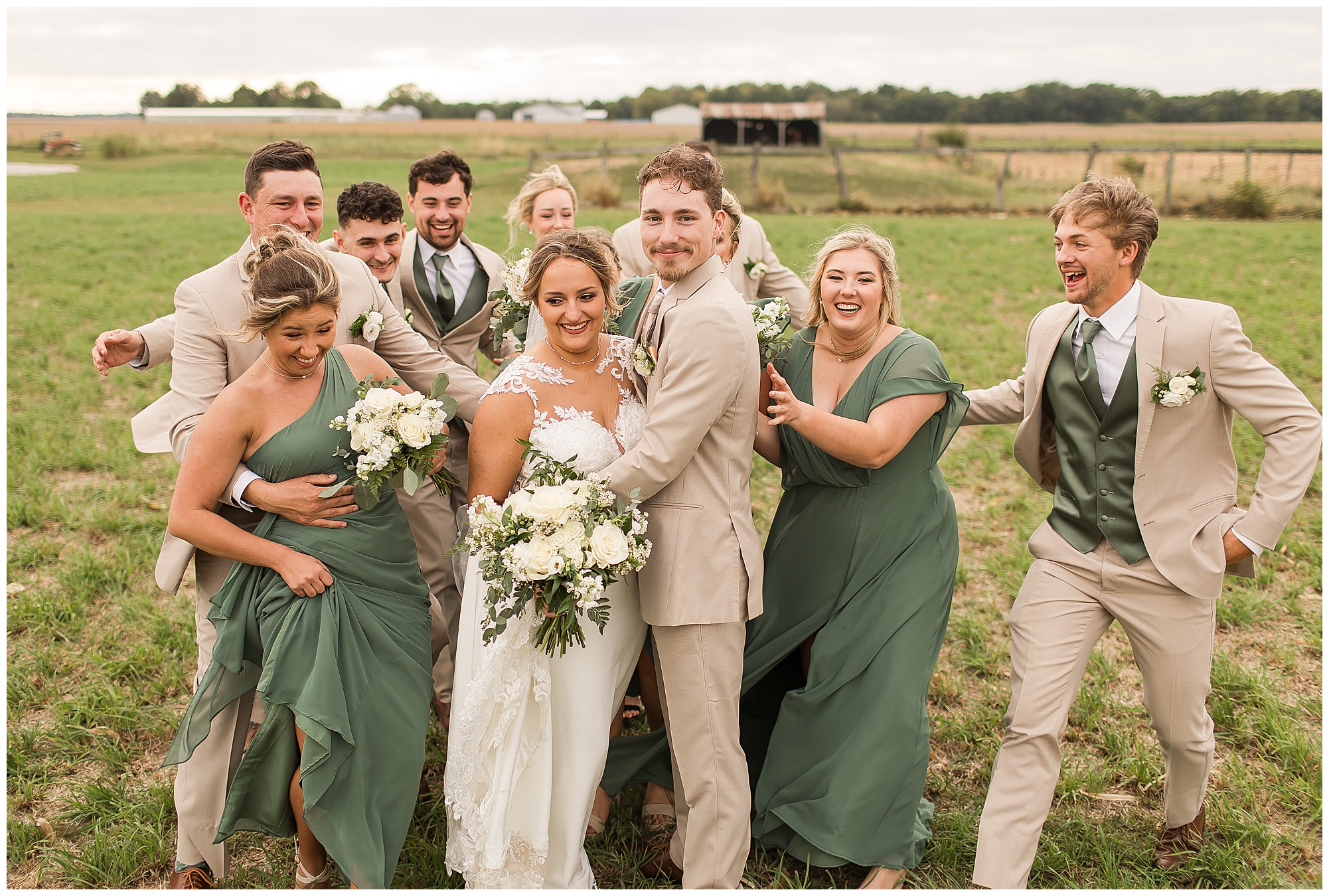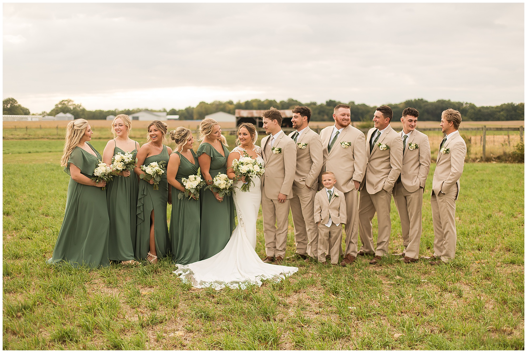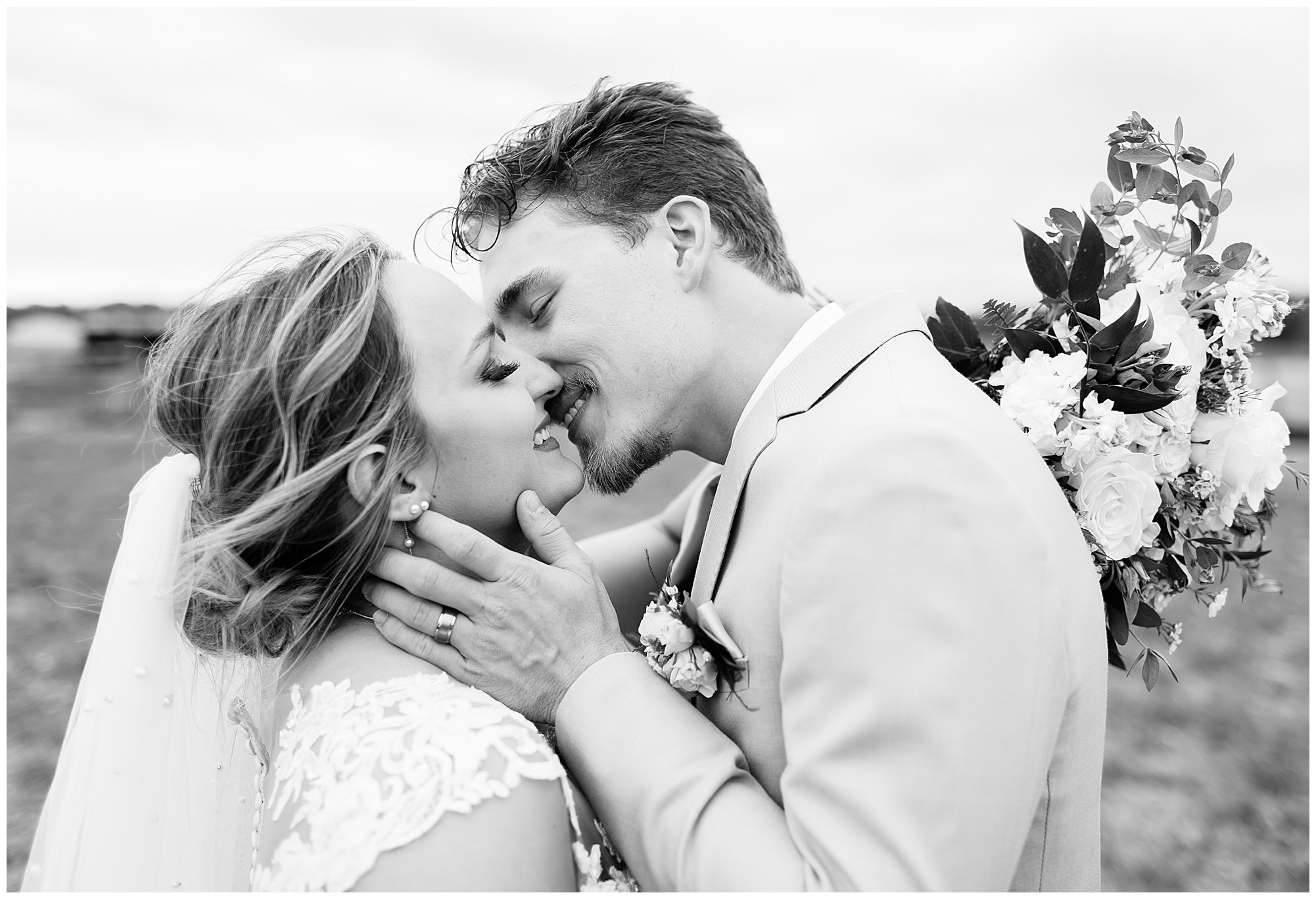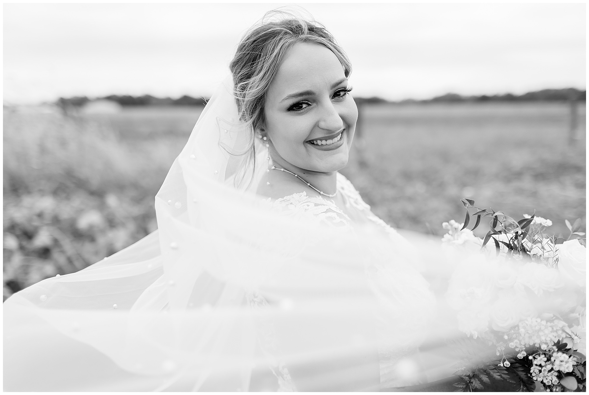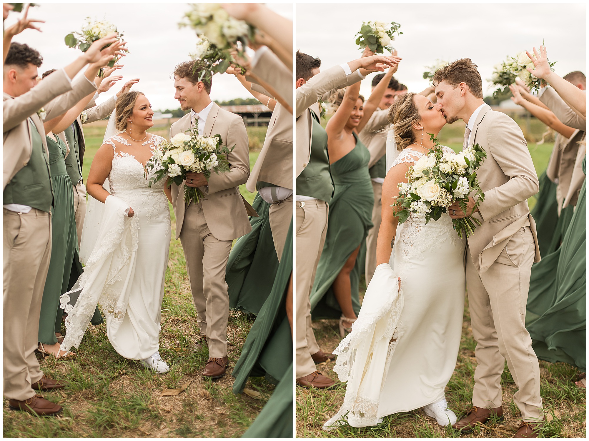 The nuptials were held outside overlooking the pasture and under the arbor, which was draped with flowers and sage fabric. The bridal party made their way down the aisle, including one of the smallest members, cutie Oliver, who carried a sign saying, “Too Late to Run Uncle Bubba, Here She Comes”! Then the moment arrived when Christy, escorted by her father, made their walk down the aisle toward Lucas. Fighting back tears, Lucas eagerly waited for his bride to arrive. Their ceremony was short and sweet, officiated by Christy’s brother, Cameron. They read vows they wrote to one another, exchanged rings, and sealed it all with a kiss to officially make them Mr. & Mrs. Robinson! As they walked up the aisle, bubbles blew in the wind as they shared one more kiss to celebrate them tying the knot! Now onto bridal party photos! Although, we didn’t see much of the sun on their wedding day, it actually gave us free range to roam about The Homestead’s open fields and not have to worry about glaring sun. Christy and Lucas’ energetic group brought the fun and made photo time a blast! They all looked phenomenal and made sure their bride and groom were the stars of the show. But then, it was time for some solo shots of the newlyweds! Christy and Lucas took in every second in each other’s arms as we went from photo to photo. They embraced the winds and laughed with one another, enjoying the little bit of quiet time they got to spend together on their big day.