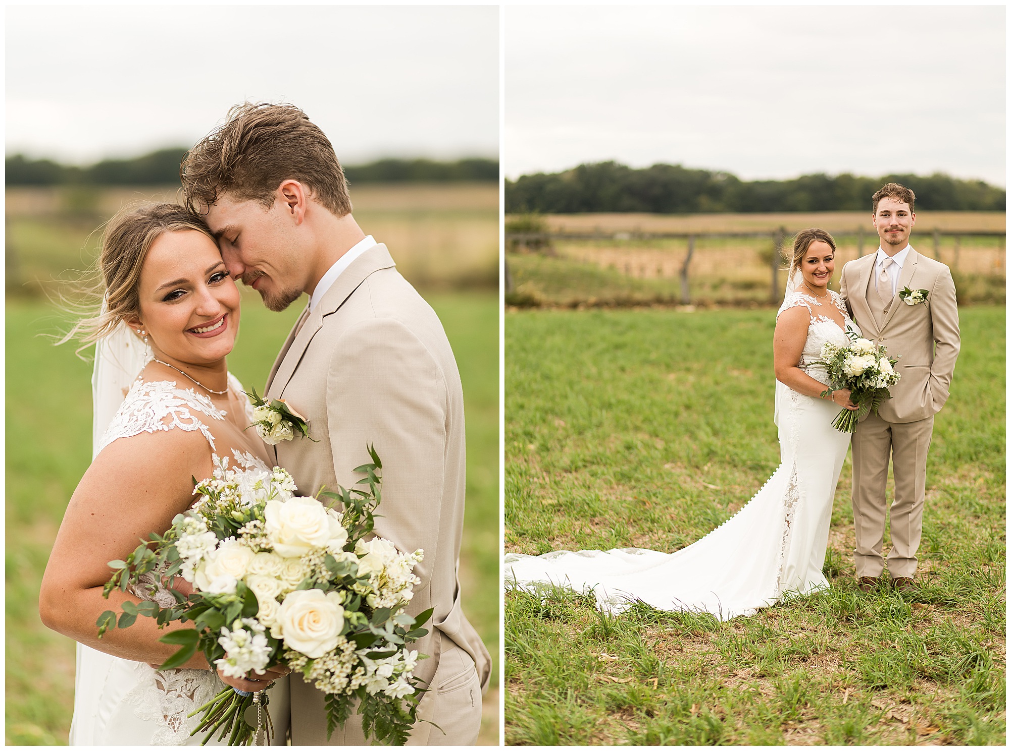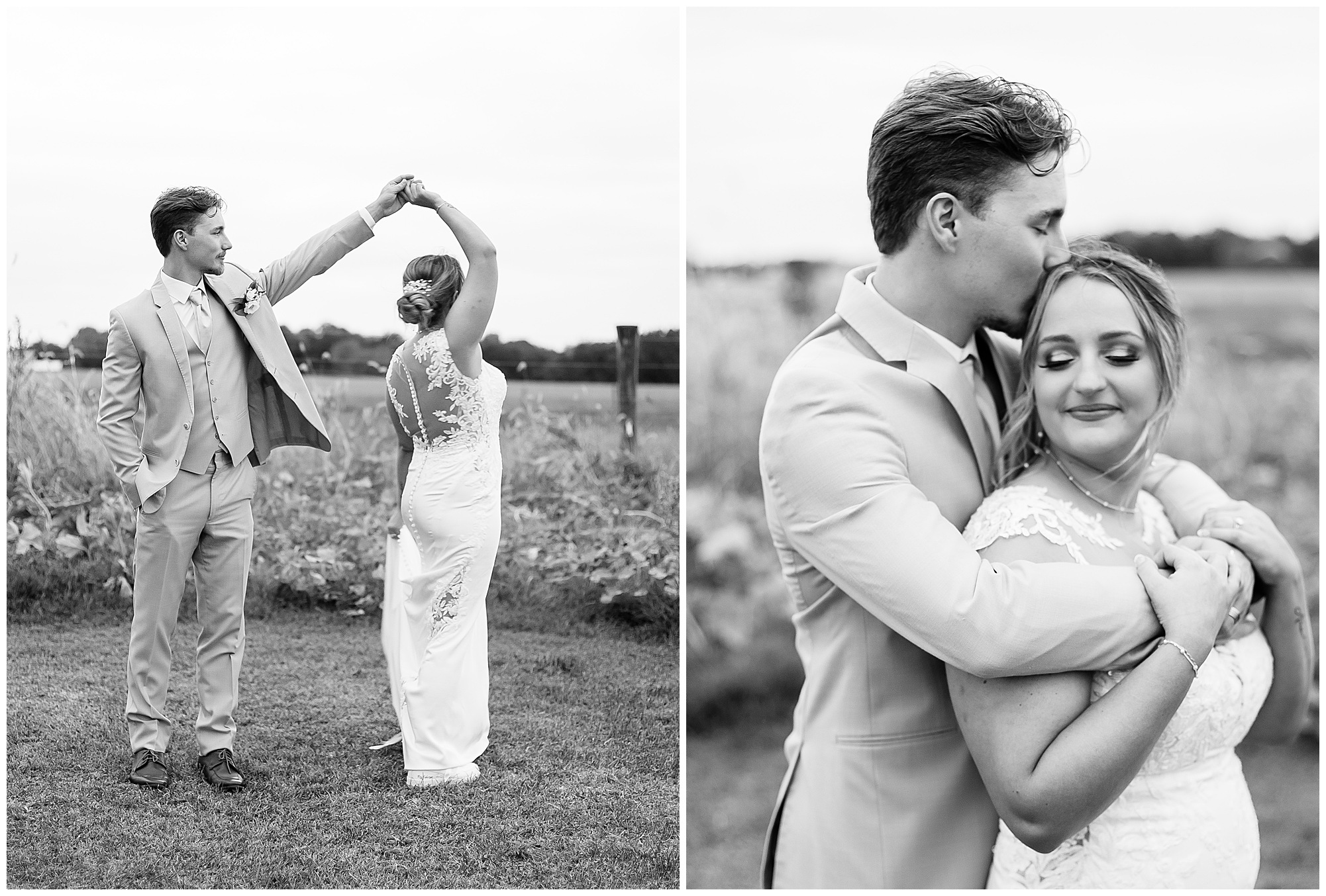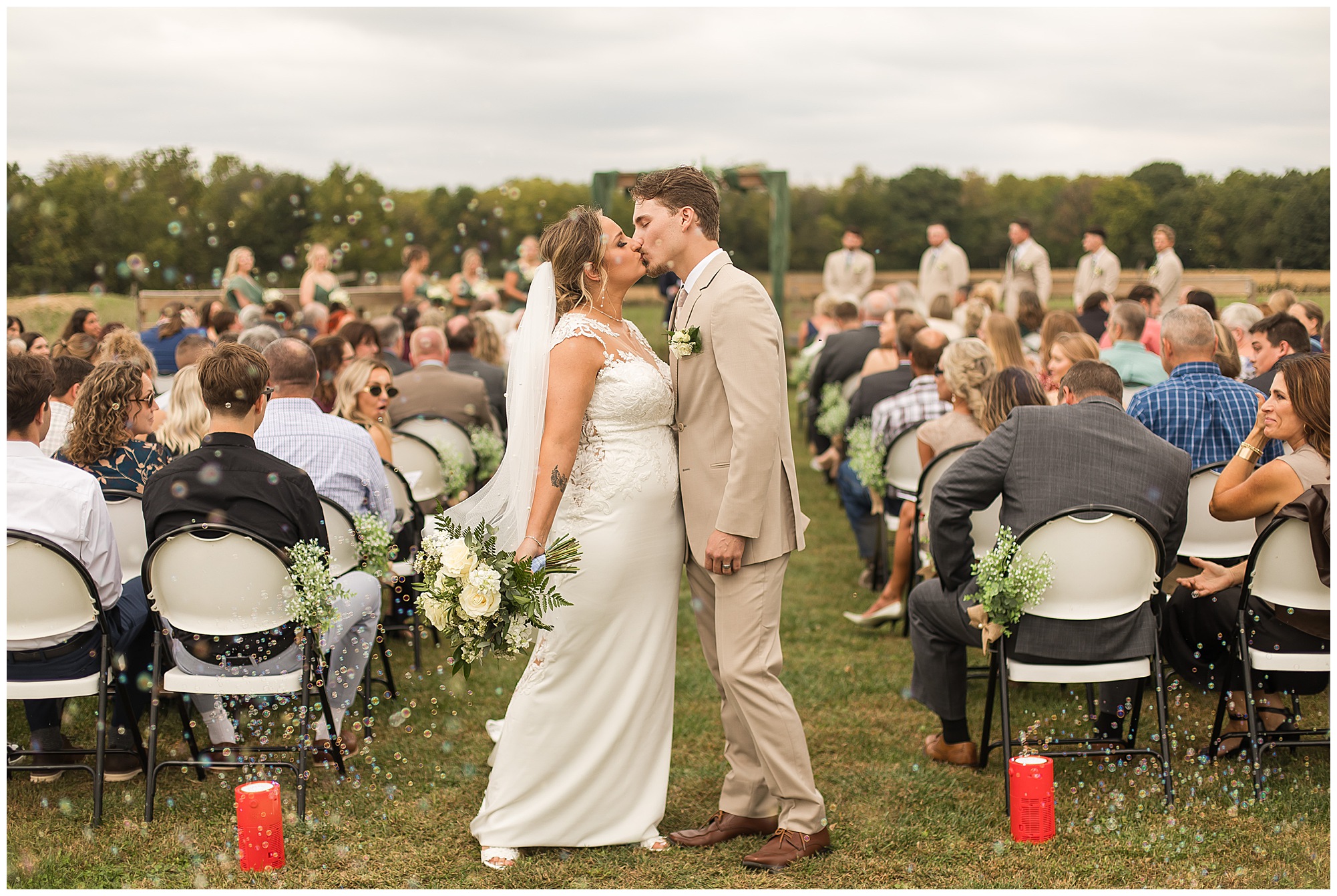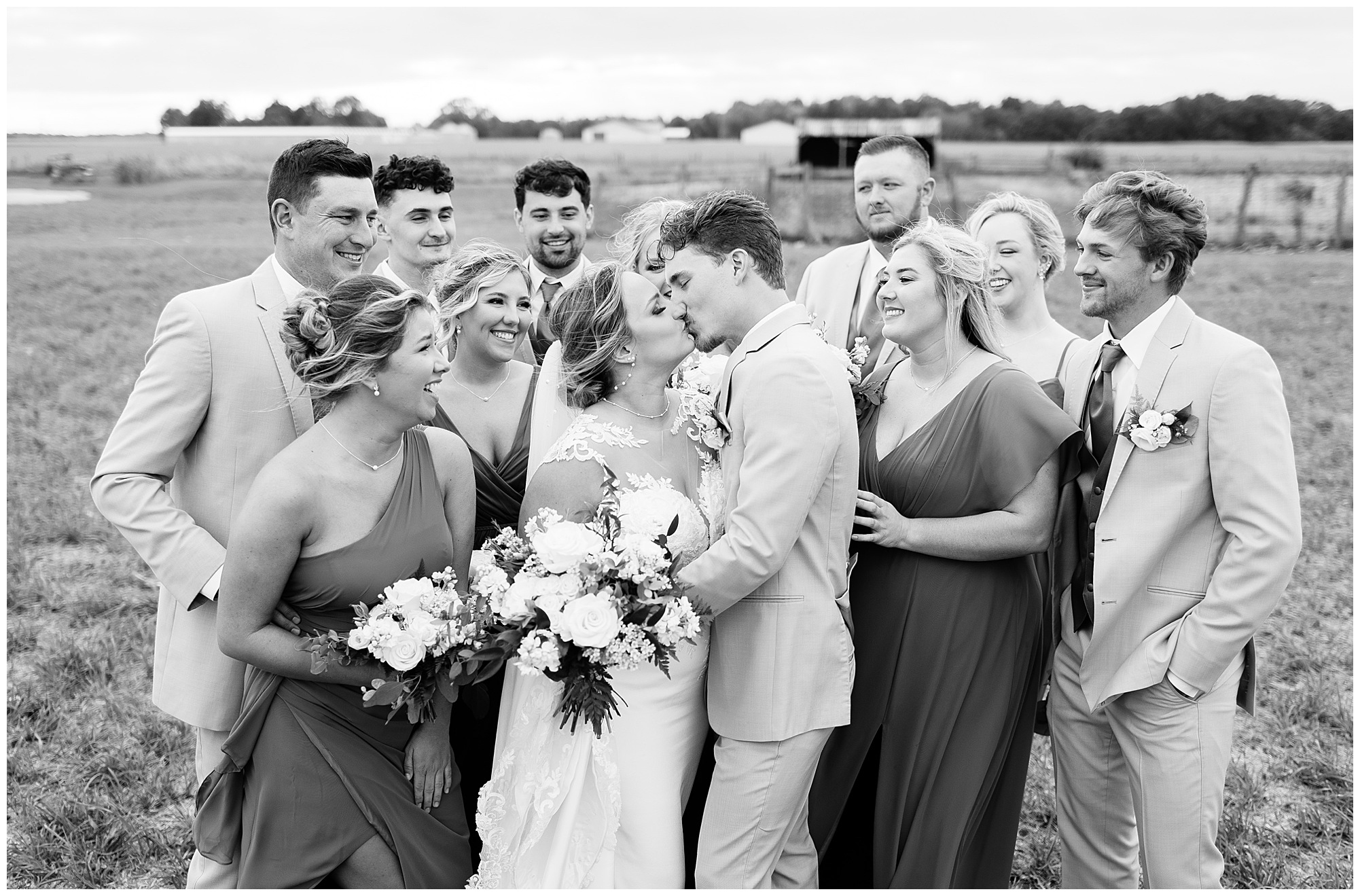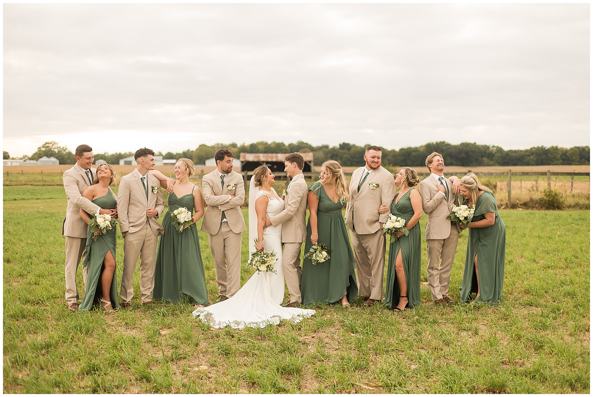 The nuptials were held outside overlooking the pasture and under the arbor, which was draped with flowers and sage fabric. The bridal party made their way down the aisle, including one of the smallest members, cutie Oliver, who carried a sign saying, “Too Late to Run Uncle Bubba, Here She Comes”! Then the moment arrived when Christy, escorted by her father, made their walk down the aisle toward Lucas. Fighting back tears, Lucas eagerly waited for his bride to arrive. Their ceremony was short and sweet, officiated by Christy’s brother, Cameron. They read vows they wrote to one another, exchanged rings, and sealed it all with a kiss to officially make them Mr. & Mrs. Robinson! As they walked up the aisle, bubbles blew in the wind as they shared one more kiss to celebrate them tying the knot! Now onto bridal party photos! Although, we didn’t see much of the sun on their wedding day, it actually gave us free range to roam about The Homestead’s open fields and not have to worry about glaring sun. Christy and Lucas’ energetic group brought the fun and made photo time a blast! They all looked phenomenal and made sure their bride and groom were the stars of the show. But then, it was time for some solo shots of the newlyweds! Christy and Lucas took in every second in each other’s arms as we went from photo to photo. They embraced the winds and laughed with one another, enjoying the little bit of quiet time they got to spend together on their big day.