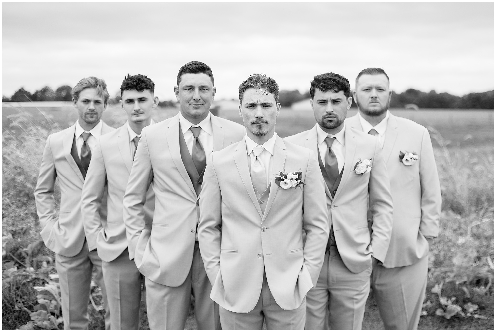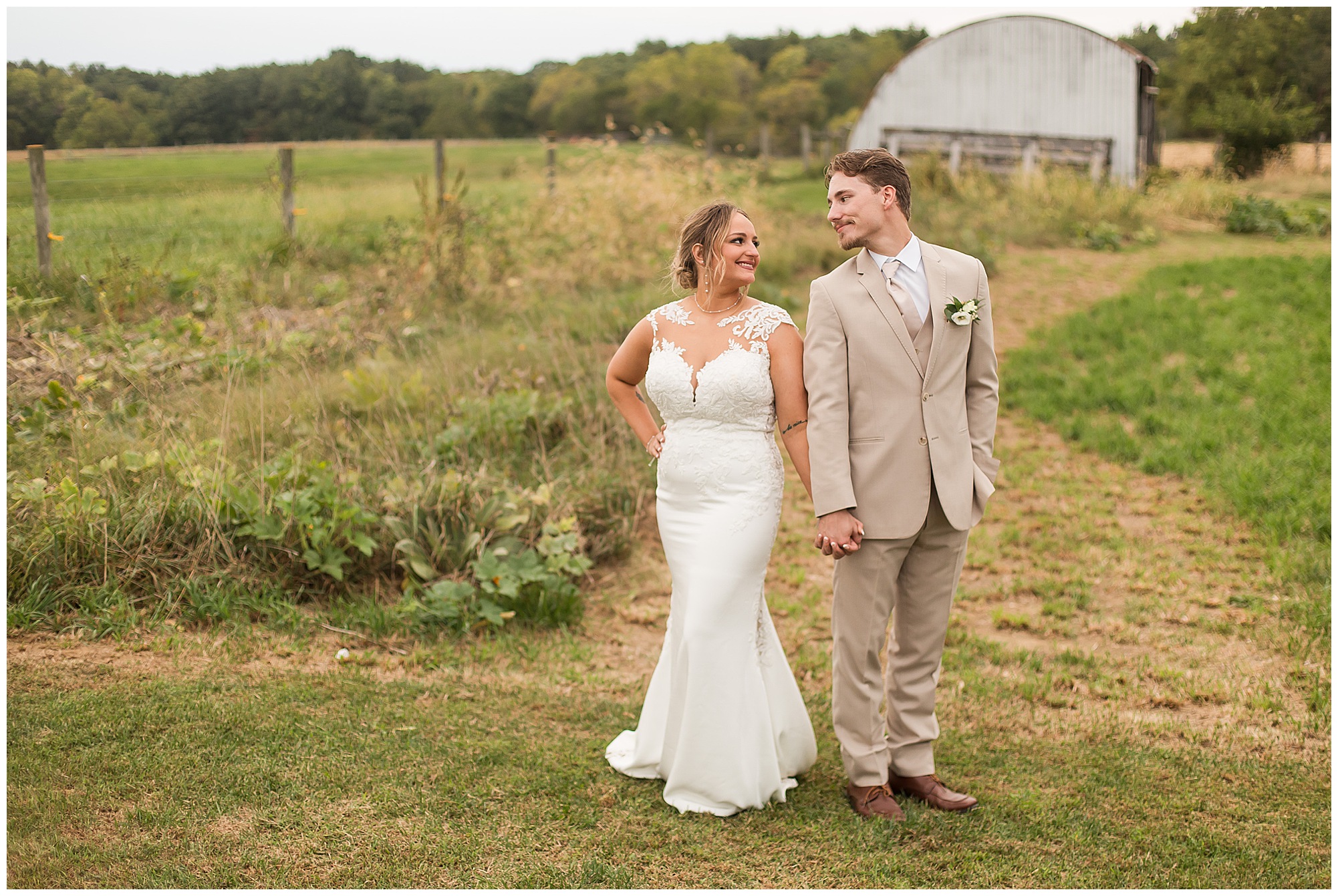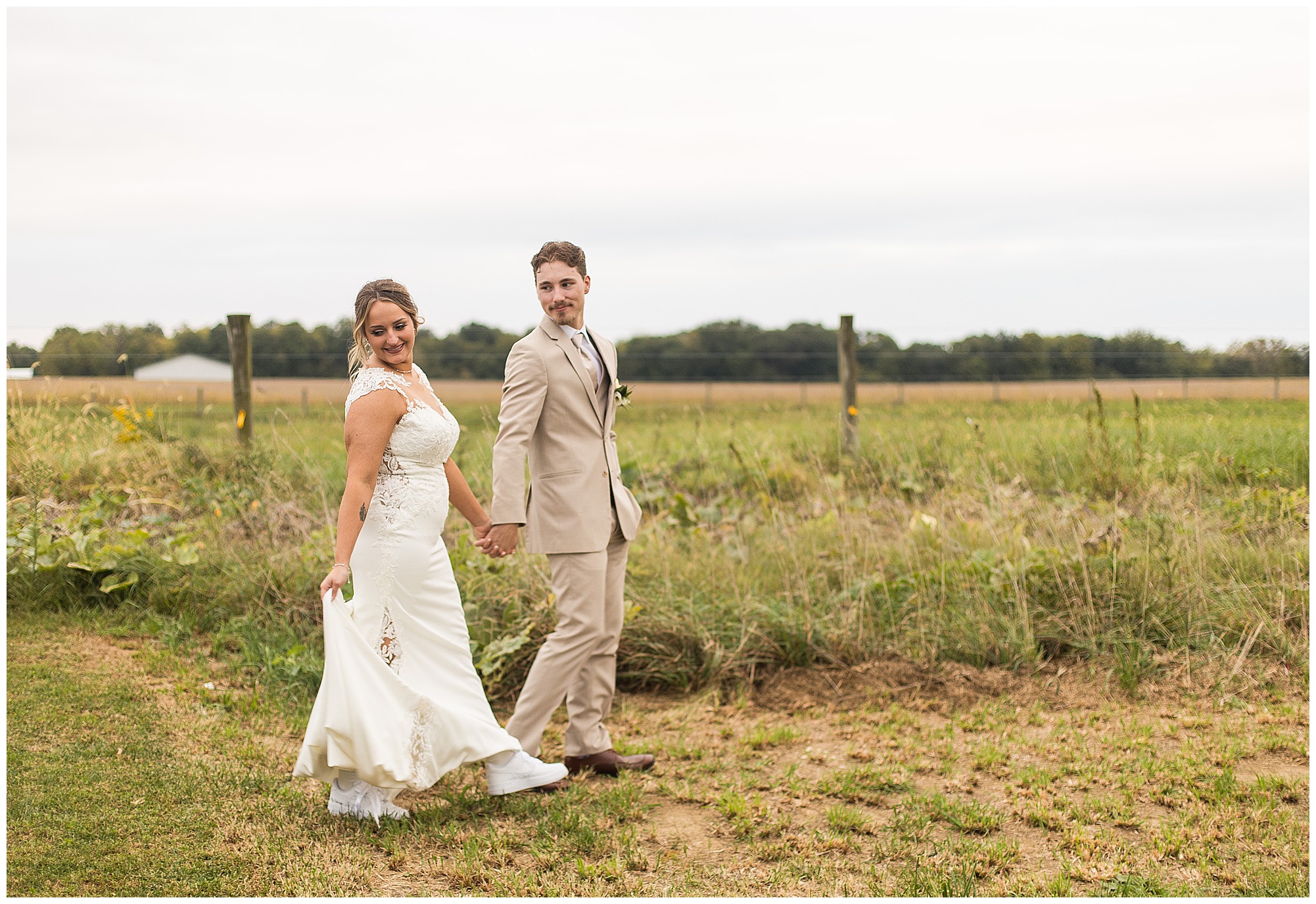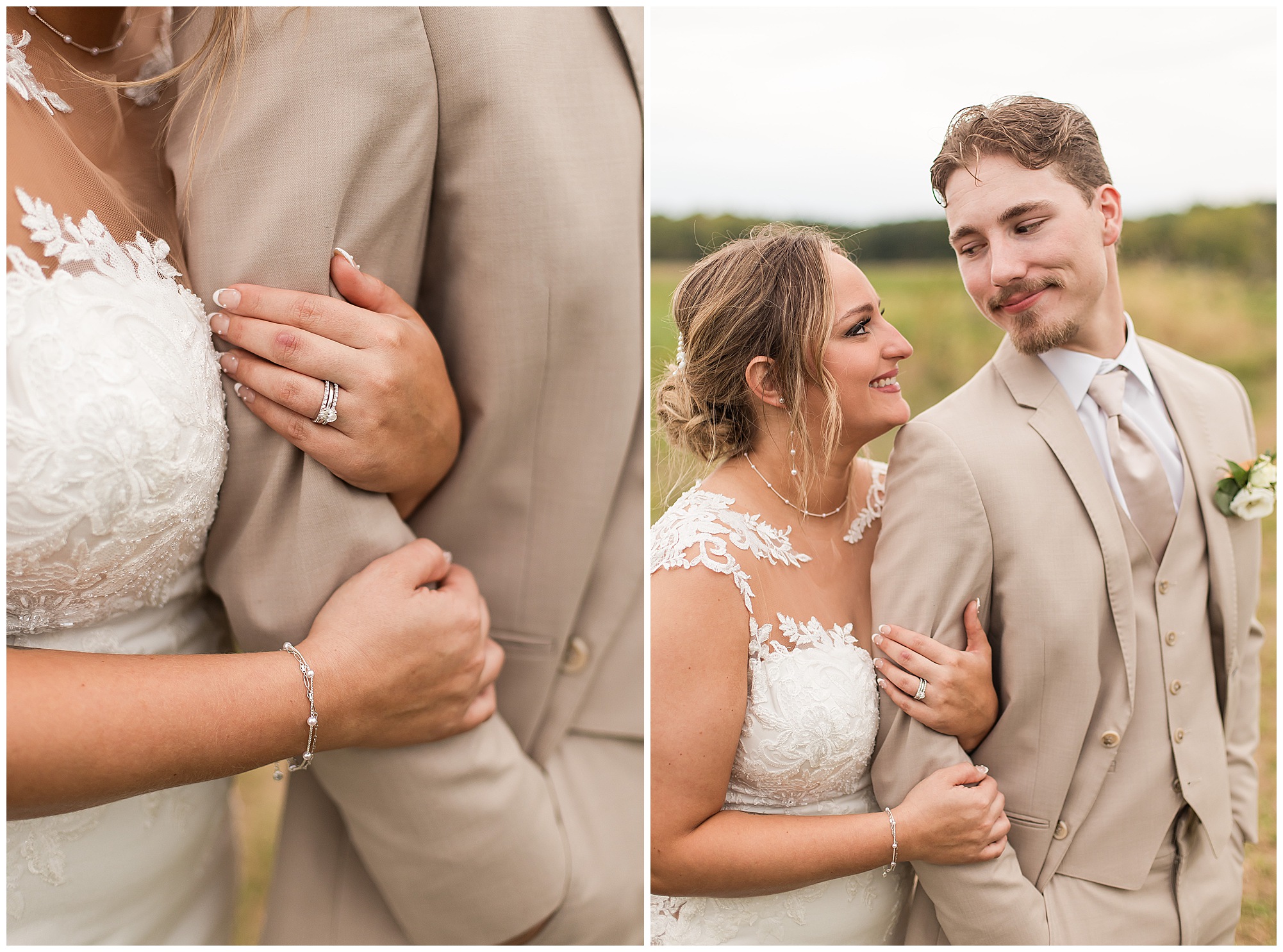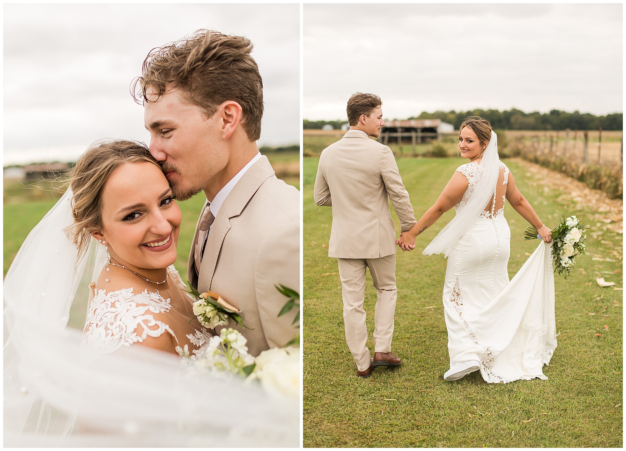 The nuptials were held outside overlooking the pasture and under the arbor, which was draped with flowers and sage fabric. The bridal party made their way down the aisle, including one of the smallest members, cutie Oliver, who carried a sign saying, “Too Late to Run Uncle Bubba, Here She Comes”! Then the moment arrived when Christy, escorted by her father, made their walk down the aisle toward Lucas. Fighting back tears, Lucas eagerly waited for his bride to arrive. Their ceremony was short and sweet, officiated by Christy’s brother, Cameron. They read vows they wrote to one another, exchanged rings, and sealed it all with a kiss to officially make them Mr. & Mrs. Robinson! As they walked up the aisle, bubbles blew in the wind as they shared one more kiss to celebrate them tying the knot! Now onto bridal party photos! Although, we didn’t see much of the sun on their wedding day, it actually gave us free range to roam about The Homestead’s open fields and not have to worry about glaring sun. Christy and Lucas’ energetic group brought the fun and made photo time a blast! They all looked phenomenal and made sure their bride and groom were the stars of the show. But then, it was time for some solo shots of the newlyweds! Christy and Lucas took in every second in each other’s arms as we went from photo to photo. They embraced the winds and laughed with one another, enjoying the little bit of quiet time they got to spend together on their big day.