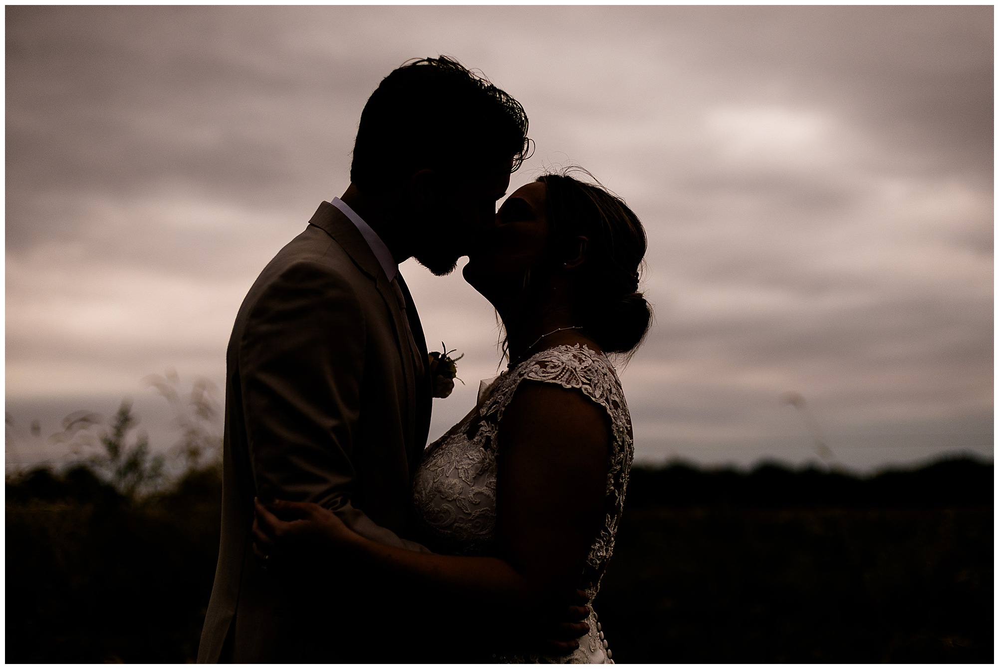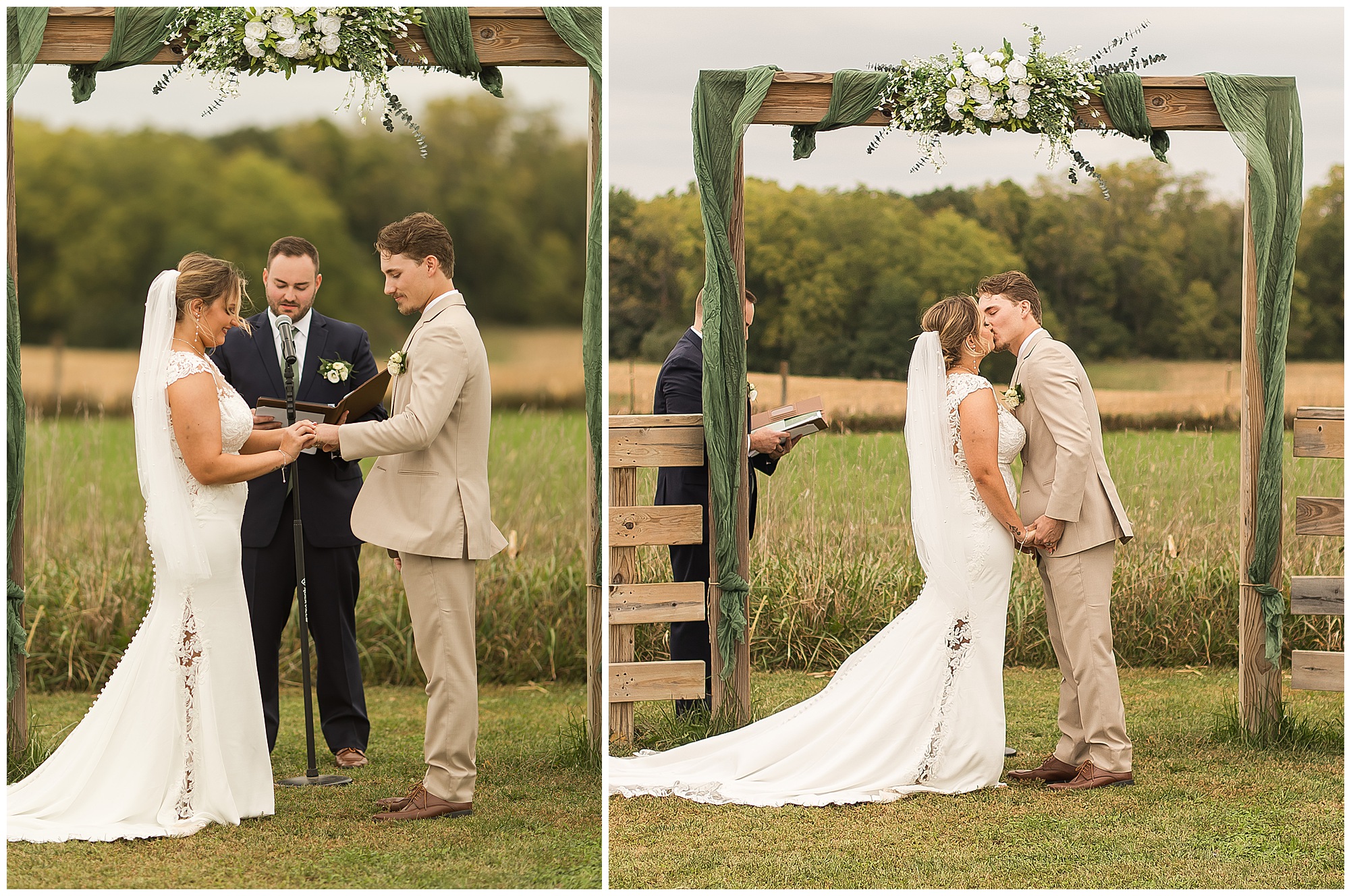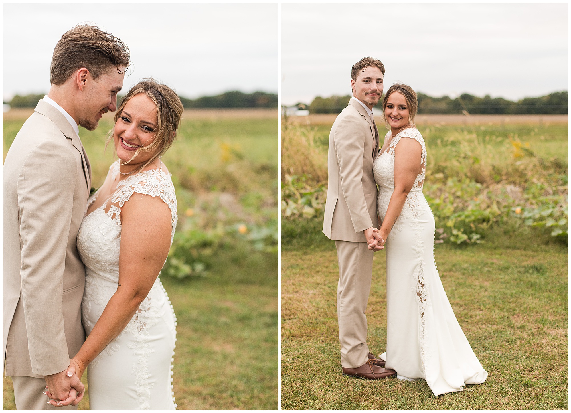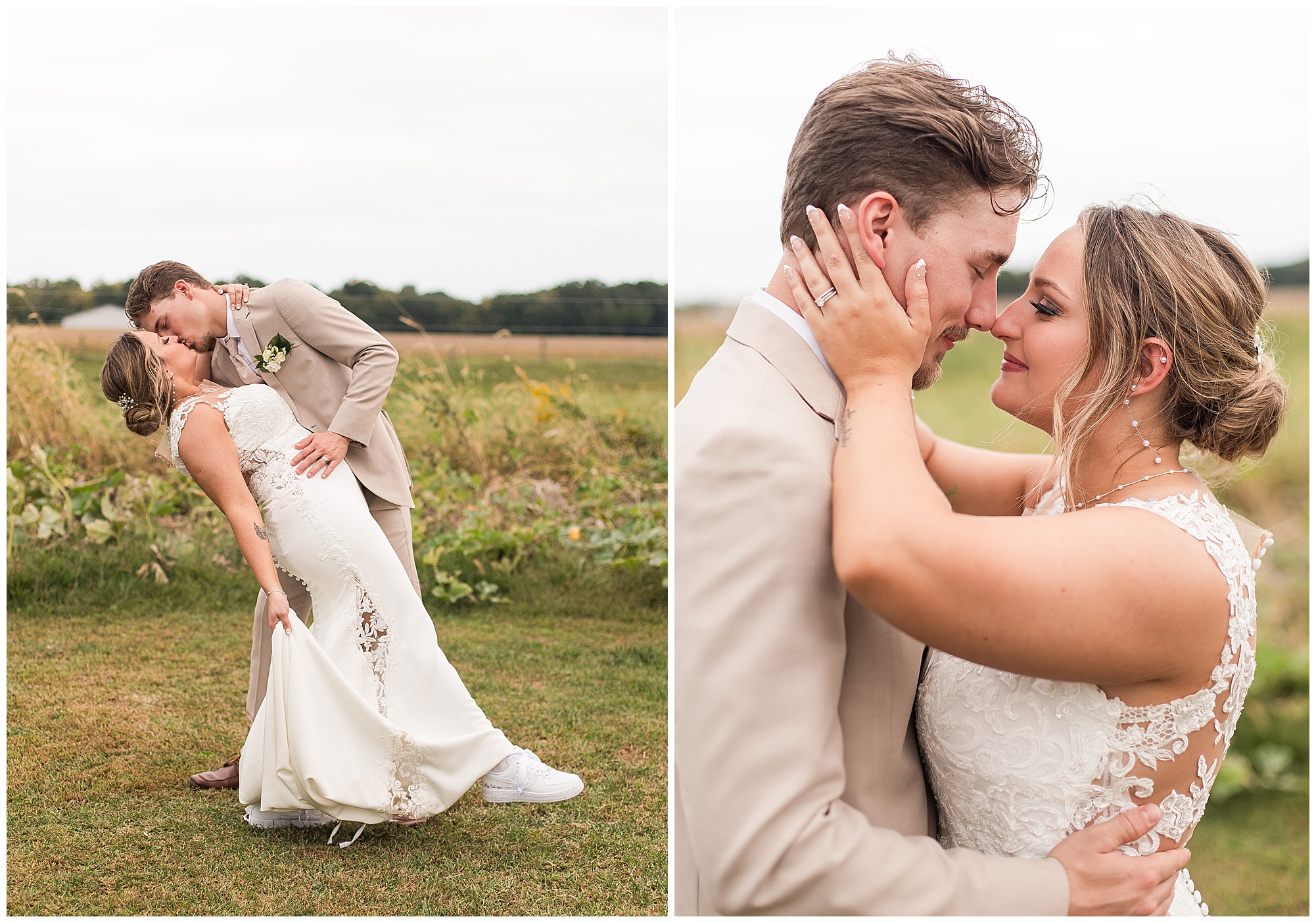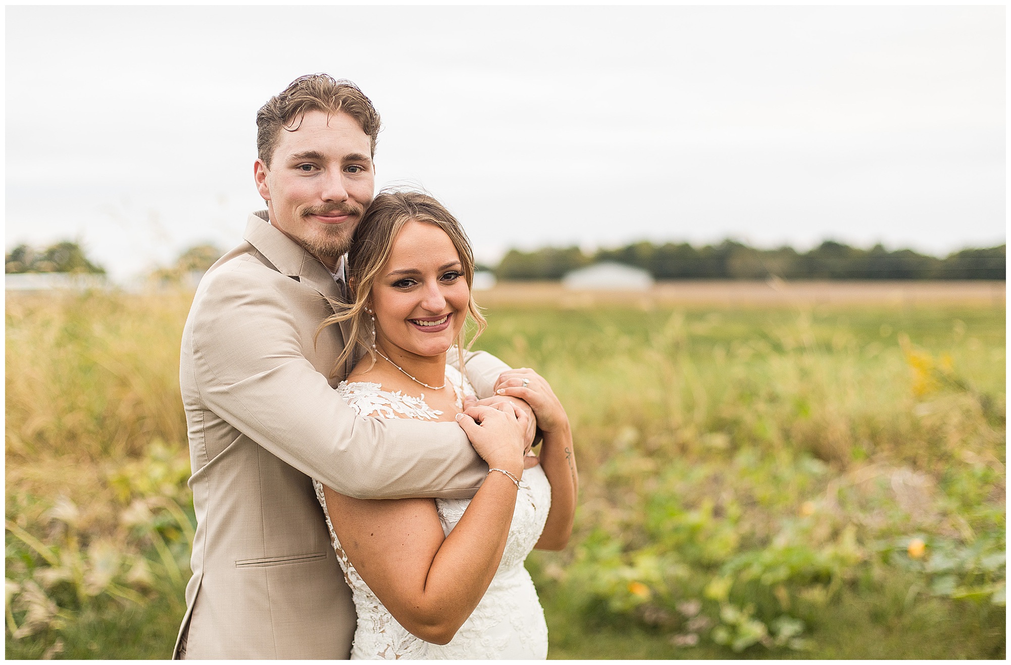 The nuptials were held outside overlooking the pasture and under the arbor, which was draped with flowers and sage fabric. The bridal party made their way down the aisle, including one of the smallest members, cutie Oliver, who carried a sign saying, “Too Late to Run Uncle Bubba, Here She Comes”! Then the moment arrived when Christy, escorted by her father, made their walk down the aisle toward Lucas. Fighting back tears, Lucas eagerly waited for his bride to arrive. Their ceremony was short and sweet, officiated by Christy’s brother, Cameron. They read vows they wrote to one another, exchanged rings, and sealed it all with a kiss to officially make them Mr. & Mrs. Robinson! As they walked up the aisle, bubbles blew in the wind as they shared one more kiss to celebrate them tying the knot! Now onto bridal party photos! Although, we didn’t see much of the sun on their wedding day, it actually gave us free range to roam about The Homestead’s open fields and not have to worry about glaring sun. Christy and Lucas’ energetic group brought the fun and made photo time a blast! They all looked phenomenal and made sure their bride and groom were the stars of the show. But then, it was time for some solo shots of the newlyweds! Christy and Lucas took in every second in each other’s arms as we went from photo to photo. They embraced the winds and laughed with one another, enjoying the little bit of quiet time they got to spend together on their big day.