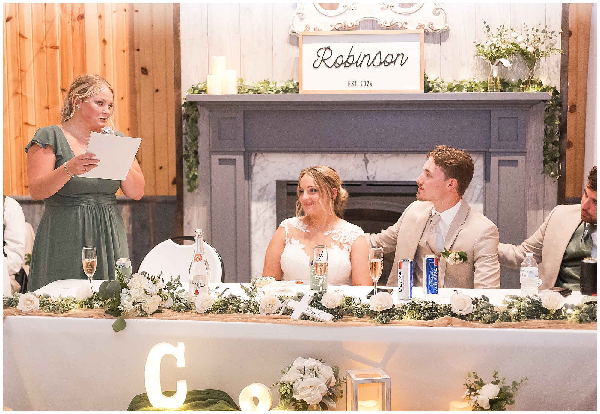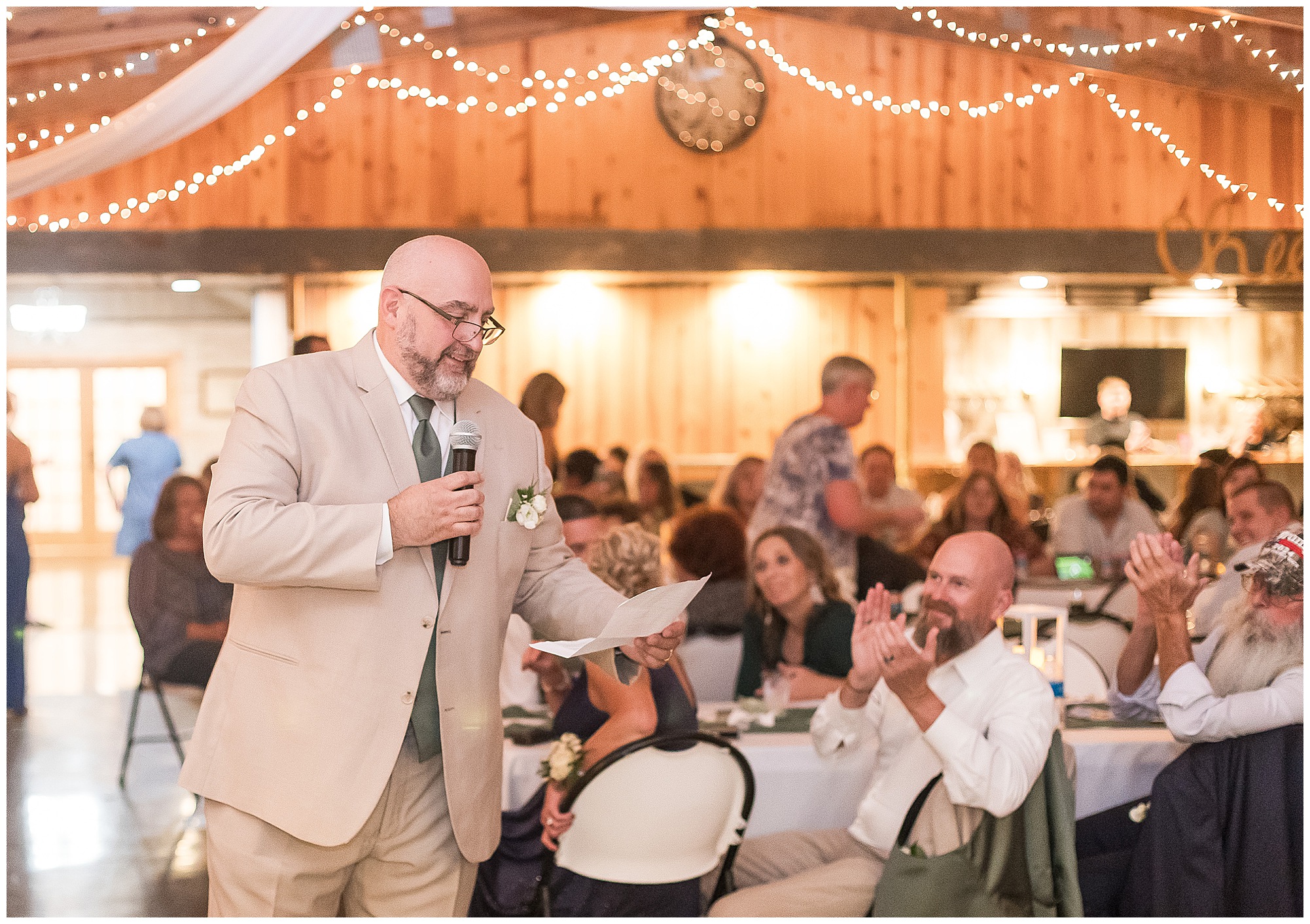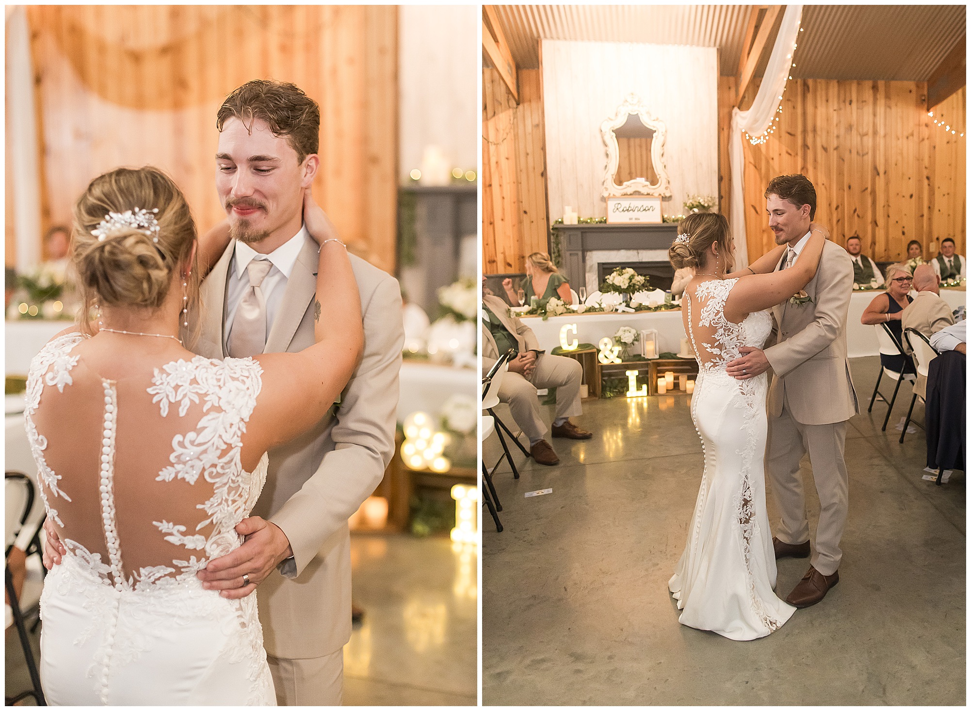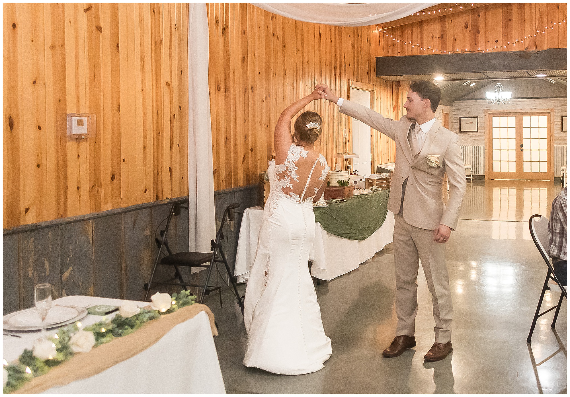 The reception was beginning and it was charming with classy touches of sage, white florals and linens. Candle light, lanterns, greenery, and wooden elements brought the rustic feel of the venue together with the elegant feel of the day. The bride and groom were honored with a few wonderful toasts from the best man, maid of honor, and the father of the bride. Now there was a bet going around, I heard, on how quickly it would take Christy’s dad to start crying once he began his speech. I believe the over/under was 7 seconds. He was happy to report…He won the bet and beat the time! The bride and groom shared their first dance before I snuck them back outside for a few more photos and our fingers all crossed that the sun would pop back out at the end of the day. Spoiler alert…We did not get our wish, even though we were all praying pretty hard for some golden glow from the sun. However, just a few more incredible moments with this lovely couple as husband and wife was enough for me! We went back in for the party to continue into the night! Cheers to Mr. & Mrs. Robinson!