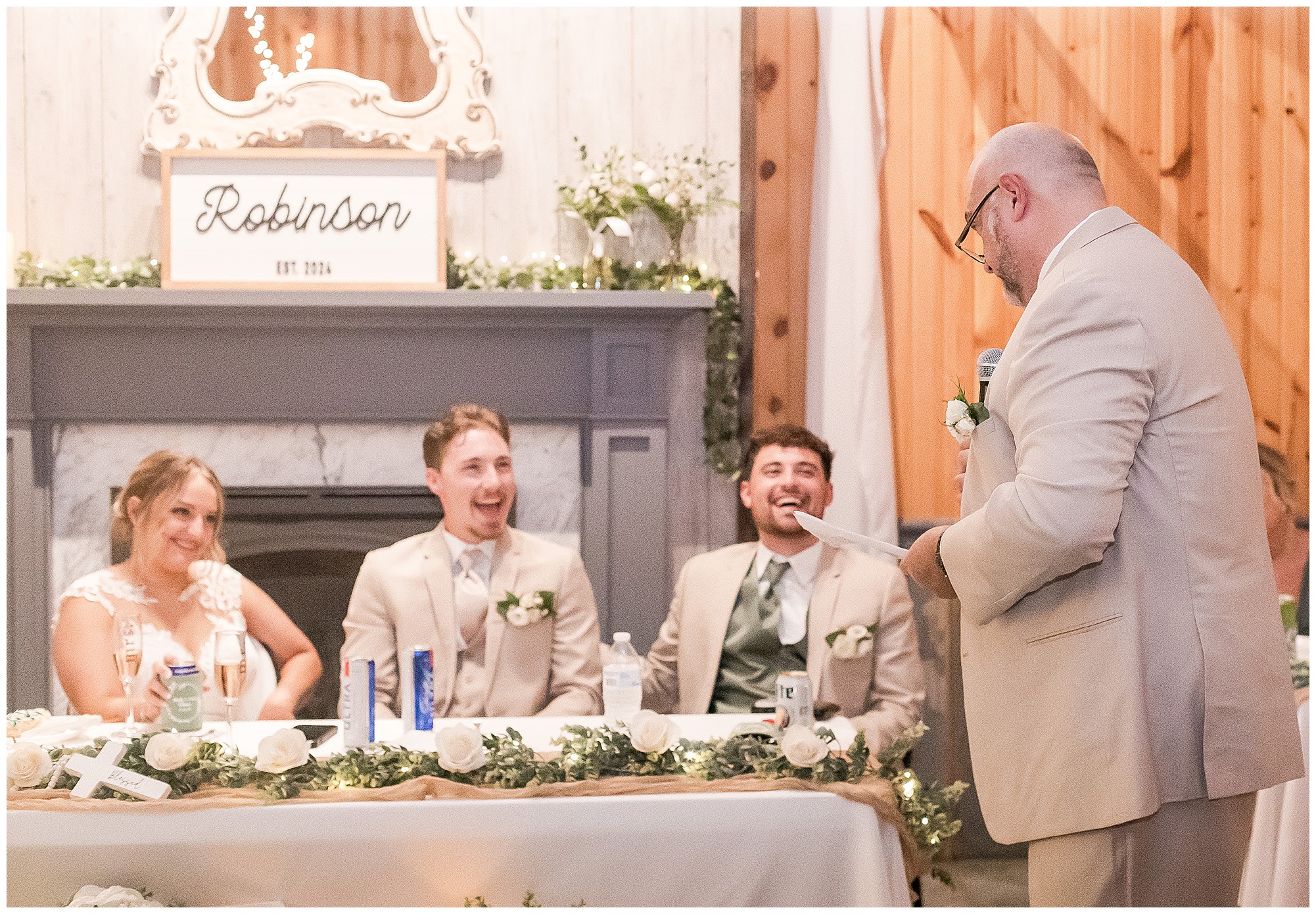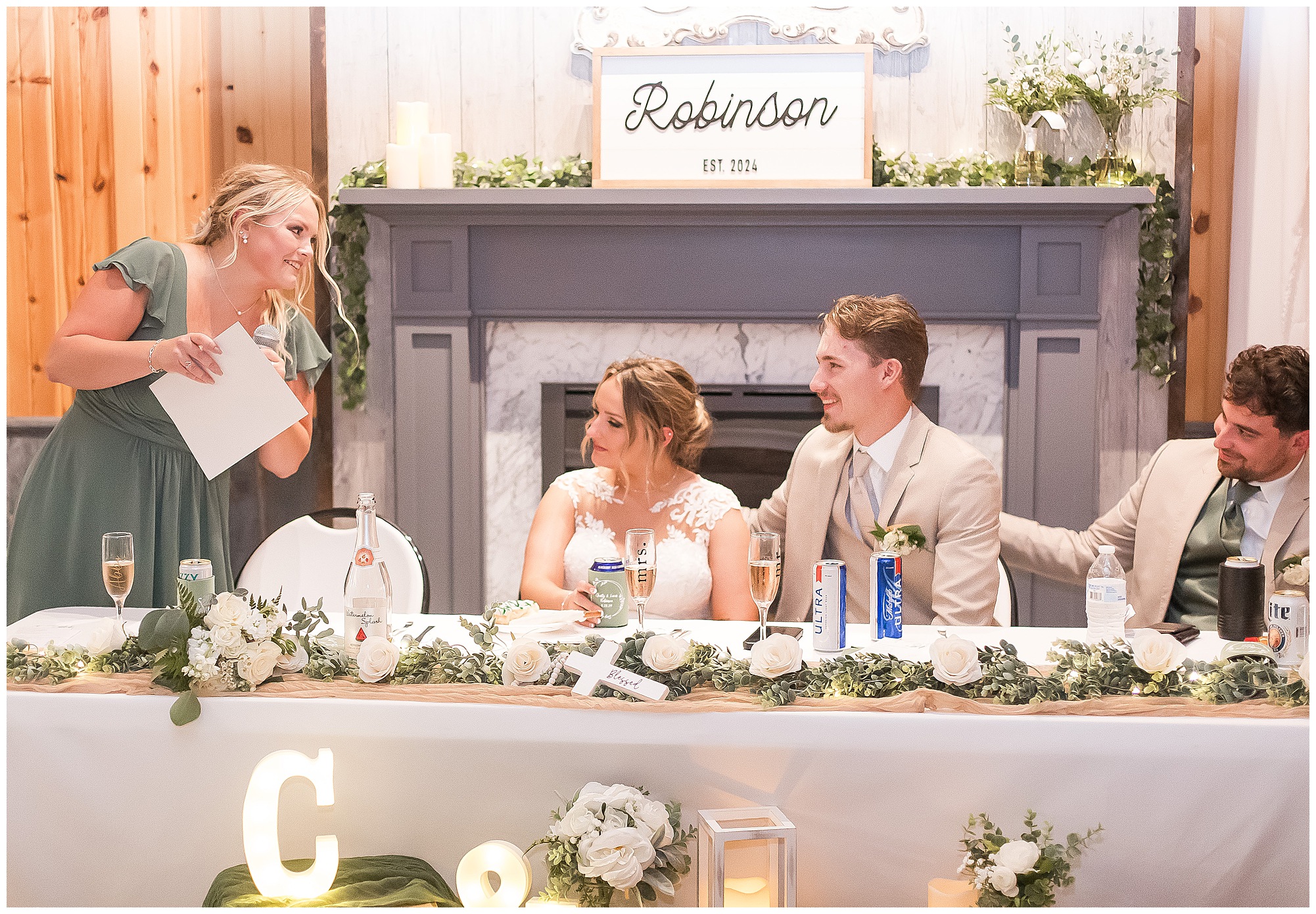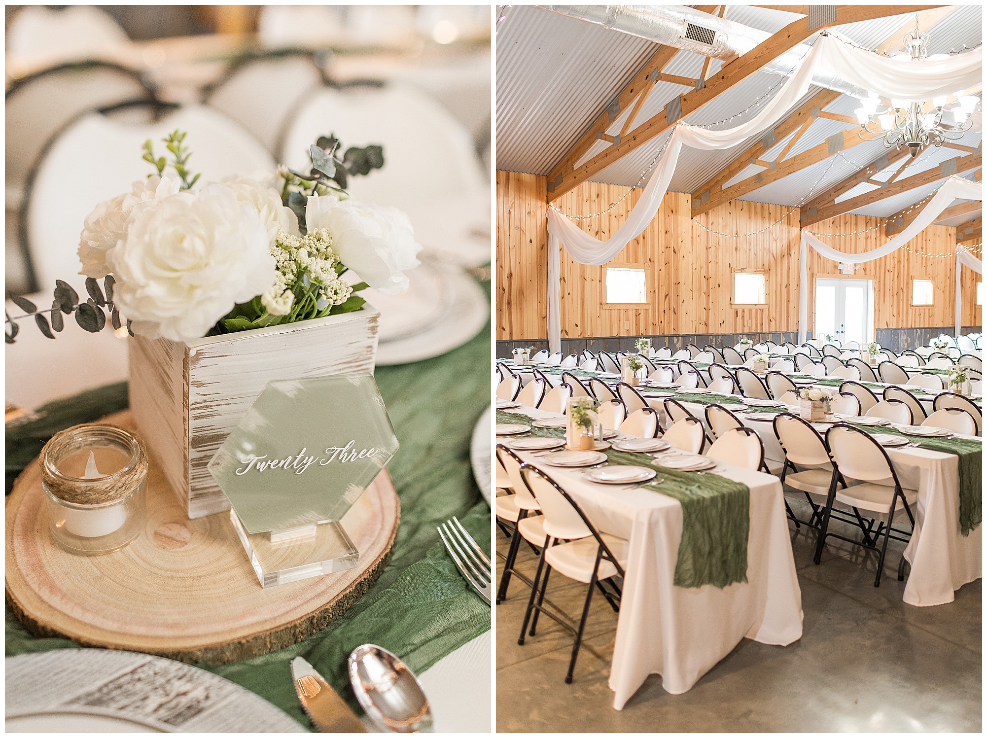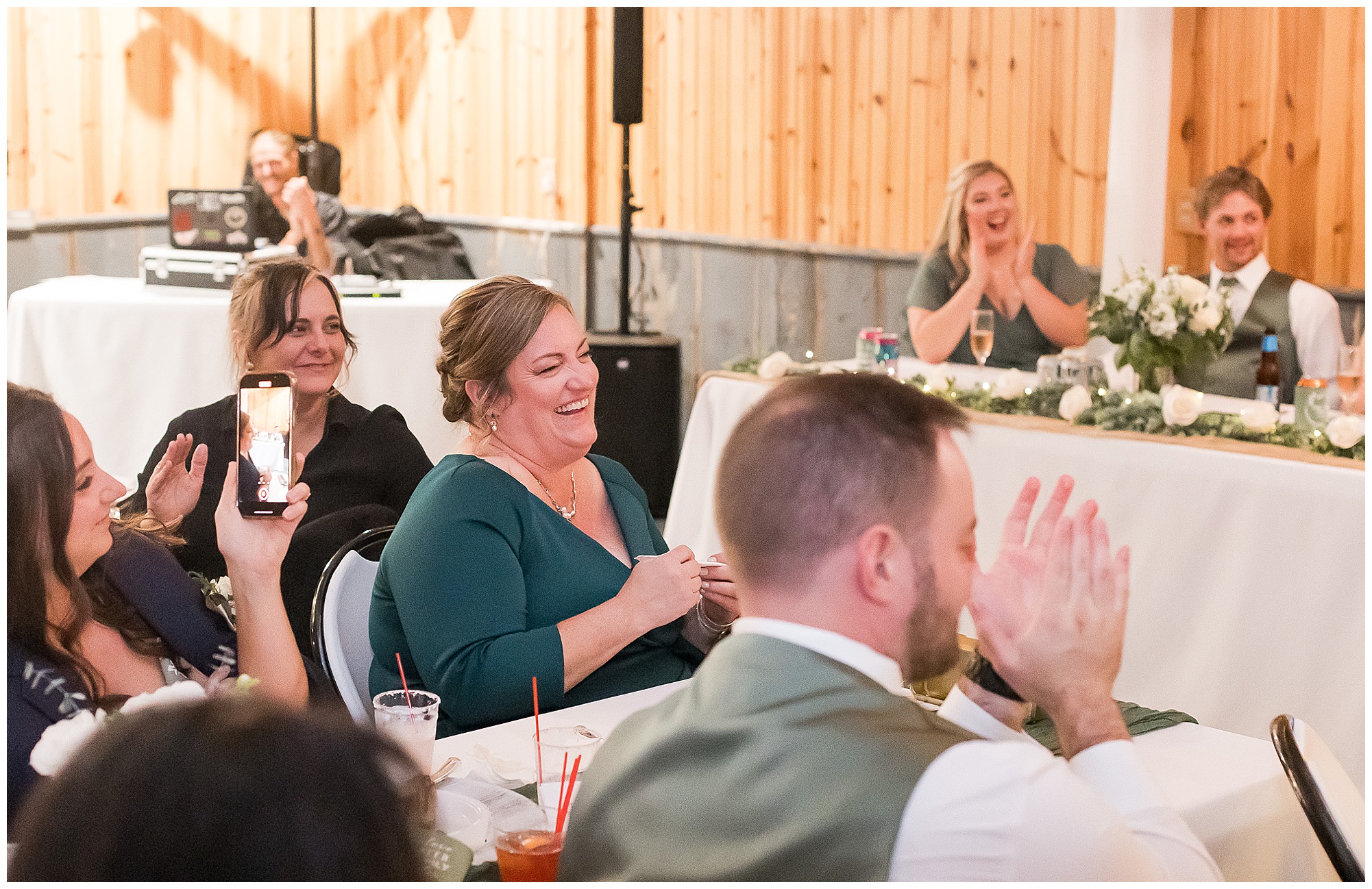 The reception was beginning and it was charming with classy touches of sage, white florals and linens. Candle light, lanterns, greenery, and wooden elements brought the rustic feel of the venue together with the elegant feel of the day. The bride and groom were honored with a few wonderful toasts from the best man, maid of honor, and the father of the bride. Now there was a bet going around, I heard, on how quickly it would take Christy’s dad to start crying once he began his speech. I believe the over/under was 7 seconds. He was happy to report…He won the bet and beat the time! The bride and groom shared their first dance before I snuck them back outside for a few more photos and our fingers all crossed that the sun would pop back out at the end of the day. Spoiler alert…We did not get our wish, even though we were all praying pretty hard for some golden glow from the sun. However, just a few more incredible moments with this lovely couple as husband and wife was enough for me! We went back in for the party to continue into the night! Cheers to Mr. & Mrs. Robinson!