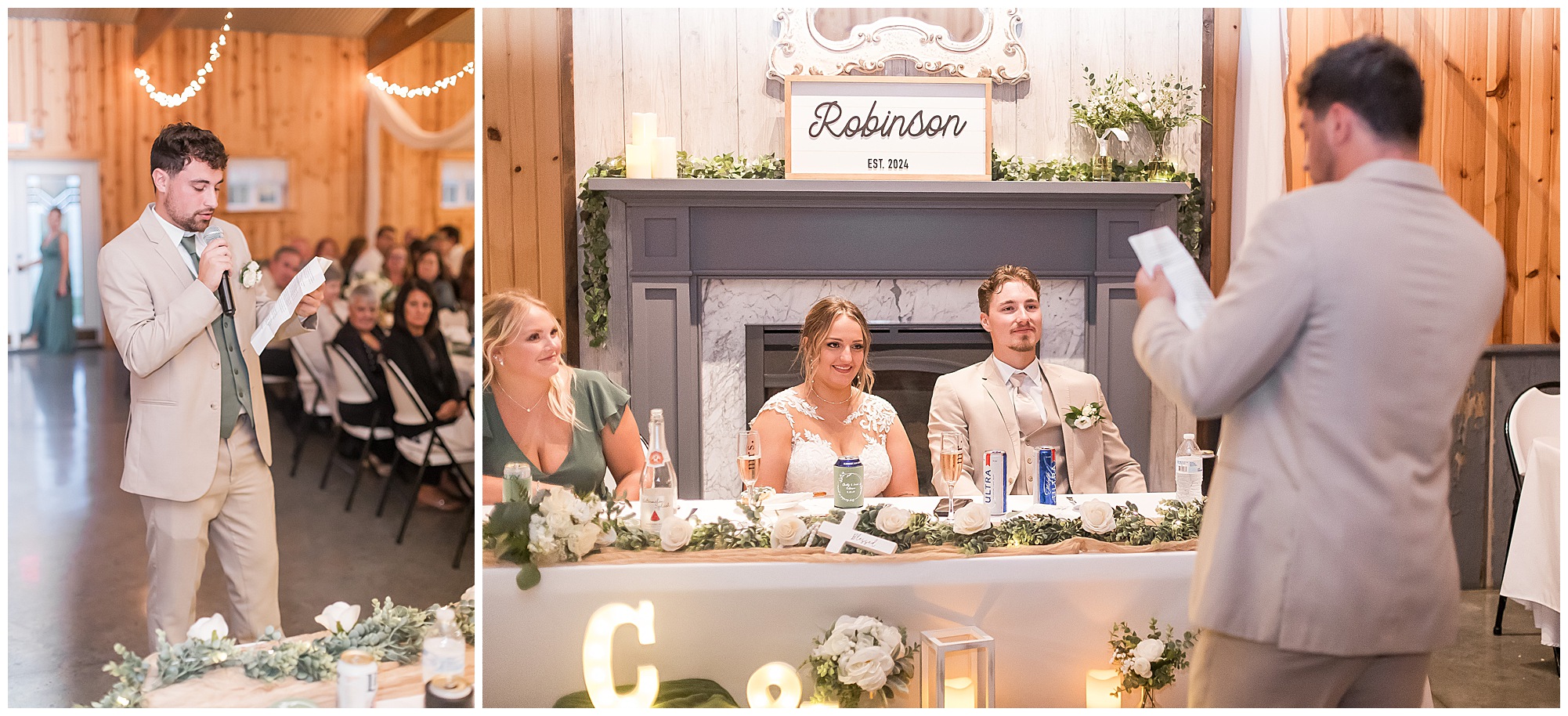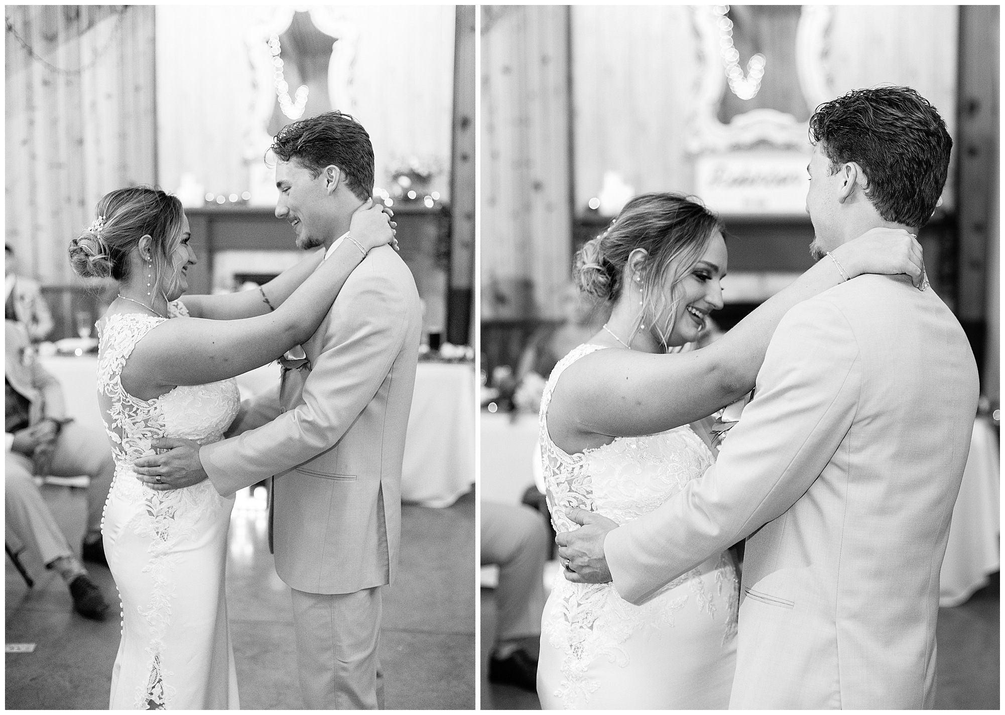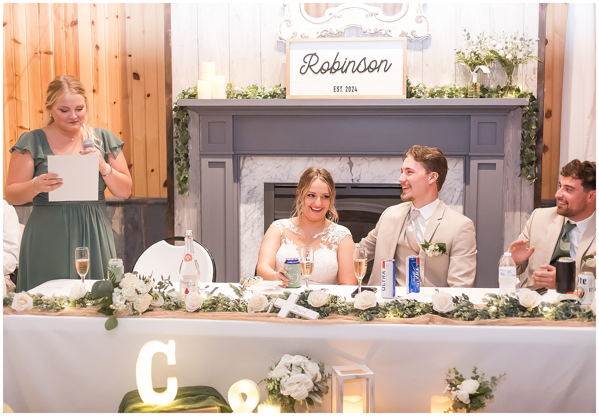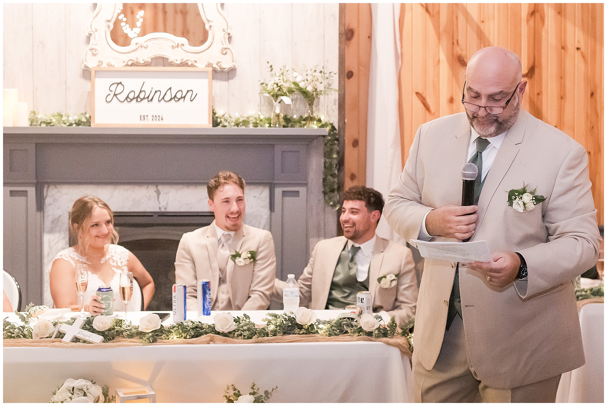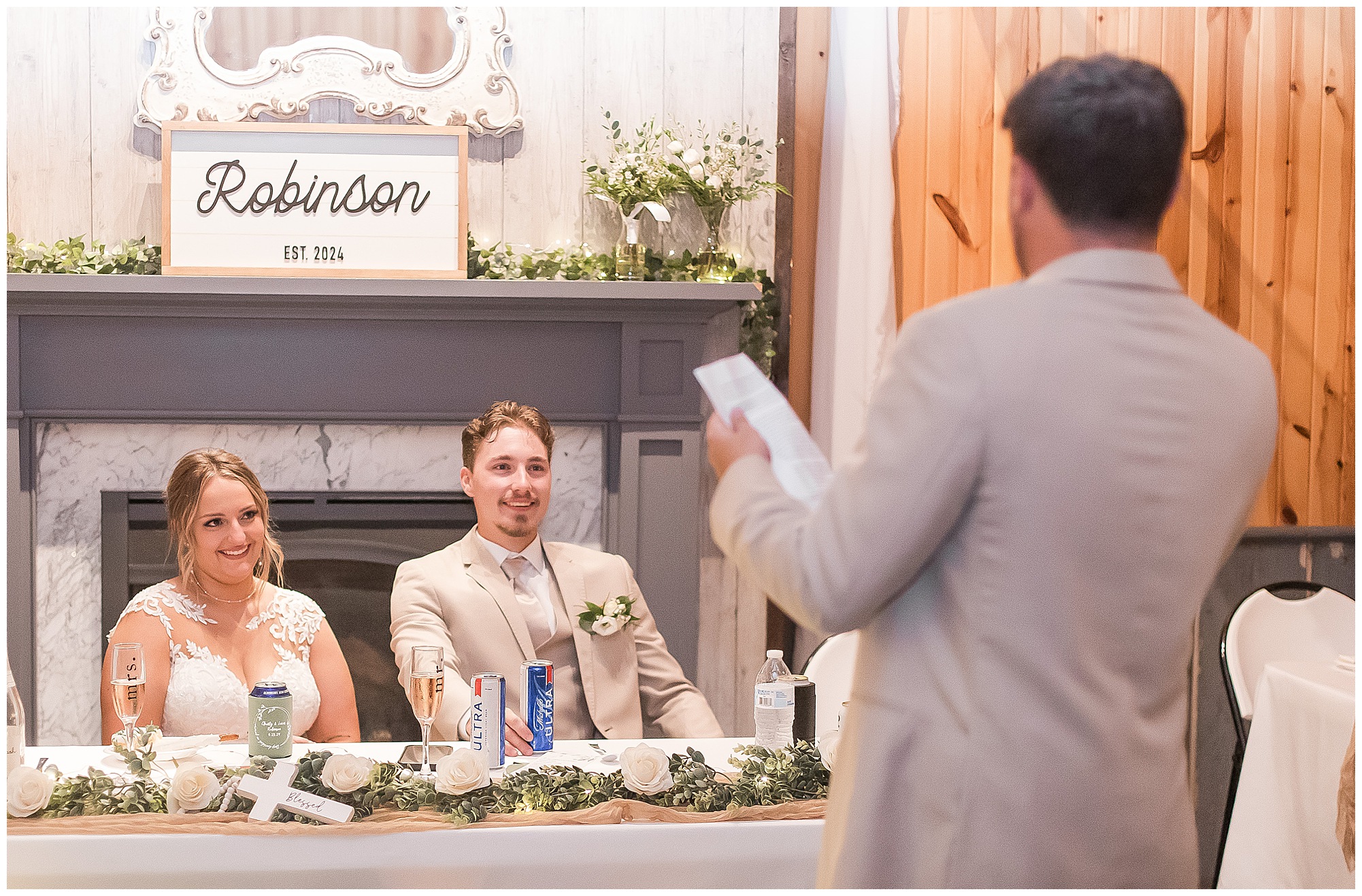 The reception was beginning and it was charming with classy touches of sage, white florals and linens. Candle light, lanterns, greenery, and wooden elements brought the rustic feel of the venue together with the elegant feel of the day. The bride and groom were honored with a few wonderful toasts from the best man, maid of honor, and the father of the bride. Now there was a bet going around, I heard, on how quickly it would take Christy’s dad to start crying once he began his speech. I believe the over/under was 7 seconds. He was happy to report…He won the bet and beat the time! The bride and groom shared their first dance before I snuck them back outside for a few more photos and our fingers all crossed that the sun would pop back out at the end of the day. Spoiler alert…We did not get our wish, even though we were all praying pretty hard for some golden glow from the sun. However, just a few more incredible moments with this lovely couple as husband and wife was enough for me! We went back in for the party to continue into the night! Cheers to Mr. & Mrs. Robinson!