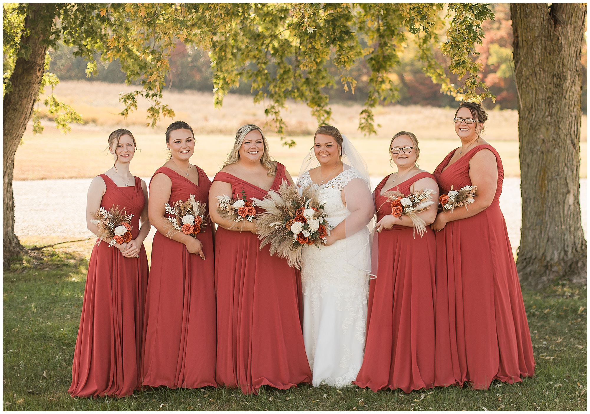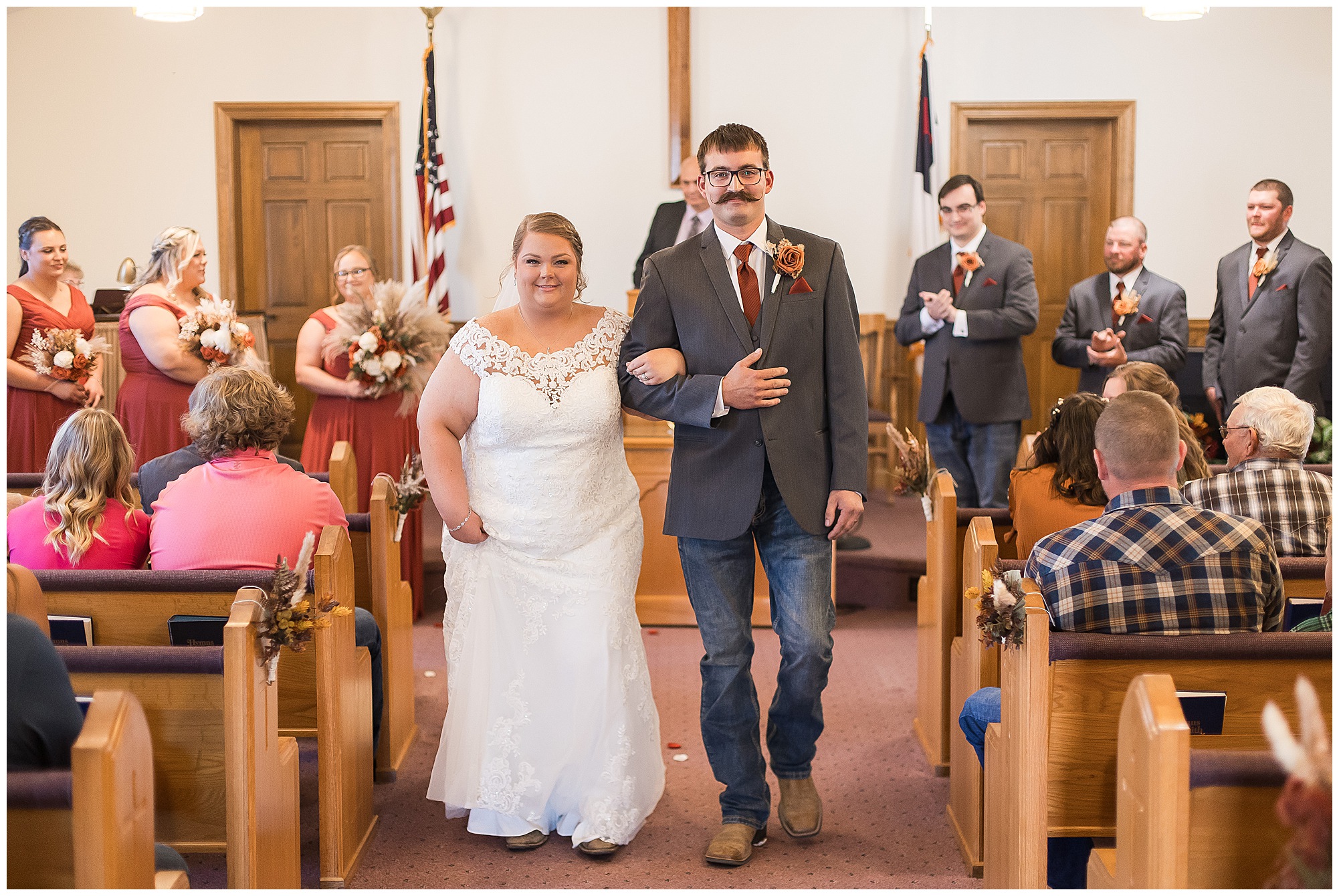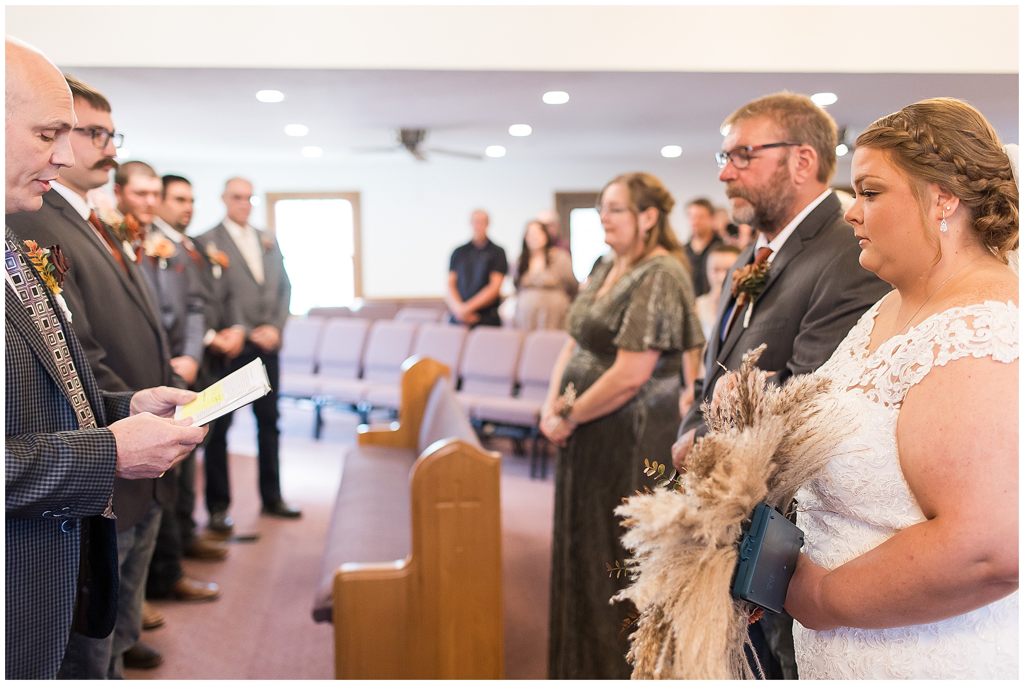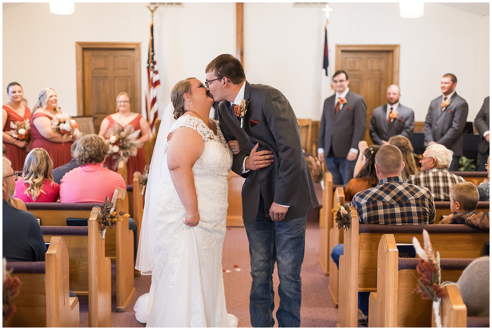 Jacklyn and Collin’s mid-autumn wedding day was filled with dreamy weather, emotional moments, and so much joy for this couple to say, “I Do!” The fall vibes were on full display throughout their nuptials from the rust orange of the bridesmaid’s dresses, pampas grasses and textured florals, and wooden accents sprinkled in during the day. Jacklyn and her ladies were in high spirits in the morning and by the time I arrived were practically finished with all their hair and makeup! They were all on top of it at the salon and were looking fabulous! I had the pleasure of photographing Jacklyn’s sister, Jordan’s wedding a few years ago so it was fun to see some familiar faces. We headed out to the small chapel out in the middle of endless now plowed cornfields. In the church that means so much to Jacklyn and Collin. Collin, who was still at the couple’s home, was getting ready with his family and closest friends. The guys wore grey suit jackets with crisp white buttoned down shirts, orange ties, and dark jeans for a classic but relaxed look. This sweet couple chose not to see one another prior to their ceremony so we did a few photos of them separately with their sides of the bridal crew before the nuptials. The energy and anticipation was high and before we knew it, the time had come to get these two married!