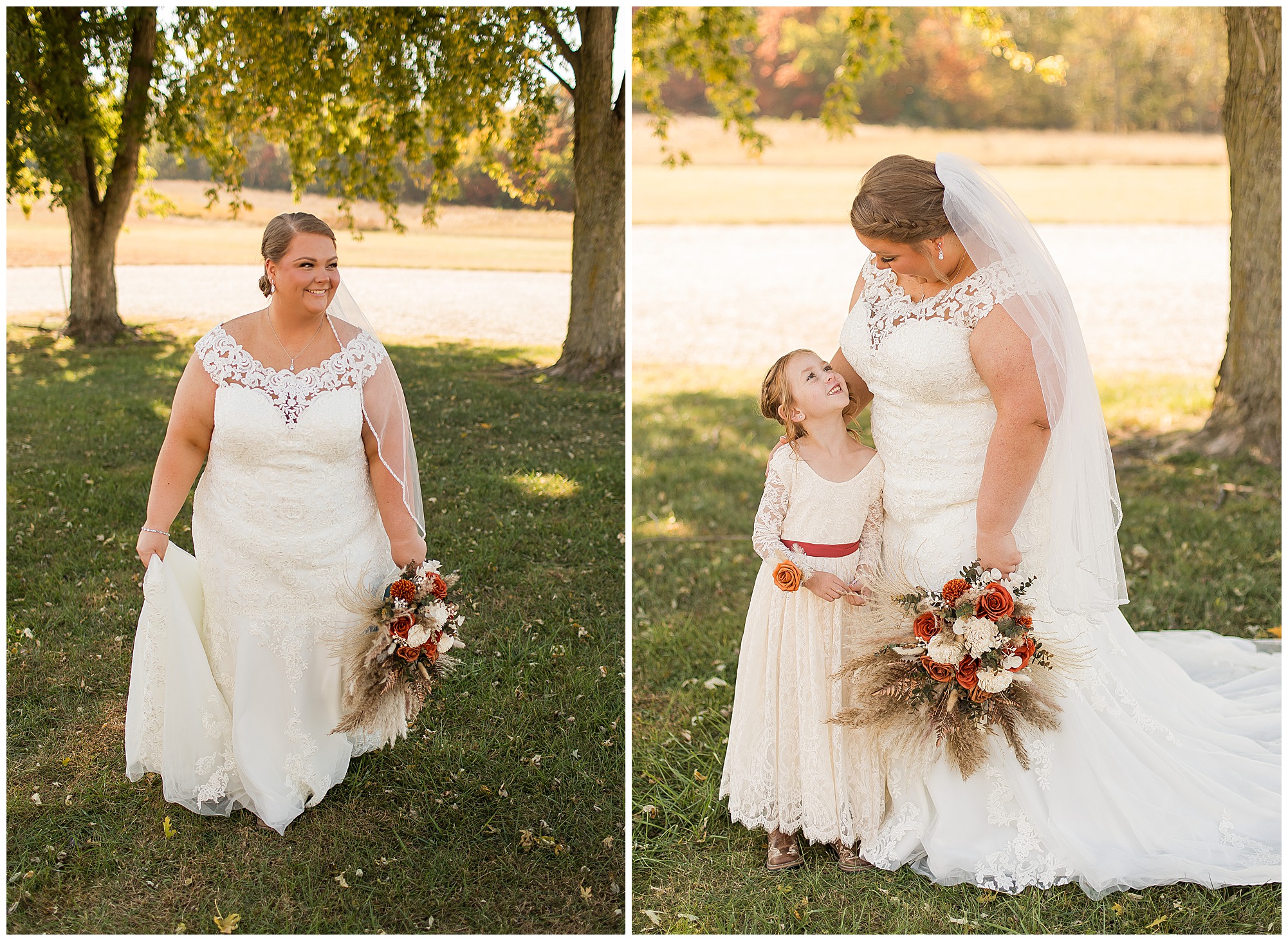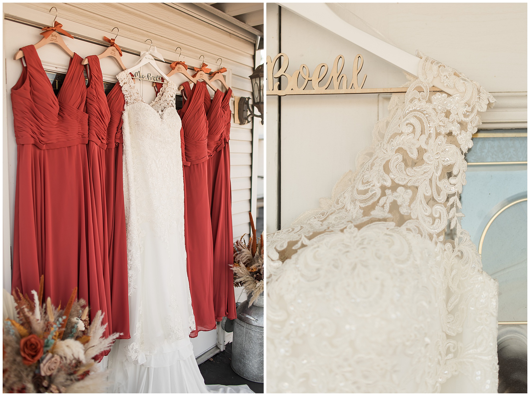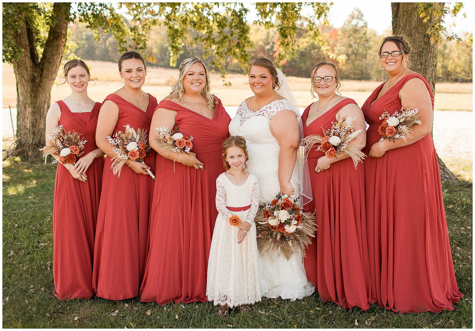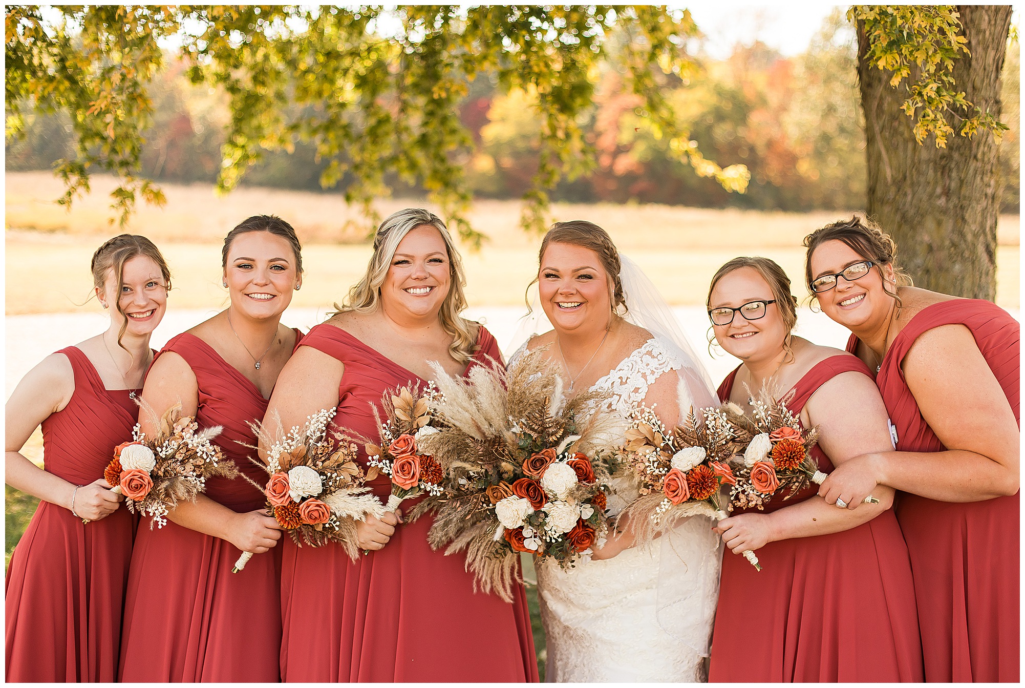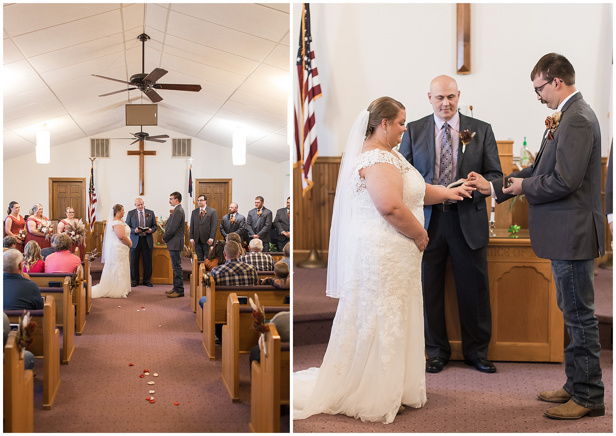 Jacklyn and Collin’s mid-autumn wedding day was filled with dreamy weather, emotional moments, and so much joy for this couple to say, “I Do!” The fall vibes were on full display throughout their nuptials from the rust orange of the bridesmaid’s dresses, pampas grasses and textured florals, and wooden accents sprinkled in during the day. Jacklyn and her ladies were in high spirits in the morning and by the time I arrived were practically finished with all their hair and makeup! They were all on top of it at the salon and were looking fabulous! I had the pleasure of photographing Jacklyn’s sister, Jordan’s wedding a few years ago so it was fun to see some familiar faces. We headed out to the small chapel out in the middle of endless now plowed cornfields. In the church that means so much to Jacklyn and Collin. Collin, who was still at the couple’s home, was getting ready with his family and closest friends. The guys wore grey suit jackets with crisp white buttoned down shirts, orange ties, and dark jeans for a classic but relaxed look. This sweet couple chose not to see one another prior to their ceremony so we did a few photos of them separately with their sides of the bridal crew before the nuptials. The energy and anticipation was high and before we knew it, the time had come to get these two married!