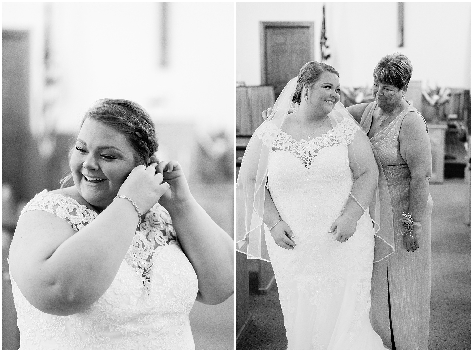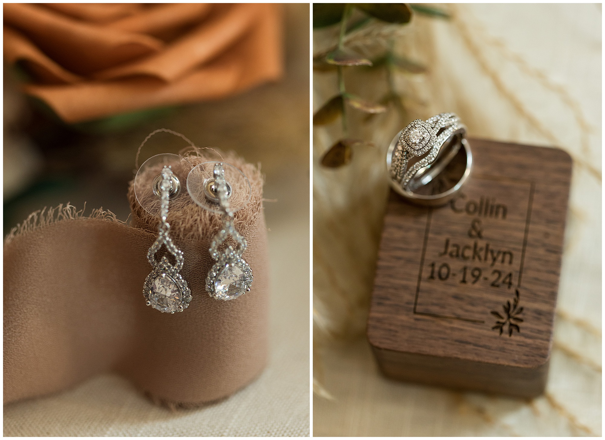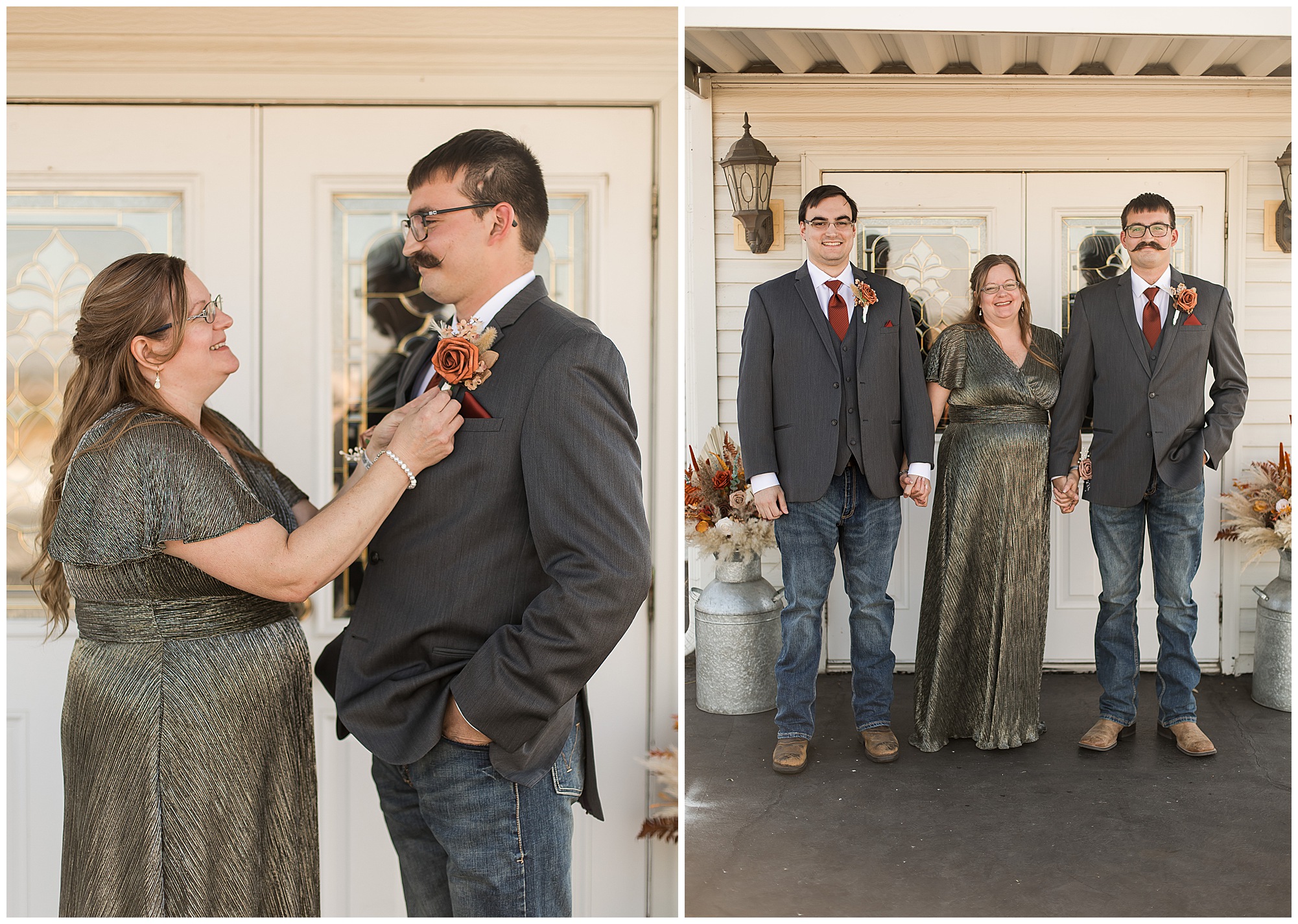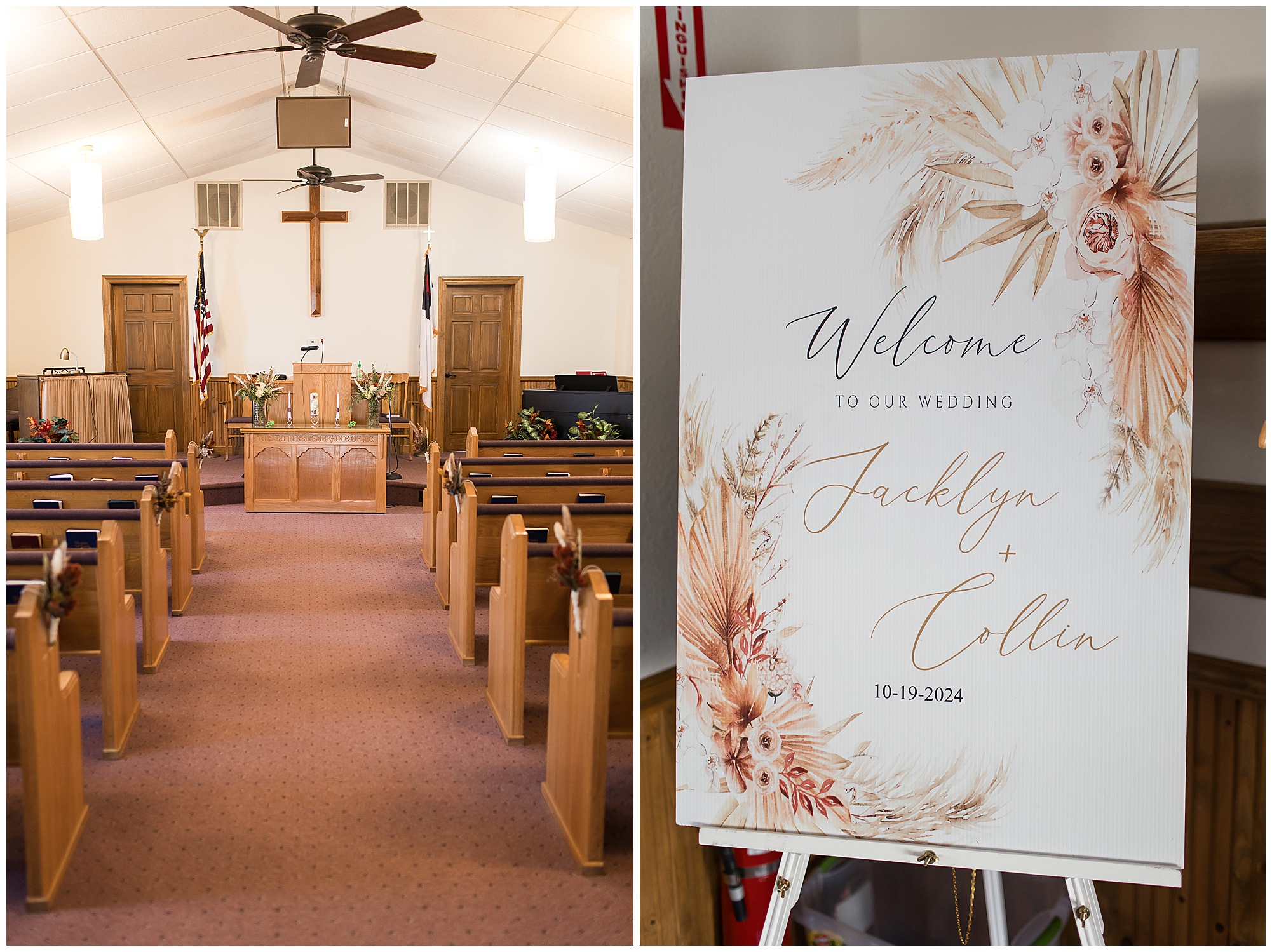 Jacklyn and Collin’s mid-autumn wedding day was filled with dreamy weather, emotional moments, and so much joy for this couple to say, “I Do!” The fall vibes were on full display throughout their nuptials from the rust orange of the bridesmaid’s dresses, pampas grasses and textured florals, and wooden accents sprinkled in during the day. Jacklyn and her ladies were in high spirits in the morning and by the time I arrived were practically finished with all their hair and makeup! They were all on top of it at the salon and were looking fabulous! I had the pleasure of photographing Jacklyn’s sister, Jordan’s wedding a few years ago so it was fun to see some familiar faces. We headed out to the small chapel out in the middle of endless now plowed cornfields. In the church that means so much to Jacklyn and Collin. Collin, who was still at the couple’s home, was getting ready with his family and closest friends. The guys wore grey suit jackets with crisp white buttoned down shirts, orange ties, and dark jeans for a classic but relaxed look. This sweet couple chose not to see one another prior to their ceremony so we did a few photos of them separately with their sides of the bridal crew before the nuptials. The energy and anticipation was high and before we knew it, the time had come to get these two married!