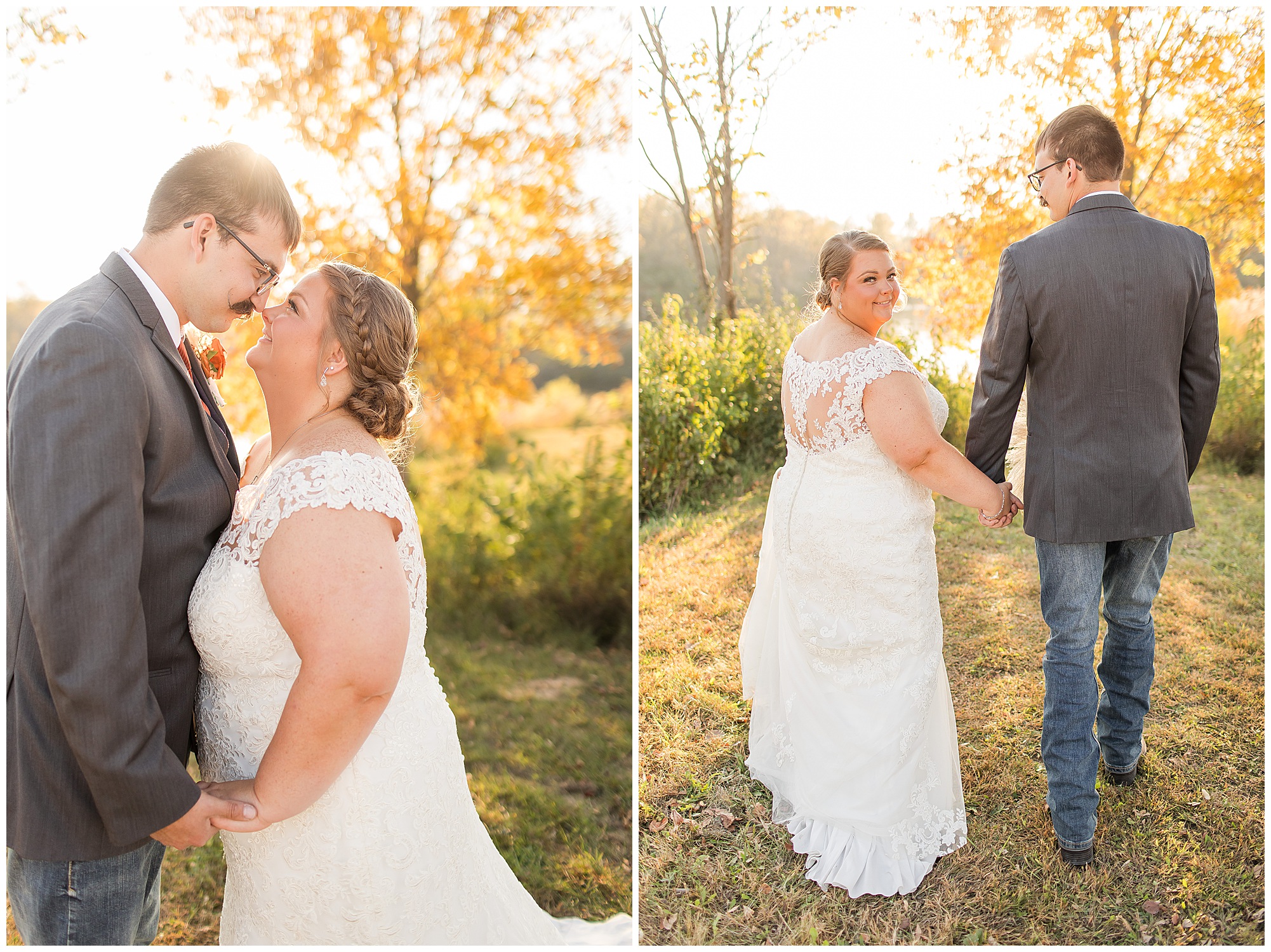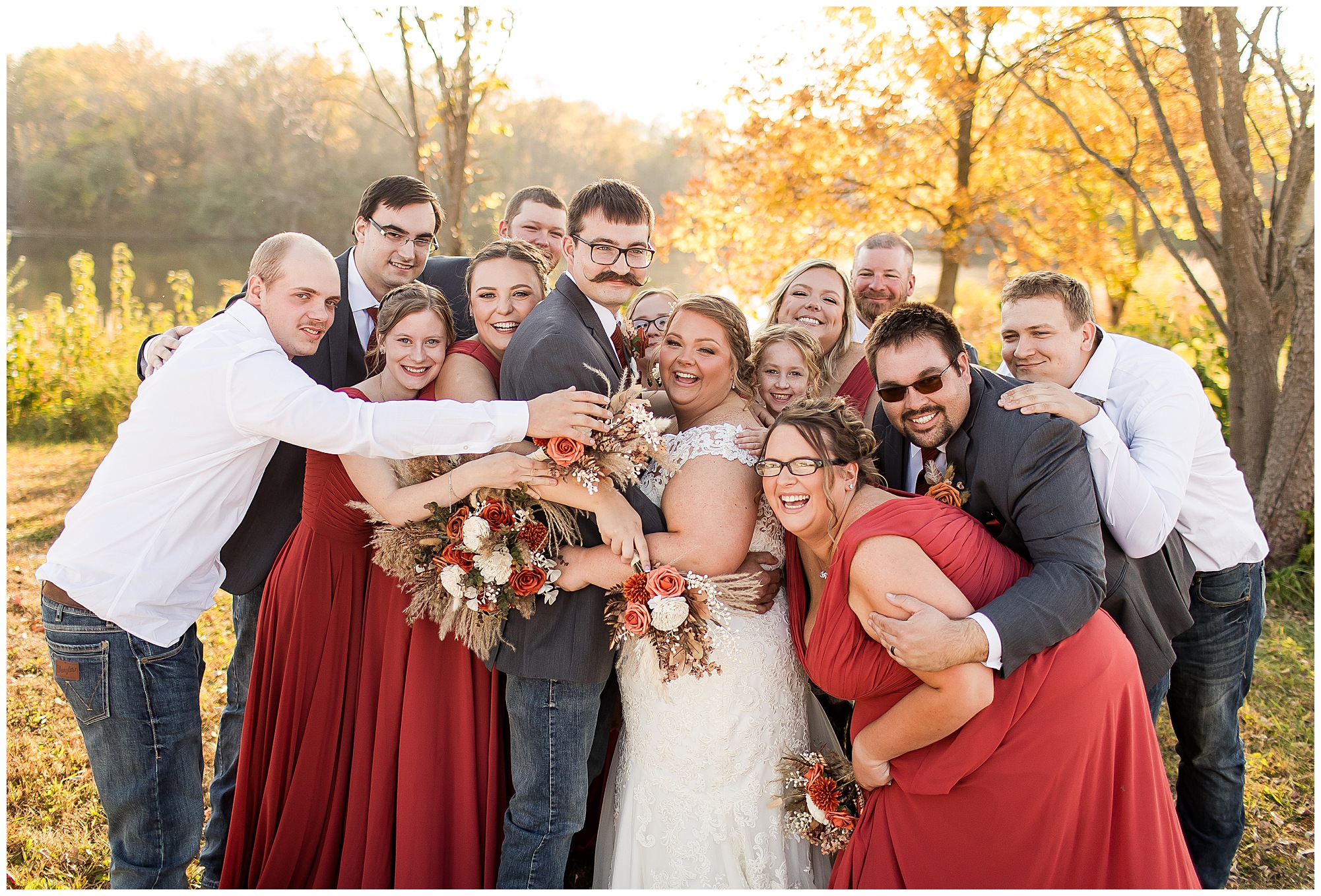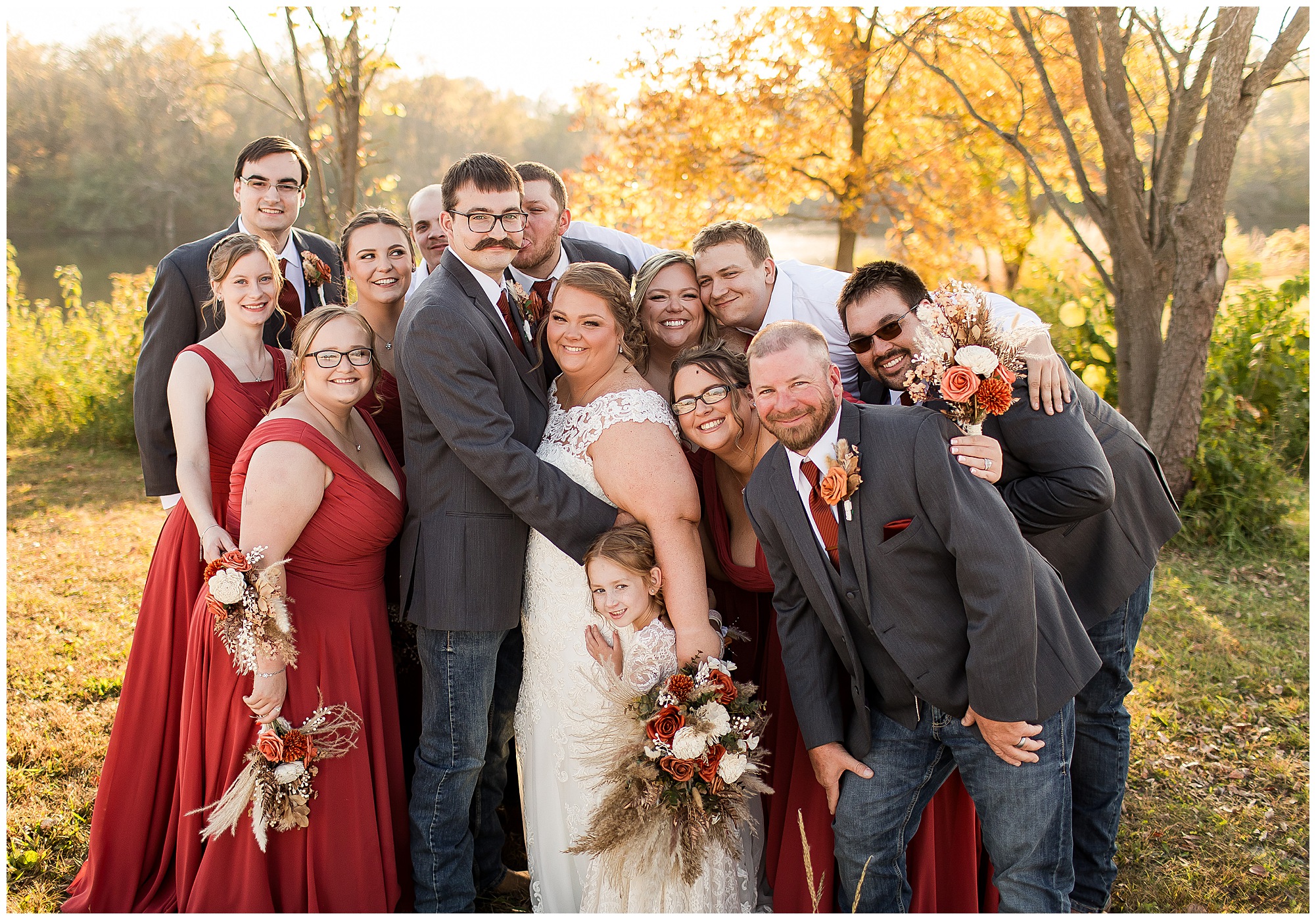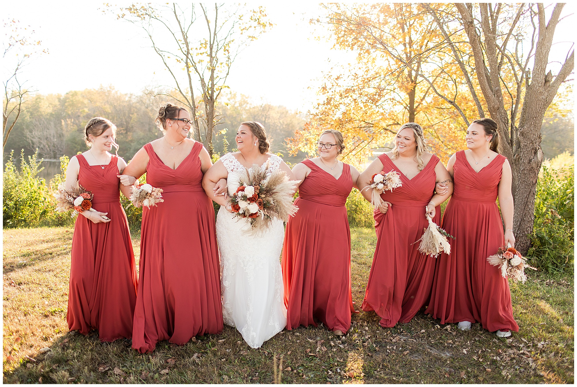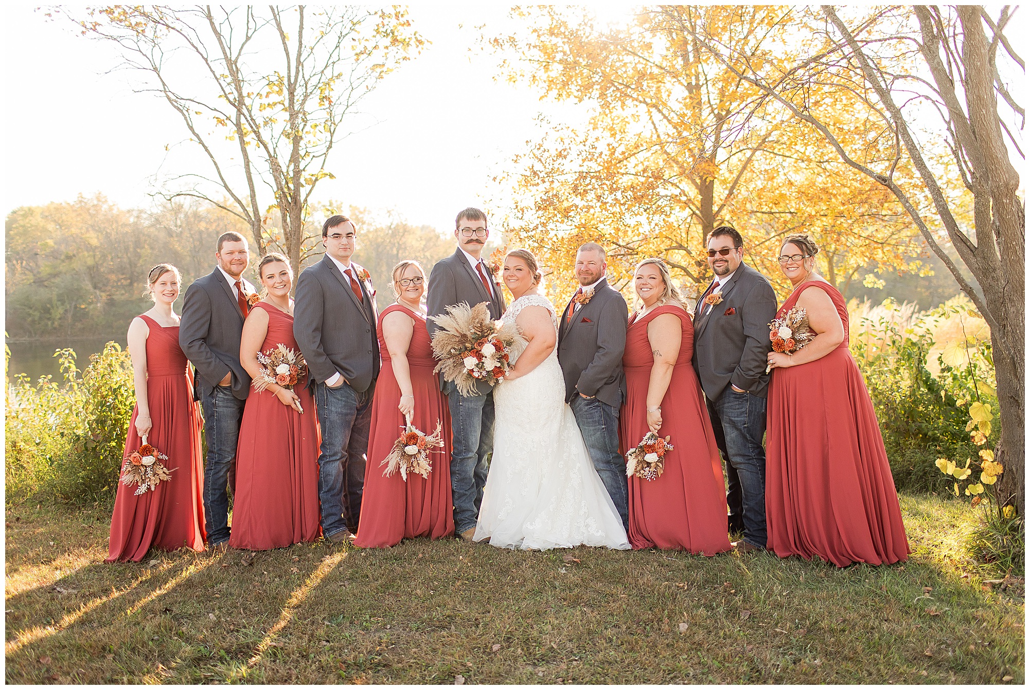 The small little white chapel was packed with loved ones as Jacklyn and her father made their way down the aisle towards an awaiting Collin. He tried holding back tears, but seeing his bride brought out his emotions, which was wonderful to have a front row seat to capture. Jacklyn and Collin are both very shy and quiet so a short and sweet ceremony was exactly what they were looking for and what they got! They exchanged their rings, spoke their vows with intention, and sealed it with a kiss! They were then introduced as Mr. & Mrs. Boehl! Following their family photos at the church, the bridal party loaded up and we headed out to the beautiful Jim Edgar State Park. We found a gorgeous spot with a colorful autumn tree with lovely light coming through for this energetic bridal party. We laughed so much during bridal party photos with this group and had an absolute blast! Then it was time for the newlywed’s close up. Collin again, is a man of few words. But, he can get Jacklyn giggling and looks at her with all the love in the world. We did a ton of movement with these two and they totally nailed it all! When we arrived back at the reception hall at the Morgan County Fairgrounds, the sunset was at its peak time. So before The Boehl’s were announced into their party, we took a few more moments to capture some sunset photos. Jacklyn and Collin twirled, dipped, and simply enjoyed a few seconds as husband and wife before they joined their guests to celebrate their big accomplishment of tying the knot!