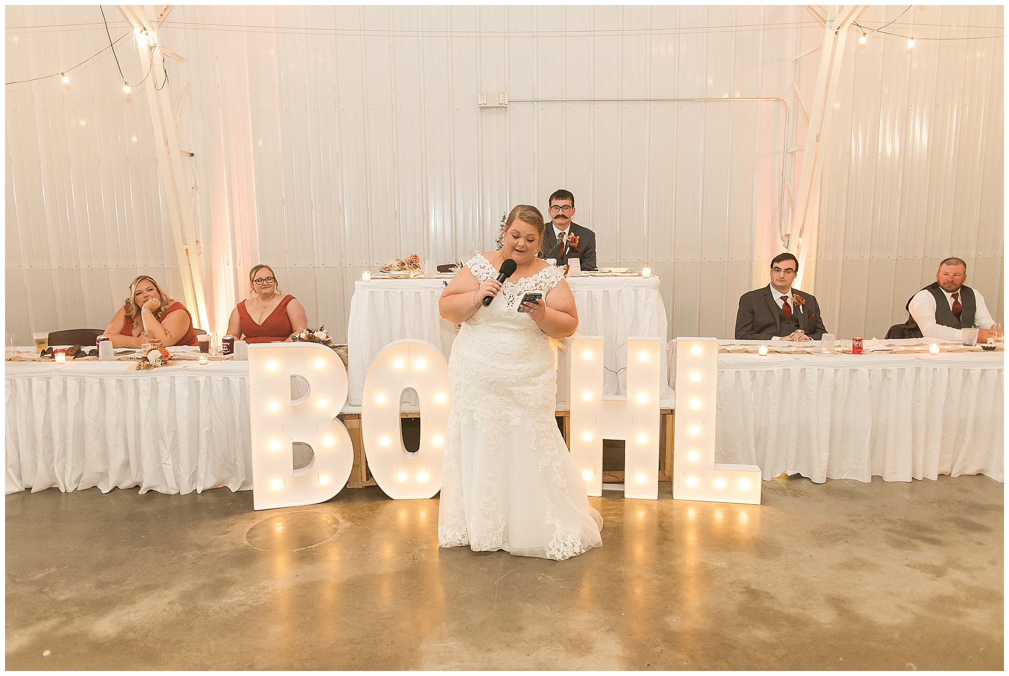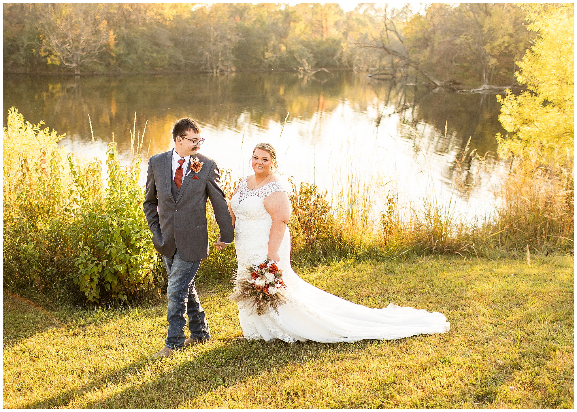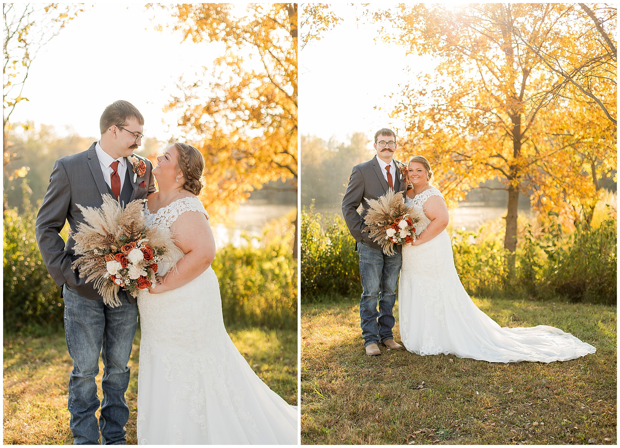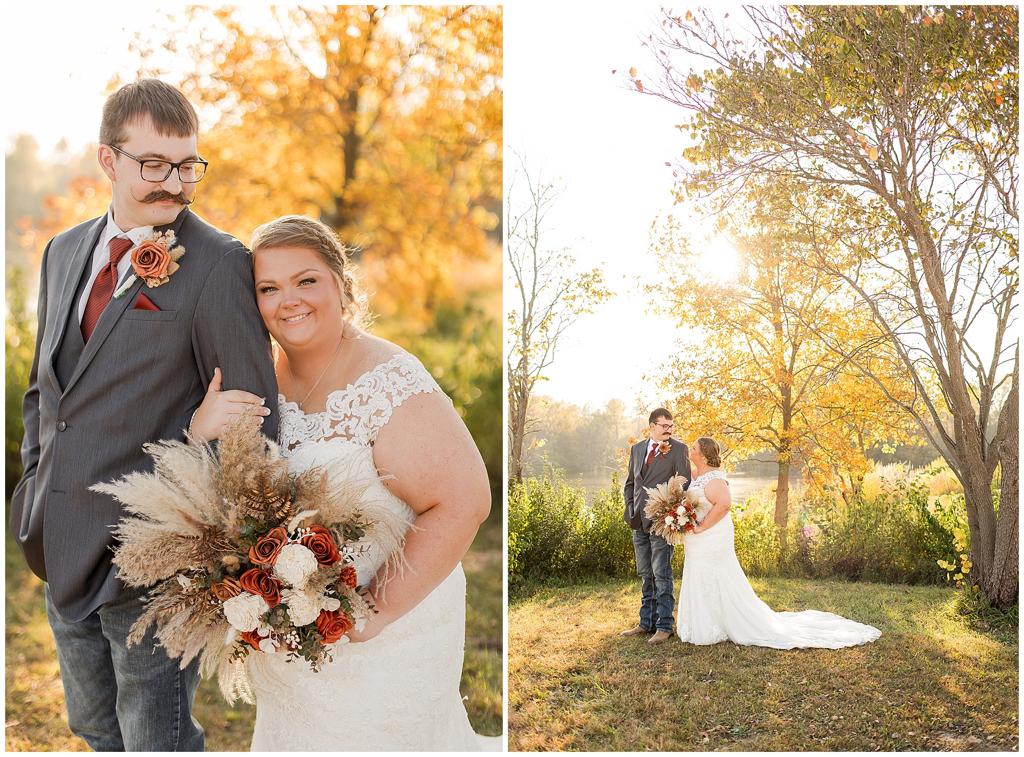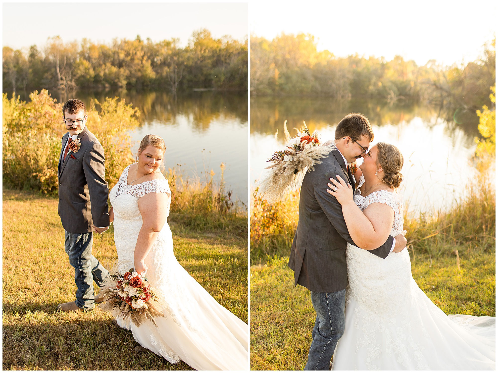 The small little white chapel was packed with loved ones as Jacklyn and her father made their way down the aisle towards an awaiting Collin. He tried holding back tears, but seeing his bride brought out his emotions, which was wonderful to have a front row seat to capture. Jacklyn and Collin are both very shy and quiet so a short and sweet ceremony was exactly what they were looking for and what they got! They exchanged their rings, spoke their vows with intention, and sealed it with a kiss! They were then introduced as Mr. & Mrs. Boehl! Following their family photos at the church, the bridal party loaded up and we headed out to the beautiful Jim Edgar State Park. We found a gorgeous spot with a colorful autumn tree with lovely light coming through for this energetic bridal party. We laughed so much during bridal party photos with this group and had an absolute blast! Then it was time for the newlywed’s close up. Collin again, is a man of few words. But, he can get Jacklyn giggling and looks at her with all the love in the world. We did a ton of movement with these two and they totally nailed it all! When we arrived back at the reception hall at the Morgan County Fairgrounds, the sunset was at its peak time. So before The Boehl’s were announced into their party, we took a few more moments to capture some sunset photos. Jacklyn and Collin twirled, dipped, and simply enjoyed a few seconds as husband and wife before they joined their guests to celebrate their big accomplishment of tying the knot!