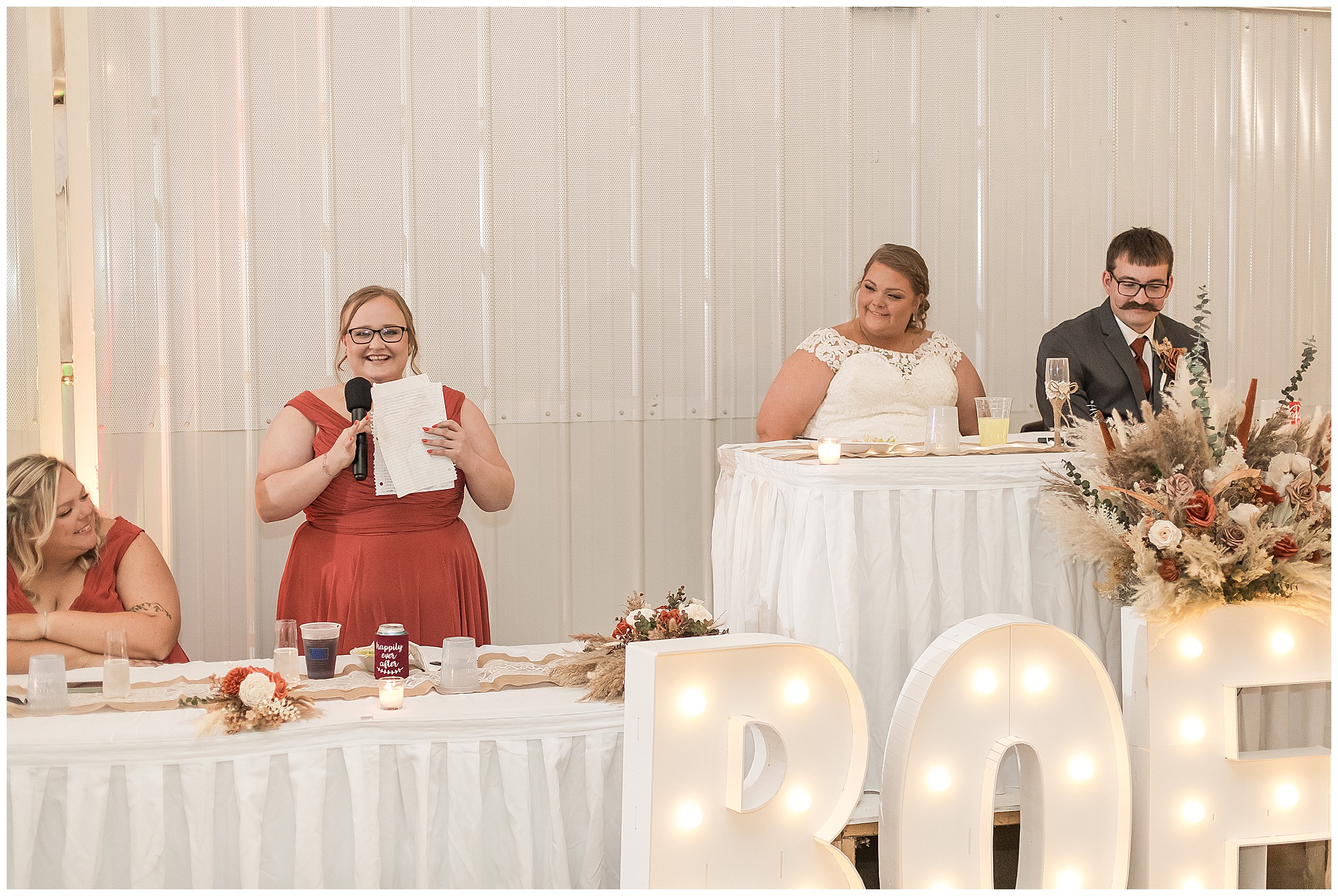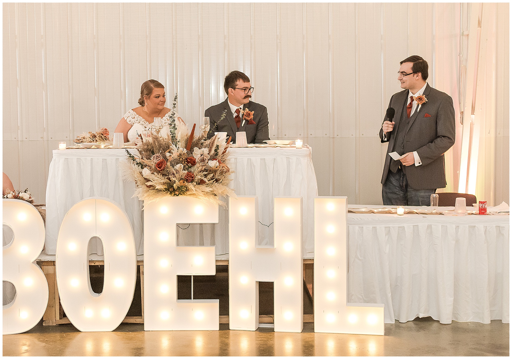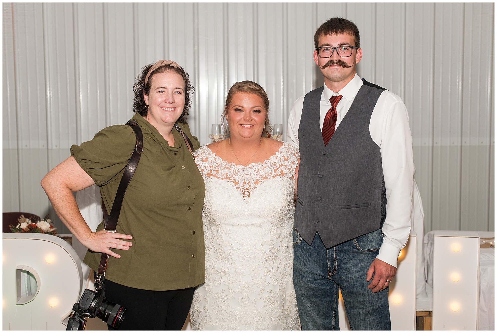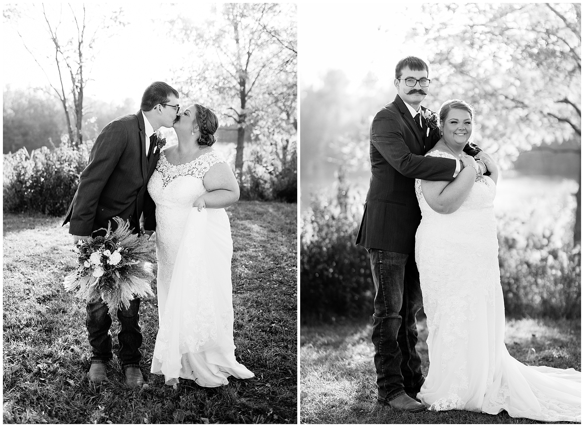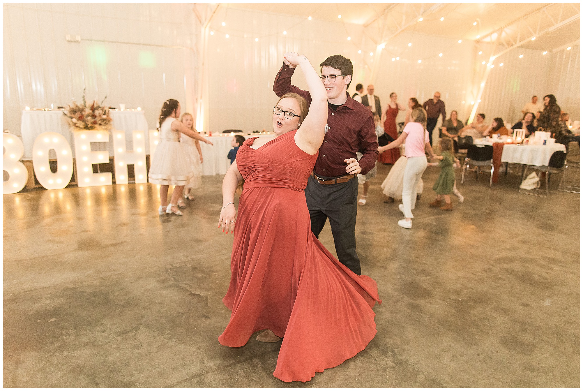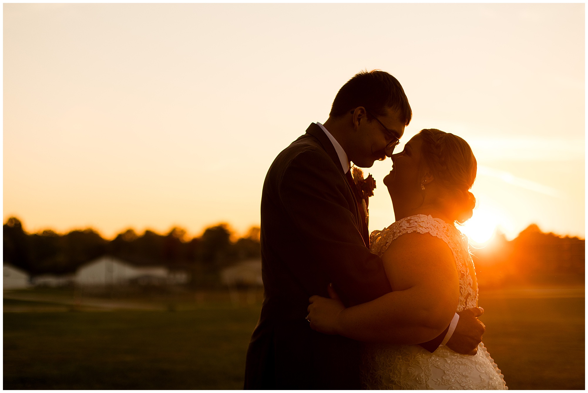 The small little white chapel was packed with loved ones as Jacklyn and her father made their way down the aisle towards an awaiting Collin. He tried holding back tears, but seeing his bride brought out his emotions, which was wonderful to have a front row seat to capture. Jacklyn and Collin are both very shy and quiet so a short and sweet ceremony was exactly what they were looking for and what they got! They exchanged their rings, spoke their vows with intention, and sealed it with a kiss! They were then introduced as Mr. & Mrs. Boehl! Following their family photos at the church, the bridal party loaded up and we headed out to the beautiful Jim Edgar State Park. We found a gorgeous spot with a colorful autumn tree with lovely light coming through for this energetic bridal party. We laughed so much during bridal party photos with this group and had an absolute blast! Then it was time for the newlywed’s close up. Collin again, is a man of few words. But, he can get Jacklyn giggling and looks at her with all the love in the world. We did a ton of movement with these two and they totally nailed it all! When we arrived back at the reception hall at the Morgan County Fairgrounds, the sunset was at its peak time. So before The Boehl’s were announced into their party, we took a few more moments to capture some sunset photos. Jacklyn and Collin twirled, dipped, and simply enjoyed a few seconds as husband and wife before they joined their guests to celebrate their big accomplishment of tying the knot!