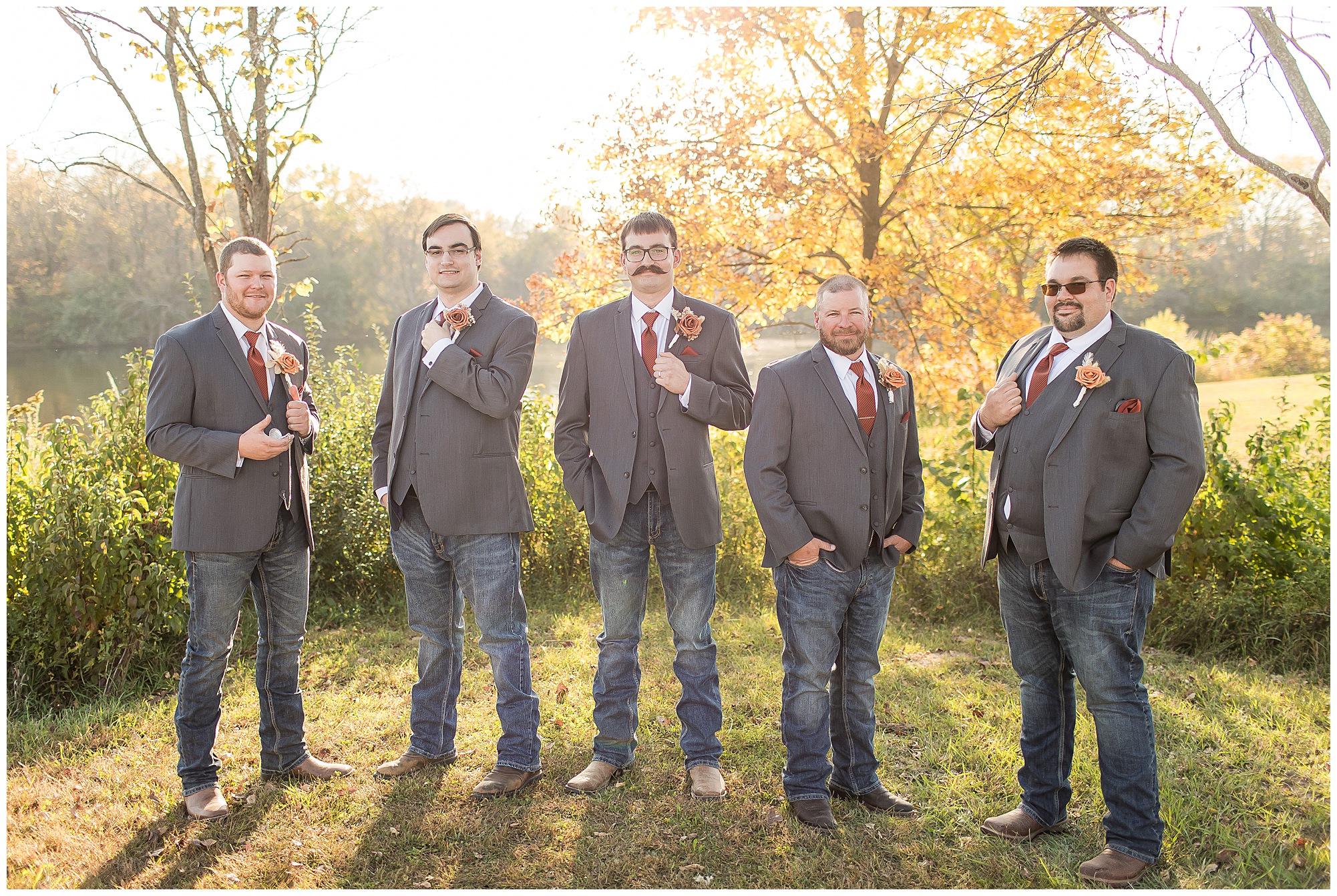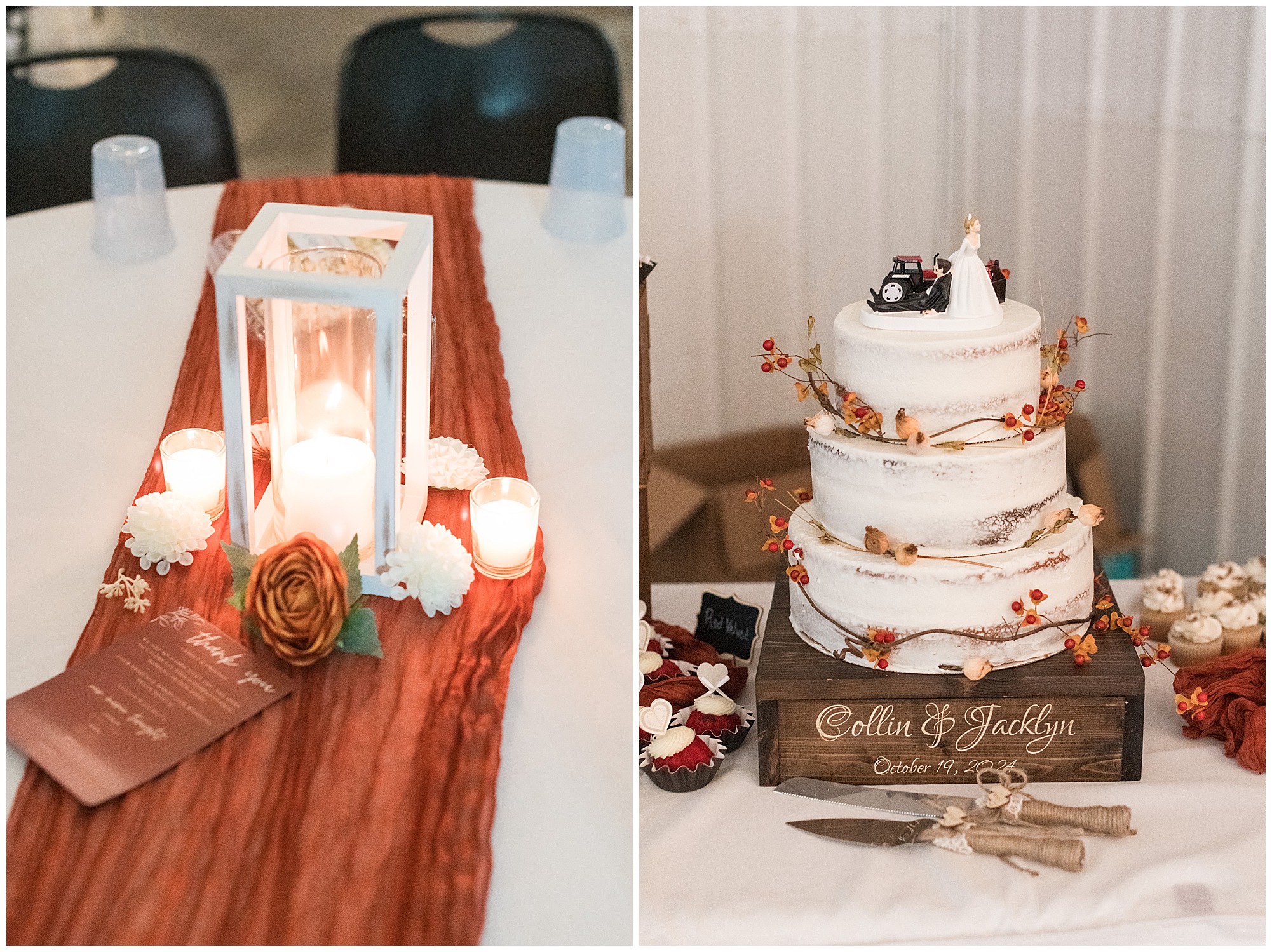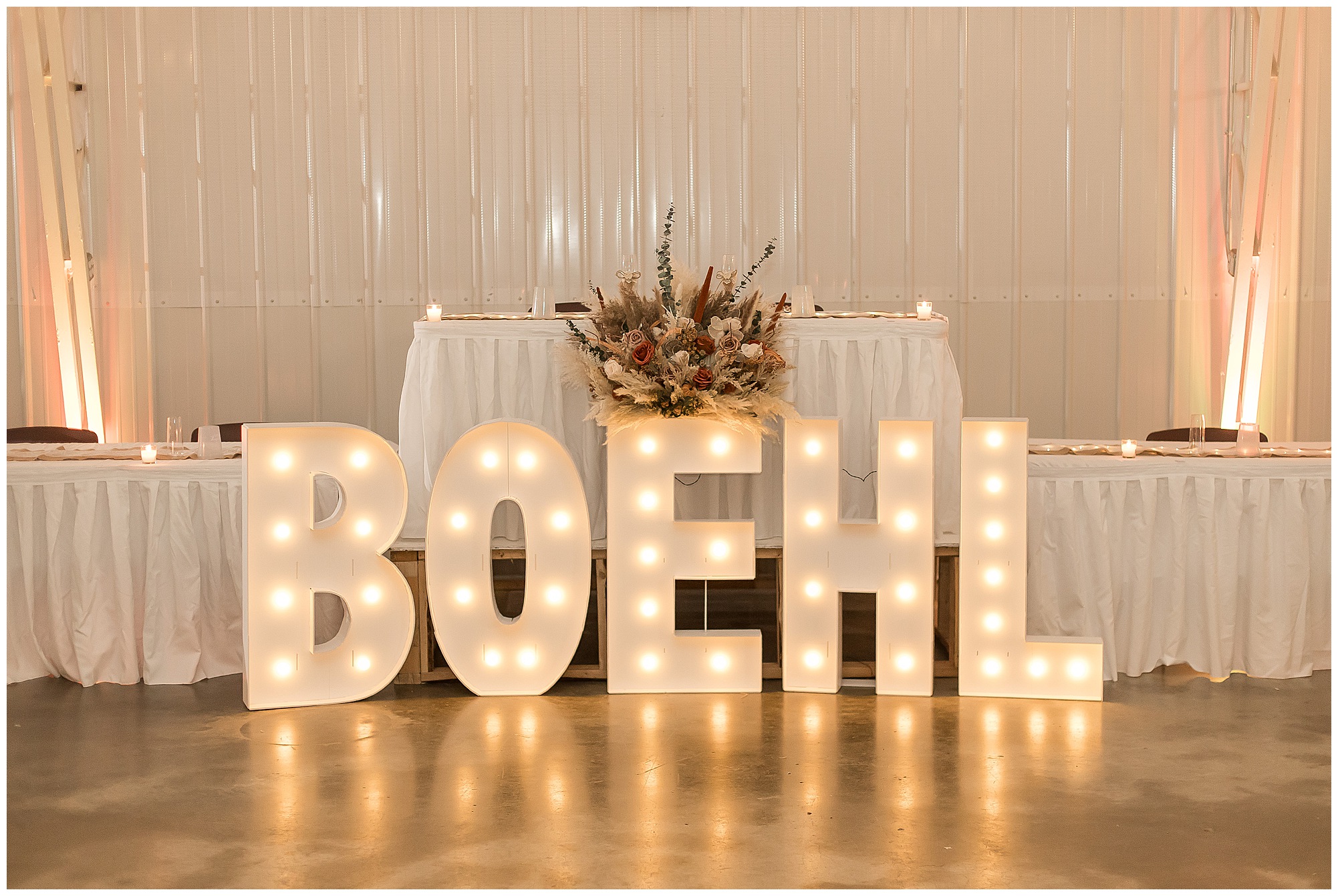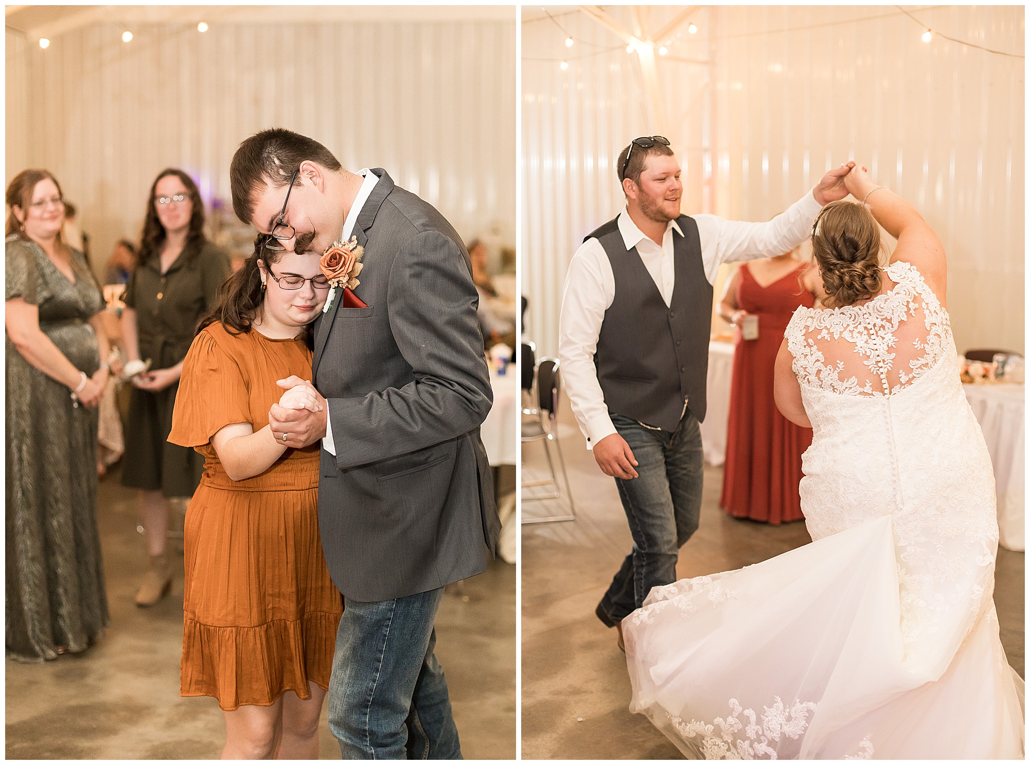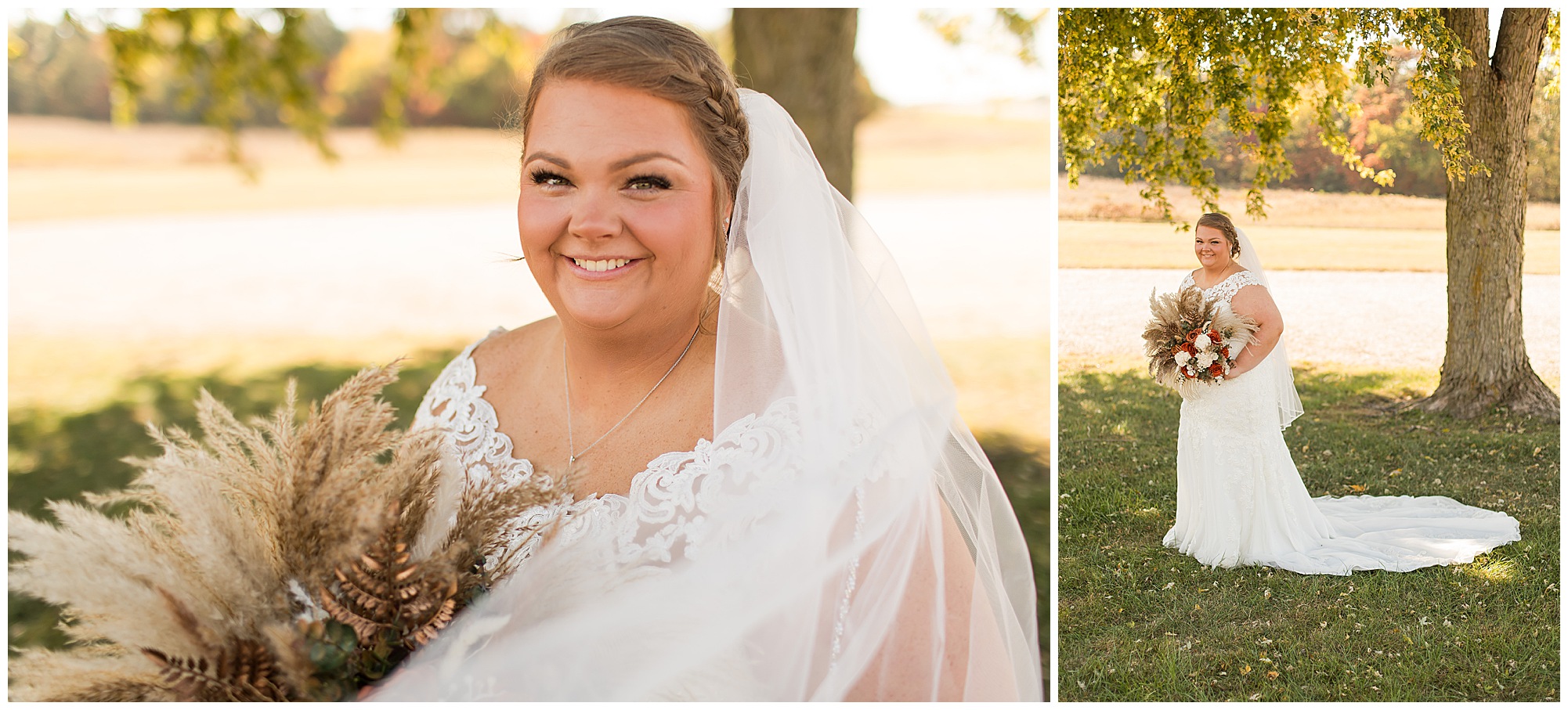 The small little white chapel was packed with loved ones as Jacklyn and her father made their way down the aisle towards an awaiting Collin. He tried holding back tears, but seeing his bride brought out his emotions, which was wonderful to have a front row seat to capture. Jacklyn and Collin are both very shy and quiet so a short and sweet ceremony was exactly what they were looking for and what they got! They exchanged their rings, spoke their vows with intention, and sealed it with a kiss! They were then introduced as Mr. & Mrs. Boehl! Following their family photos at the church, the bridal party loaded up and we headed out to the beautiful Jim Edgar State Park. We found a gorgeous spot with a colorful autumn tree with lovely light coming through for this energetic bridal party. We laughed so much during bridal party photos with this group and had an absolute blast! Then it was time for the newlywed’s close up. Collin again, is a man of few words. But, he can get Jacklyn giggling and looks at her with all the love in the world. We did a ton of movement with these two and they totally nailed it all! When we arrived back at the reception hall at the Morgan County Fairgrounds, the sunset was at its peak time. So before The Boehl’s were announced into their party, we took a few more moments to capture some sunset photos. Jacklyn and Collin twirled, dipped, and simply enjoyed a few seconds as husband and wife before they joined their guests to celebrate their big accomplishment of tying the knot!