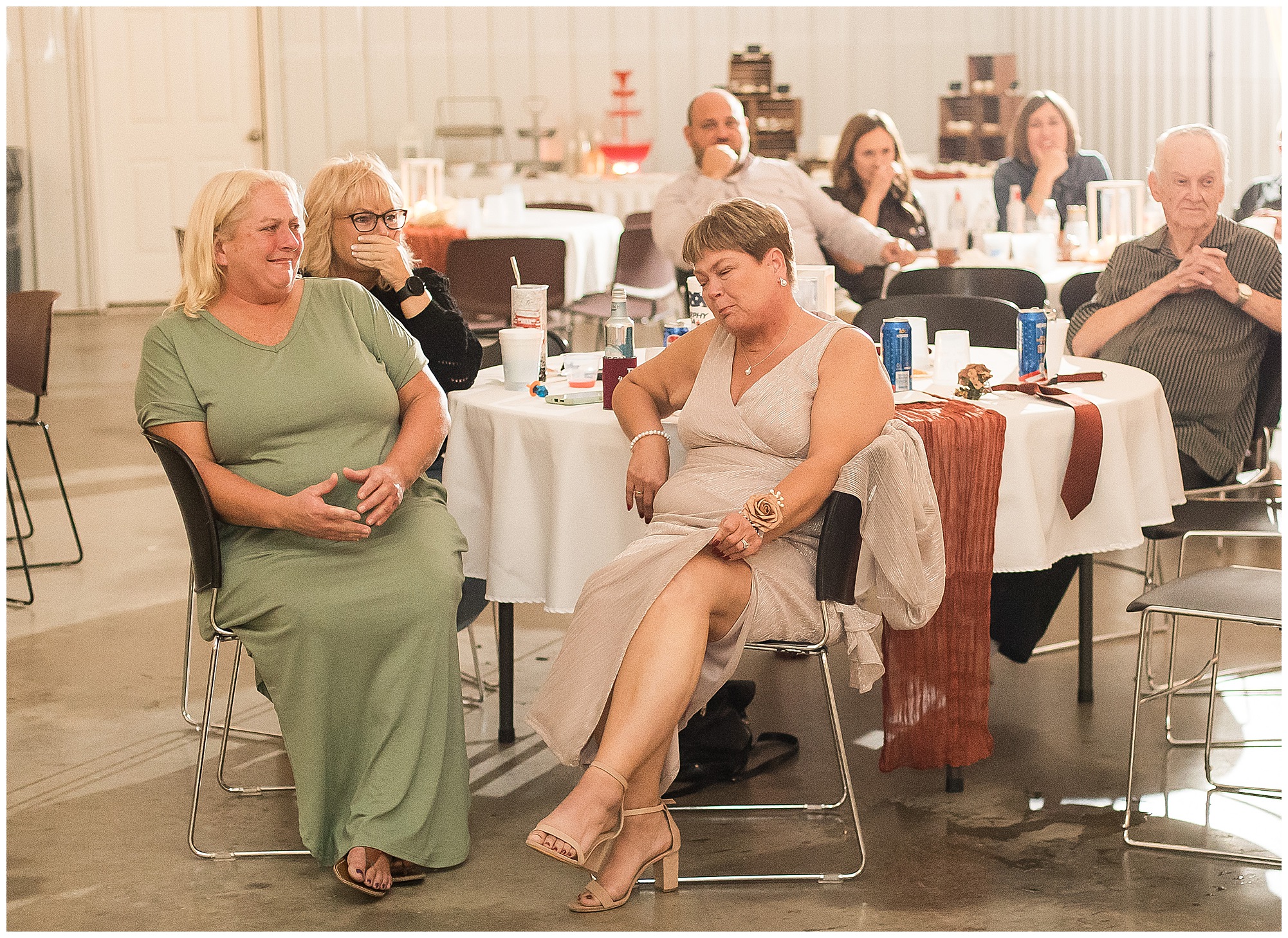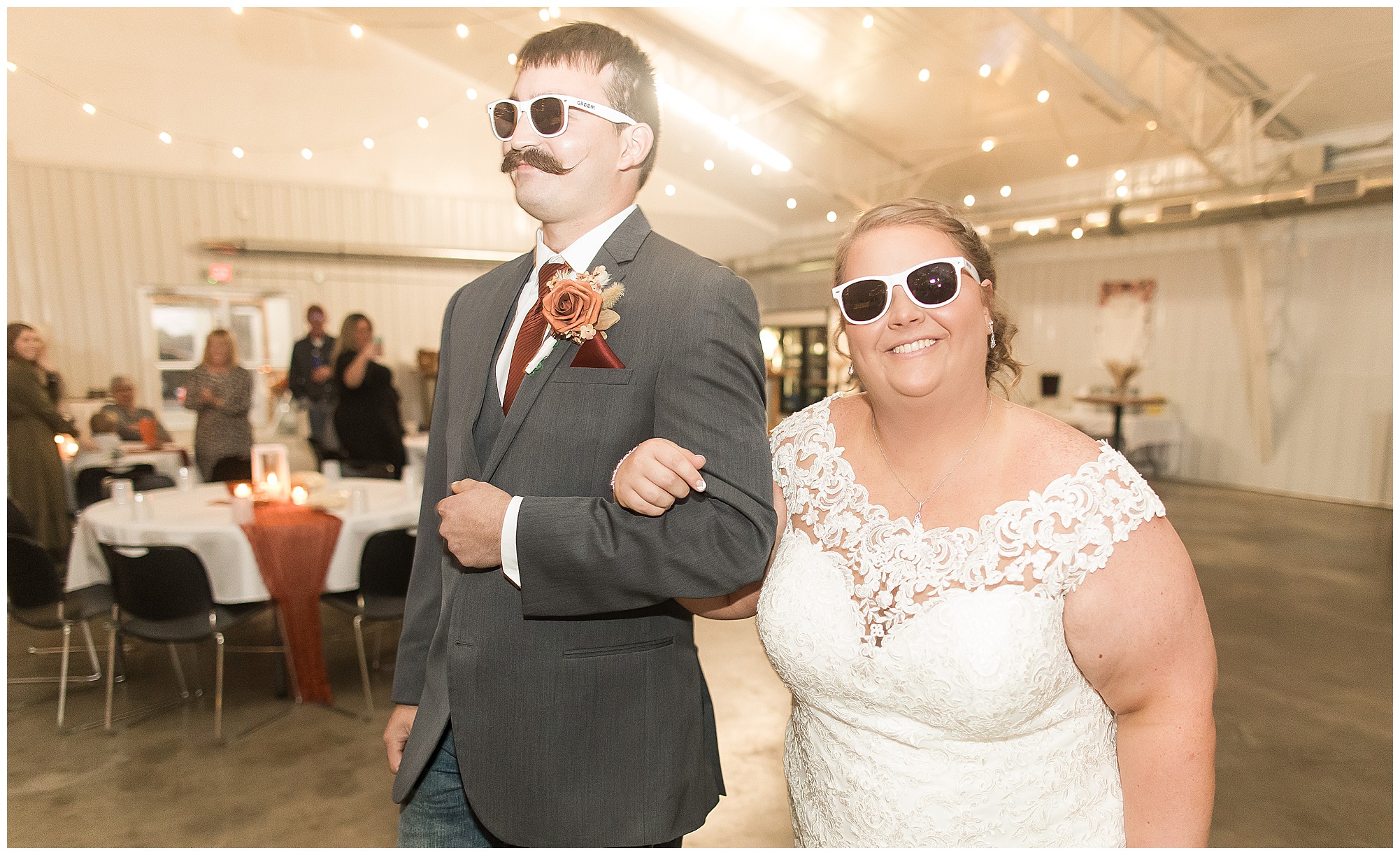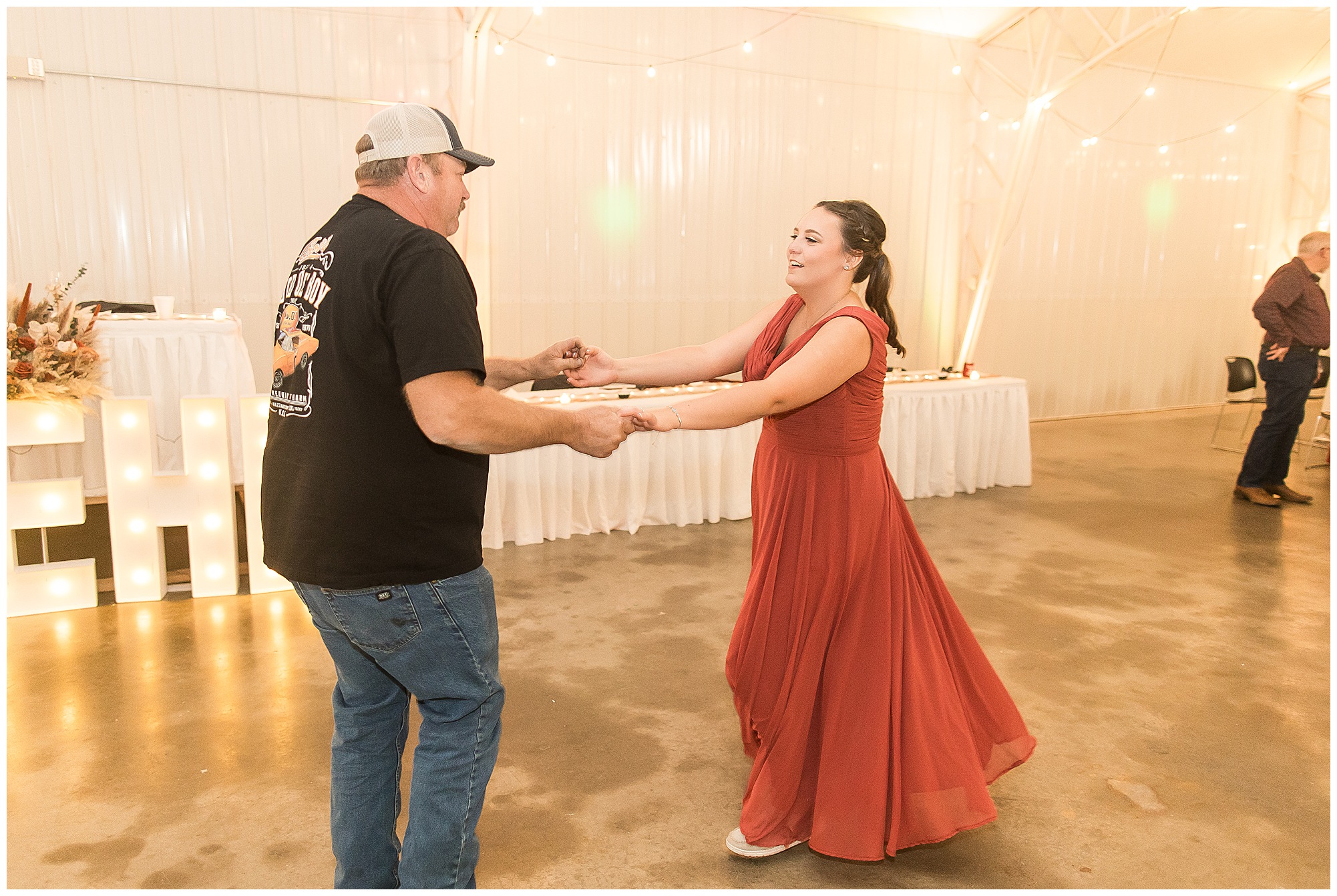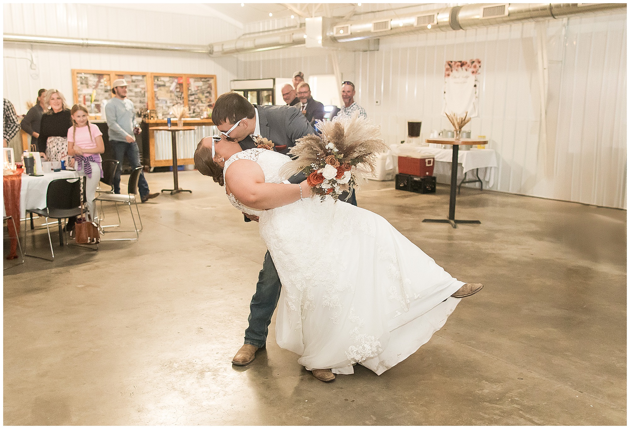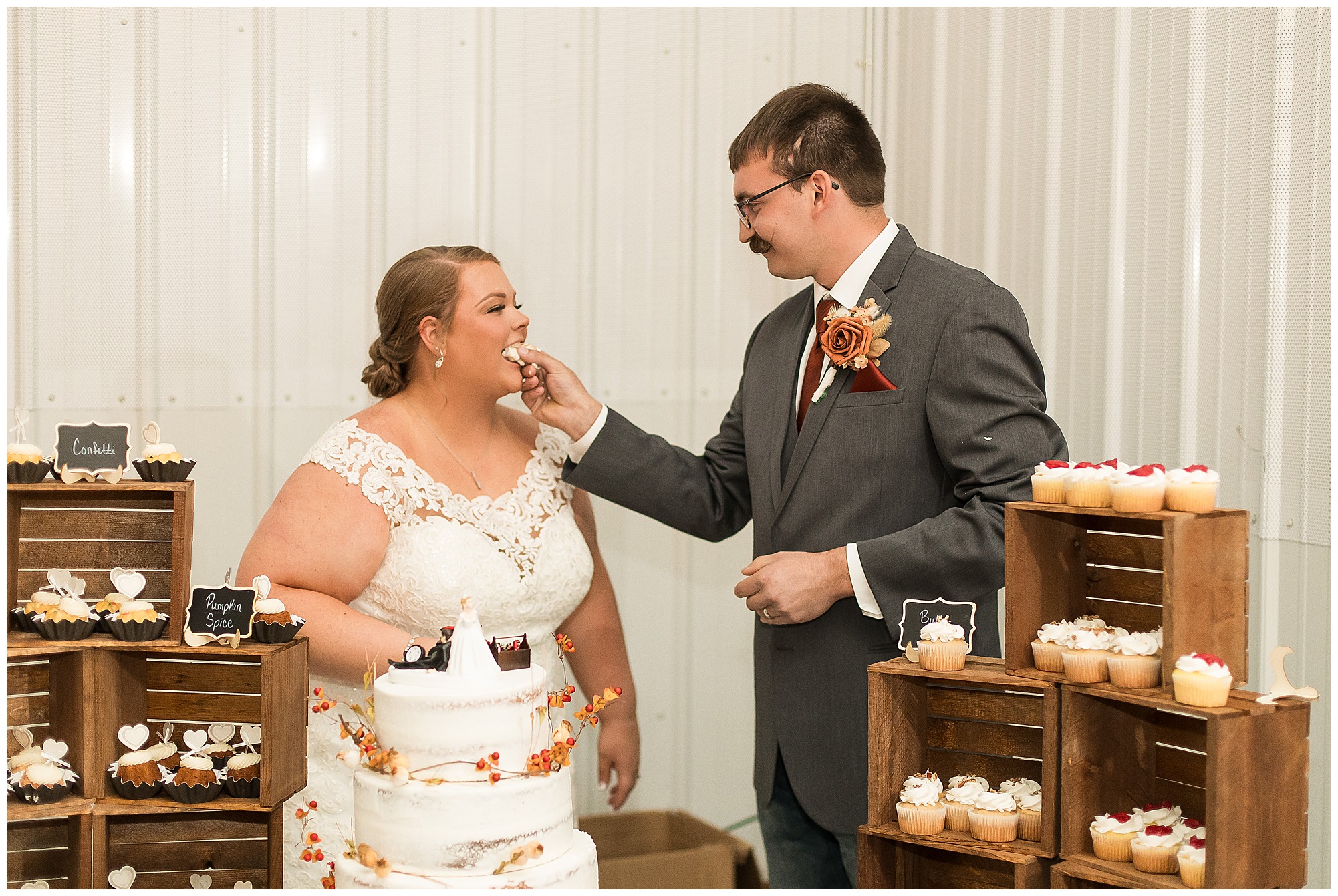 The small little white chapel was packed with loved ones as Jacklyn and her father made their way down the aisle towards an awaiting Collin. He tried holding back tears, but seeing his bride brought out his emotions, which was wonderful to have a front row seat to capture. Jacklyn and Collin are both very shy and quiet so a short and sweet ceremony was exactly what they were looking for and what they got! They exchanged their rings, spoke their vows with intention, and sealed it with a kiss! They were then introduced as Mr. & Mrs. Boehl! Following their family photos at the church, the bridal party loaded up and we headed out to the beautiful Jim Edgar State Park. We found a gorgeous spot with a colorful autumn tree with lovely light coming through for this energetic bridal party. We laughed so much during bridal party photos with this group and had an absolute blast! Then it was time for the newlywed’s close up. Collin again, is a man of few words. But, he can get Jacklyn giggling and looks at her with all the love in the world. We did a ton of movement with these two and they totally nailed it all! When we arrived back at the reception hall at the Morgan County Fairgrounds, the sunset was at its peak time. So before The Boehl’s were announced into their party, we took a few more moments to capture some sunset photos. Jacklyn and Collin twirled, dipped, and simply enjoyed a few seconds as husband and wife before they joined their guests to celebrate their big accomplishment of tying the knot!