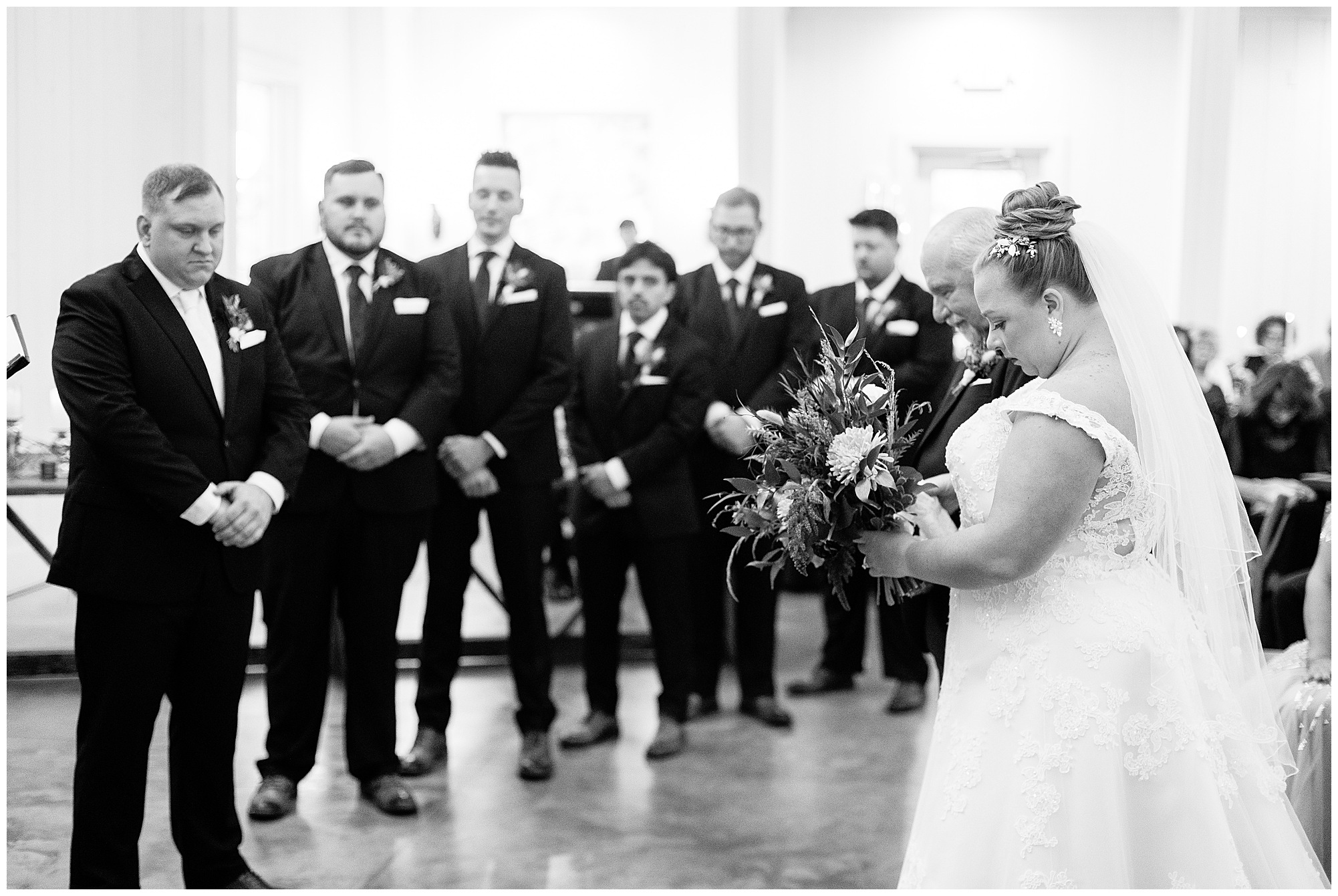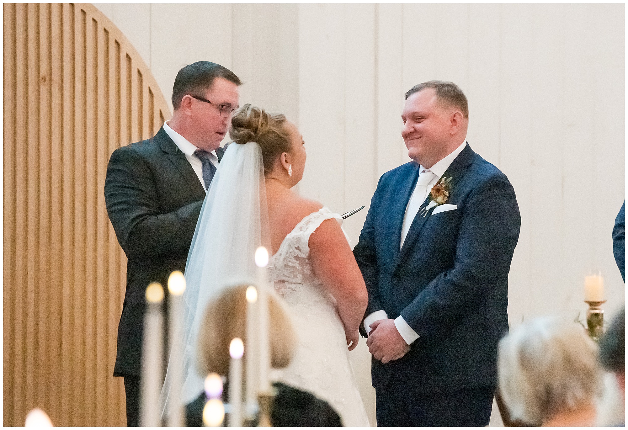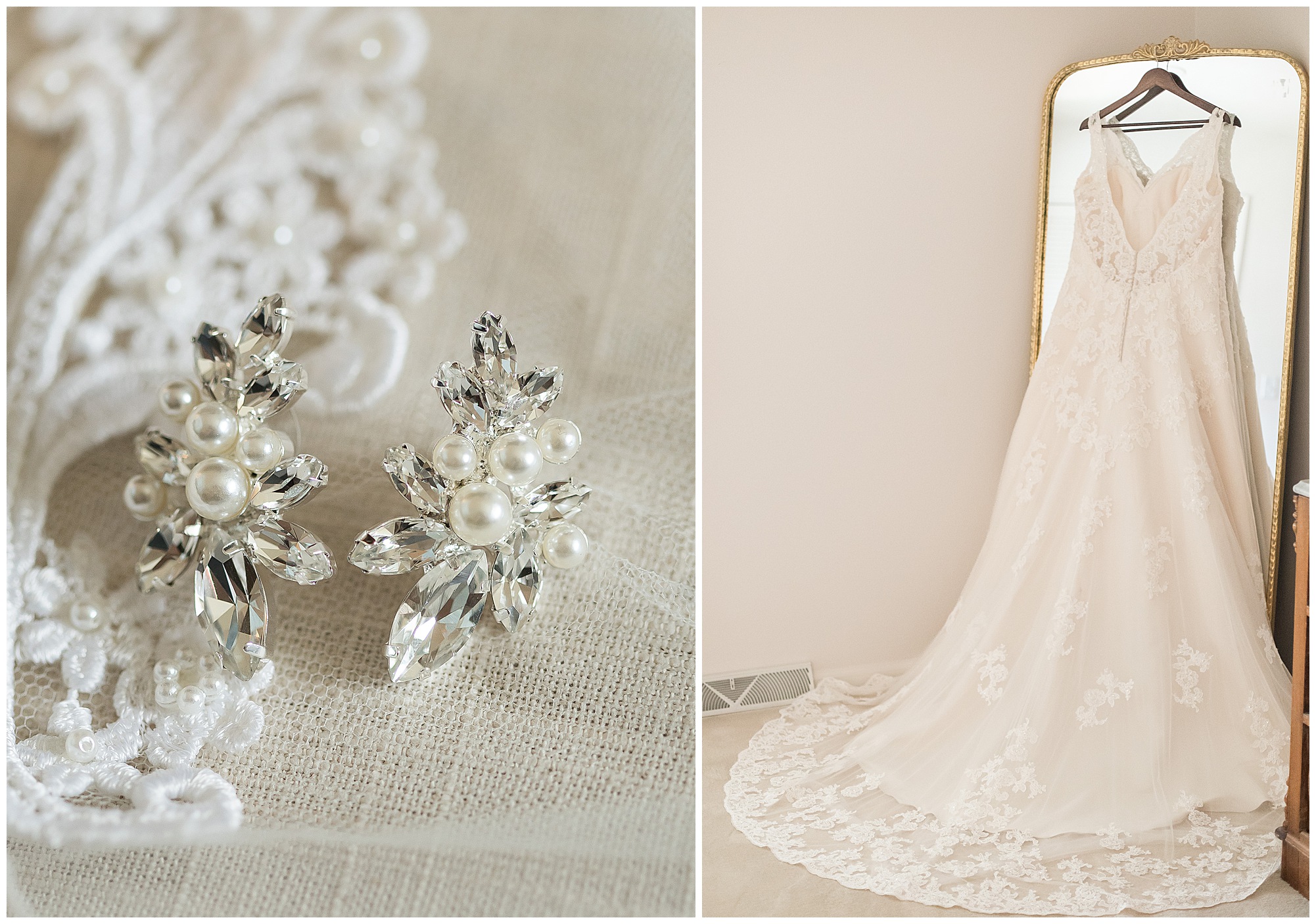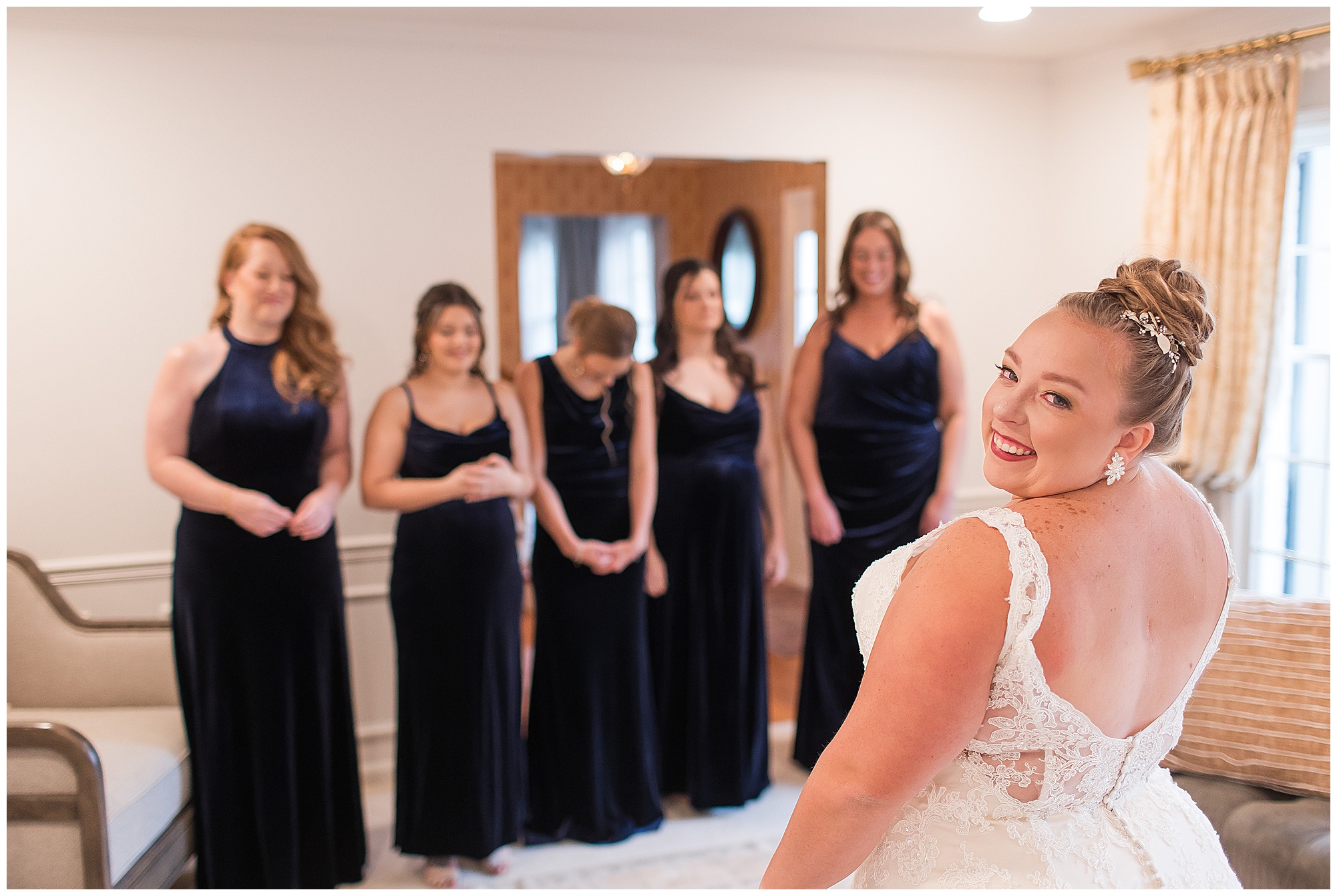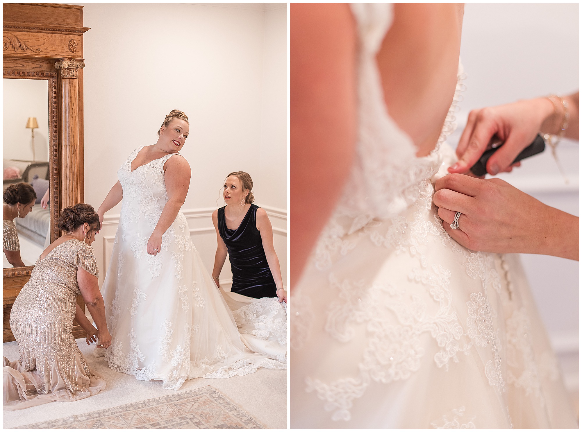 Upon arriving to the venue on wedding day, I was greeted by Kayla’s beaming smile! Her positive and infectious positive attitude uplifts everyone around her. I saw so many familiar faces including Kayla’s sister (and past LWP bride, Kristin) as well as their aunts and cousins, who had been part of Kristin’s day so many years before. The one lady who was missing, yet would be thought of throughout the entire day was Kayla & Kristin’s mom, Lisa. I met her at Kristin’s wedding as she was battling a neurological disease that sadly put her in a wheelchair and unable to speak. Unfortunately, not long after Kristin’s wedding she passed away. However, Lisa was felt in so many moments during Kayla and Nick’s wedding I know she was celebrating their love for one another. The girls even unearthed Lisa’s own wedding veil after Kayla had chosen her dress and the details were so similar it was crazy. When it came time to get Kayla dressed, her sister and Nick’s mom, Carrie stepped in to help her and she was absolutely stunning in her lace gown! With her hair in a high bun and big statement earrings, Kayla’s classic, but modern look was show-stopping.