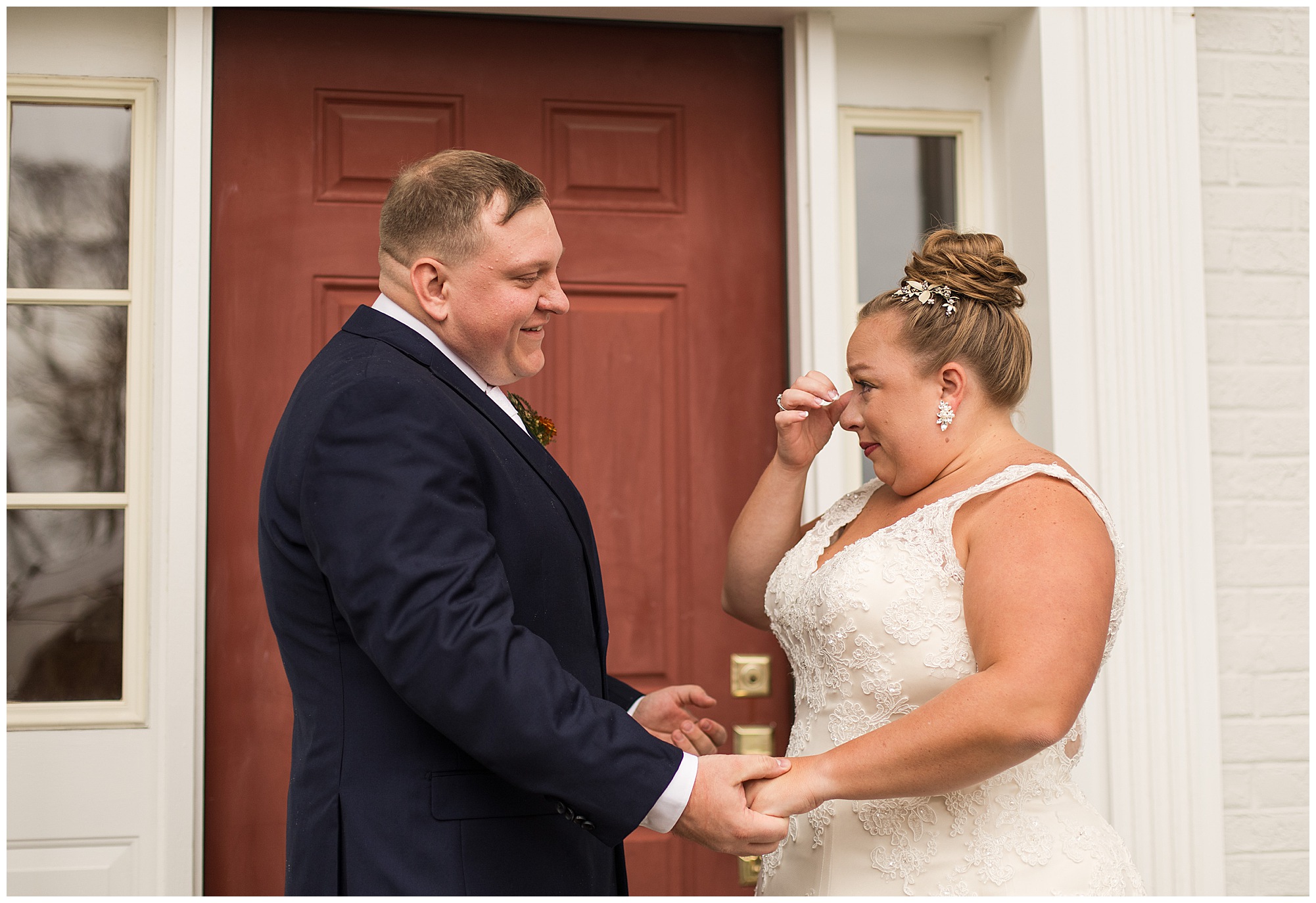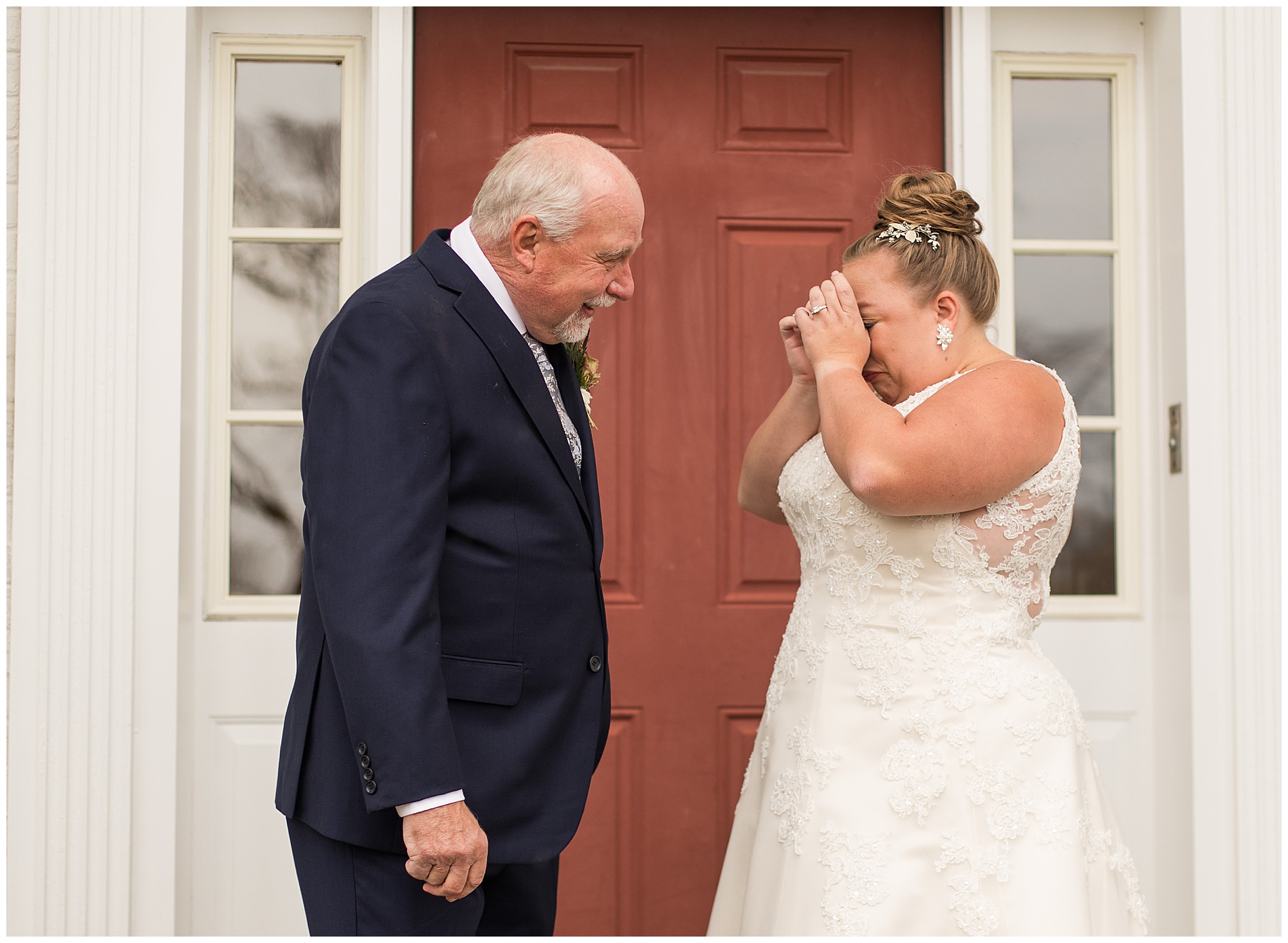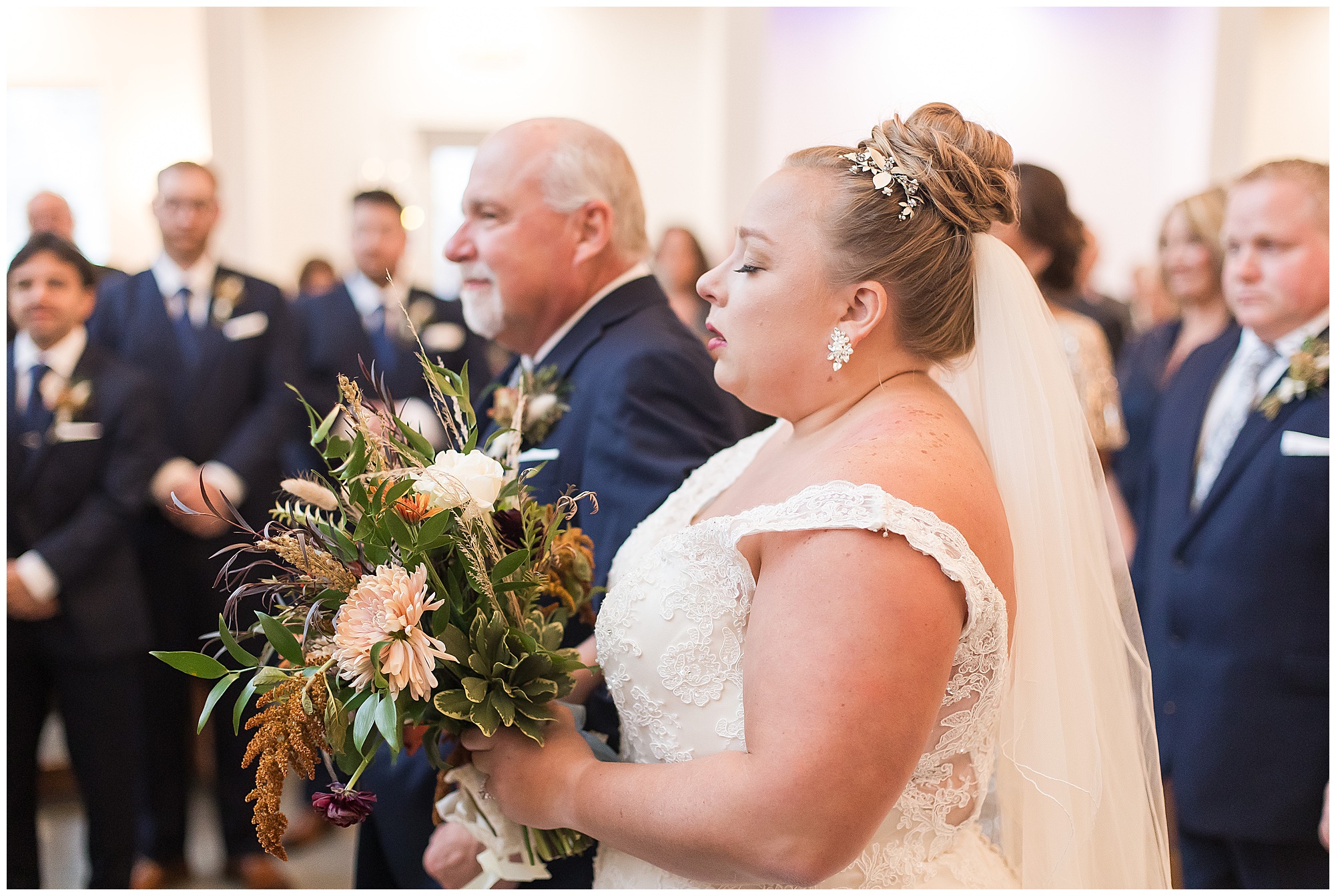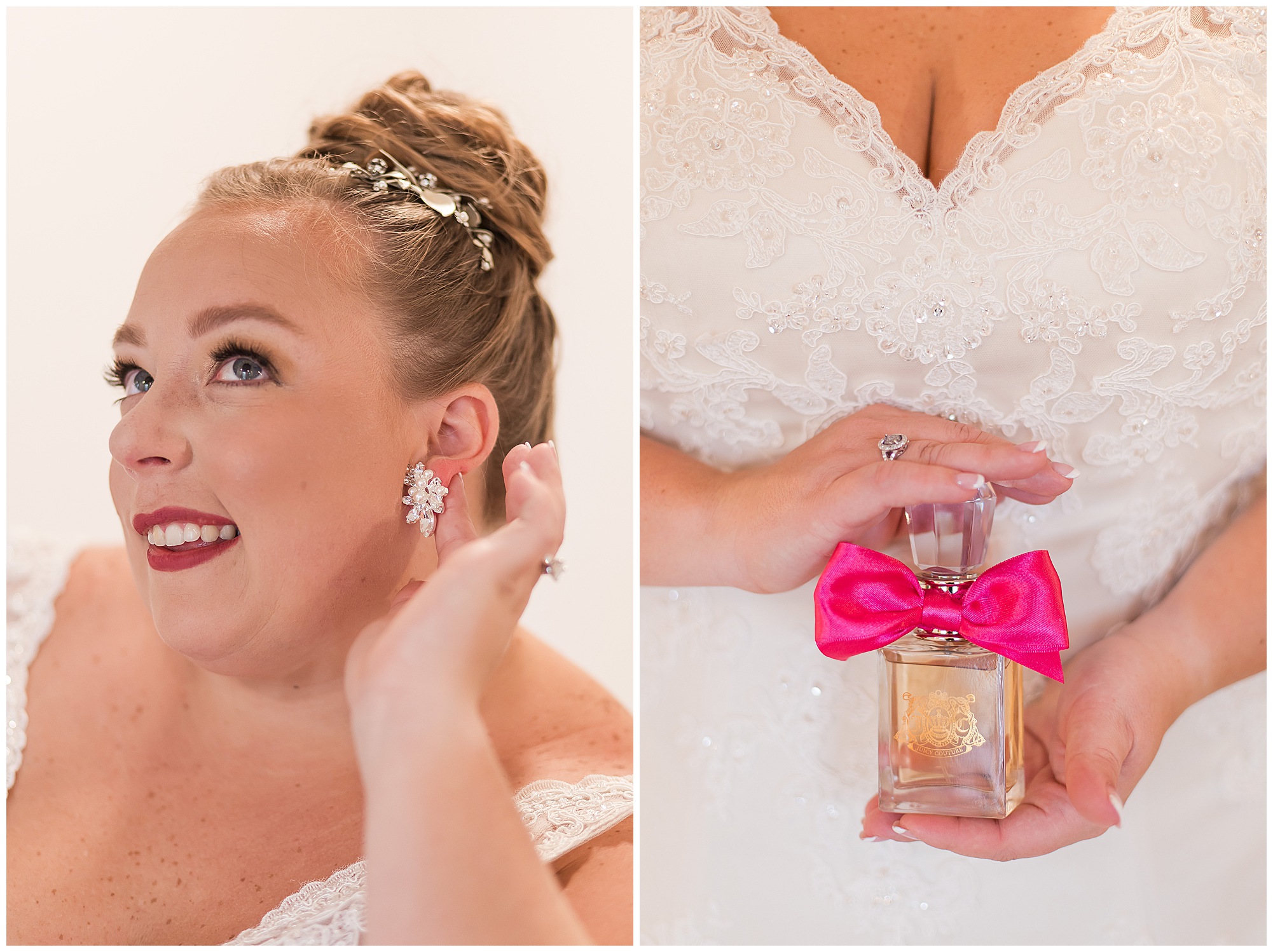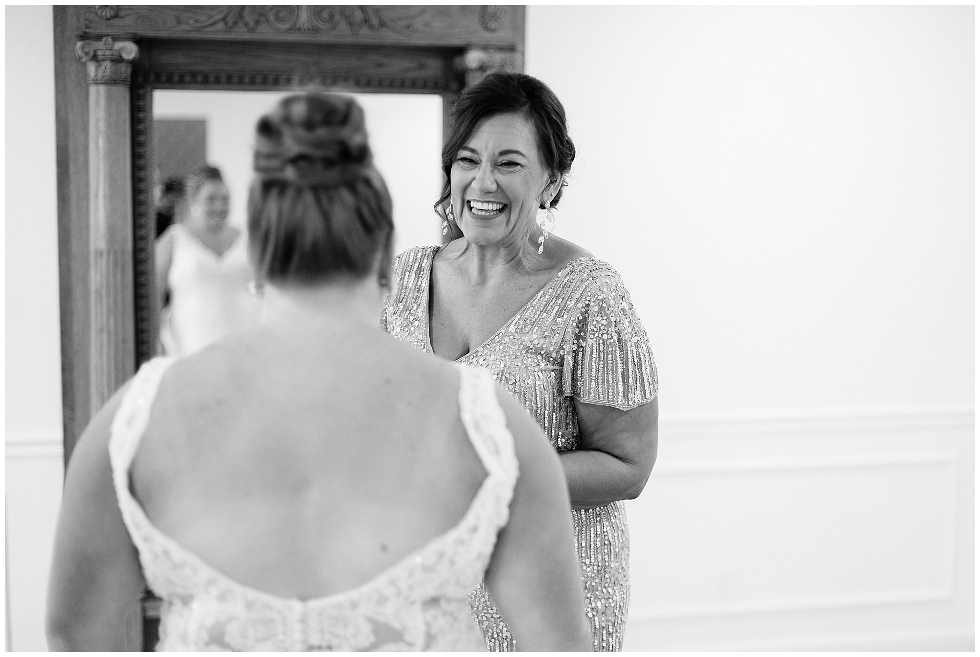 Upon arriving to the venue on wedding day, I was greeted by Kayla’s beaming smile! Her positive and infectious positive attitude uplifts everyone around her. I saw so many familiar faces including Kayla’s sister (and past LWP bride, Kristin) as well as their aunts and cousins, who had been part of Kristin’s day so many years before. The one lady who was missing, yet would be thought of throughout the entire day was Kayla & Kristin’s mom, Lisa. I met her at Kristin’s wedding as she was battling a neurological disease that sadly put her in a wheelchair and unable to speak. Unfortunately, not long after Kristin’s wedding she passed away. However, Lisa was felt in so many moments during Kayla and Nick’s wedding I know she was celebrating their love for one another. The girls even unearthed Lisa’s own wedding veil after Kayla had chosen her dress and the details were so similar it was crazy. When it came time to get Kayla dressed, her sister and Nick’s mom, Carrie stepped in to help her and she was absolutely stunning in her lace gown! With her hair in a high bun and big statement earrings, Kayla’s classic, but modern look was show-stopping.