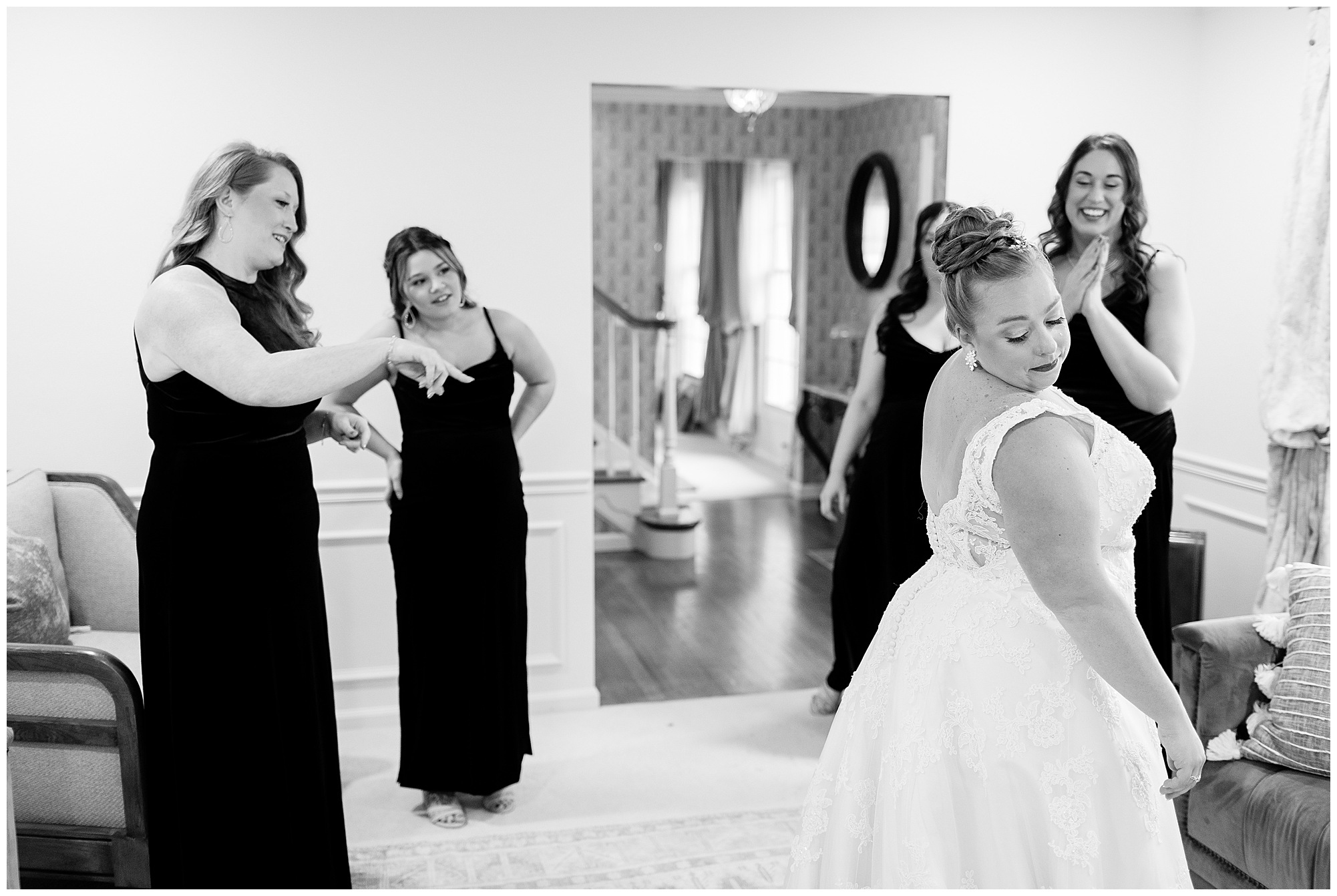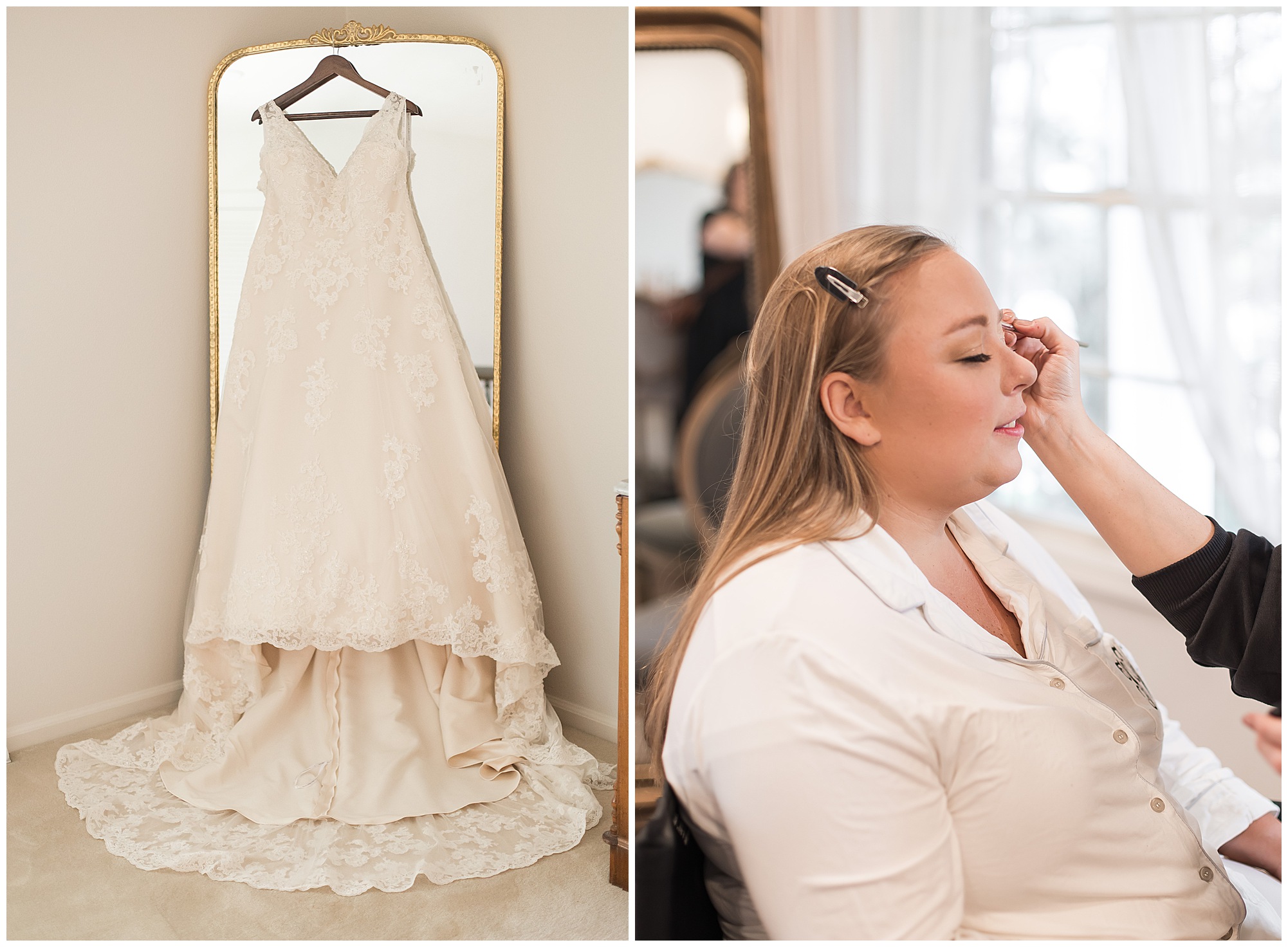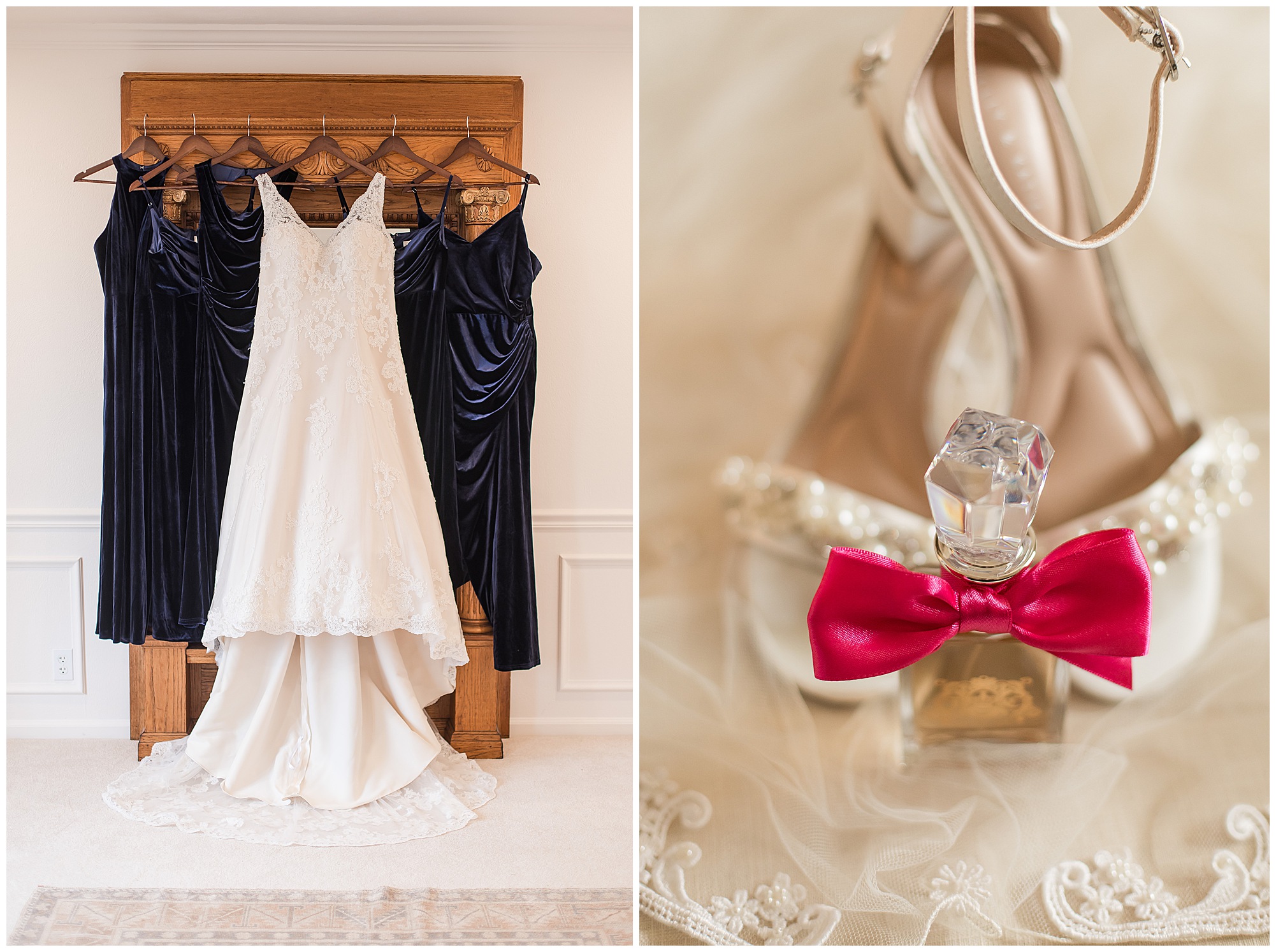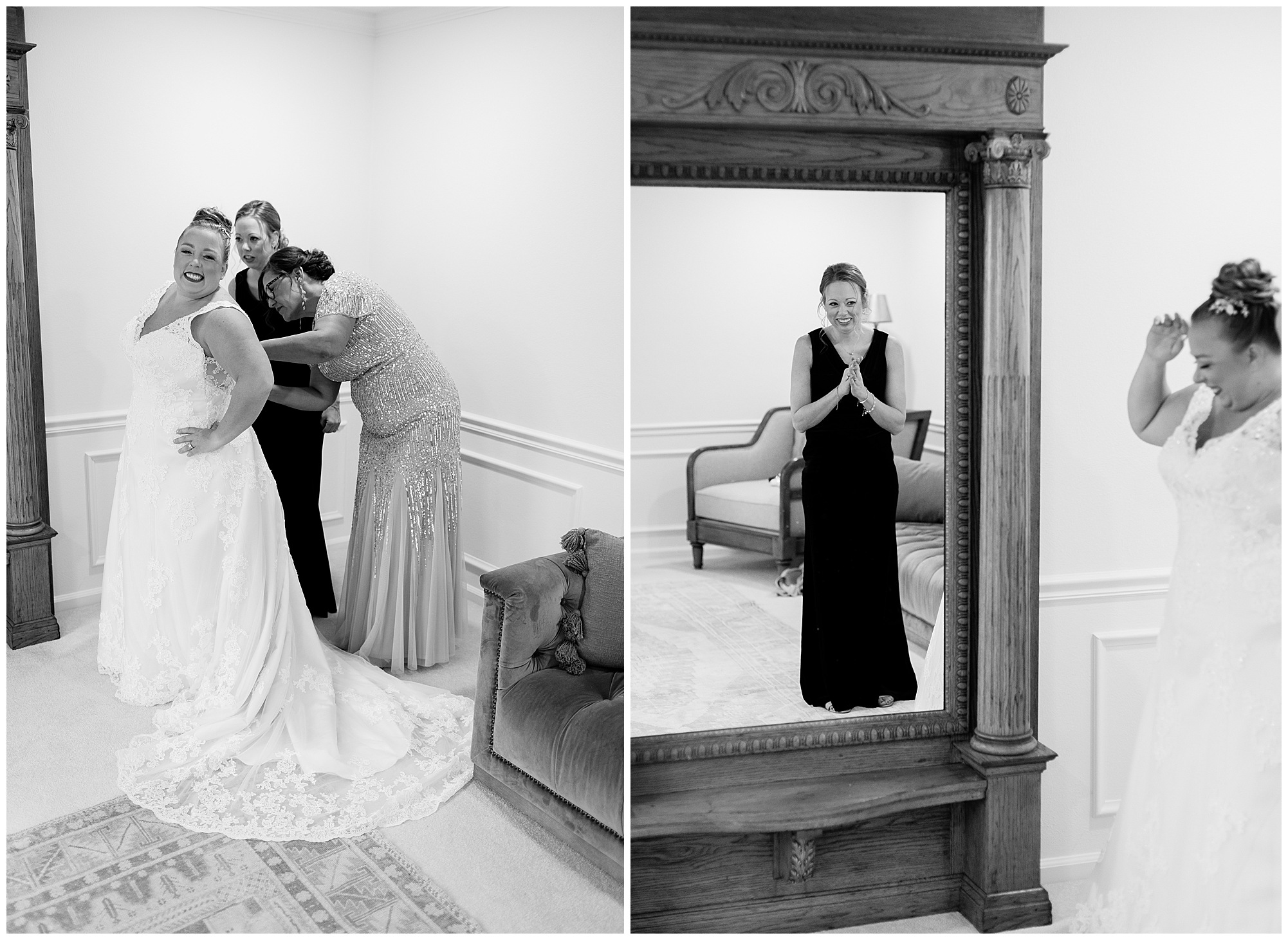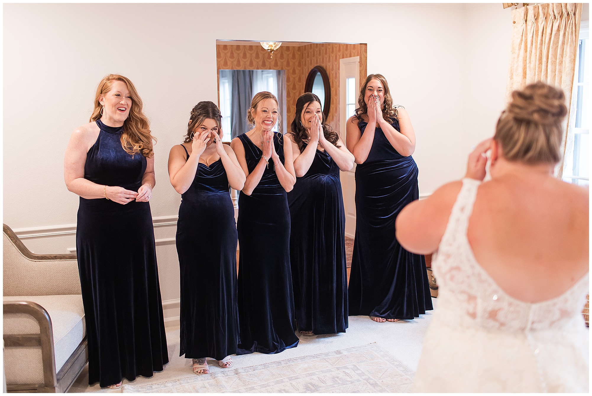 Upon arriving to the venue on wedding day, I was greeted by Kayla’s beaming smile! Her positive and infectious positive attitude uplifts everyone around her. I saw so many familiar faces including Kayla’s sister (and past LWP bride, Kristin) as well as their aunts and cousins, who had been part of Kristin’s day so many years before. The one lady who was missing, yet would be thought of throughout the entire day was Kayla & Kristin’s mom, Lisa. I met her at Kristin’s wedding as she was battling a neurological disease that sadly put her in a wheelchair and unable to speak. Unfortunately, not long after Kristin’s wedding she passed away. However, Lisa was felt in so many moments during Kayla and Nick’s wedding I know she was celebrating their love for one another. The girls even unearthed Lisa’s own wedding veil after Kayla had chosen her dress and the details were so similar it was crazy. When it came time to get Kayla dressed, her sister and Nick’s mom, Carrie stepped in to help her and she was absolutely stunning in her lace gown! With her hair in a high bun and big statement earrings, Kayla’s classic, but modern look was show-stopping.