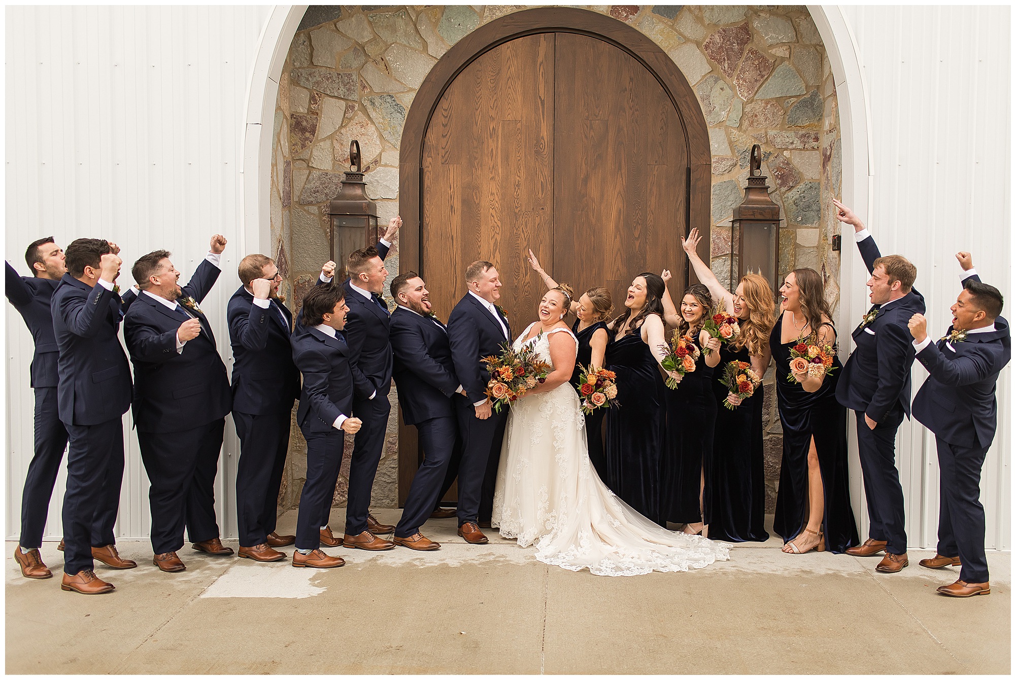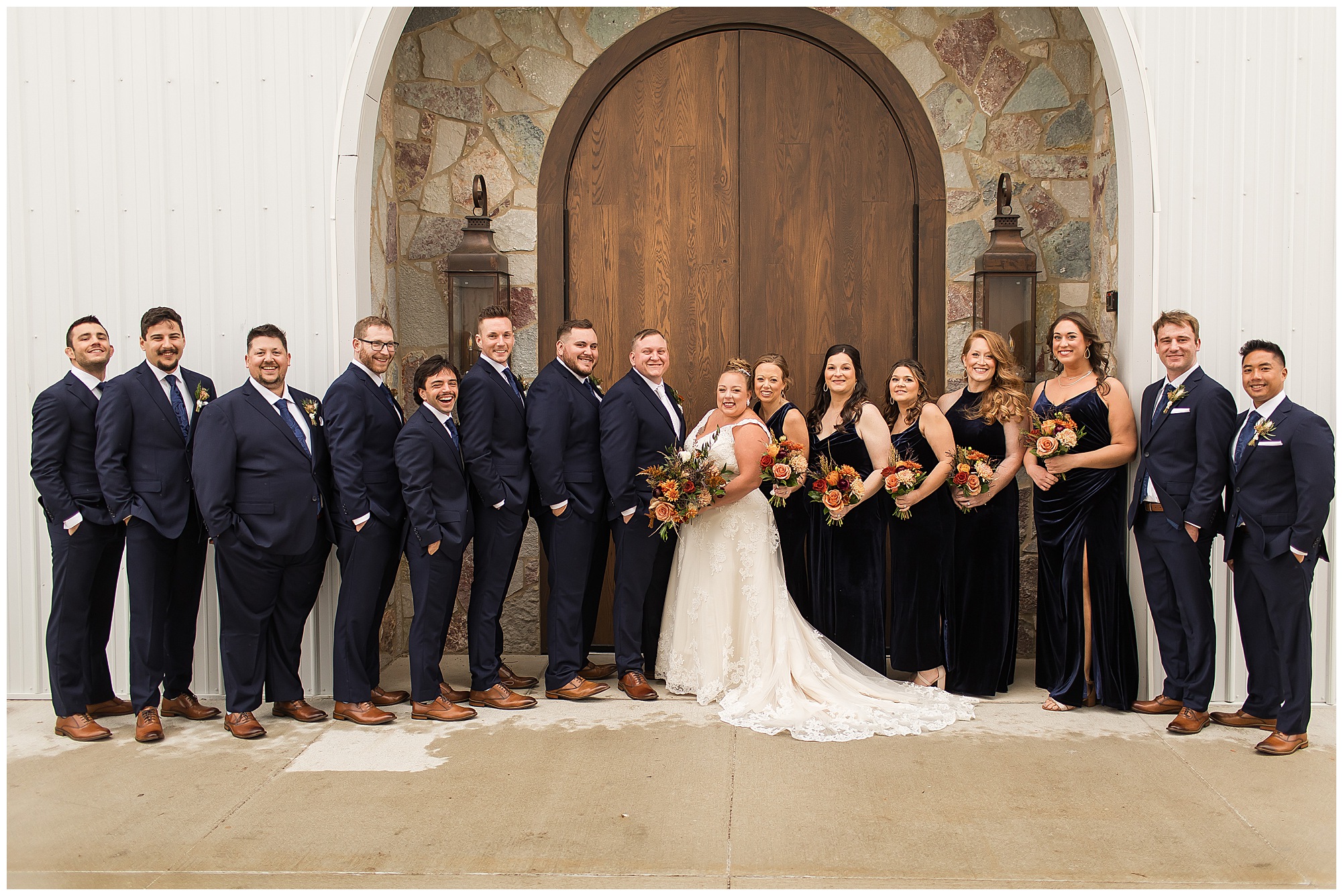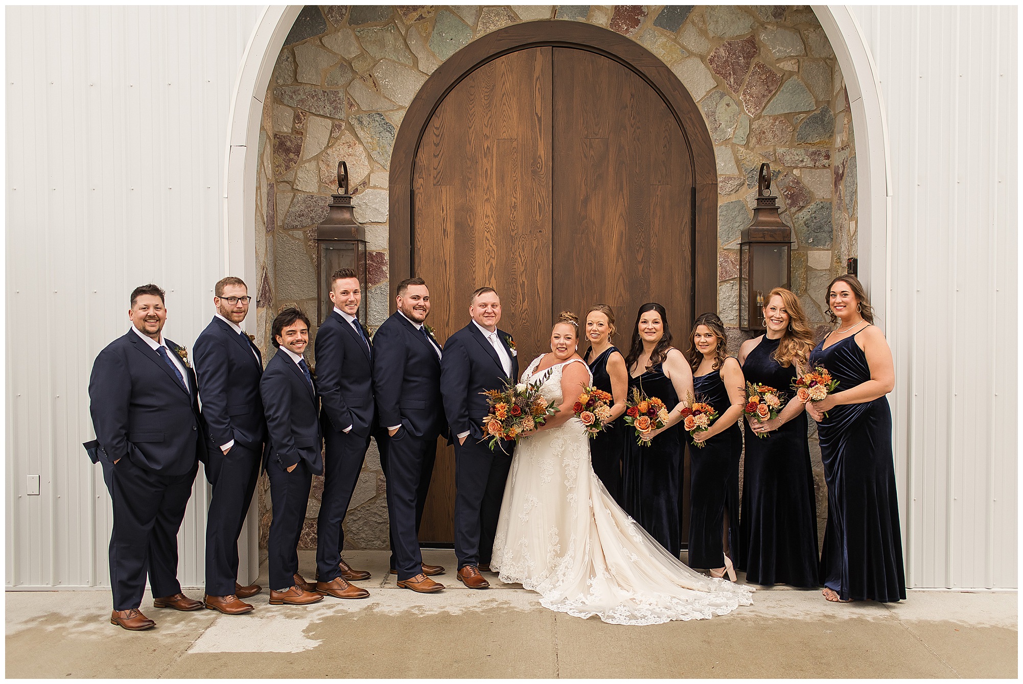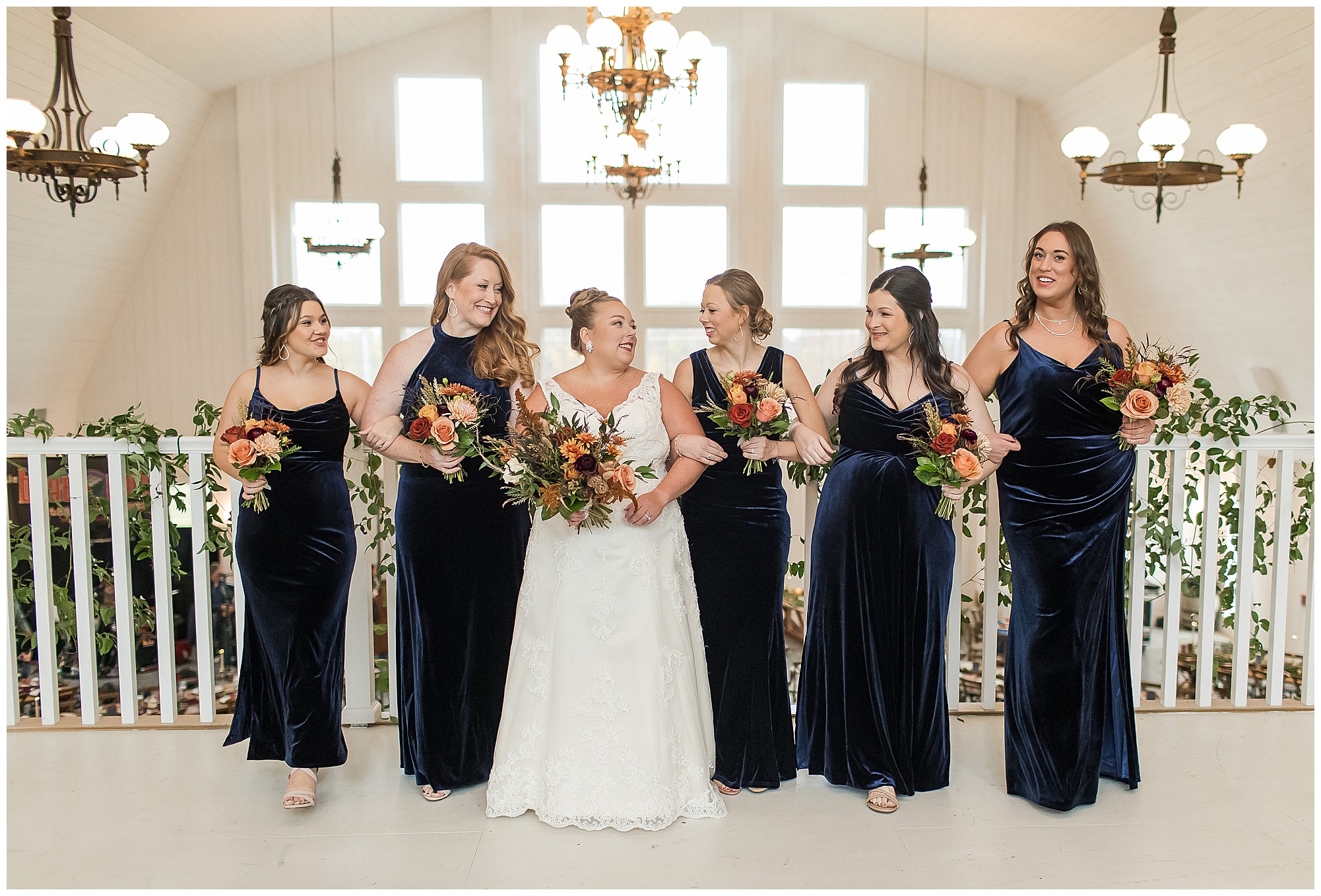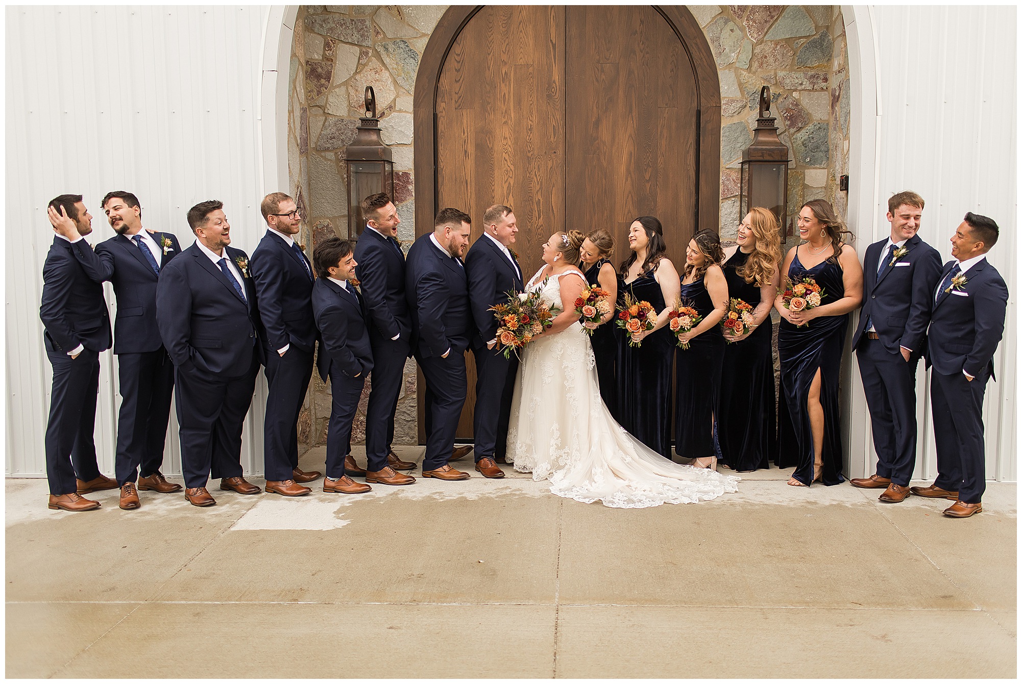 For an early November wedding, we were wishing so badly to have a delightful autumn day. Yet, Mother Nature had a little different of an idea. Right before first looks with Nick and his mom, Kayla and her dad, Rich, as well as Kayla and Nick, the skies opened up and rain began to fall. But, that didn’t stop the tears from falling and the sweet emotions of these moments from happening on the front porch at the farm. Then it was time for a few bridal party photos. We had a quick break from the rain so we took advantage for a few photos with this energetic crew in front of the spectacular entrance to the barn. Kayla’s ladies were dressed in velvet navy gowns in various styles. OBSESSED! Kayla and her bridesmaids all held fabulous fall bouquets filled with oranges, pinks, peaches, and greenery to give so much texture. Nick and his guys wore navy suits with matching ties, while Nick stood out with a white tie. The rain then made its way back upon us so we headed inside to the dazzling inside of Haven on the Farm’s reception space. Luckily for us, the loft space provided ample light and a delightful backdrop for Kayla and Nick’s bridal party portraits. I was not surprised at all when their bridal squad was breaking out into dance and constantly having me laughing throughout photo time! Kayla and Nick surrounded themselves with incredible people who matched their joyful spirit and this was on full display! What a blast! We grabbed a few photos of the soon-to-be Mr. & Mrs. before we looked outside and saw a little break in the weather. I asked Kayla if she wanted to go outside for photos even though there was the possibility of guests seeing her and without hesitation said, “Let’s Go!”