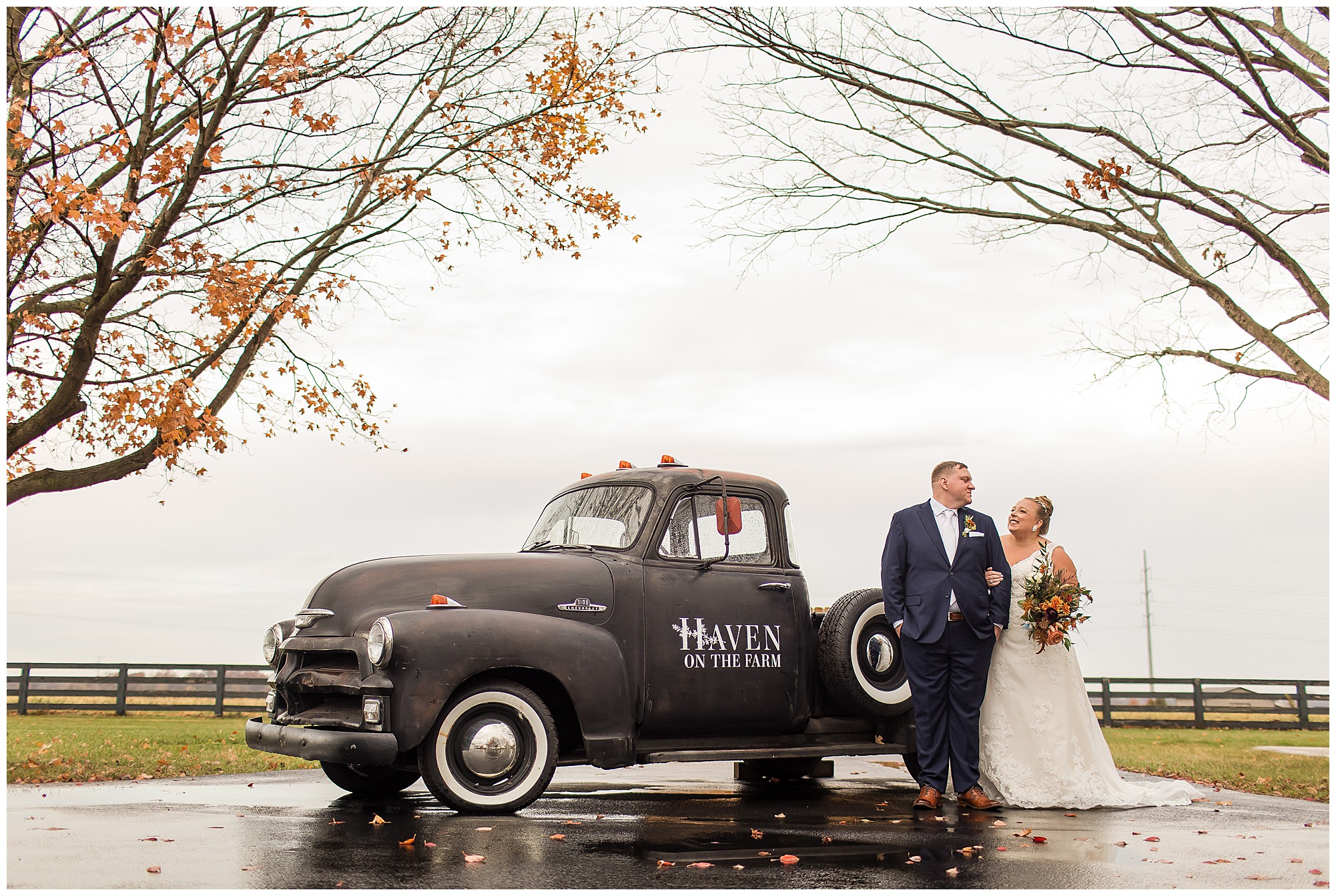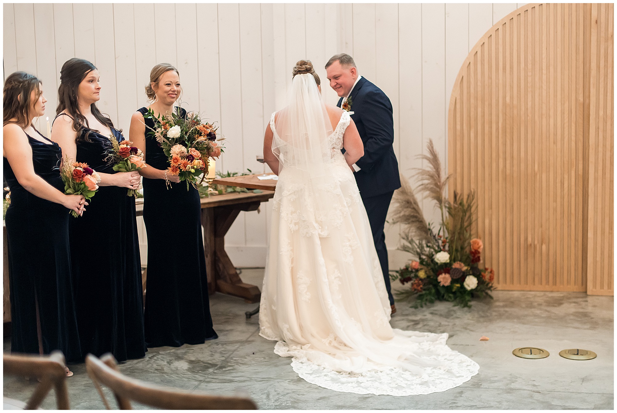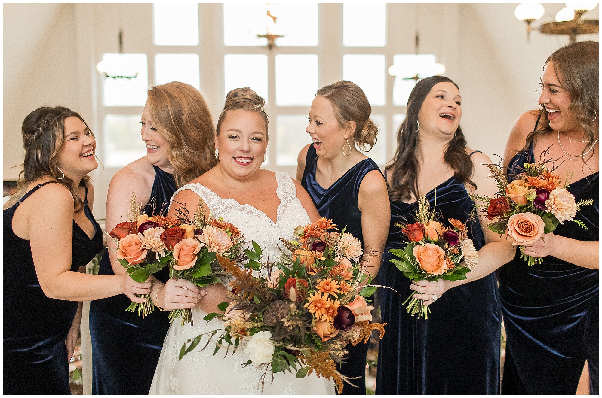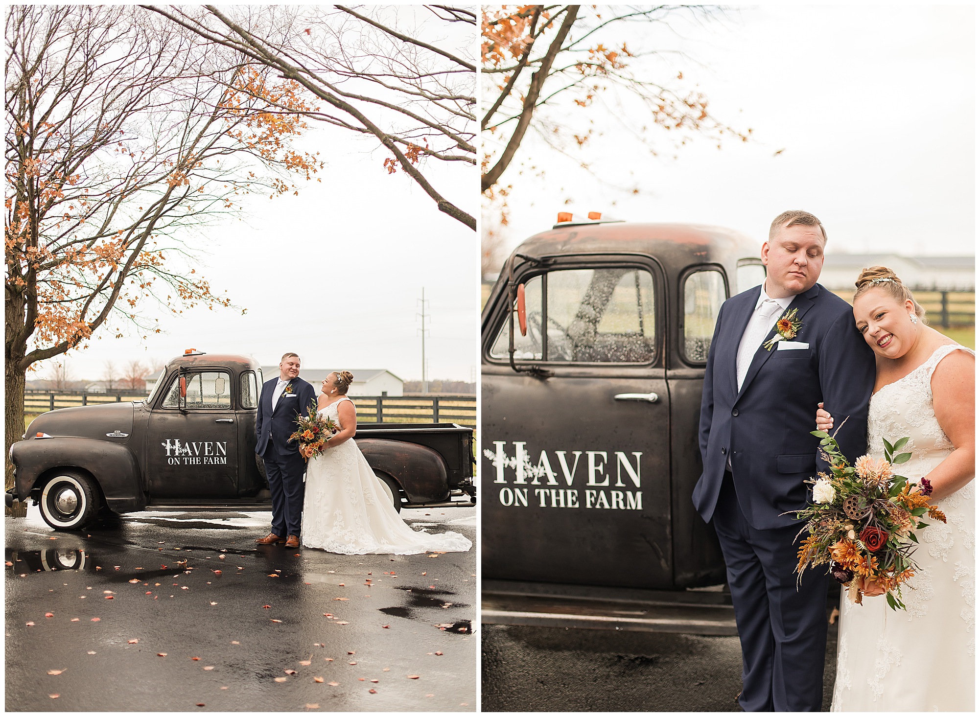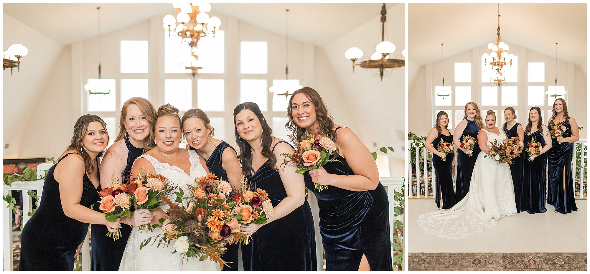 For an early November wedding, we were wishing so badly to have a delightful autumn day. Yet, Mother Nature had a little different of an idea. Right before first looks with Nick and his mom, Kayla and her dad, Rich, as well as Kayla and Nick, the skies opened up and rain began to fall. But, that didn’t stop the tears from falling and the sweet emotions of these moments from happening on the front porch at the farm. Then it was time for a few bridal party photos. We had a quick break from the rain so we took advantage for a few photos with this energetic crew in front of the spectacular entrance to the barn. Kayla’s ladies were dressed in velvet navy gowns in various styles. OBSESSED! Kayla and her bridesmaids all held fabulous fall bouquets filled with oranges, pinks, peaches, and greenery to give so much texture. Nick and his guys wore navy suits with matching ties, while Nick stood out with a white tie. The rain then made its way back upon us so we headed inside to the dazzling inside of Haven on the Farm’s reception space. Luckily for us, the loft space provided ample light and a delightful backdrop for Kayla and Nick’s bridal party portraits. I was not surprised at all when their bridal squad was breaking out into dance and constantly having me laughing throughout photo time! Kayla and Nick surrounded themselves with incredible people who matched their joyful spirit and this was on full display! What a blast! We grabbed a few photos of the soon-to-be Mr. & Mrs. before we looked outside and saw a little break in the weather. I asked Kayla if she wanted to go outside for photos even though there was the possibility of guests seeing her and without hesitation said, “Let’s Go!”