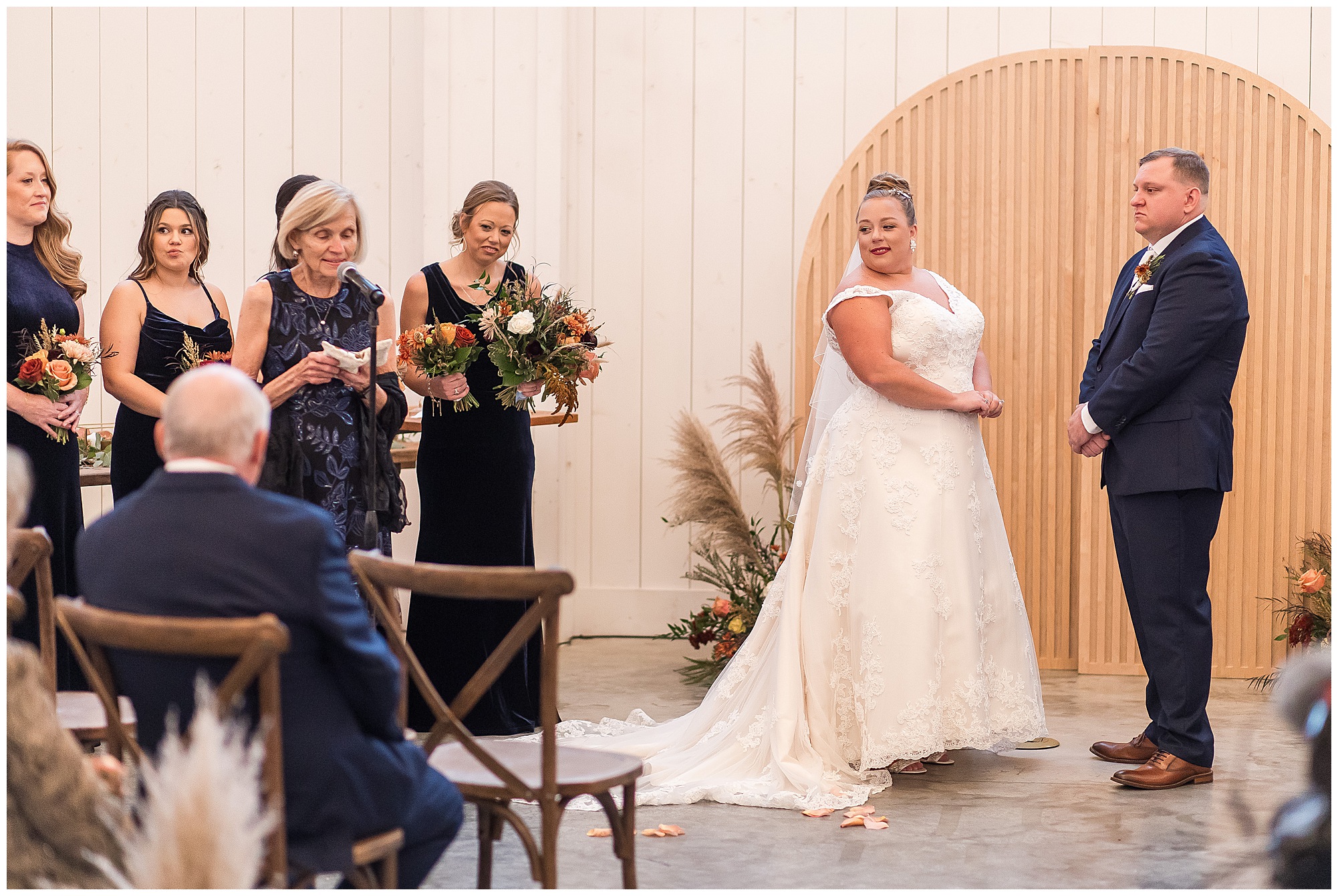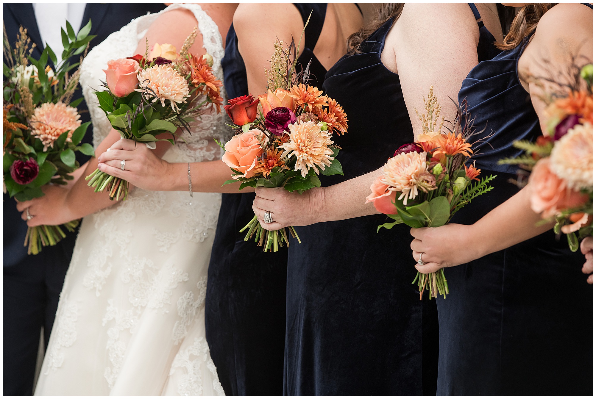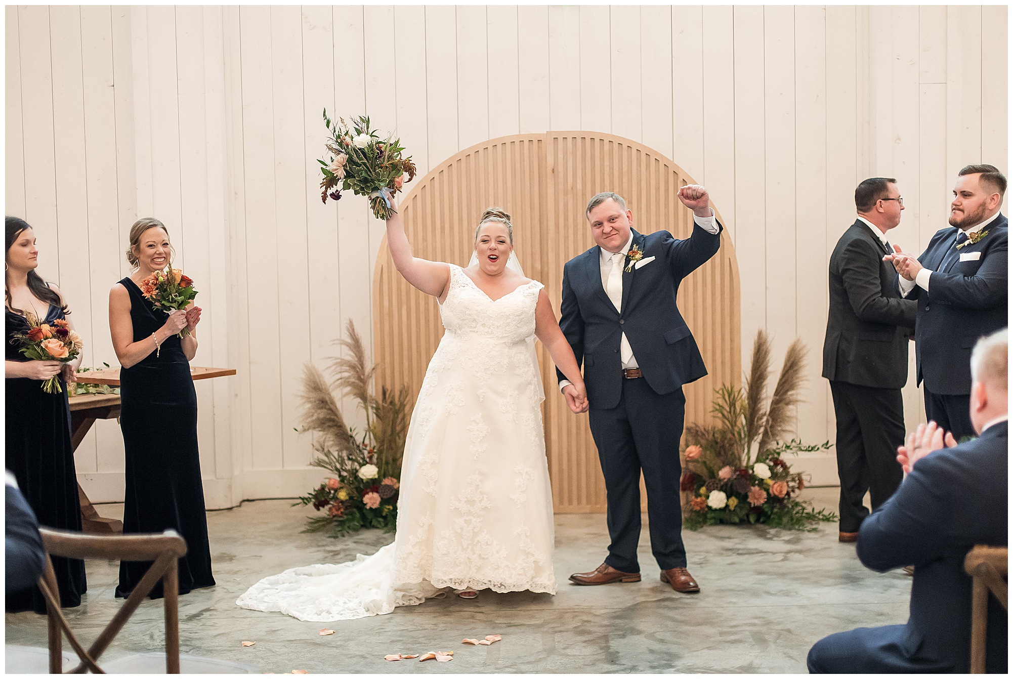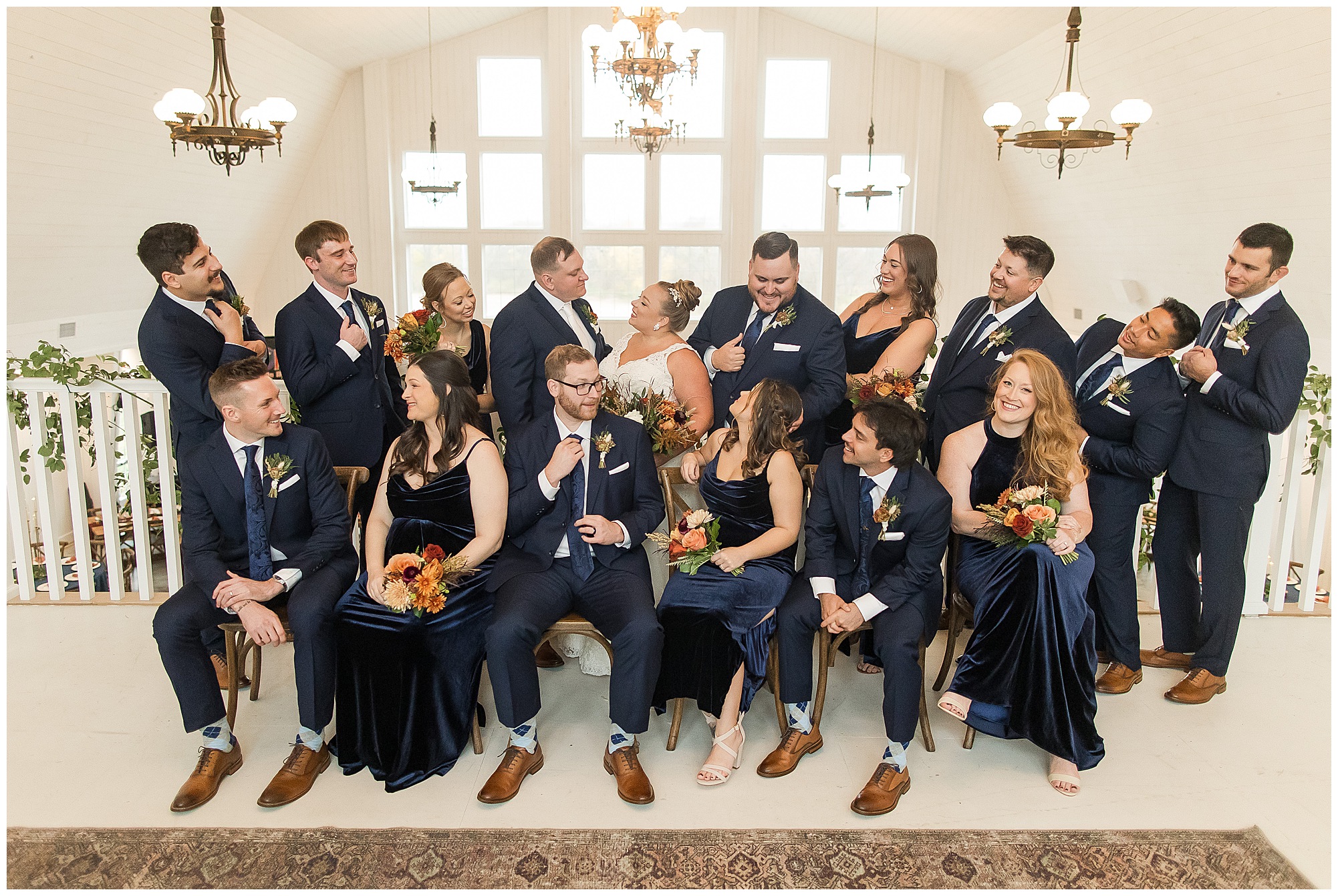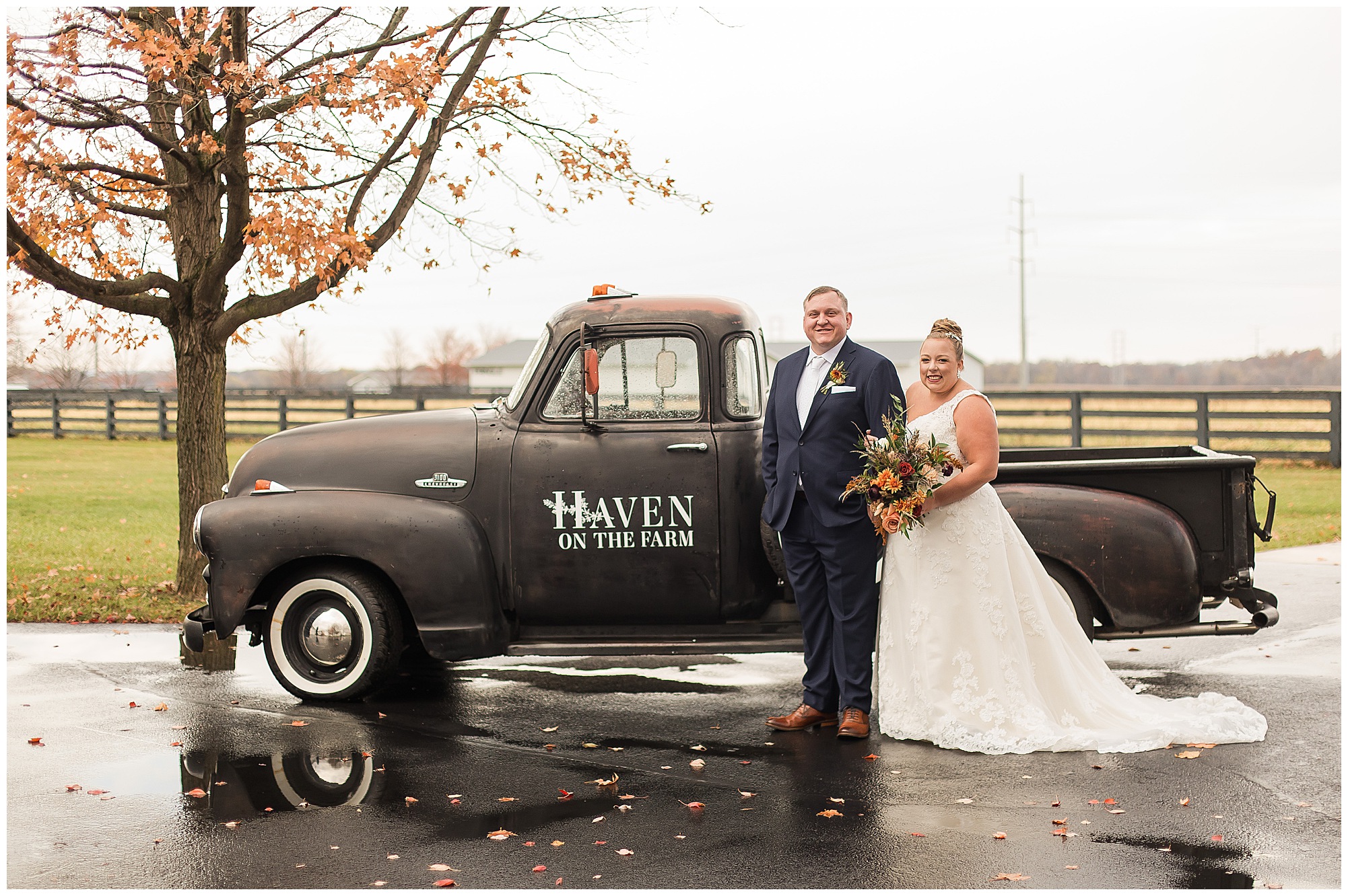 For an early November wedding, we were wishing so badly to have a delightful autumn day. Yet, Mother Nature had a little different of an idea. Right before first looks with Nick and his mom, Kayla and her dad, Rich, as well as Kayla and Nick, the skies opened up and rain began to fall. But, that didn’t stop the tears from falling and the sweet emotions of these moments from happening on the front porch at the farm. Then it was time for a few bridal party photos. We had a quick break from the rain so we took advantage for a few photos with this energetic crew in front of the spectacular entrance to the barn. Kayla’s ladies were dressed in velvet navy gowns in various styles. OBSESSED! Kayla and her bridesmaids all held fabulous fall bouquets filled with oranges, pinks, peaches, and greenery to give so much texture. Nick and his guys wore navy suits with matching ties, while Nick stood out with a white tie. The rain then made its way back upon us so we headed inside to the dazzling inside of Haven on the Farm’s reception space. Luckily for us, the loft space provided ample light and a delightful backdrop for Kayla and Nick’s bridal party portraits. I was not surprised at all when their bridal squad was breaking out into dance and constantly having me laughing throughout photo time! Kayla and Nick surrounded themselves with incredible people who matched their joyful spirit and this was on full display! What a blast! We grabbed a few photos of the soon-to-be Mr. & Mrs. before we looked outside and saw a little break in the weather. I asked Kayla if she wanted to go outside for photos even though there was the possibility of guests seeing her and without hesitation said, “Let’s Go!”