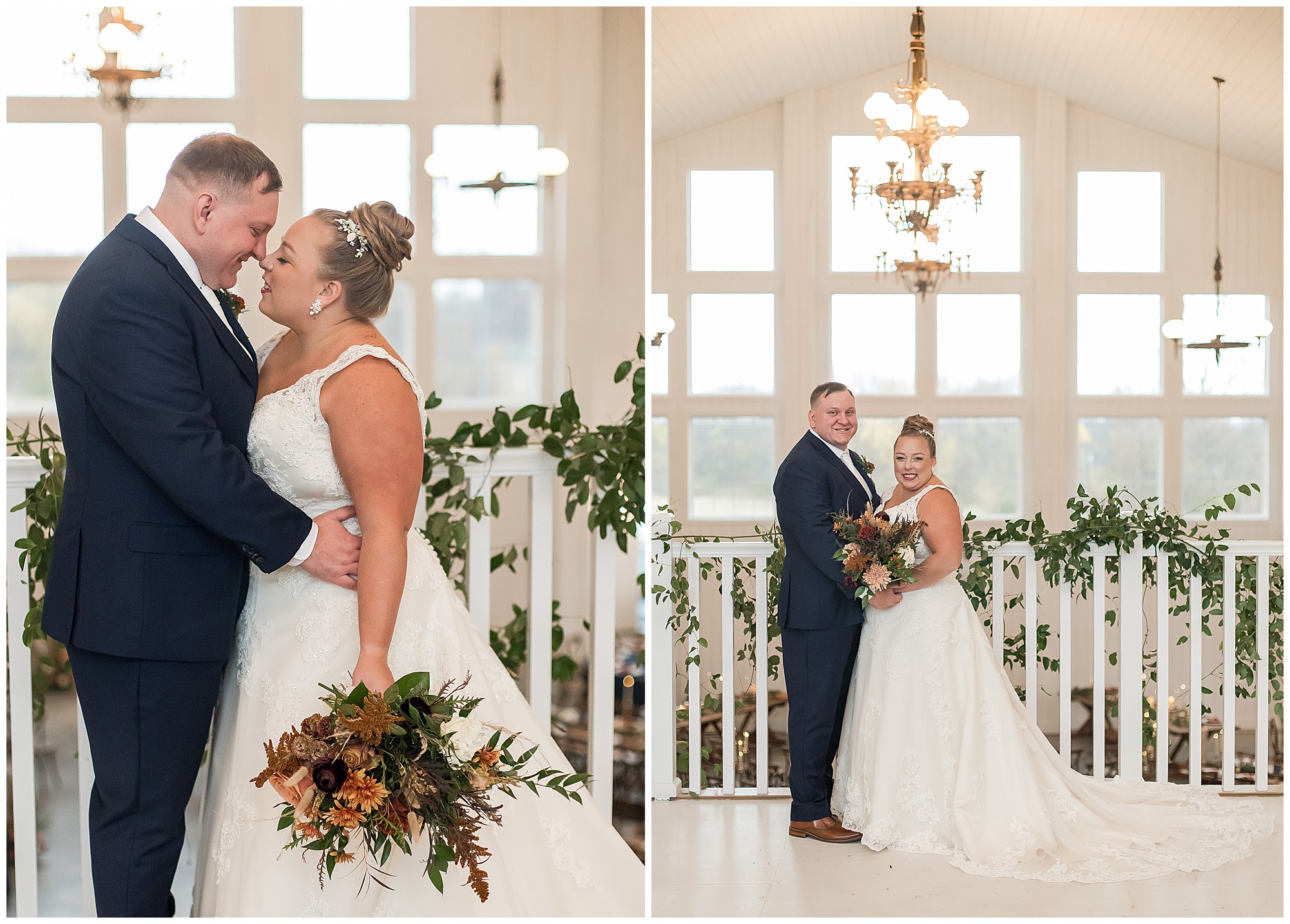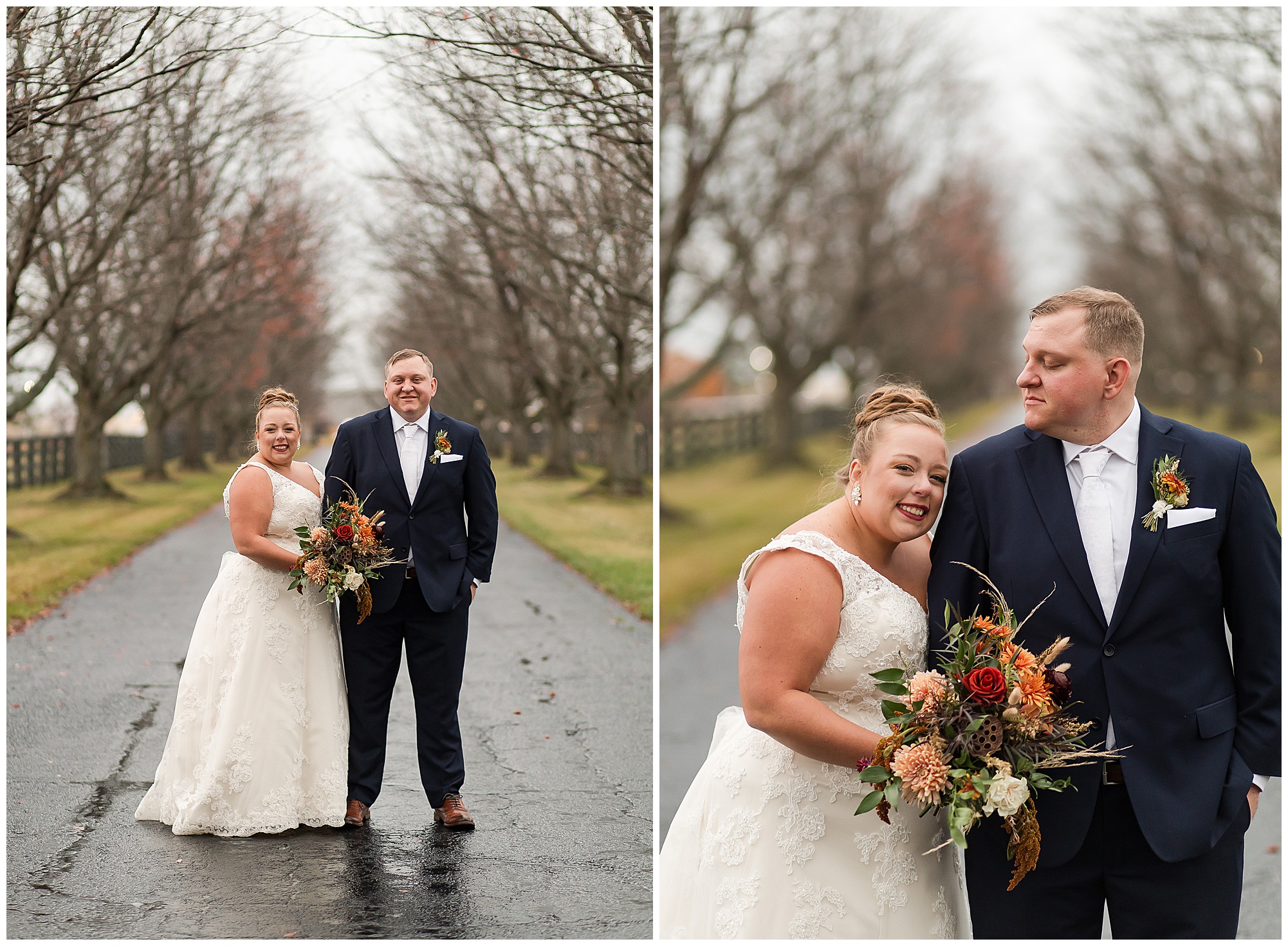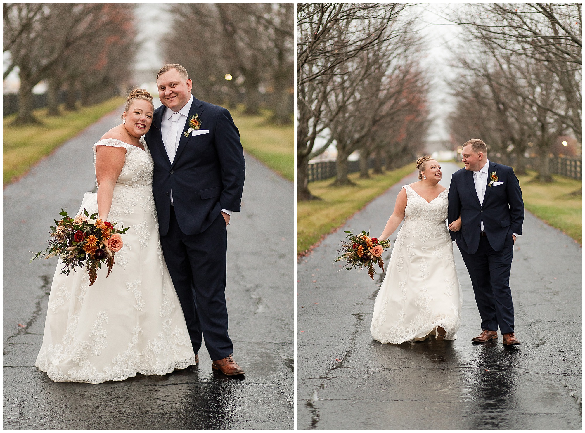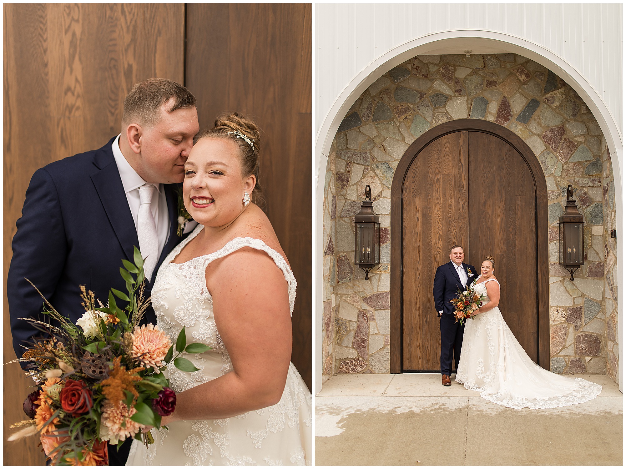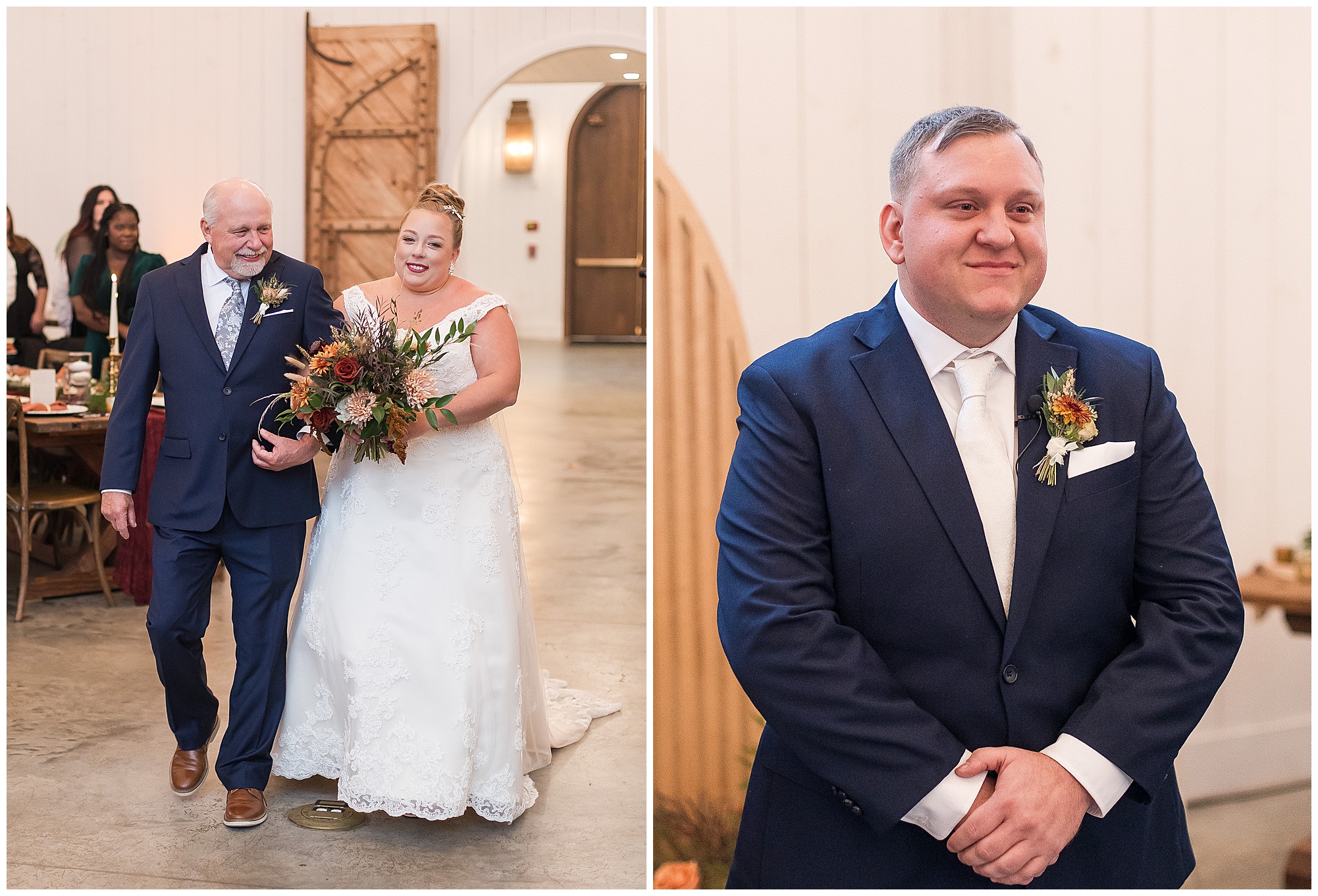 For an early November wedding, we were wishing so badly to have a delightful autumn day. Yet, Mother Nature had a little different of an idea. Right before first looks with Nick and his mom, Kayla and her dad, Rich, as well as Kayla and Nick, the skies opened up and rain began to fall. But, that didn’t stop the tears from falling and the sweet emotions of these moments from happening on the front porch at the farm. Then it was time for a few bridal party photos. We had a quick break from the rain so we took advantage for a few photos with this energetic crew in front of the spectacular entrance to the barn. Kayla’s ladies were dressed in velvet navy gowns in various styles. OBSESSED! Kayla and her bridesmaids all held fabulous fall bouquets filled with oranges, pinks, peaches, and greenery to give so much texture. Nick and his guys wore navy suits with matching ties, while Nick stood out with a white tie. The rain then made its way back upon us so we headed inside to the dazzling inside of Haven on the Farm’s reception space. Luckily for us, the loft space provided ample light and a delightful backdrop for Kayla and Nick’s bridal party portraits. I was not surprised at all when their bridal squad was breaking out into dance and constantly having me laughing throughout photo time! Kayla and Nick surrounded themselves with incredible people who matched their joyful spirit and this was on full display! What a blast! We grabbed a few photos of the soon-to-be Mr. & Mrs. before we looked outside and saw a little break in the weather. I asked Kayla if she wanted to go outside for photos even though there was the possibility of guests seeing her and without hesitation said, “Let’s Go!”