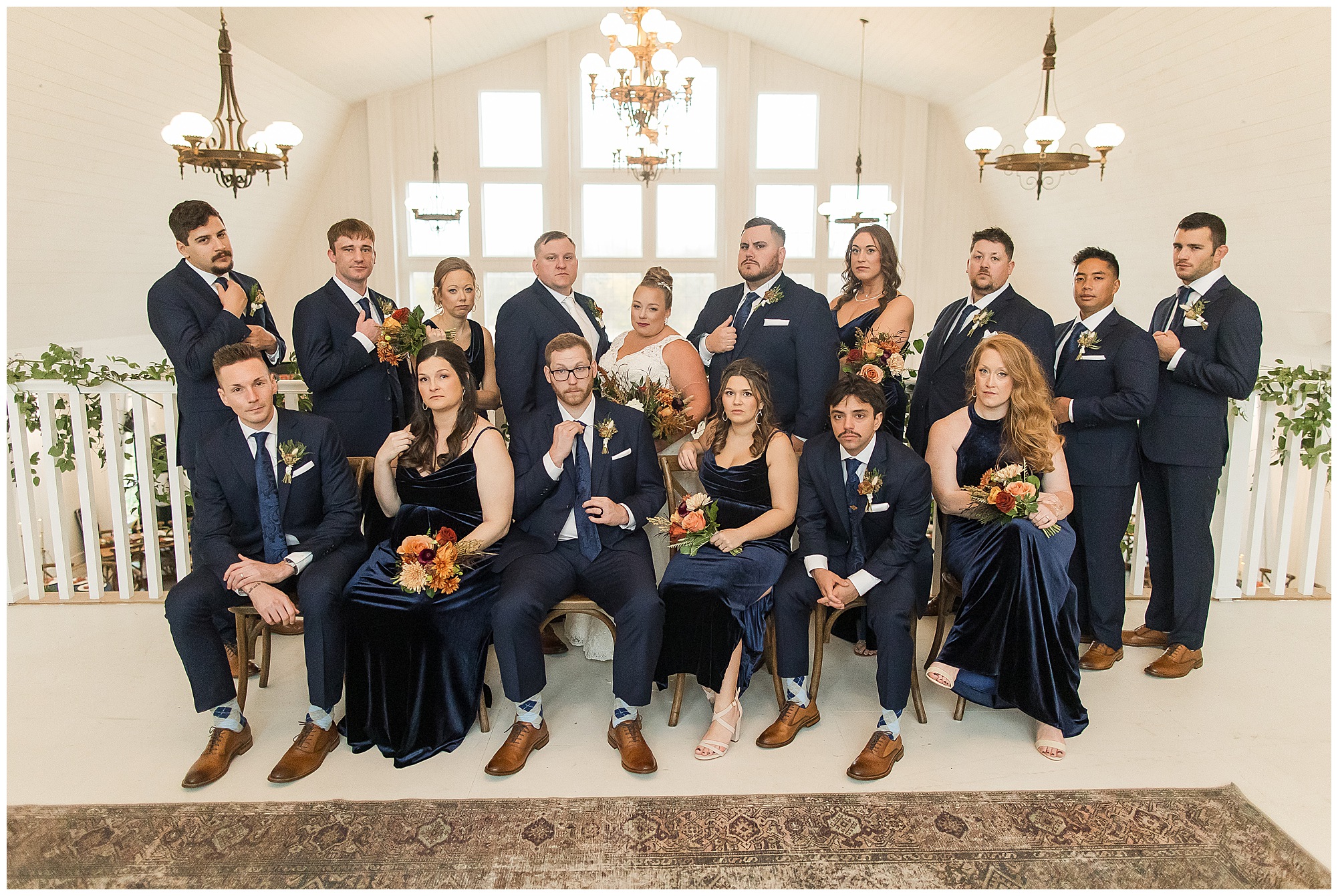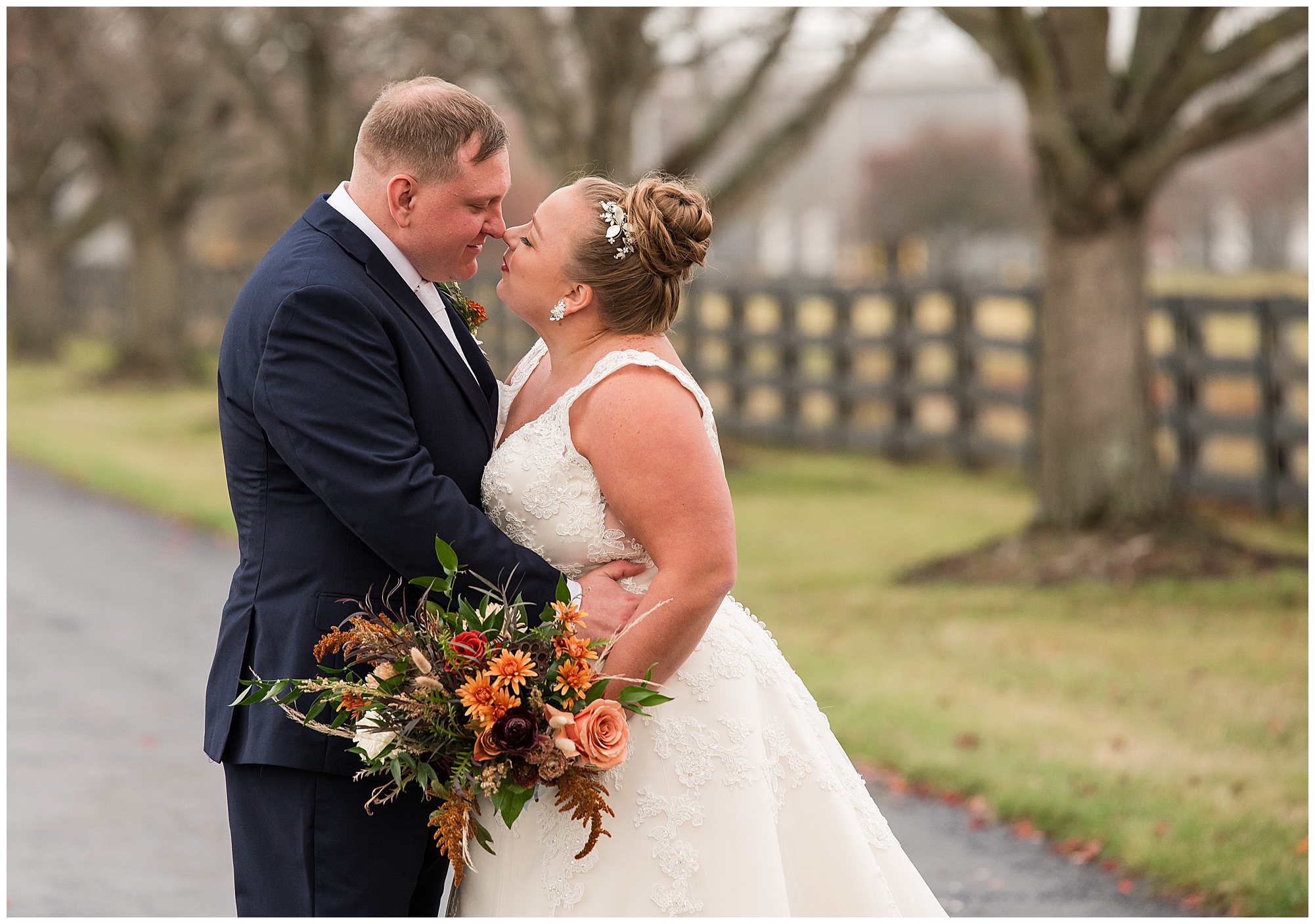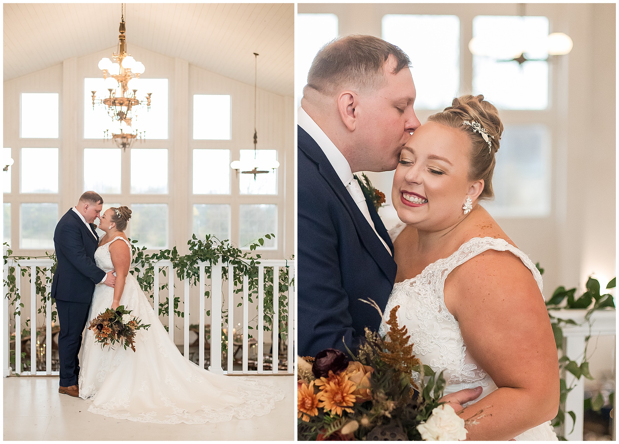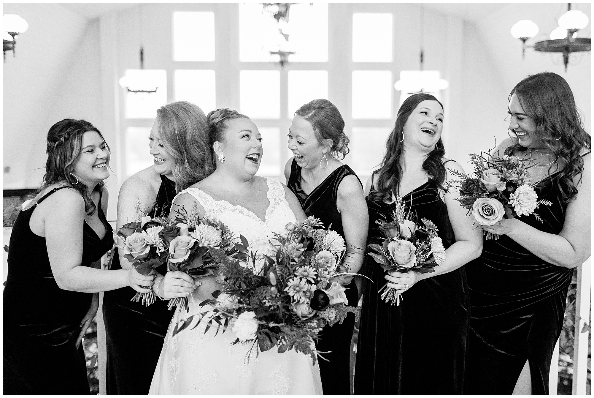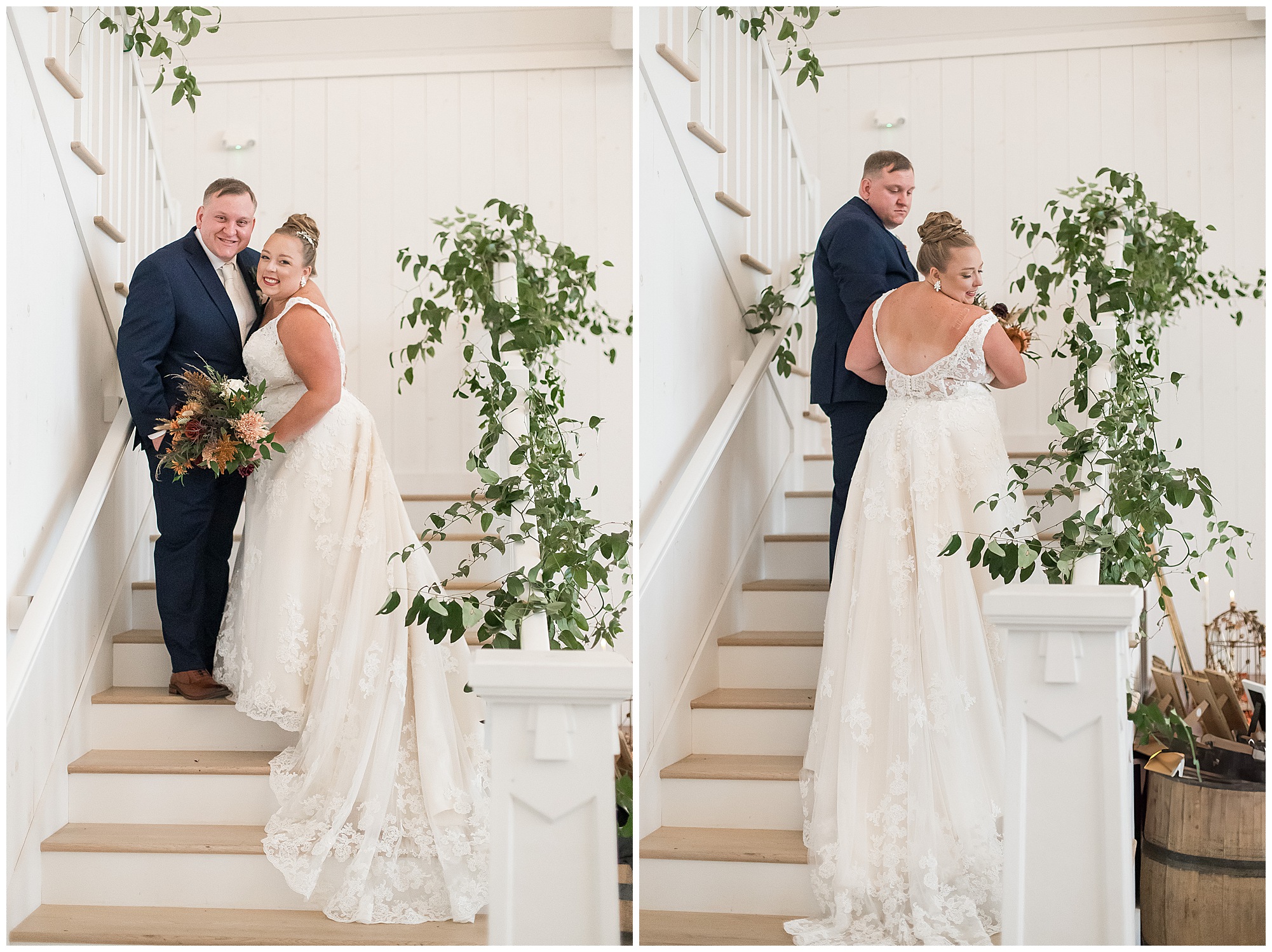 For an early November wedding, we were wishing so badly to have a delightful autumn day. Yet, Mother Nature had a little different of an idea. Right before first looks with Nick and his mom, Kayla and her dad, Rich, as well as Kayla and Nick, the skies opened up and rain began to fall. But, that didn’t stop the tears from falling and the sweet emotions of these moments from happening on the front porch at the farm. Then it was time for a few bridal party photos. We had a quick break from the rain so we took advantage for a few photos with this energetic crew in front of the spectacular entrance to the barn. Kayla’s ladies were dressed in velvet navy gowns in various styles. OBSESSED! Kayla and her bridesmaids all held fabulous fall bouquets filled with oranges, pinks, peaches, and greenery to give so much texture. Nick and his guys wore navy suits with matching ties, while Nick stood out with a white tie. The rain then made its way back upon us so we headed inside to the dazzling inside of Haven on the Farm’s reception space. Luckily for us, the loft space provided ample light and a delightful backdrop for Kayla and Nick’s bridal party portraits. I was not surprised at all when their bridal squad was breaking out into dance and constantly having me laughing throughout photo time! Kayla and Nick surrounded themselves with incredible people who matched their joyful spirit and this was on full display! What a blast! We grabbed a few photos of the soon-to-be Mr. & Mrs. before we looked outside and saw a little break in the weather. I asked Kayla if she wanted to go outside for photos even though there was the possibility of guests seeing her and without hesitation said, “Let’s Go!”