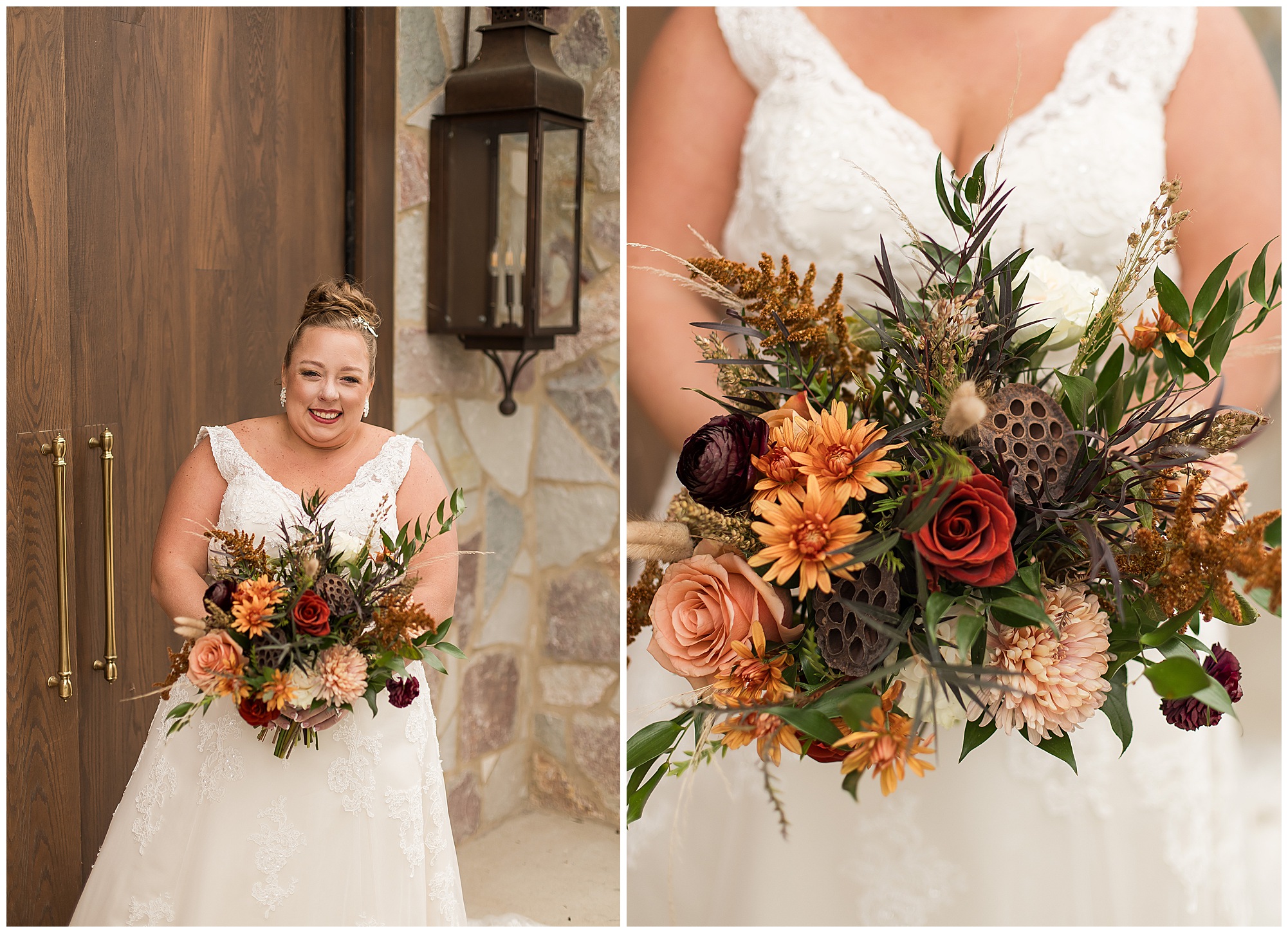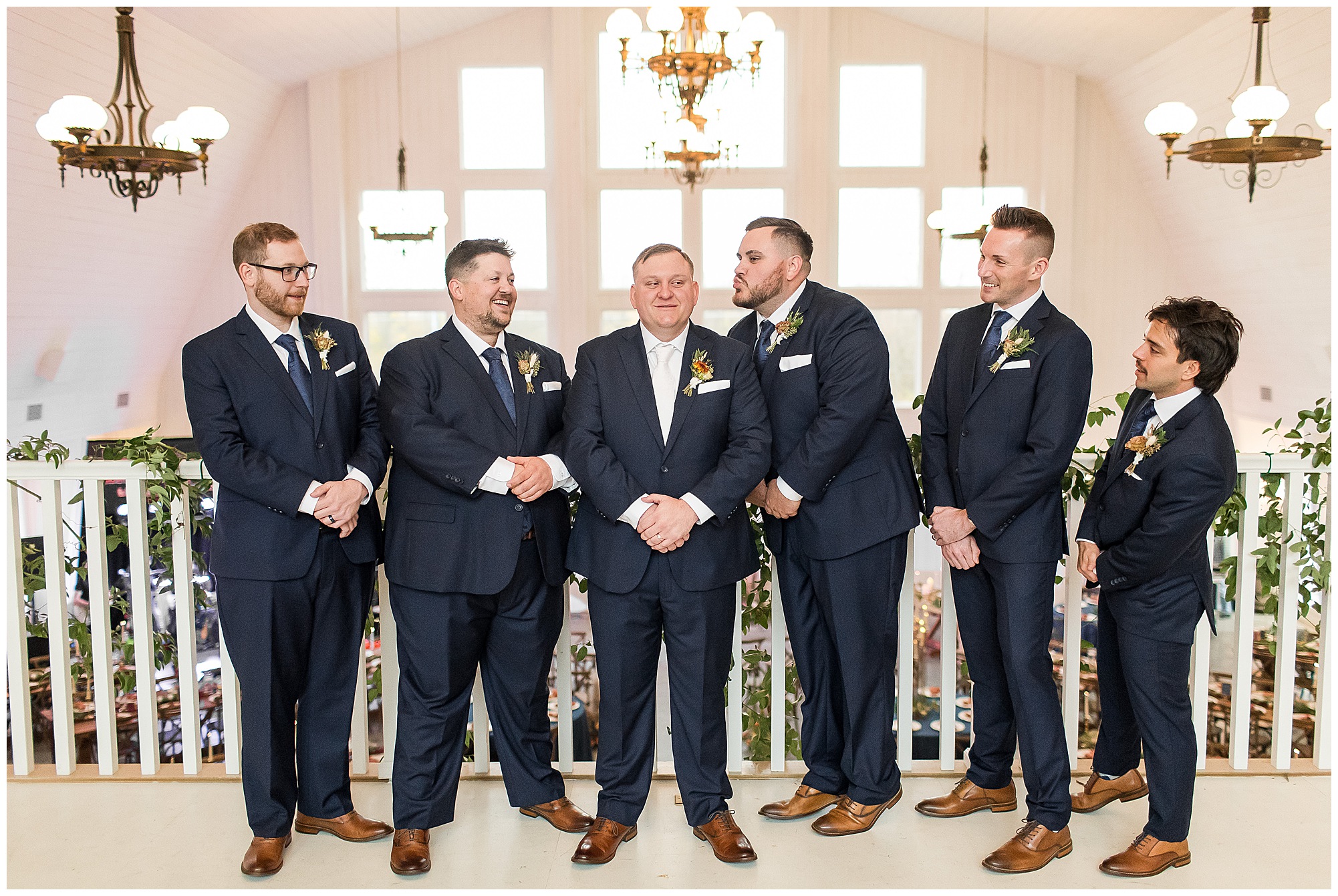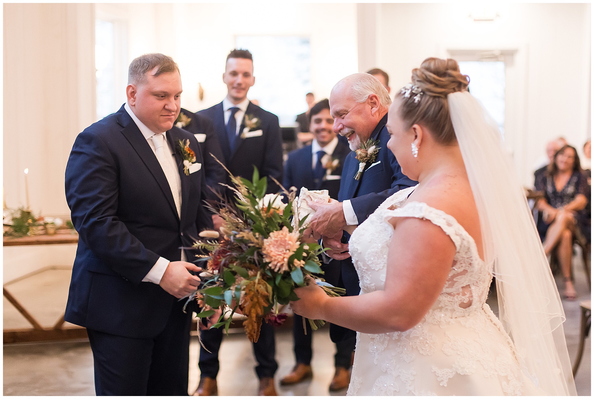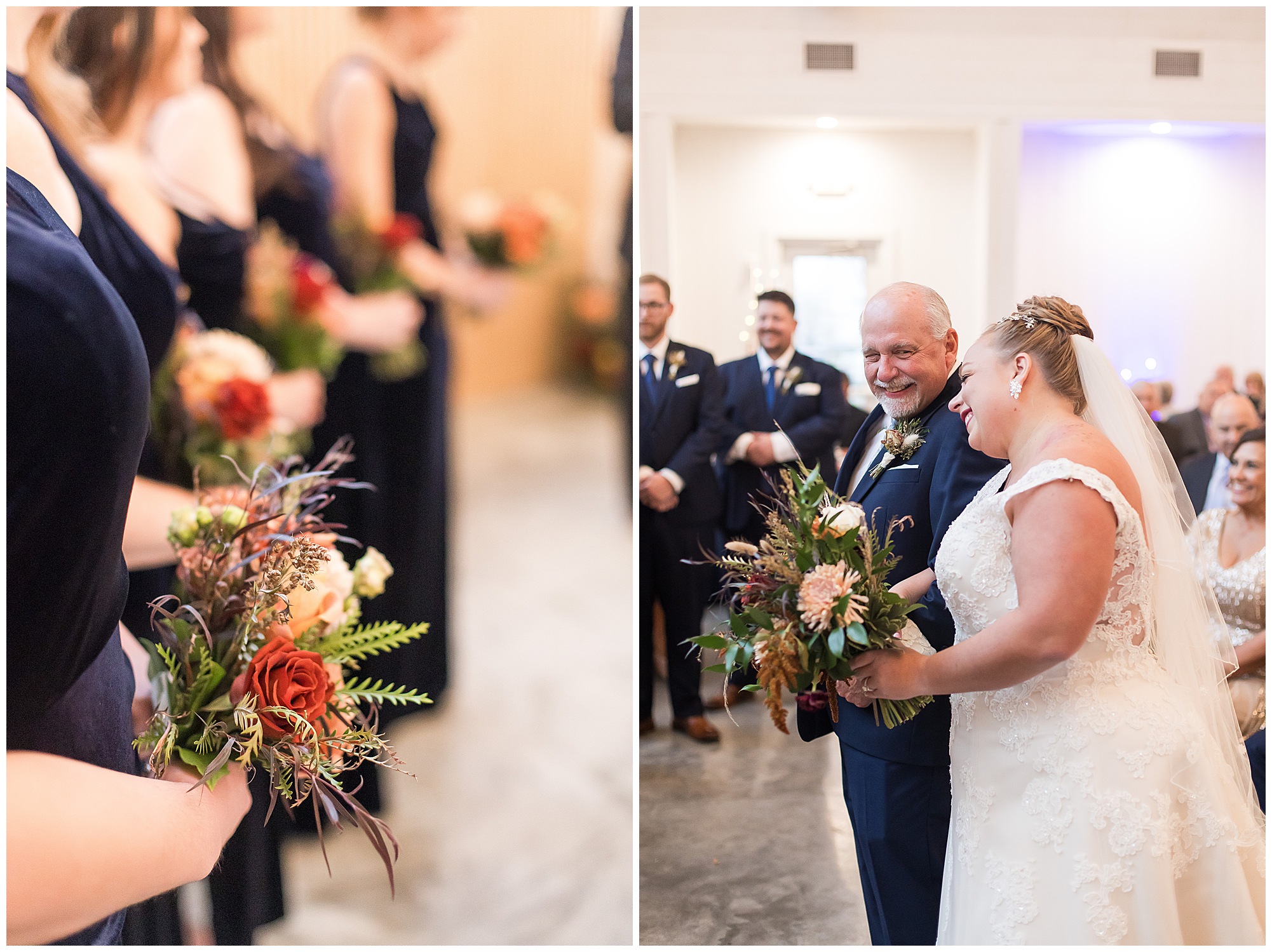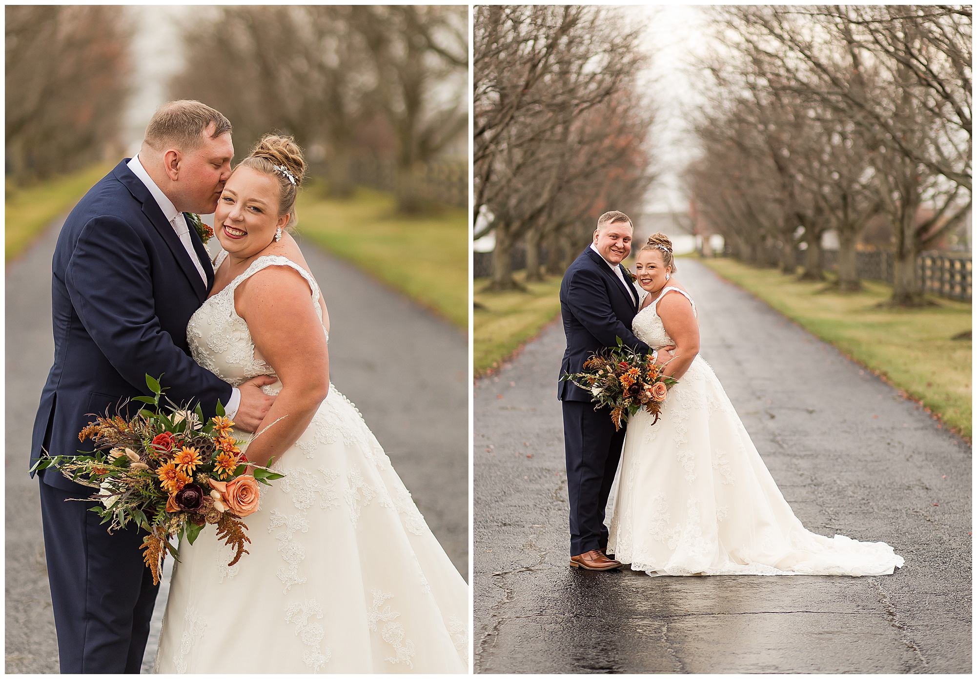 For an early November wedding, we were wishing so badly to have a delightful autumn day. Yet, Mother Nature had a little different of an idea. Right before first looks with Nick and his mom, Kayla and her dad, Rich, as well as Kayla and Nick, the skies opened up and rain began to fall. But, that didn’t stop the tears from falling and the sweet emotions of these moments from happening on the front porch at the farm. Then it was time for a few bridal party photos. We had a quick break from the rain so we took advantage for a few photos with this energetic crew in front of the spectacular entrance to the barn. Kayla’s ladies were dressed in velvet navy gowns in various styles. OBSESSED! Kayla and her bridesmaids all held fabulous fall bouquets filled with oranges, pinks, peaches, and greenery to give so much texture. Nick and his guys wore navy suits with matching ties, while Nick stood out with a white tie. The rain then made its way back upon us so we headed inside to the dazzling inside of Haven on the Farm’s reception space. Luckily for us, the loft space provided ample light and a delightful backdrop for Kayla and Nick’s bridal party portraits. I was not surprised at all when their bridal squad was breaking out into dance and constantly having me laughing throughout photo time! Kayla and Nick surrounded themselves with incredible people who matched their joyful spirit and this was on full display! What a blast! We grabbed a few photos of the soon-to-be Mr. & Mrs. before we looked outside and saw a little break in the weather. I asked Kayla if she wanted to go outside for photos even though there was the possibility of guests seeing her and without hesitation said, “Let’s Go!”