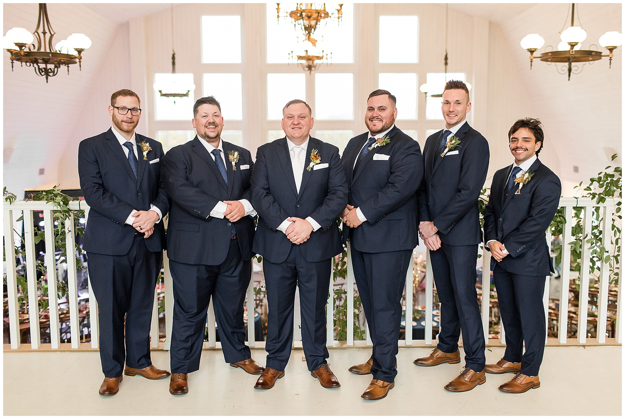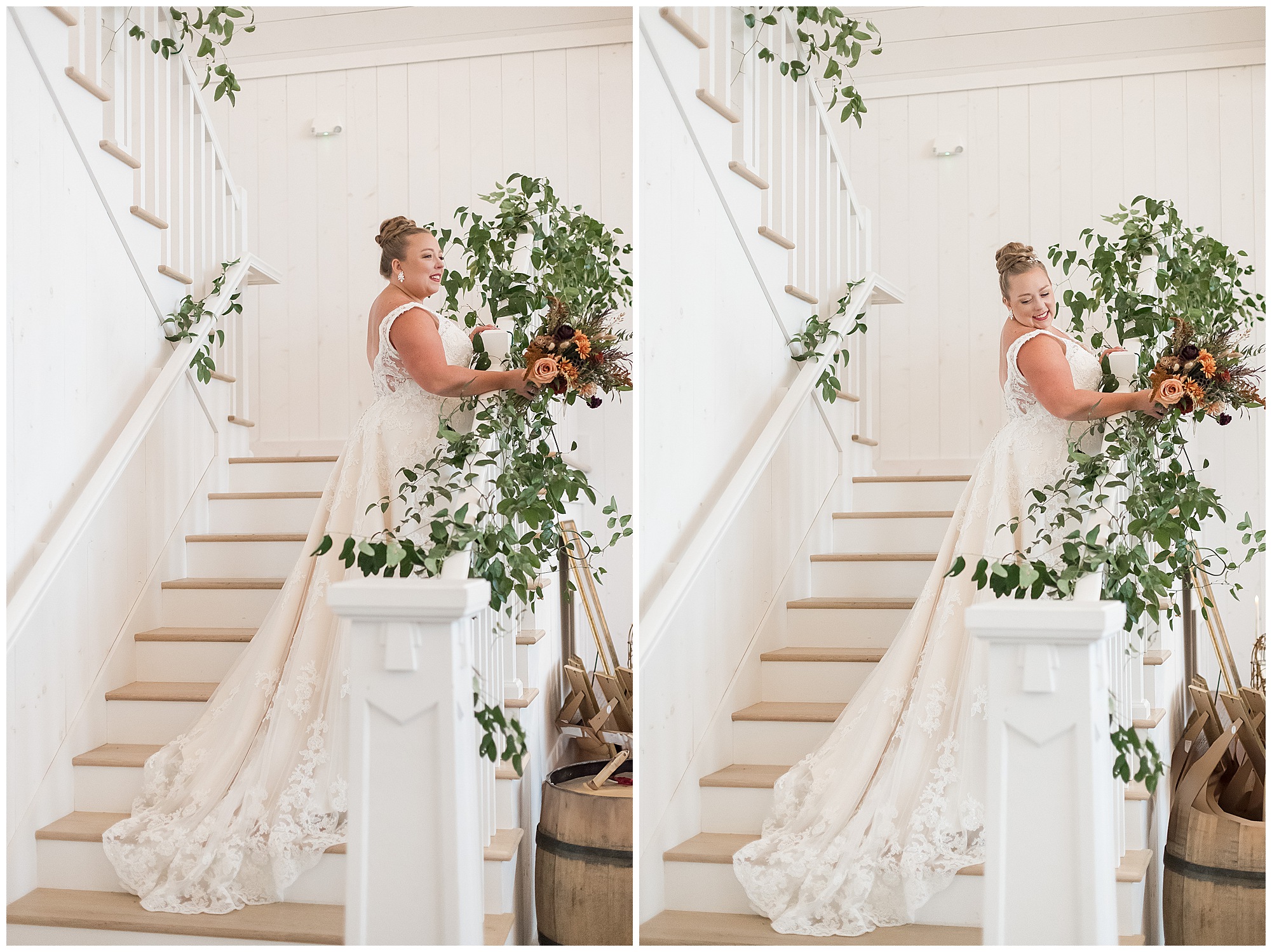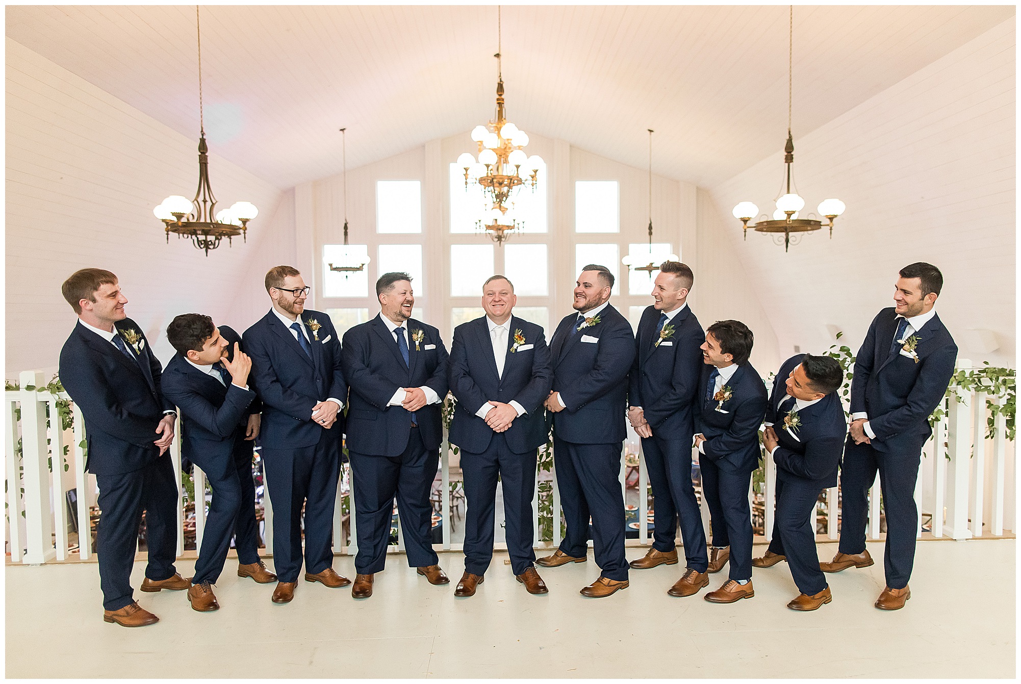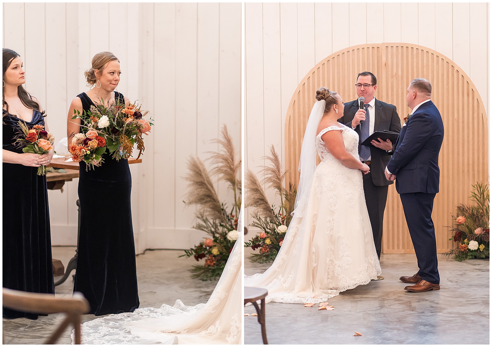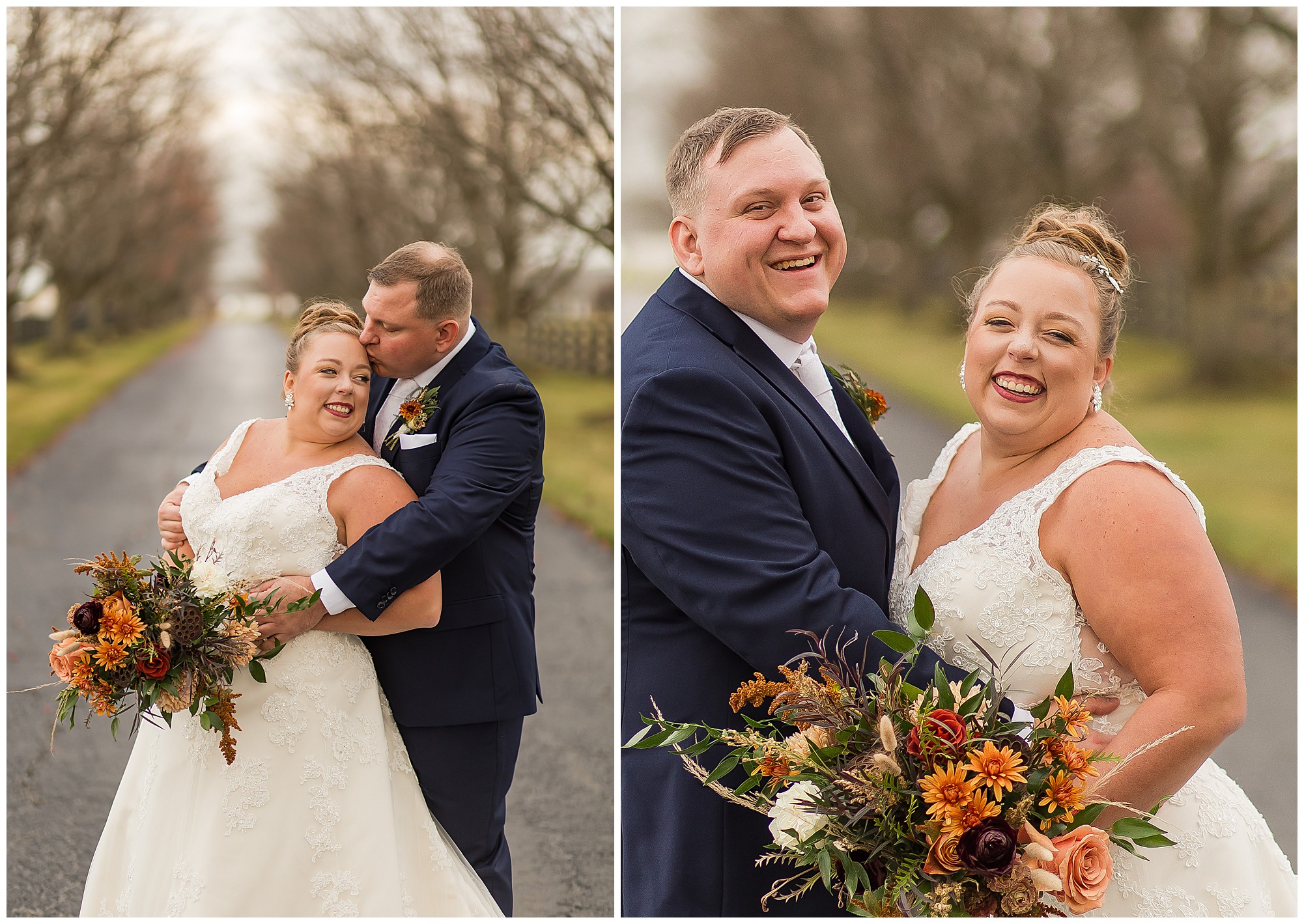 For an early November wedding, we were wishing so badly to have a delightful autumn day. Yet, Mother Nature had a little different of an idea. Right before first looks with Nick and his mom, Kayla and her dad, Rich, as well as Kayla and Nick, the skies opened up and rain began to fall. But, that didn’t stop the tears from falling and the sweet emotions of these moments from happening on the front porch at the farm. Then it was time for a few bridal party photos. We had a quick break from the rain so we took advantage for a few photos with this energetic crew in front of the spectacular entrance to the barn. Kayla’s ladies were dressed in velvet navy gowns in various styles. OBSESSED! Kayla and her bridesmaids all held fabulous fall bouquets filled with oranges, pinks, peaches, and greenery to give so much texture. Nick and his guys wore navy suits with matching ties, while Nick stood out with a white tie. The rain then made its way back upon us so we headed inside to the dazzling inside of Haven on the Farm’s reception space. Luckily for us, the loft space provided ample light and a delightful backdrop for Kayla and Nick’s bridal party portraits. I was not surprised at all when their bridal squad was breaking out into dance and constantly having me laughing throughout photo time! Kayla and Nick surrounded themselves with incredible people who matched their joyful spirit and this was on full display! What a blast! We grabbed a few photos of the soon-to-be Mr. & Mrs. before we looked outside and saw a little break in the weather. I asked Kayla if she wanted to go outside for photos even though there was the possibility of guests seeing her and without hesitation said, “Let’s Go!”