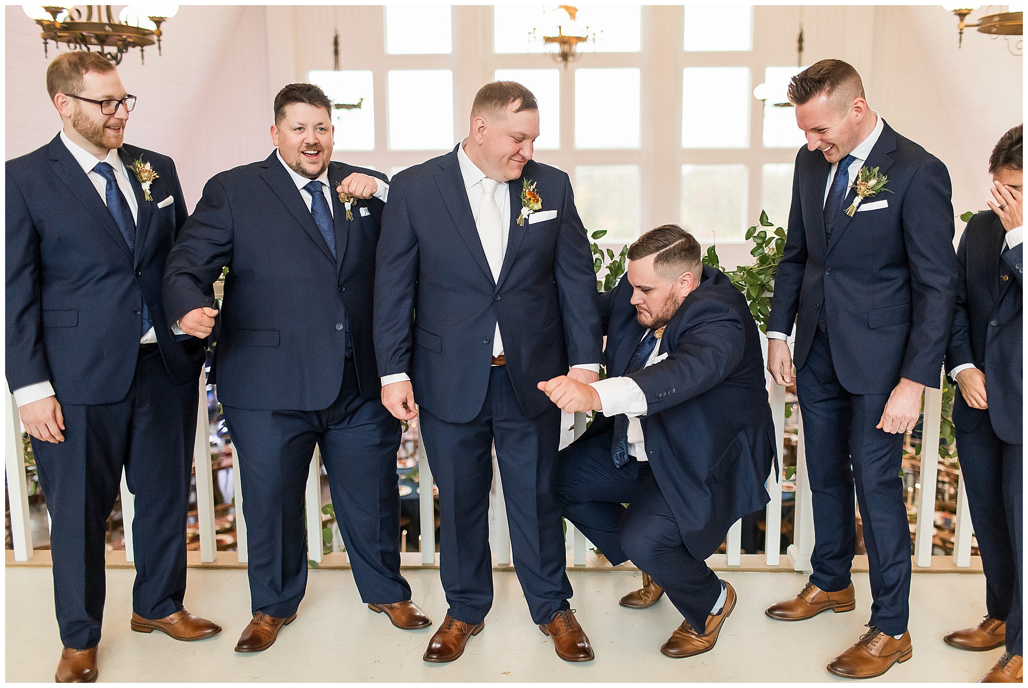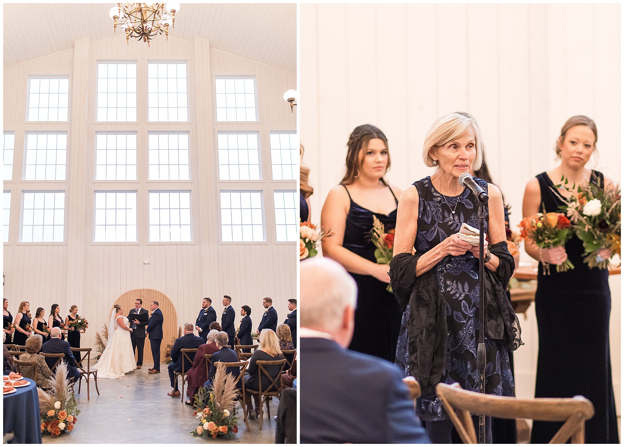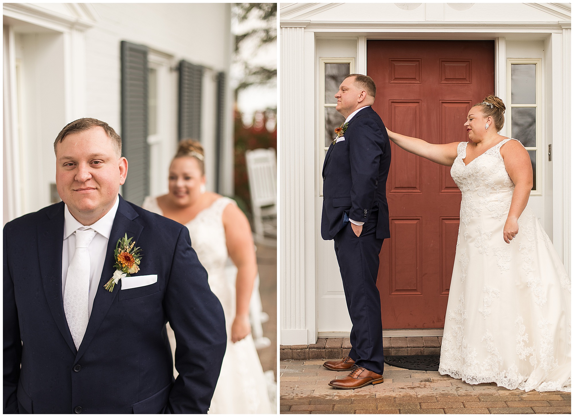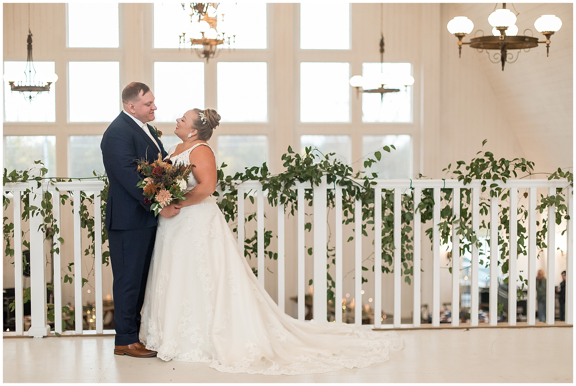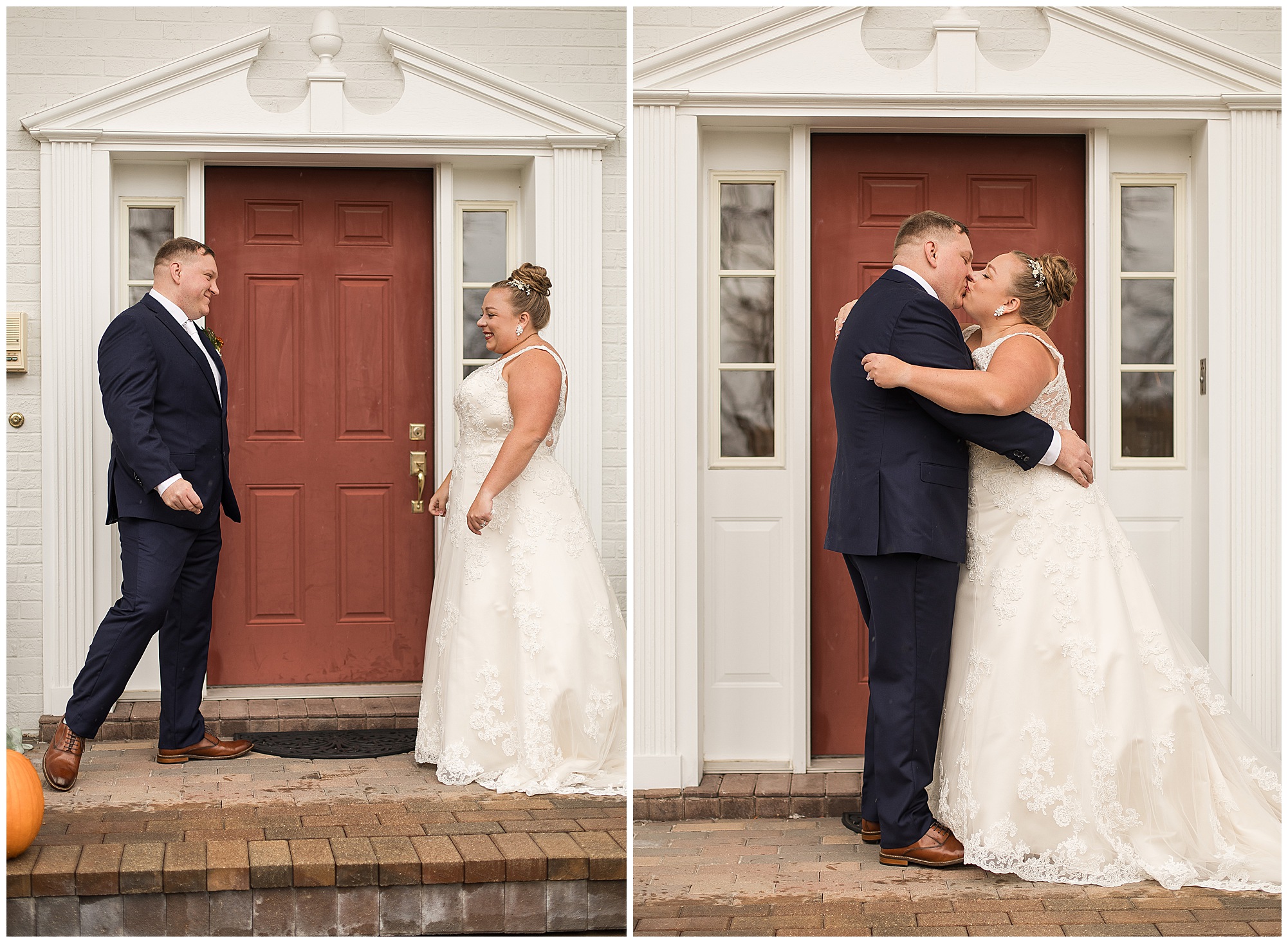 For an early November wedding, we were wishing so badly to have a delightful autumn day. Yet, Mother Nature had a little different of an idea. Right before first looks with Nick and his mom, Kayla and her dad, Rich, as well as Kayla and Nick, the skies opened up and rain began to fall. But, that didn’t stop the tears from falling and the sweet emotions of these moments from happening on the front porch at the farm. Then it was time for a few bridal party photos. We had a quick break from the rain so we took advantage for a few photos with this energetic crew in front of the spectacular entrance to the barn. Kayla’s ladies were dressed in velvet navy gowns in various styles. OBSESSED! Kayla and her bridesmaids all held fabulous fall bouquets filled with oranges, pinks, peaches, and greenery to give so much texture. Nick and his guys wore navy suits with matching ties, while Nick stood out with a white tie. The rain then made its way back upon us so we headed inside to the dazzling inside of Haven on the Farm’s reception space. Luckily for us, the loft space provided ample light and a delightful backdrop for Kayla and Nick’s bridal party portraits. I was not surprised at all when their bridal squad was breaking out into dance and constantly having me laughing throughout photo time! Kayla and Nick surrounded themselves with incredible people who matched their joyful spirit and this was on full display! What a blast! We grabbed a few photos of the soon-to-be Mr. & Mrs. before we looked outside and saw a little break in the weather. I asked Kayla if she wanted to go outside for photos even though there was the possibility of guests seeing her and without hesitation said, “Let’s Go!”