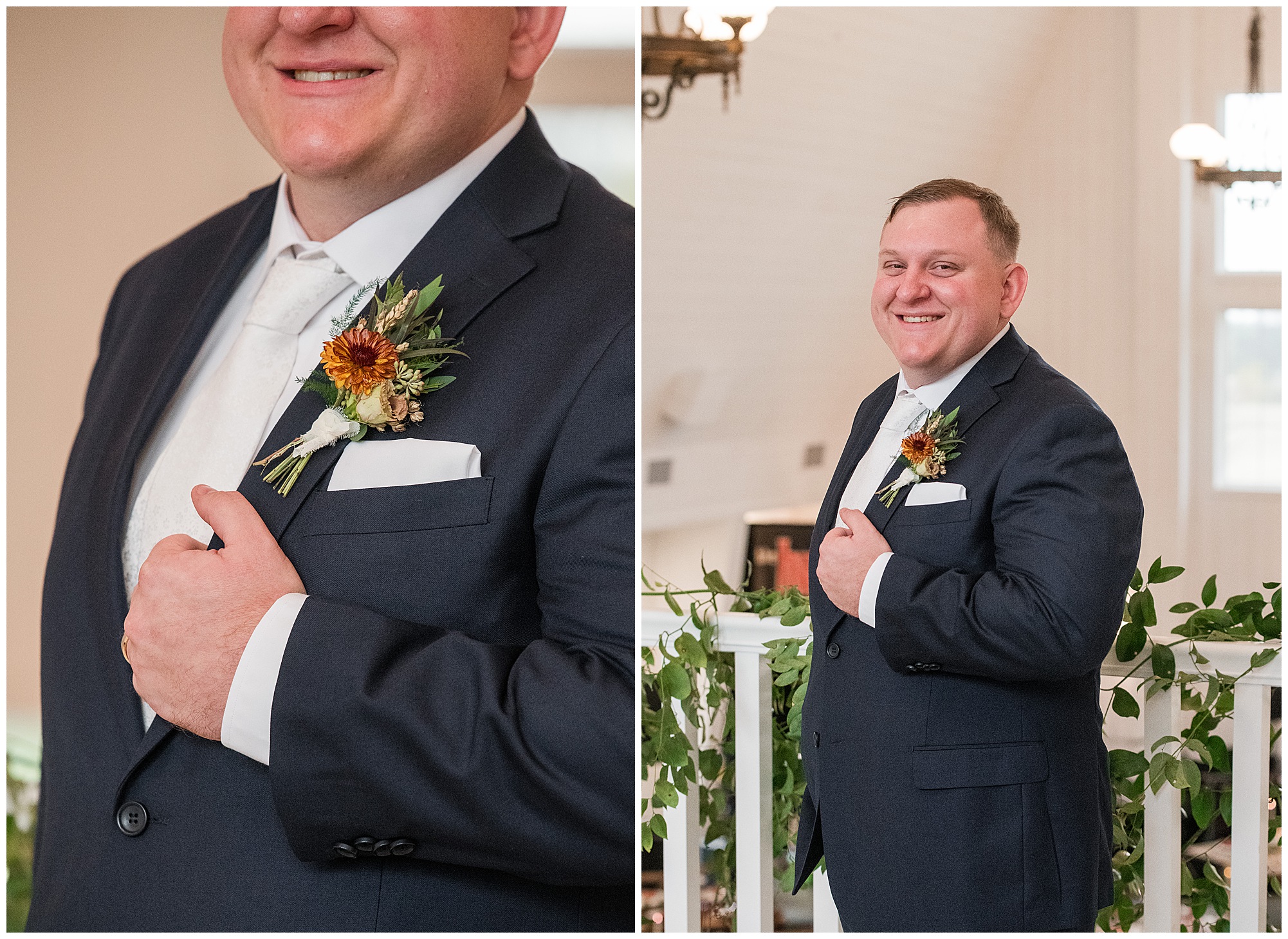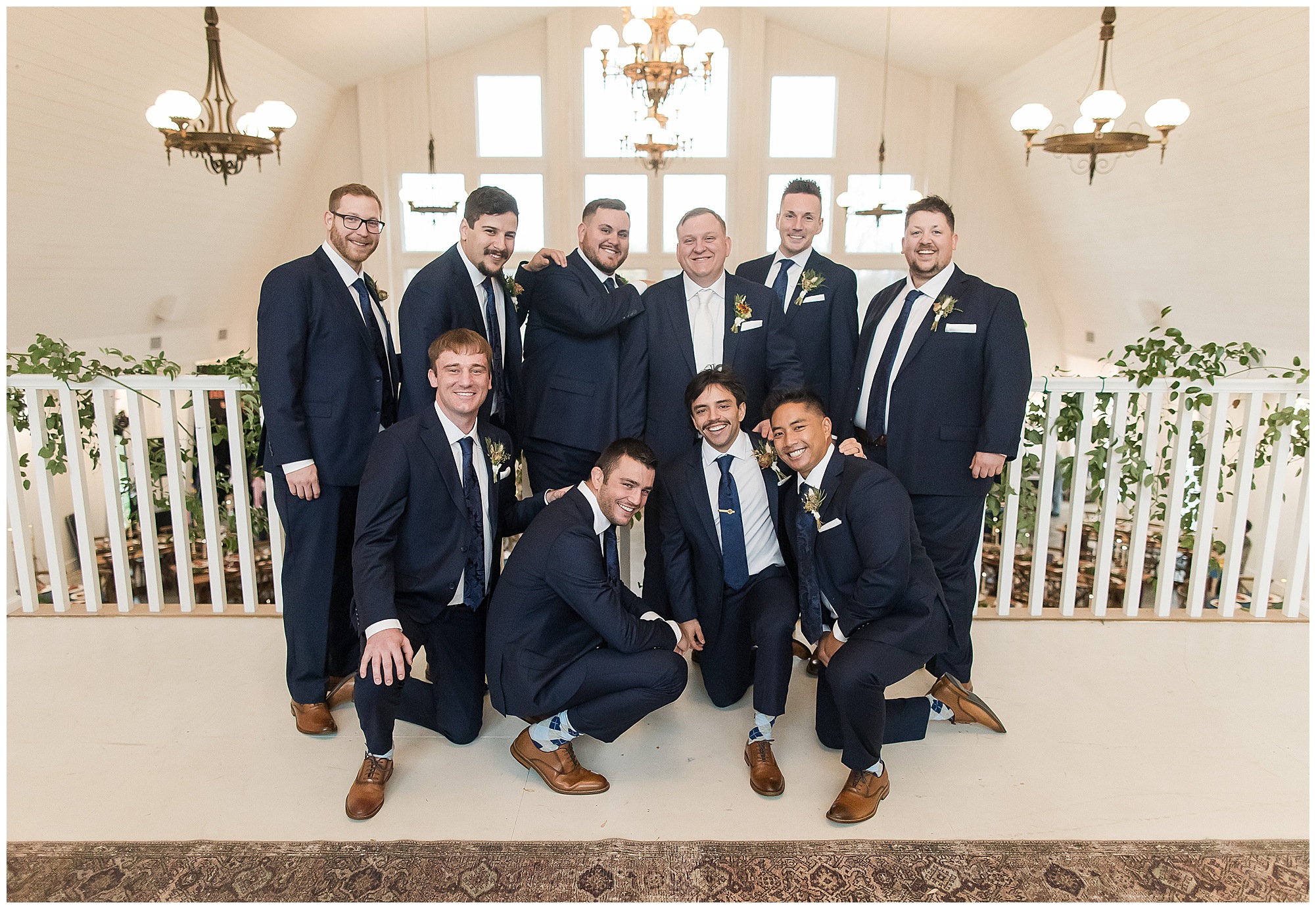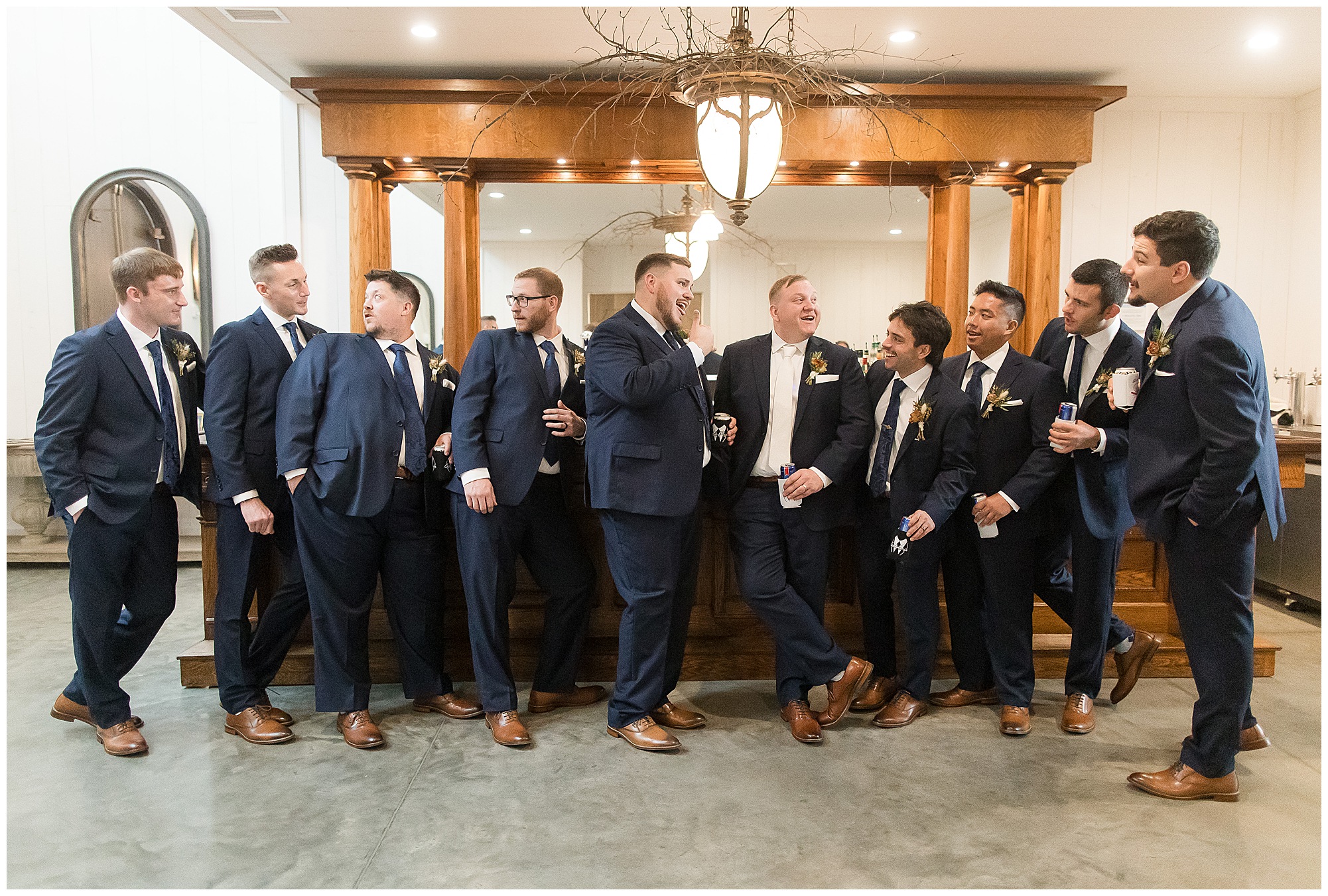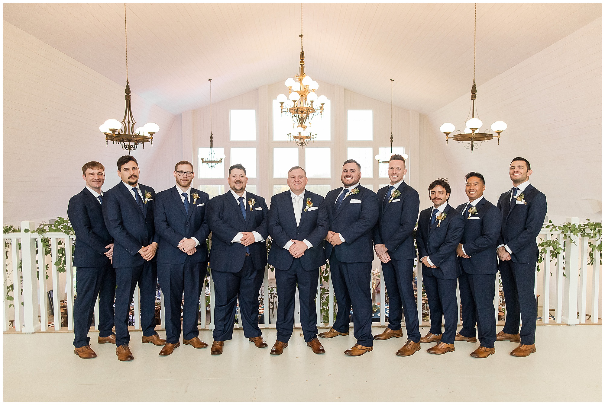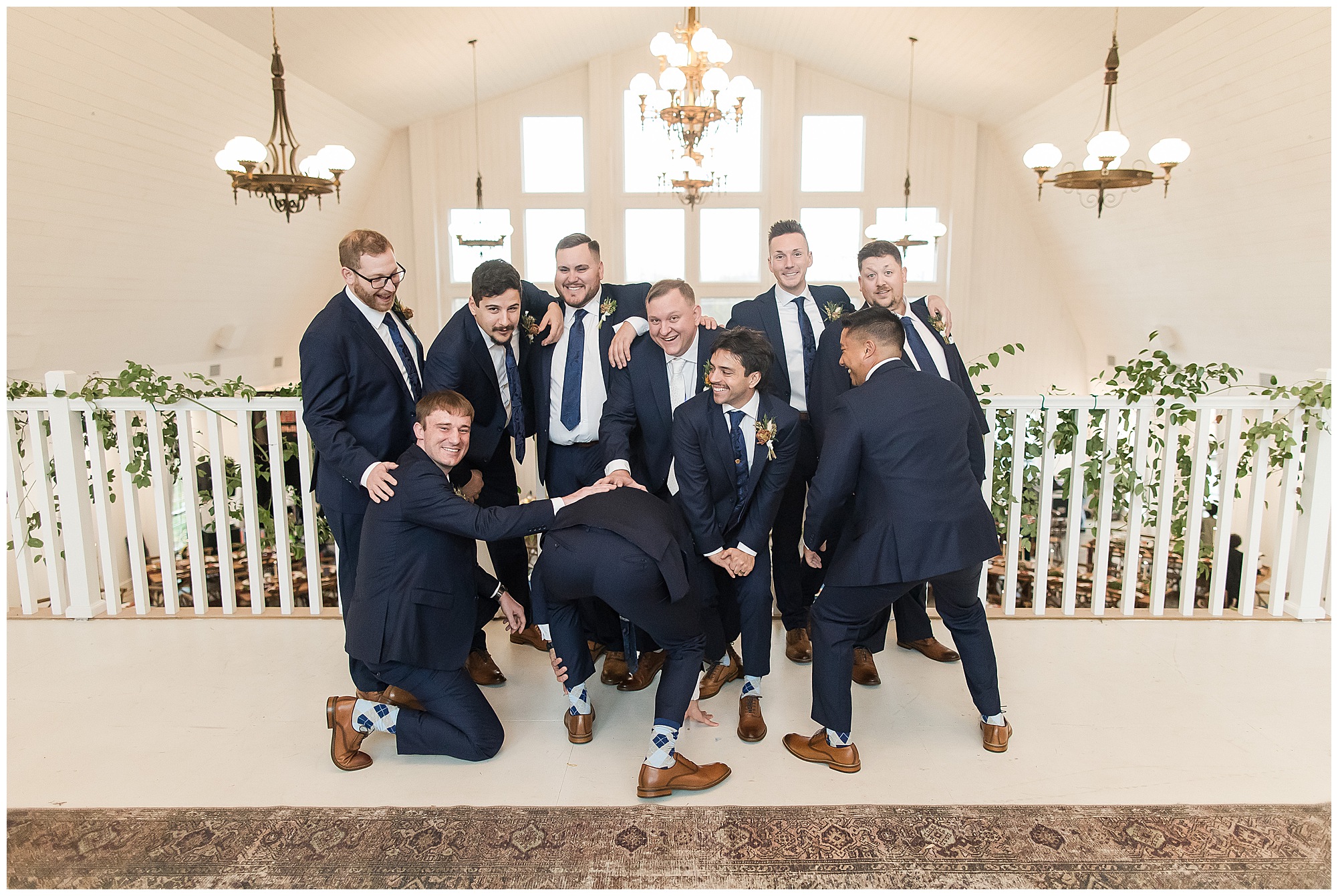 For an early November wedding, we were wishing so badly to have a delightful autumn day. Yet, Mother Nature had a little different of an idea. Right before first looks with Nick and his mom, Kayla and her dad, Rich, as well as Kayla and Nick, the skies opened up and rain began to fall. But, that didn’t stop the tears from falling and the sweet emotions of these moments from happening on the front porch at the farm. Then it was time for a few bridal party photos. We had a quick break from the rain so we took advantage for a few photos with this energetic crew in front of the spectacular entrance to the barn. Kayla’s ladies were dressed in velvet navy gowns in various styles. OBSESSED! Kayla and her bridesmaids all held fabulous fall bouquets filled with oranges, pinks, peaches, and greenery to give so much texture. Nick and his guys wore navy suits with matching ties, while Nick stood out with a white tie. The rain then made its way back upon us so we headed inside to the dazzling inside of Haven on the Farm’s reception space. Luckily for us, the loft space provided ample light and a delightful backdrop for Kayla and Nick’s bridal party portraits. I was not surprised at all when their bridal squad was breaking out into dance and constantly having me laughing throughout photo time! Kayla and Nick surrounded themselves with incredible people who matched their joyful spirit and this was on full display! What a blast! We grabbed a few photos of the soon-to-be Mr. & Mrs. before we looked outside and saw a little break in the weather. I asked Kayla if she wanted to go outside for photos even though there was the possibility of guests seeing her and without hesitation said, “Let’s Go!”
