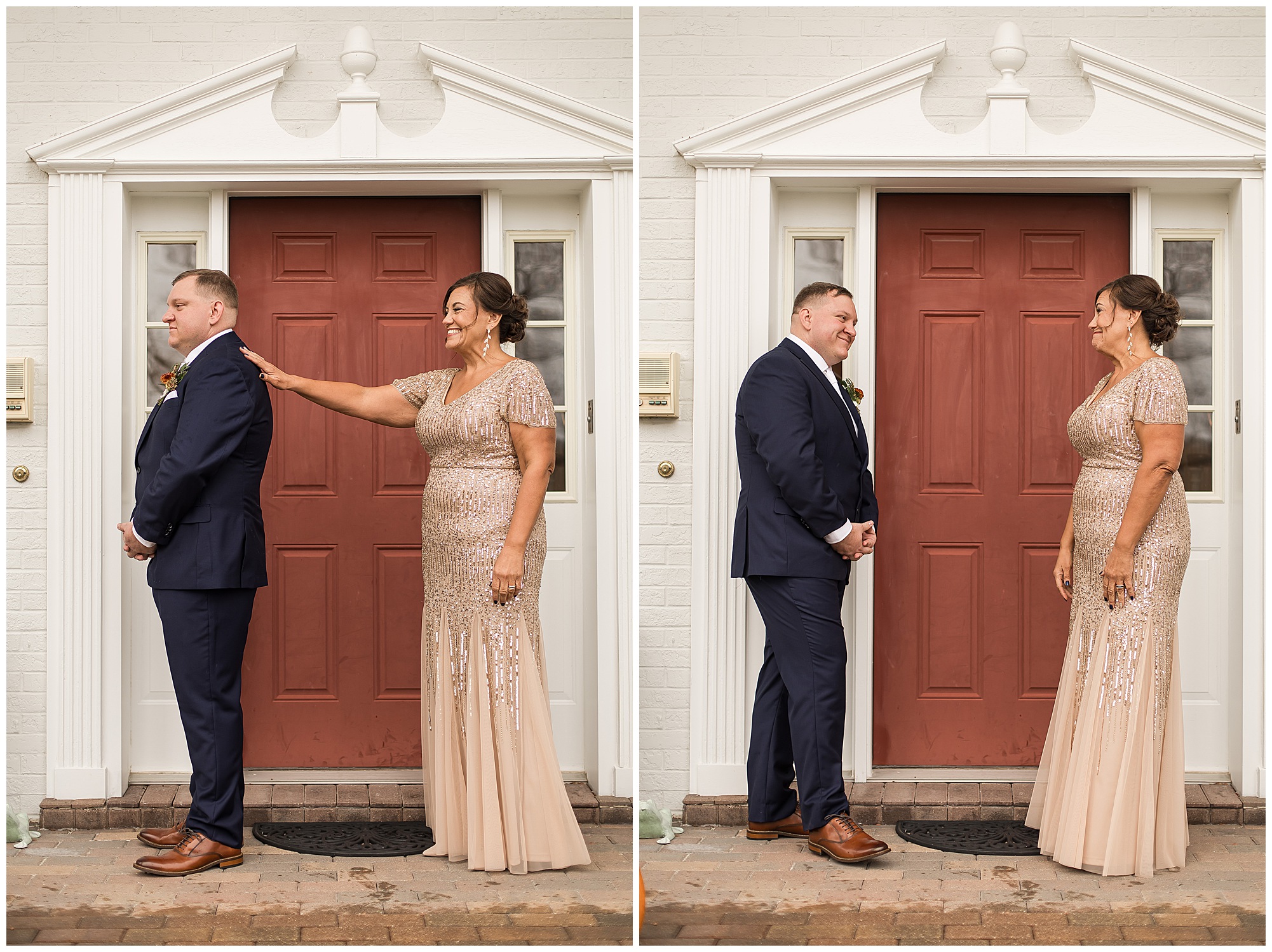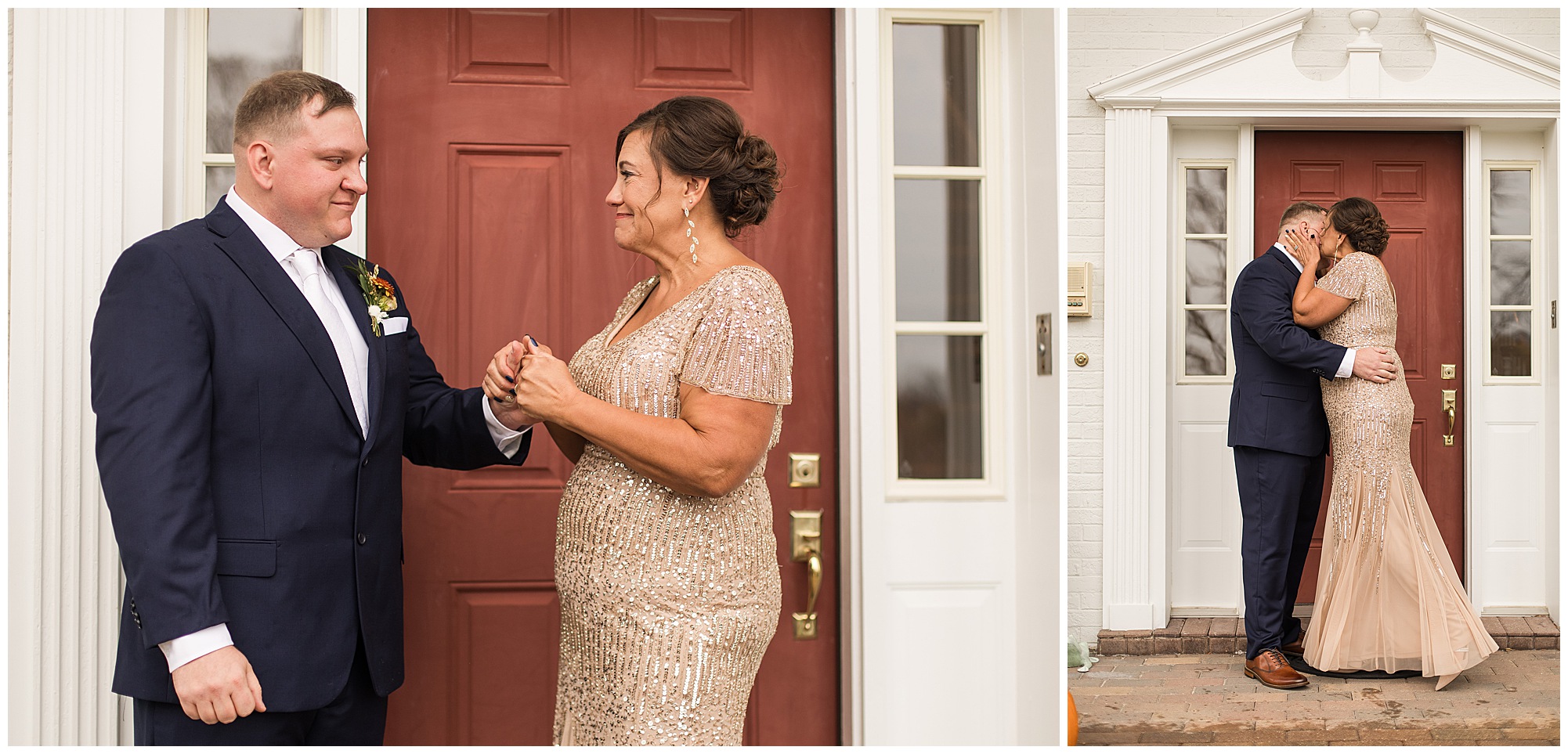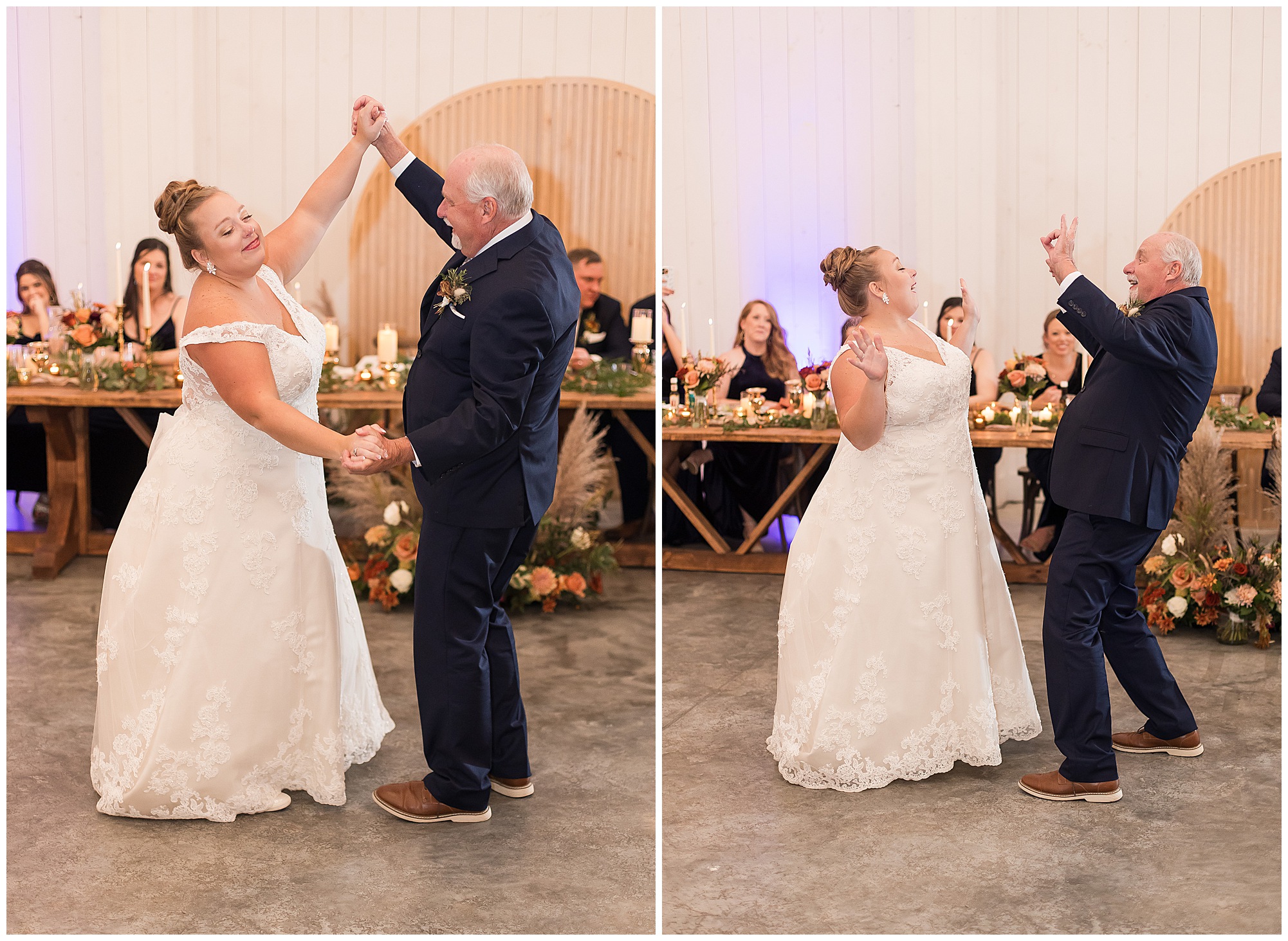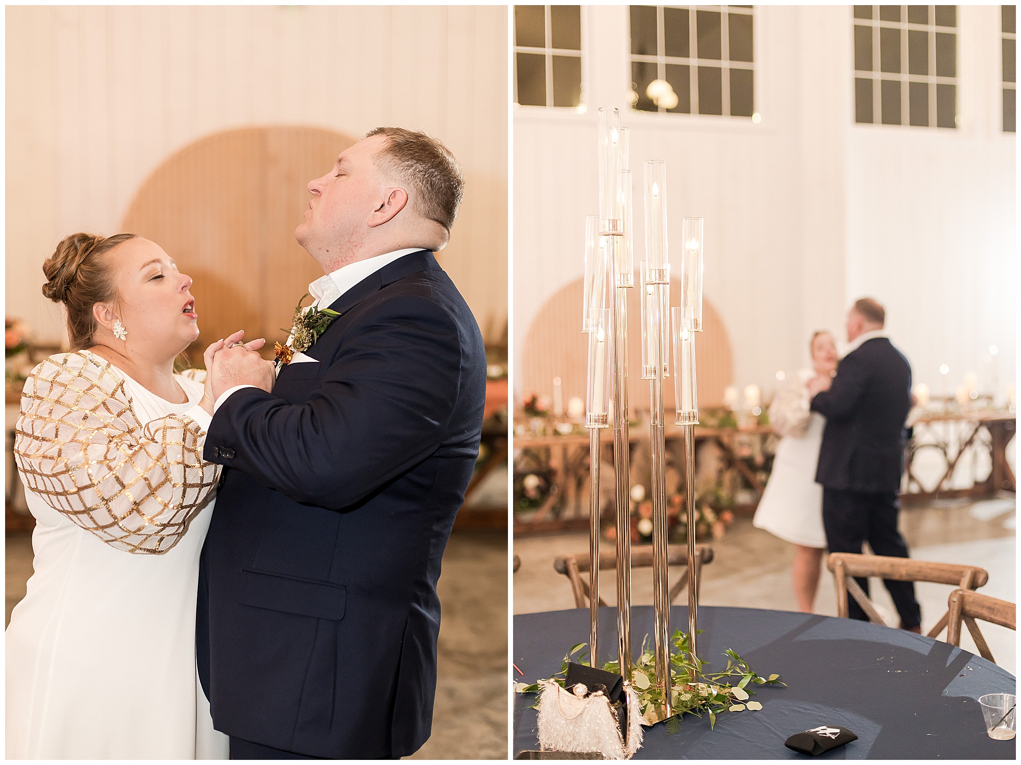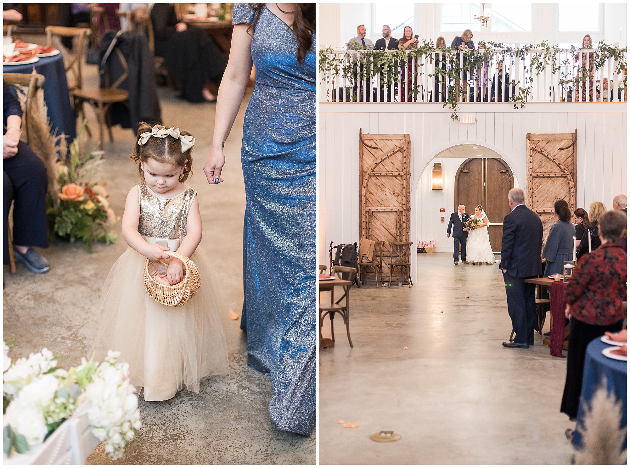 For an early November wedding, we were wishing so badly to have a delightful autumn day. Yet, Mother Nature had a little different of an idea. Right before first looks with Nick and his mom, Kayla and her dad, Rich, as well as Kayla and Nick, the skies opened up and rain began to fall. But, that didn’t stop the tears from falling and the sweet emotions of these moments from happening on the front porch at the farm. Then it was time for a few bridal party photos. We had a quick break from the rain so we took advantage for a few photos with this energetic crew in front of the spectacular entrance to the barn. Kayla’s ladies were dressed in velvet navy gowns in various styles. OBSESSED! Kayla and her bridesmaids all held fabulous fall bouquets filled with oranges, pinks, peaches, and greenery to give so much texture. Nick and his guys wore navy suits with matching ties, while Nick stood out with a white tie. The rain then made its way back upon us so we headed inside to the dazzling inside of Haven on the Farm’s reception space. Luckily for us, the loft space provided ample light and a delightful backdrop for Kayla and Nick’s bridal party portraits. I was not surprised at all when their bridal squad was breaking out into dance and constantly having me laughing throughout photo time! Kayla and Nick surrounded themselves with incredible people who matched their joyful spirit and this was on full display! What a blast! We grabbed a few photos of the soon-to-be Mr. & Mrs. before we looked outside and saw a little break in the weather. I asked Kayla if she wanted to go outside for photos even though there was the possibility of guests seeing her and without hesitation said, “Let’s Go!”