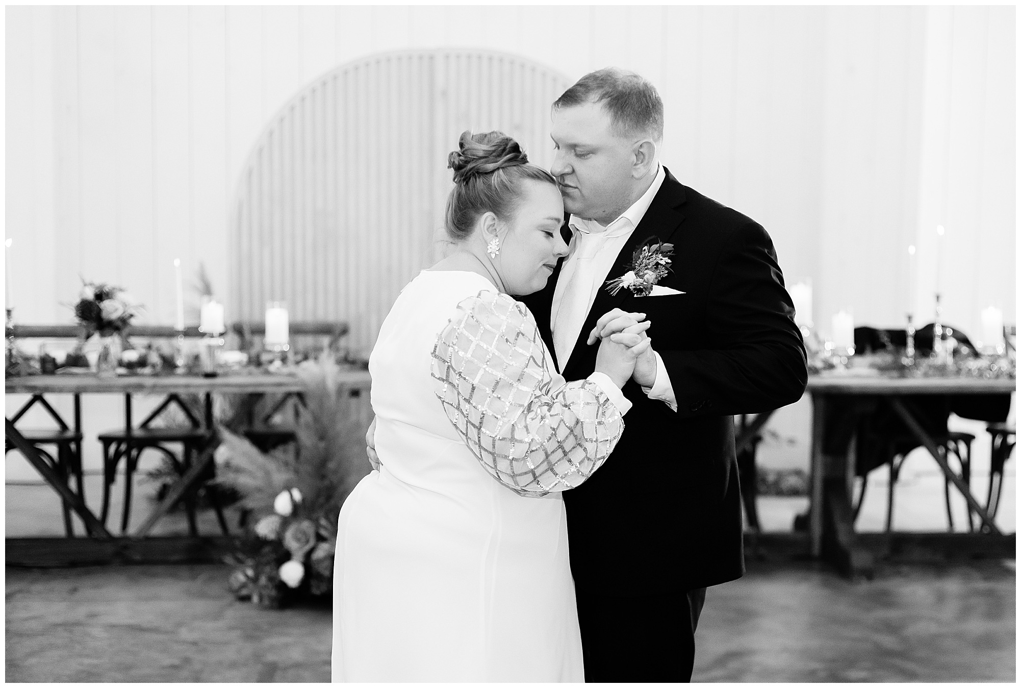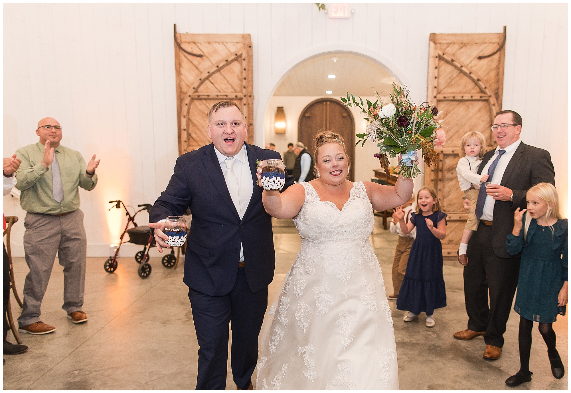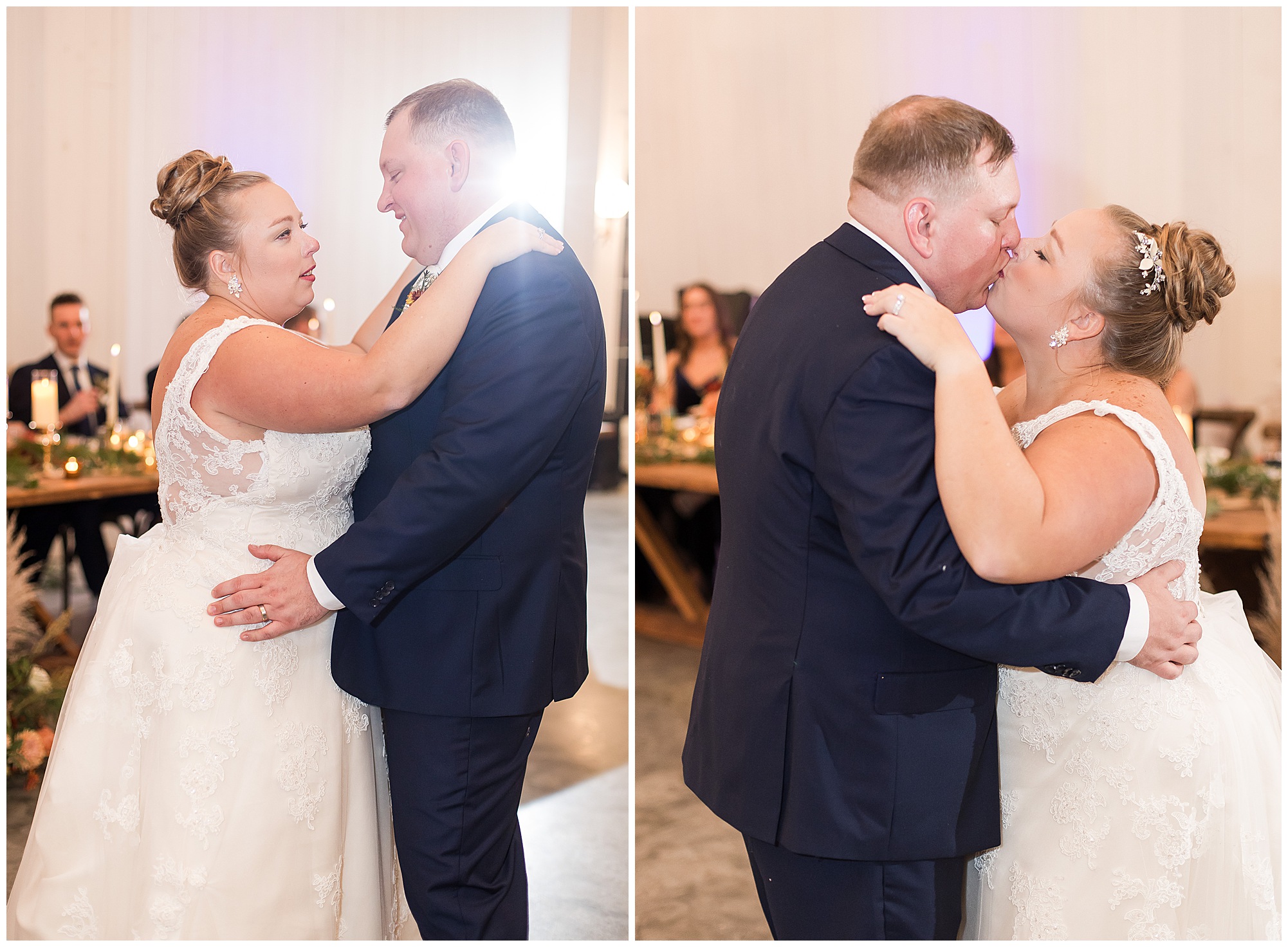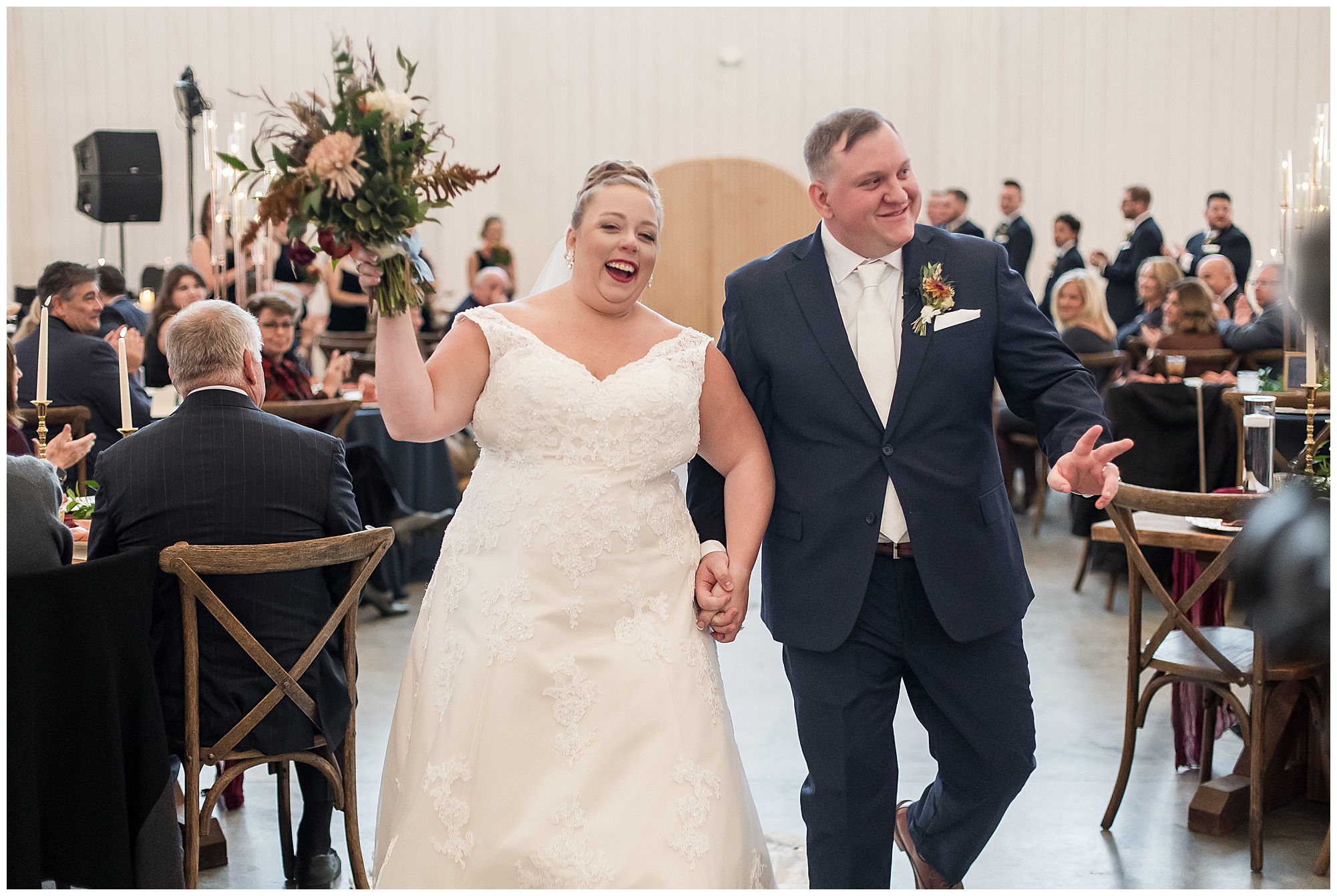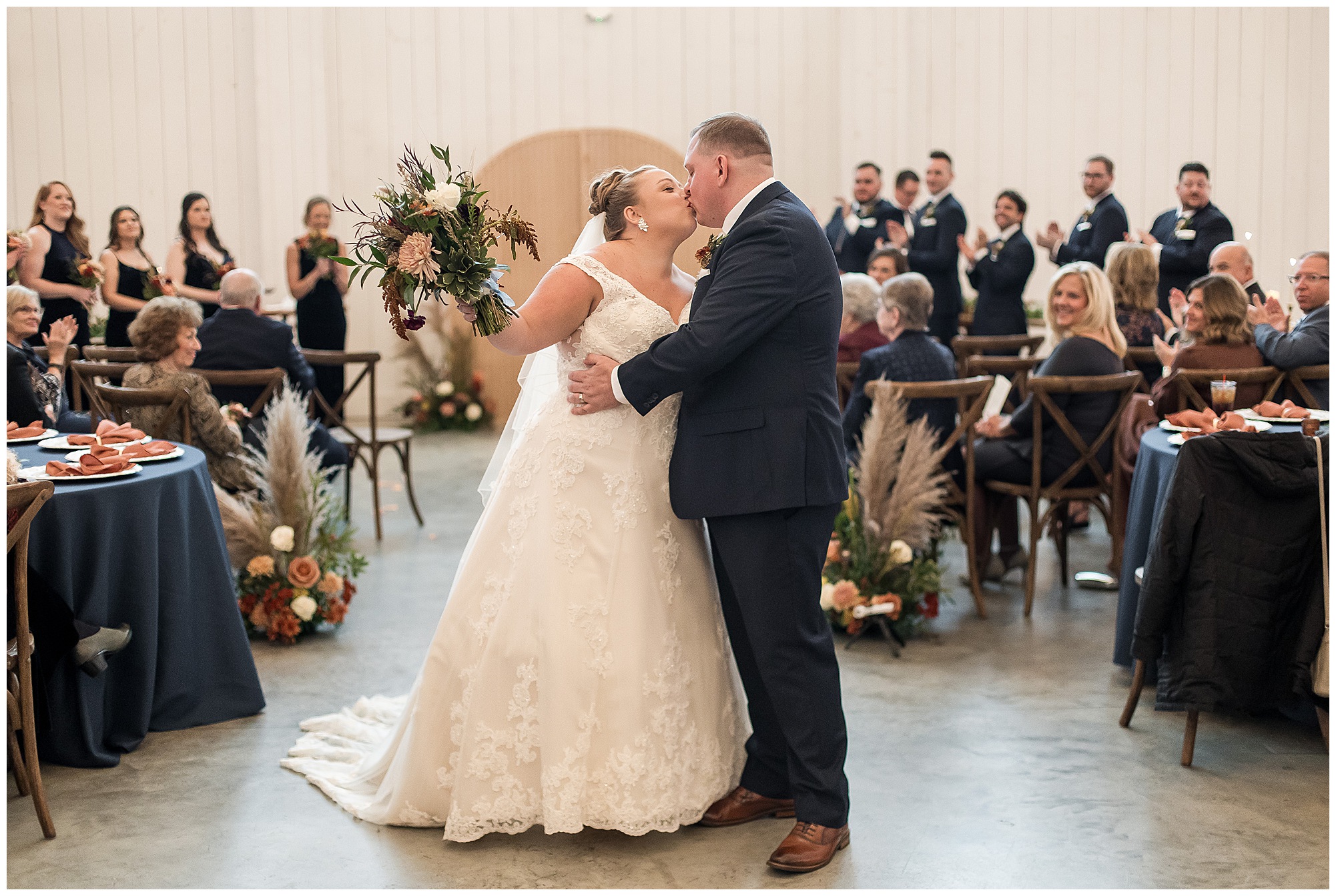 Guests gathered at their farmhouse tables scattered around the barn as they awaited Kayla to make her way down the aisle with her dad. Almost eight years in the making, this was absolutely a moment everyone in the room was waiting for! Nick fought back tears as he saw his bride walking his way with her glowing smile. And within a few minutes, Kayla was also fighting her emotions with the mention of her mother and the long journey of her and Nick’s relationship. But, there were also so many laughs throughout their nuptials. Which is exactly how Kayla and Nick’s marriage will play out. So many laughs and lifting one another up in any time of need. Just like they have done over the years leading up to wedding day. After exchanging their vows and rings, they shared a kiss and became Mr. & Mrs. Hoefling!