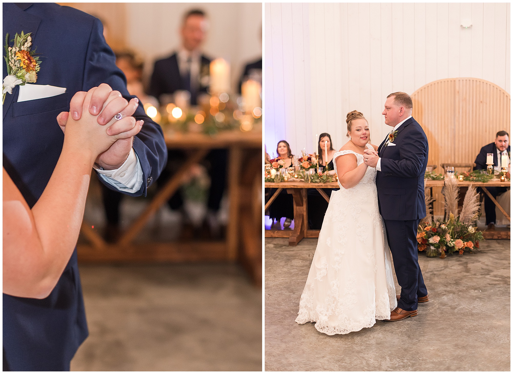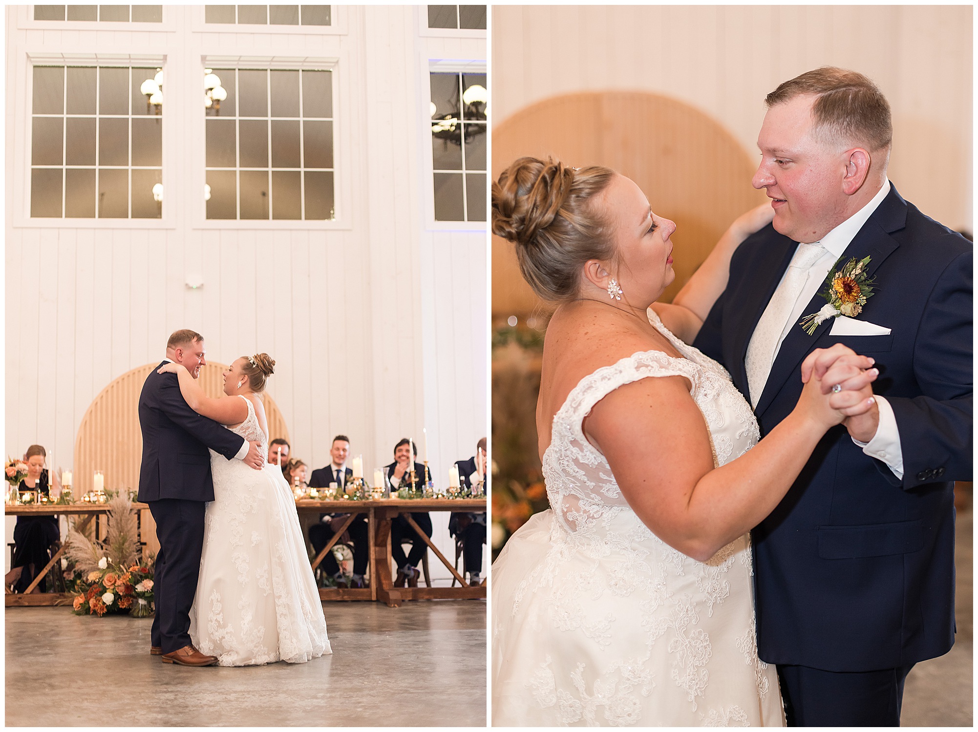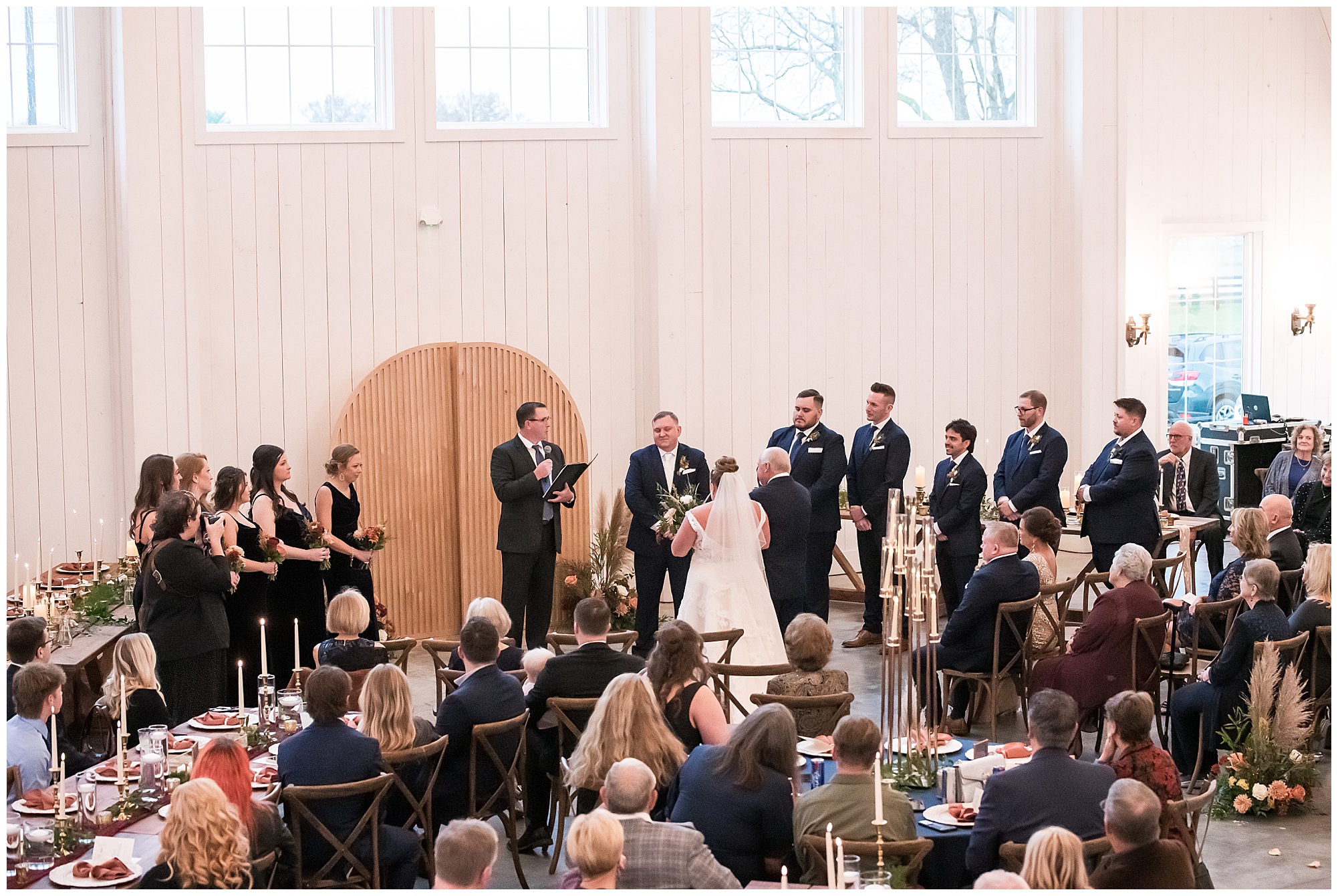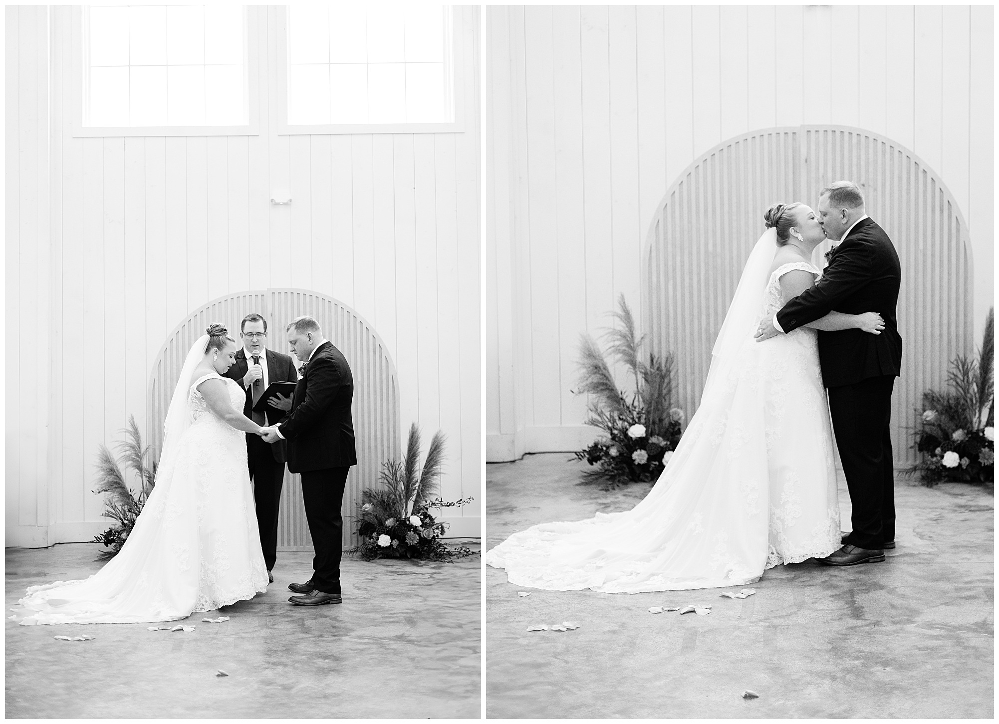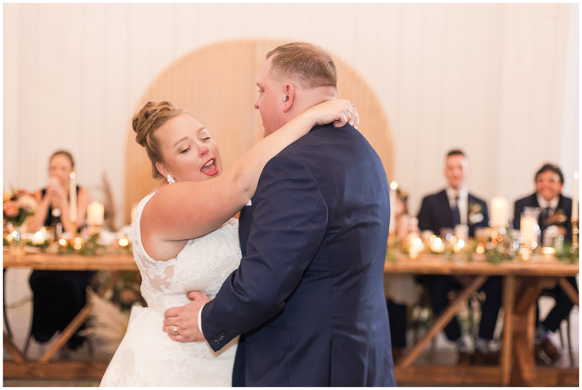 Guests gathered at their farmhouse tables scattered around the barn as they awaited Kayla to make her way down the aisle with her dad. Almost eight years in the making, this was absolutely a moment everyone in the room was waiting for! Nick fought back tears as he saw his bride walking his way with her glowing smile. And within a few minutes, Kayla was also fighting her emotions with the mention of her mother and the long journey of her and Nick’s relationship. But, there were also so many laughs throughout their nuptials. Which is exactly how Kayla and Nick’s marriage will play out. So many laughs and lifting one another up in any time of need. Just like they have done over the years leading up to wedding day. After exchanging their vows and rings, they shared a kiss and became Mr. & Mrs. Hoefling!