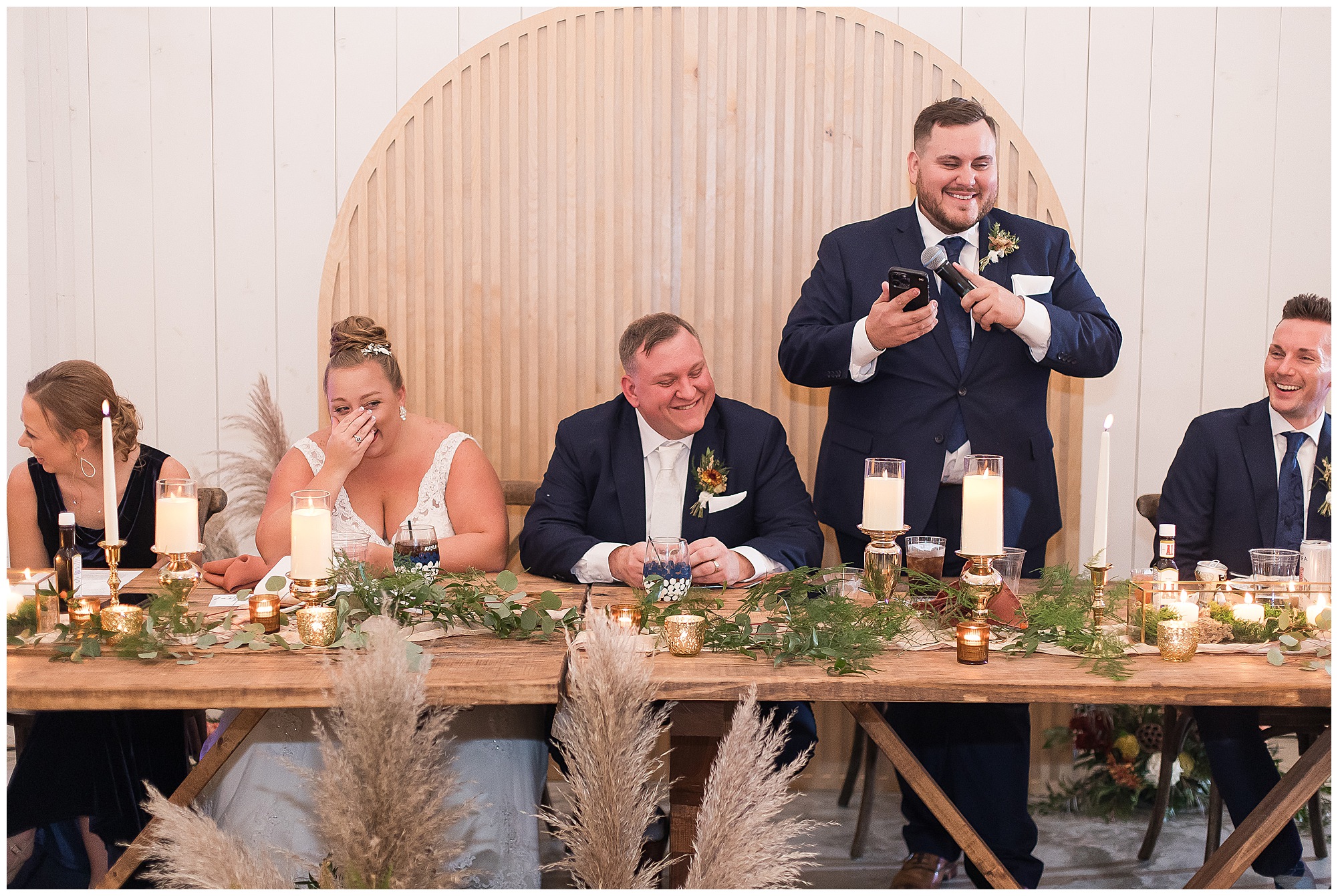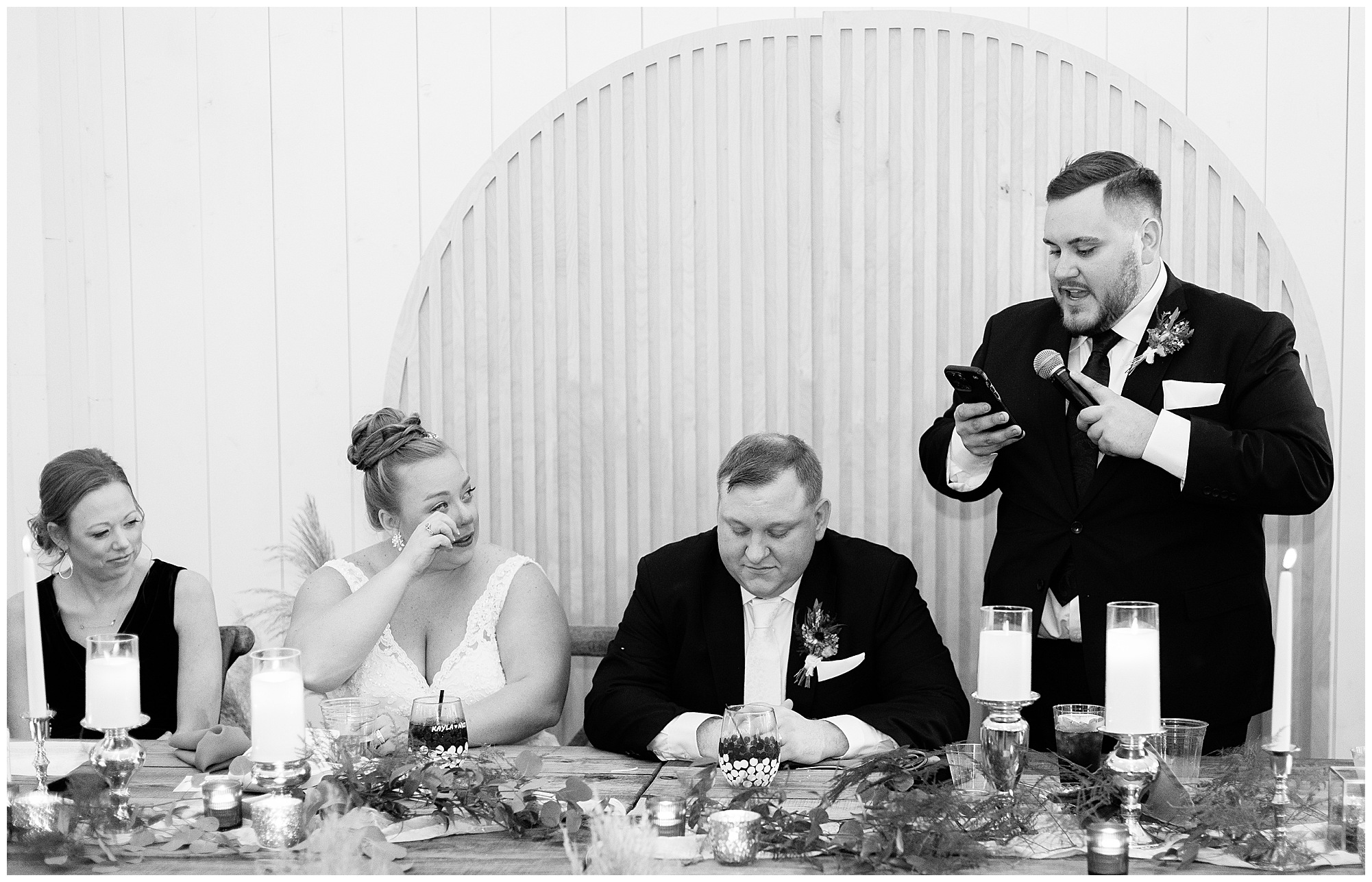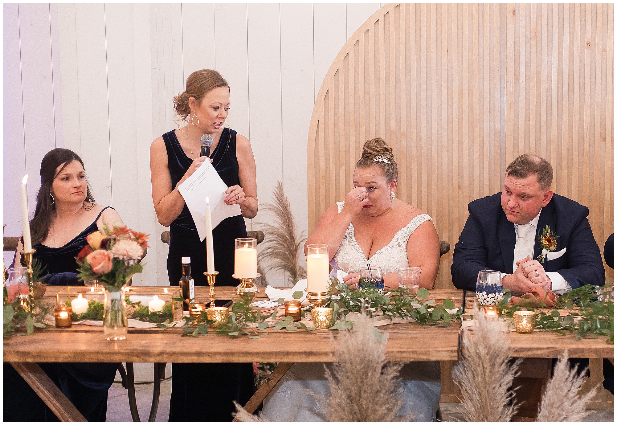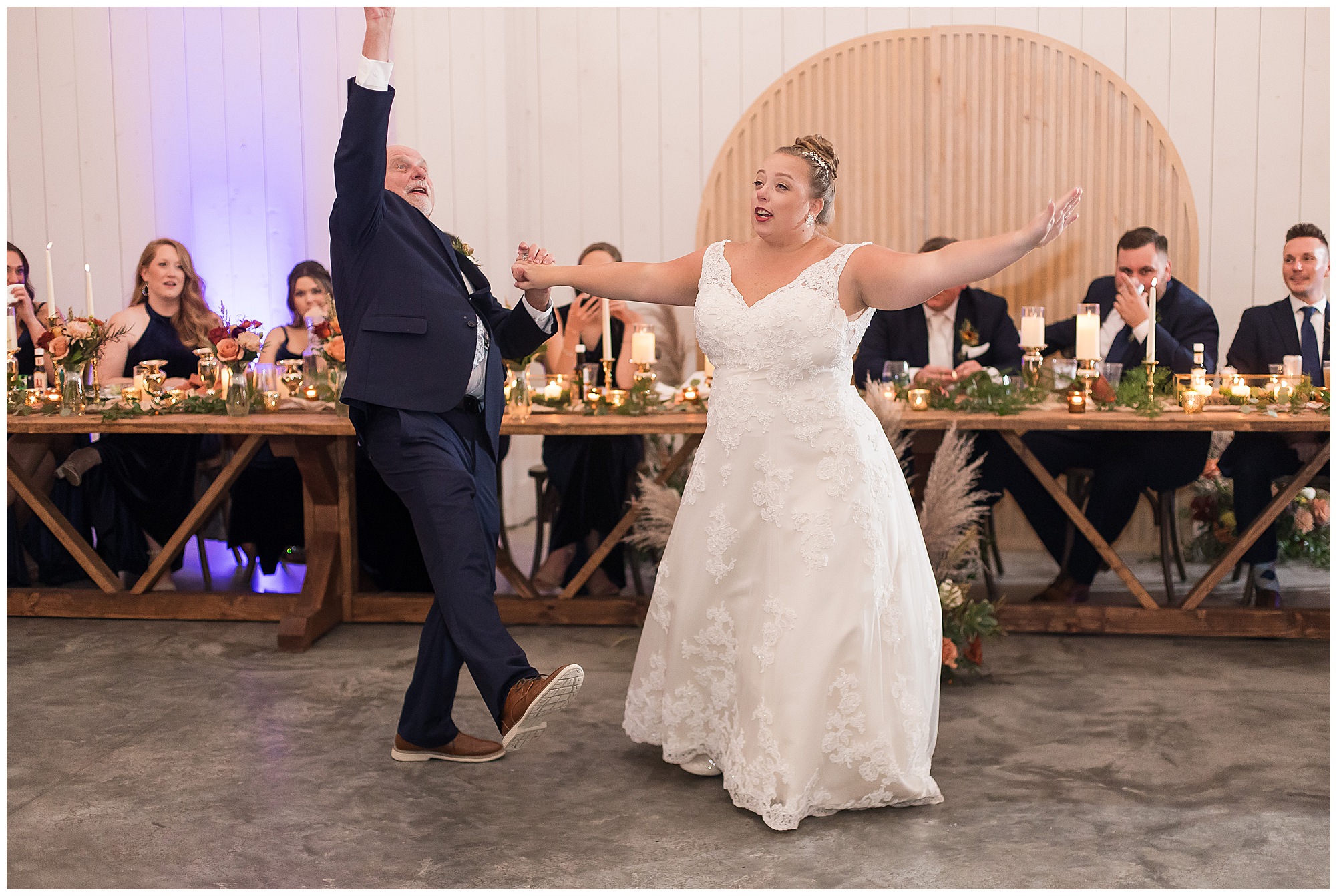 Guests gathered at their farmhouse tables scattered around the barn as they awaited Kayla to make her way down the aisle with her dad. Almost eight years in the making, this was absolutely a moment everyone in the room was waiting for! Nick fought back tears as he saw his bride walking his way with her glowing smile. And within a few minutes, Kayla was also fighting her emotions with the mention of her mother and the long journey of her and Nick’s relationship. But, there were also so many laughs throughout their nuptials. Which is exactly how Kayla and Nick’s marriage will play out. So many laughs and lifting one another up in any time of need. Just like they have done over the years leading up to wedding day. After exchanging their vows and rings, they shared a kiss and became Mr. & Mrs. Hoefling!
