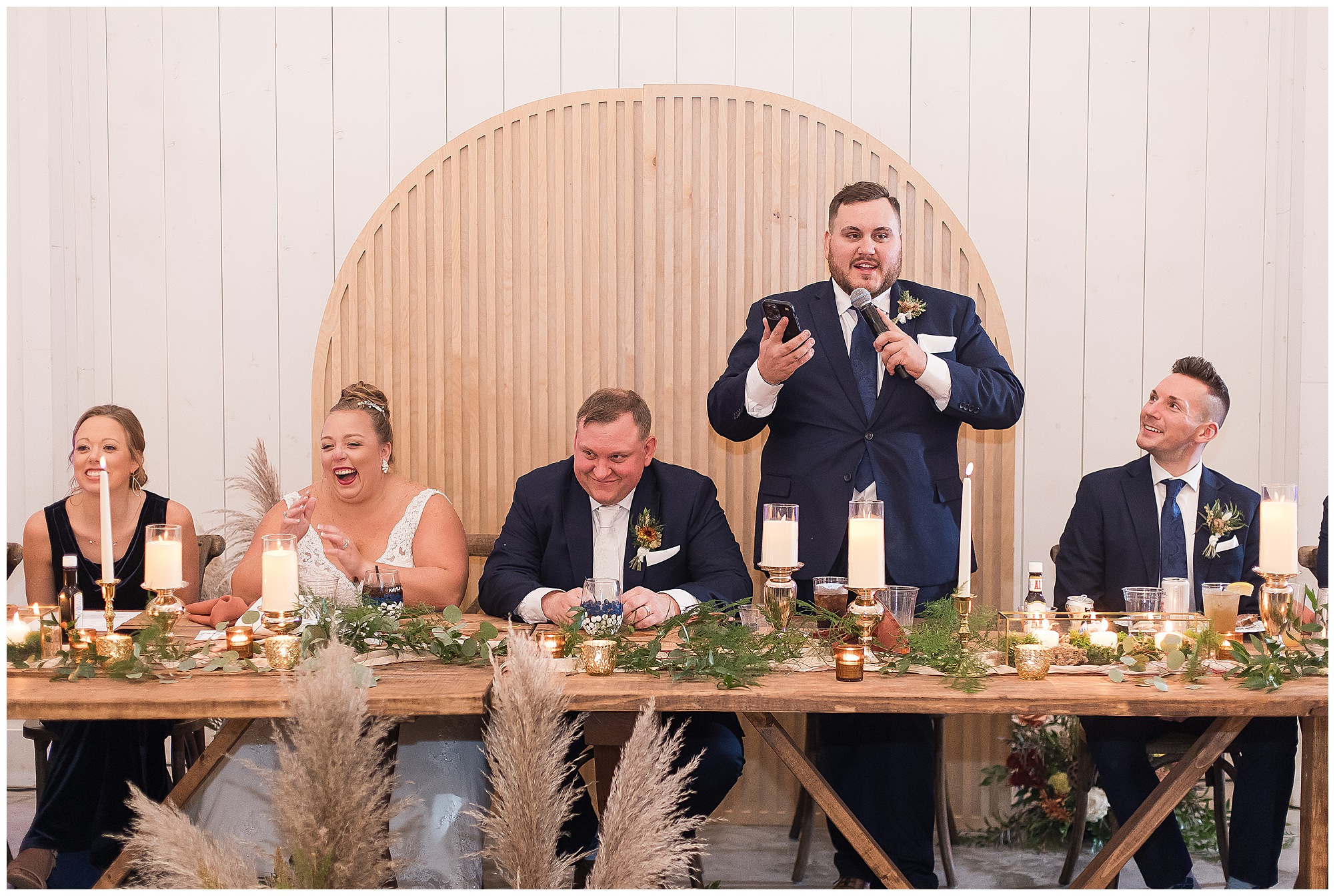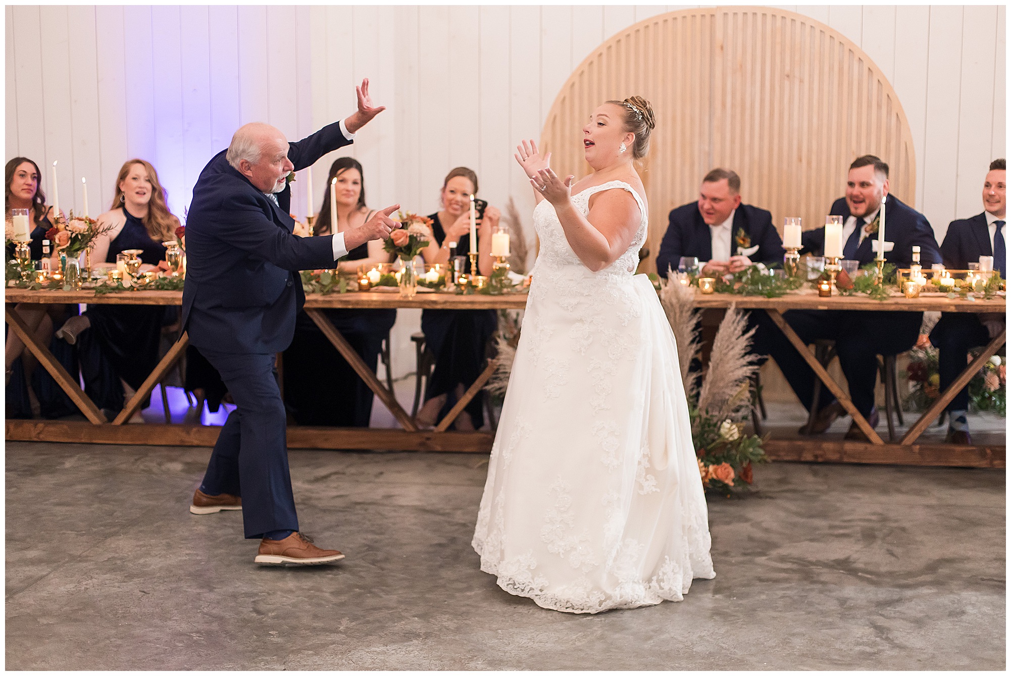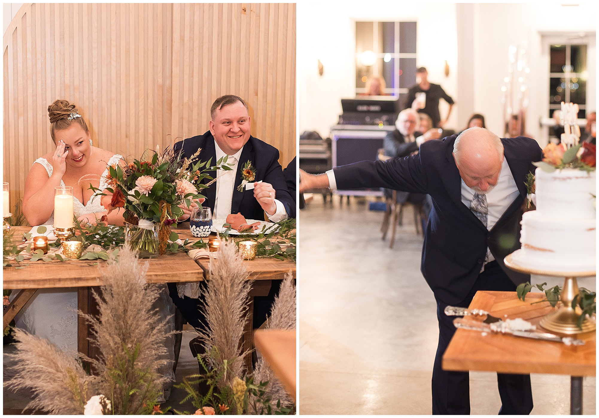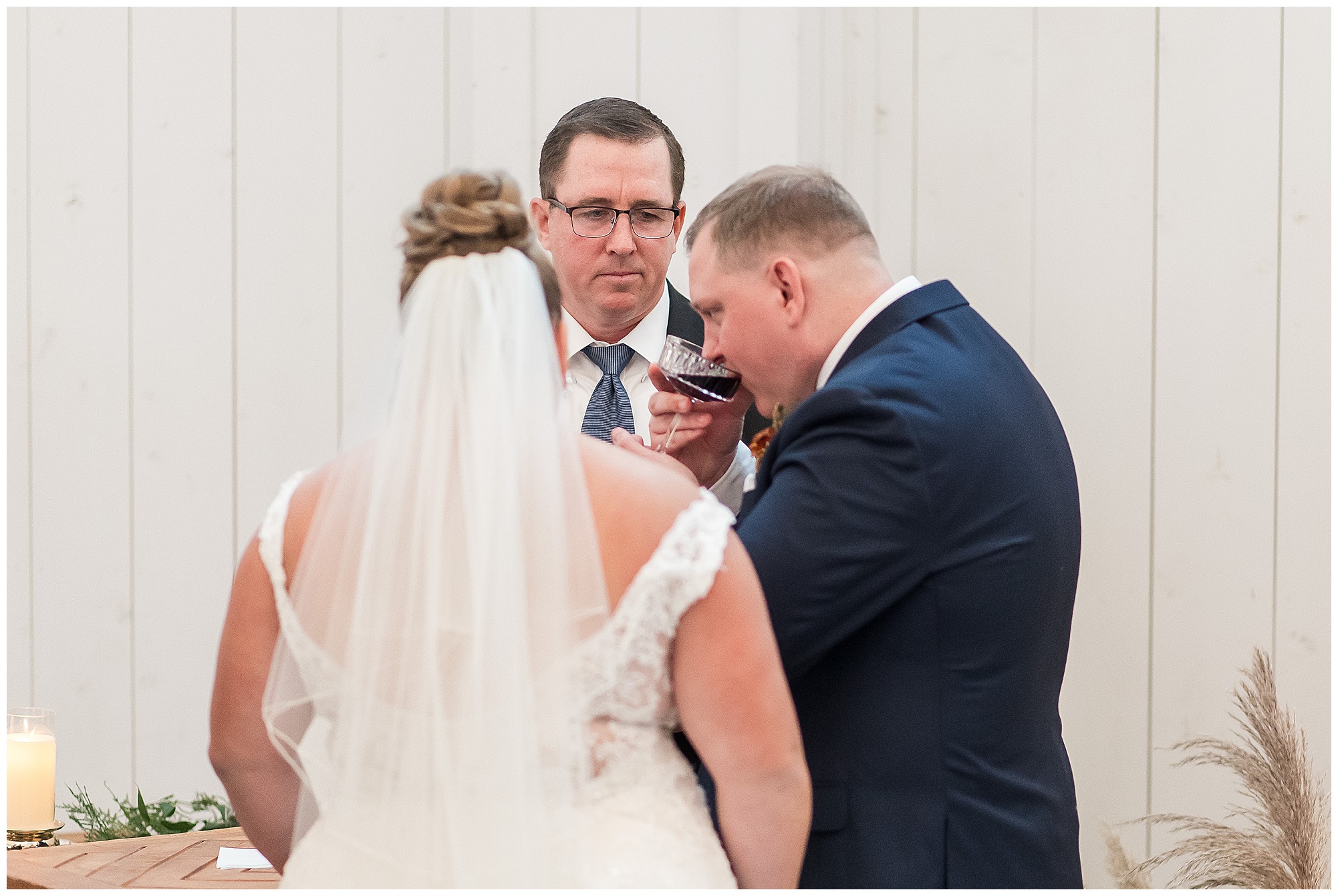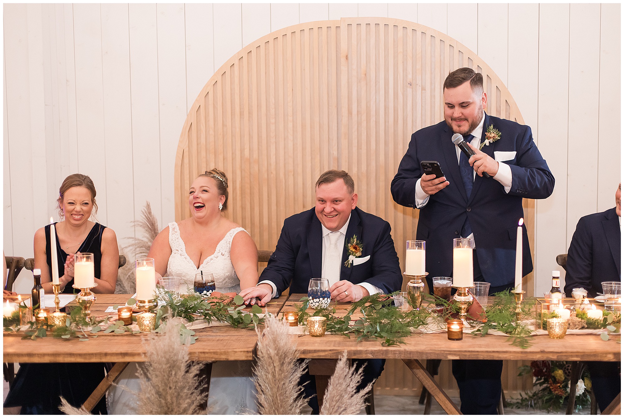 Guests gathered at their farmhouse tables scattered around the barn as they awaited Kayla to make her way down the aisle with her dad. Almost eight years in the making, this was absolutely a moment everyone in the room was waiting for! Nick fought back tears as he saw his bride walking his way with her glowing smile. And within a few minutes, Kayla was also fighting her emotions with the mention of her mother and the long journey of her and Nick’s relationship. But, there were also so many laughs throughout their nuptials. Which is exactly how Kayla and Nick’s marriage will play out. So many laughs and lifting one another up in any time of need. Just like they have done over the years leading up to wedding day. After exchanging their vows and rings, they shared a kiss and became Mr. & Mrs. Hoefling!