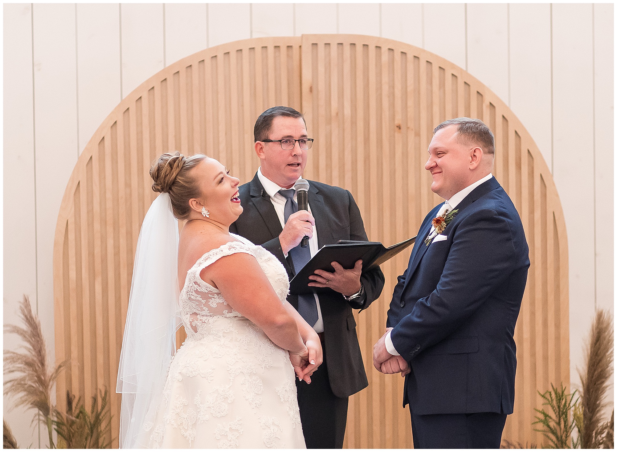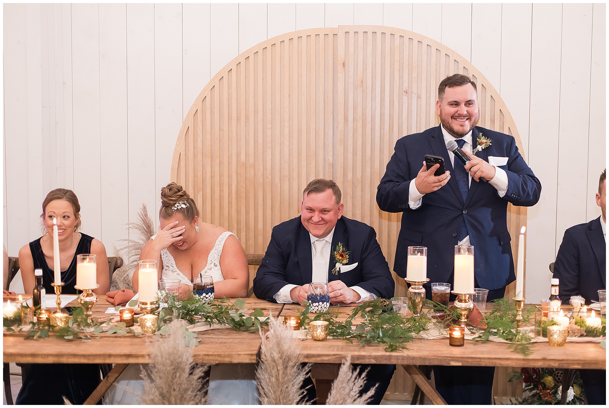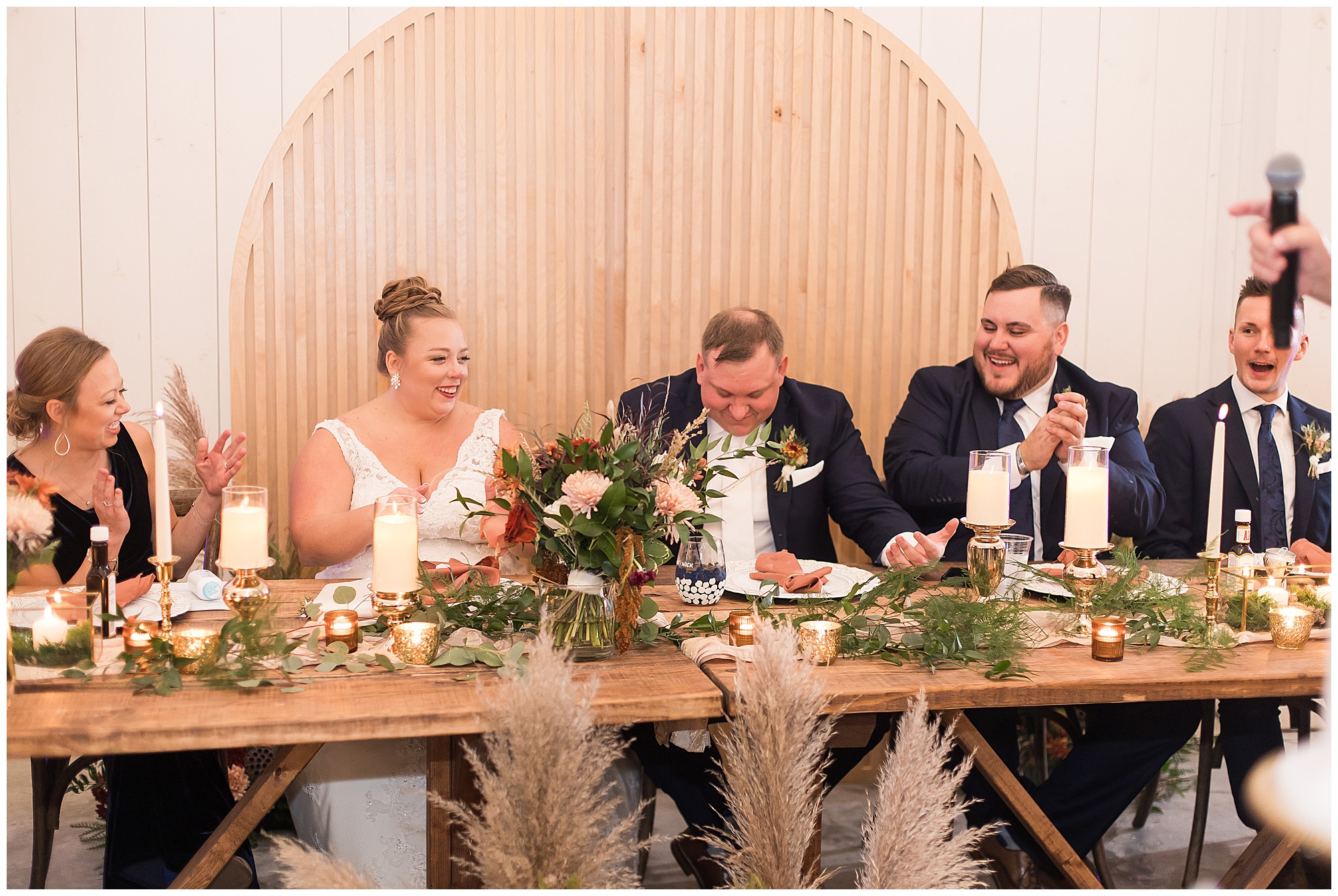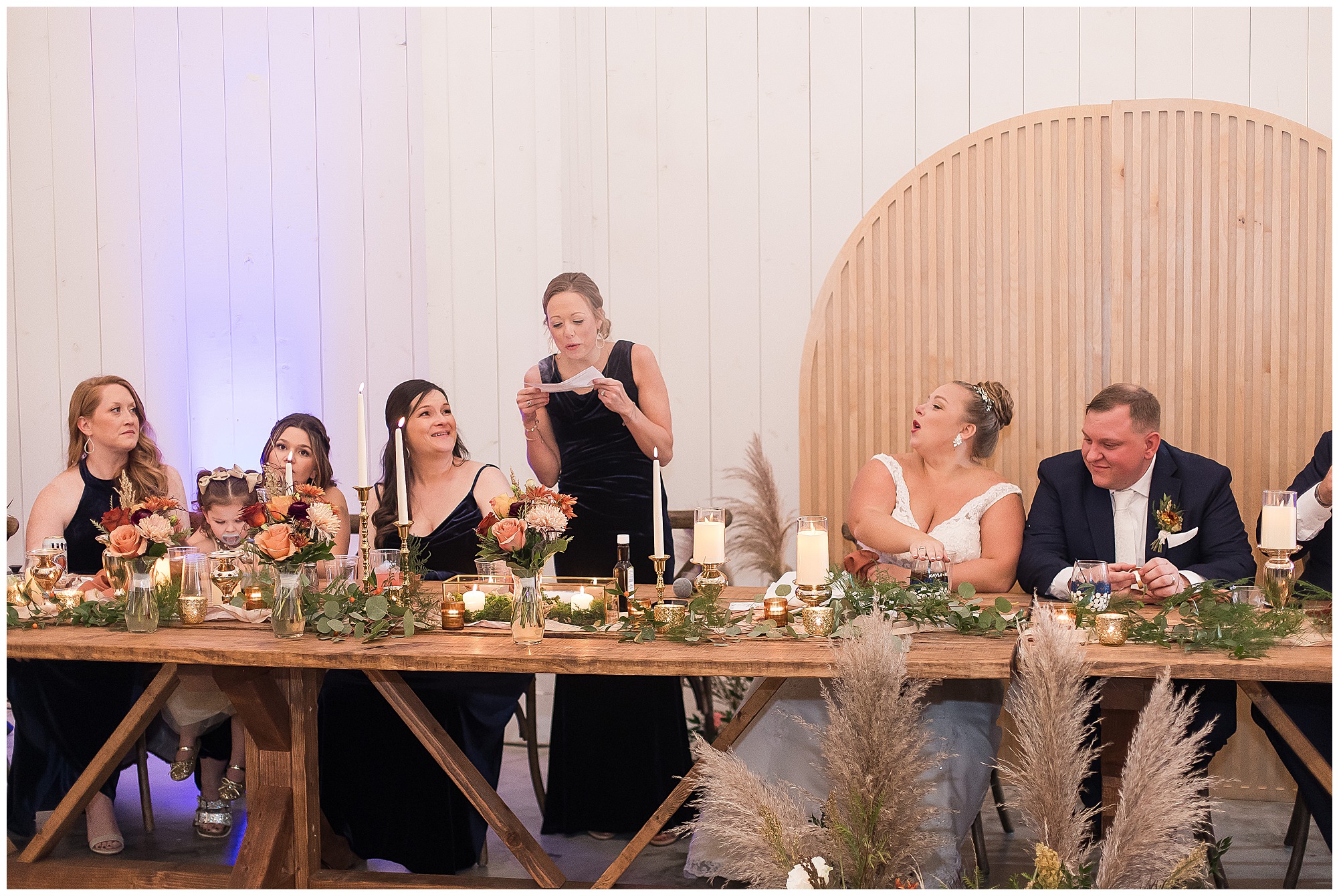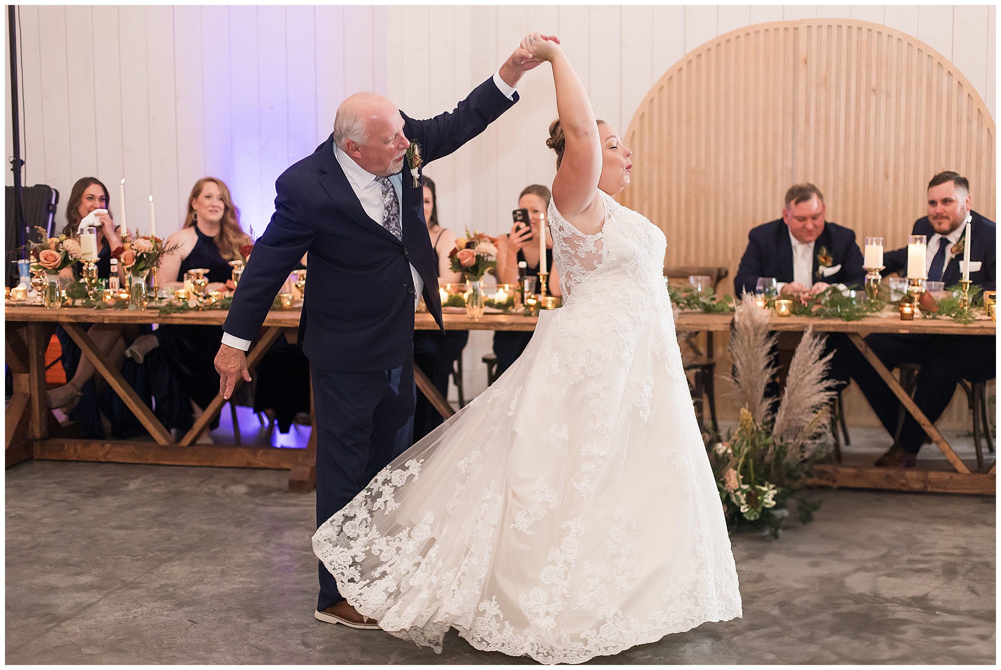Guests gathered at their farmhouse tables scattered around the barn as they awaited Kayla to make her way down the aisle with her dad. Almost eight years in the making, this was absolutely a moment everyone in the room was waiting for! Nick fought back tears as he saw his bride walking his way with her glowing smile. And within a few minutes, Kayla was also fighting her emotions with the mention of her mother and the long journey of her and Nick’s relationship. But, there were also so many laughs throughout their nuptials. Which is exactly how Kayla and Nick’s marriage will play out. So many laughs and lifting one another up in any time of need. Just like they have done over the years leading up to wedding day. After exchanging their vows and rings, they shared a kiss and became Mr. & Mrs. Hoefling!